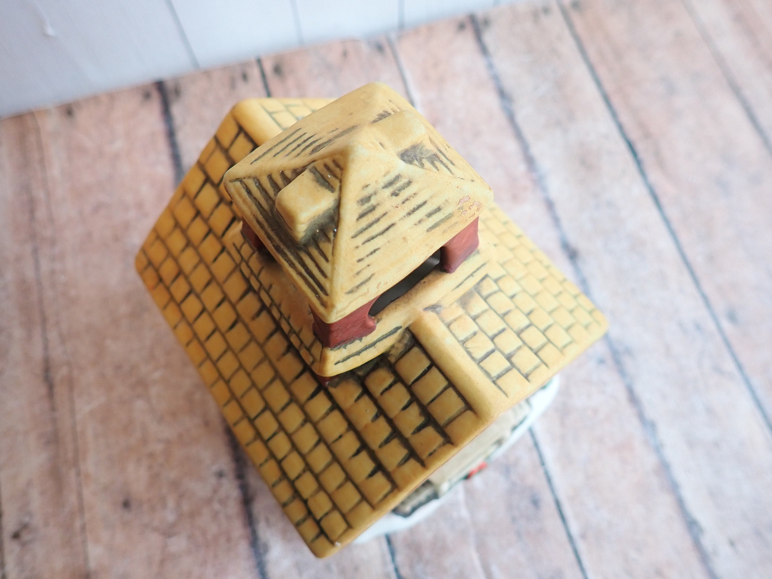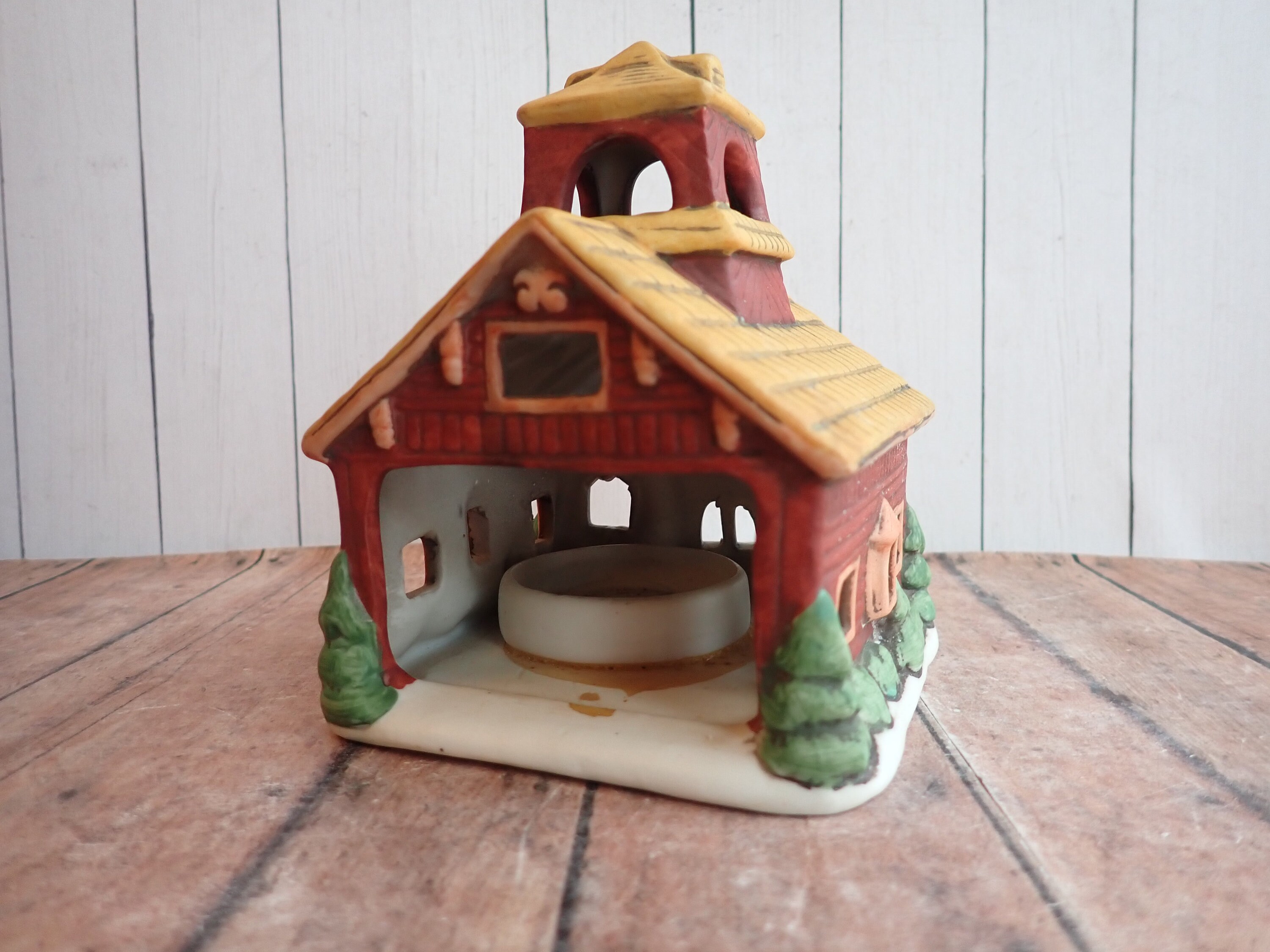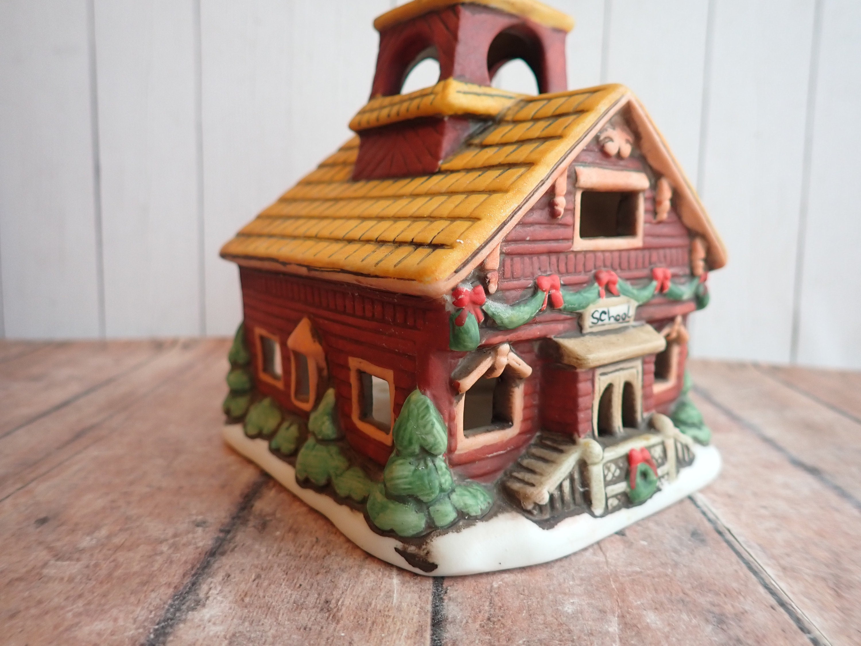 This ceramic village house is from the Lefton Colonial Village collection and was made in 1986 and is a smaller village piece that holds a candle. This piece is the red brick School, and is 4.75" tall, 4" wide, and 4" deep. This piece has an opening on the back to hold a votive or tealight candle inside.