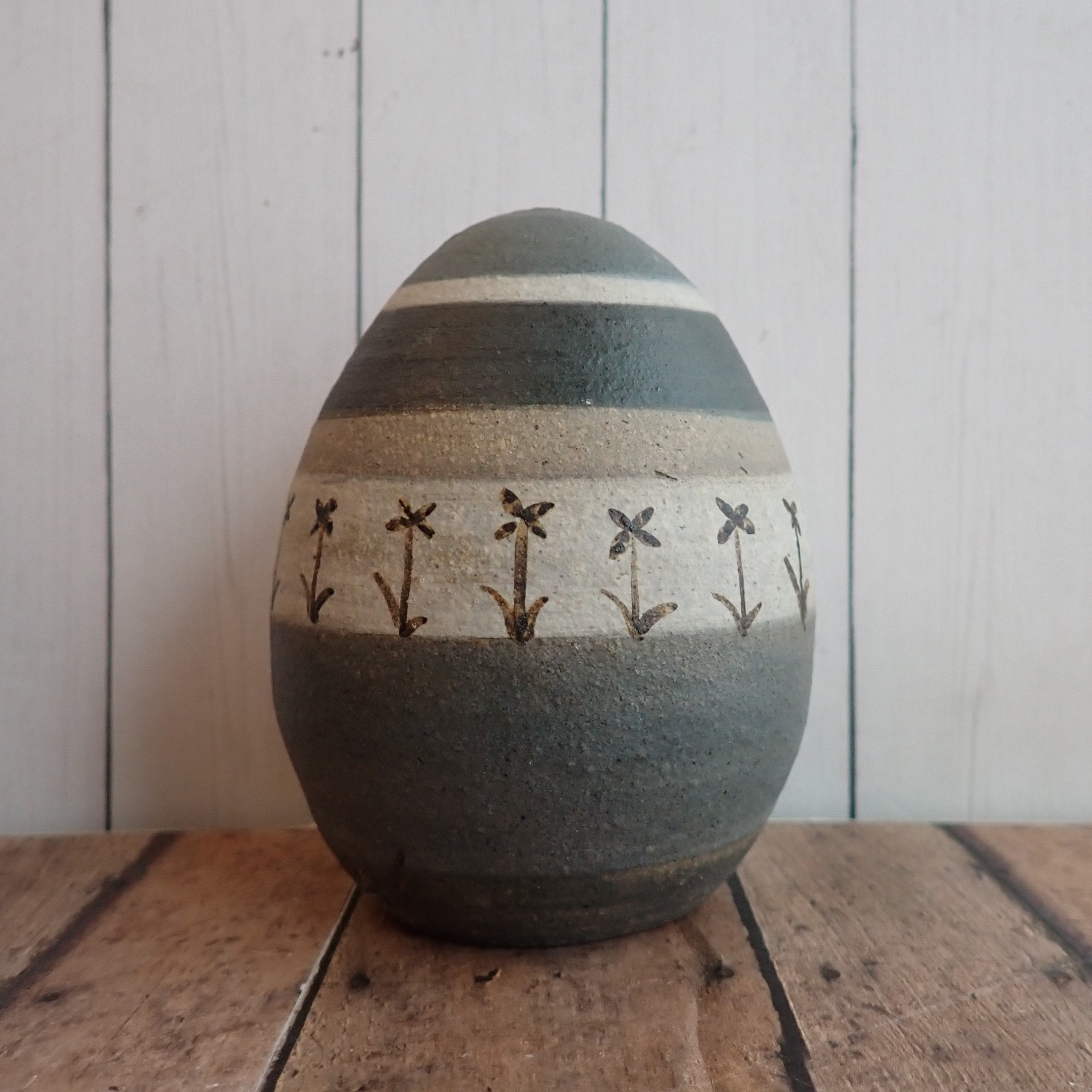 This small bud vase is 4" tall and 3" in diameter at the widest point and is shaped like an egg. It is blue, white and grey with a banded pattern, and is decorate with small dark gray flowers around the vase. There is a long, thin opening at the top for flowers. The vase is signed "hulda" on the bottom. The vase is in very good condition with no chips or cracks.