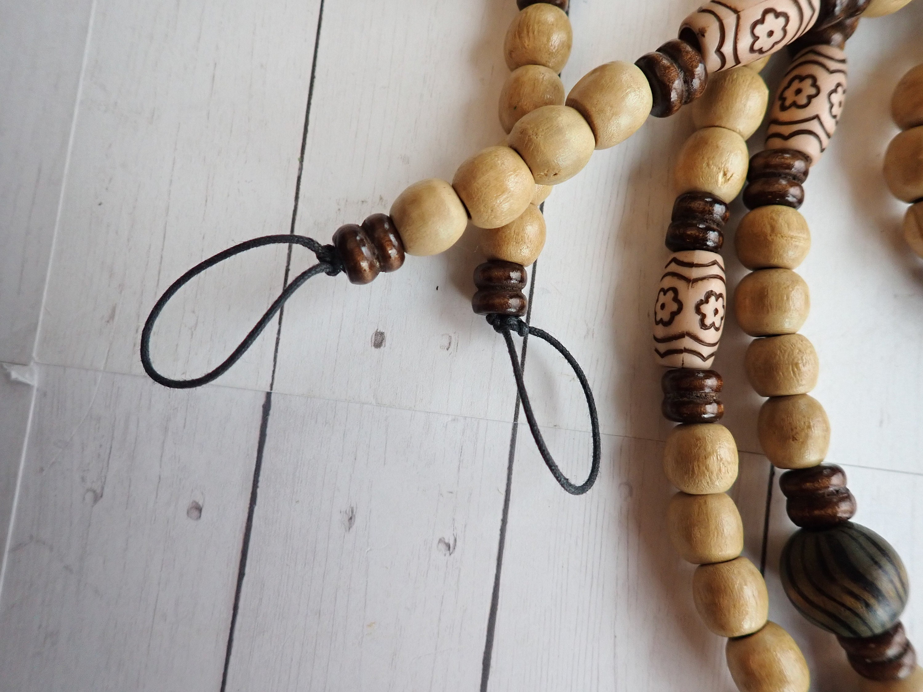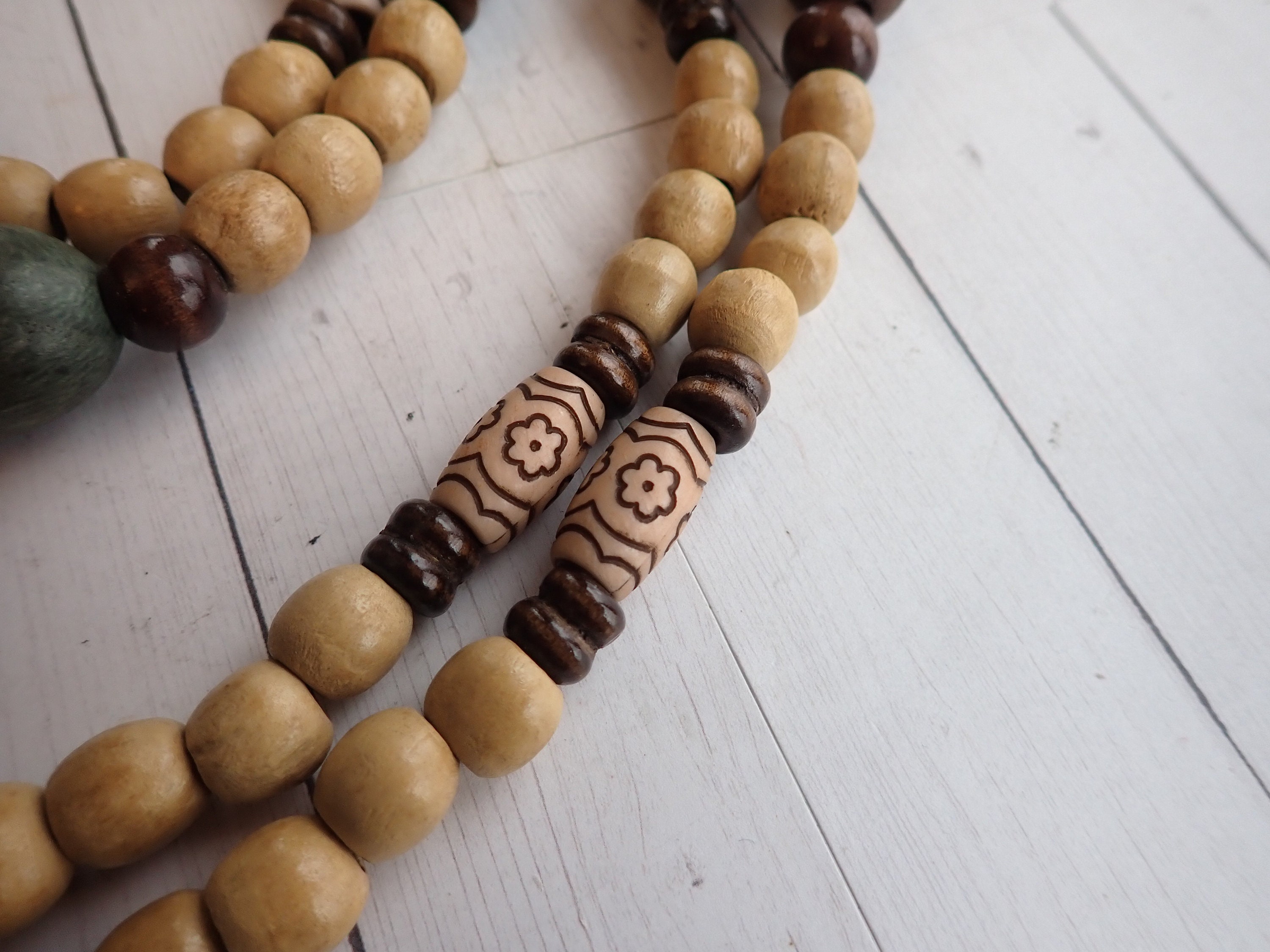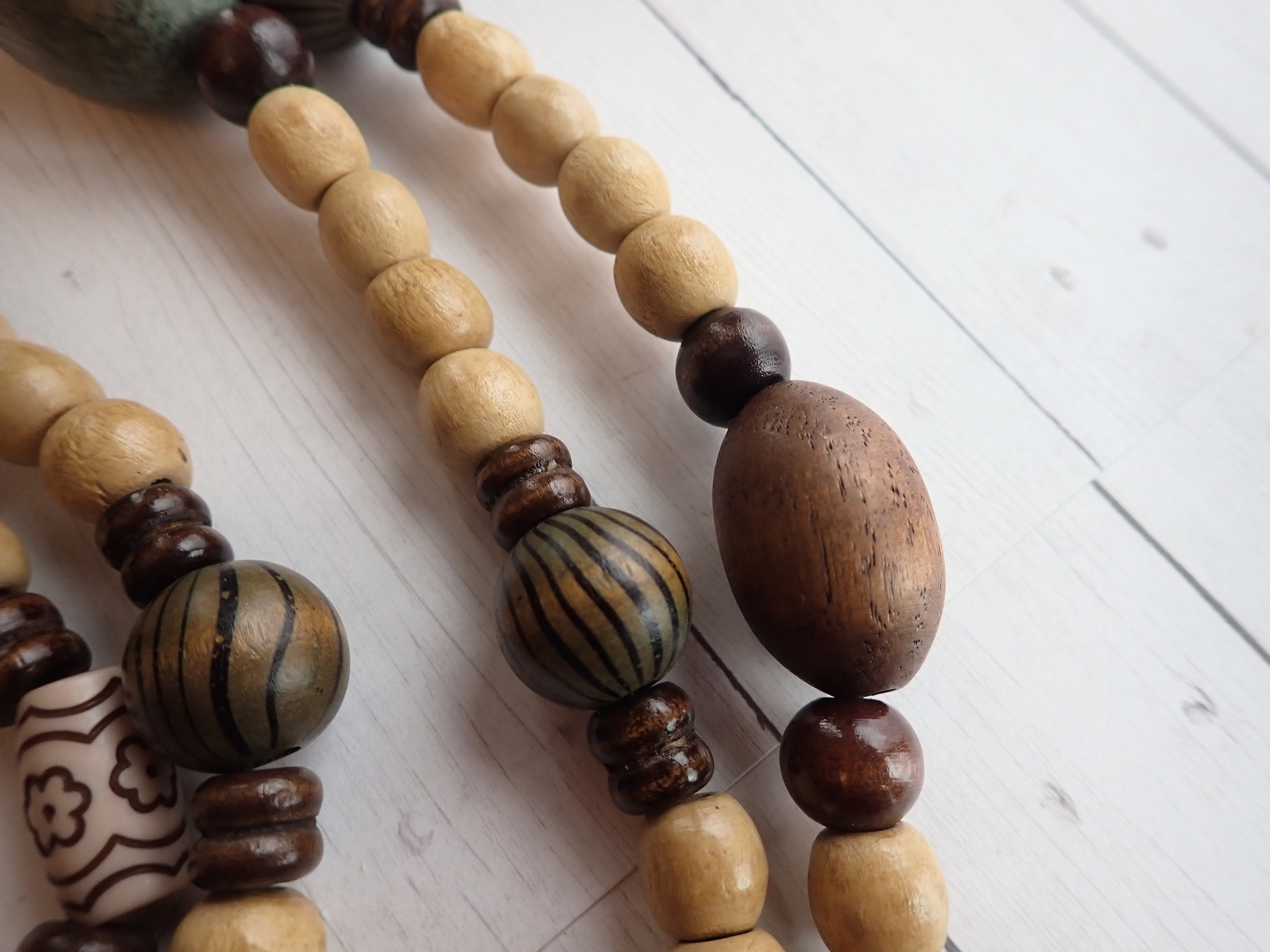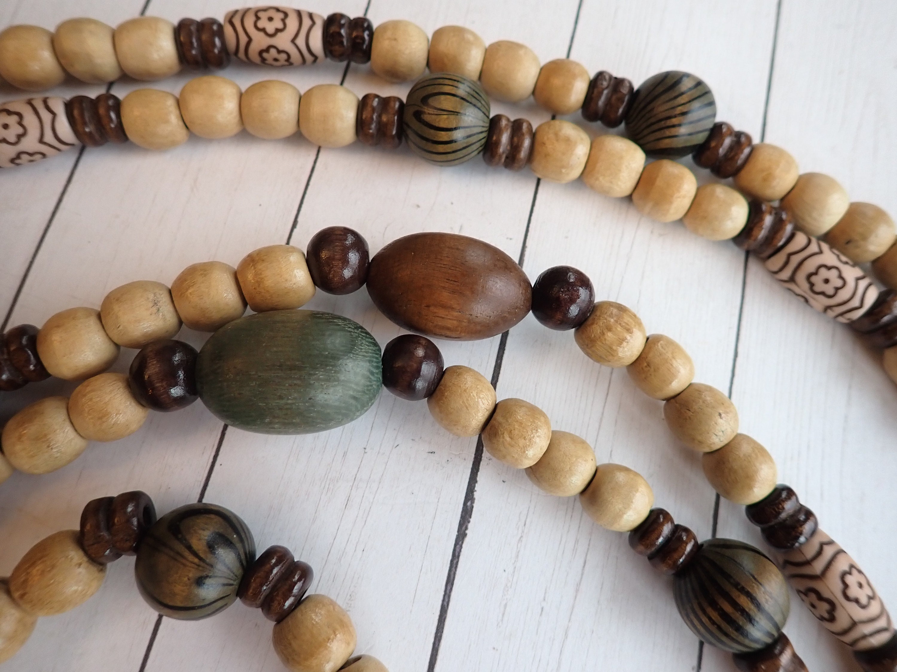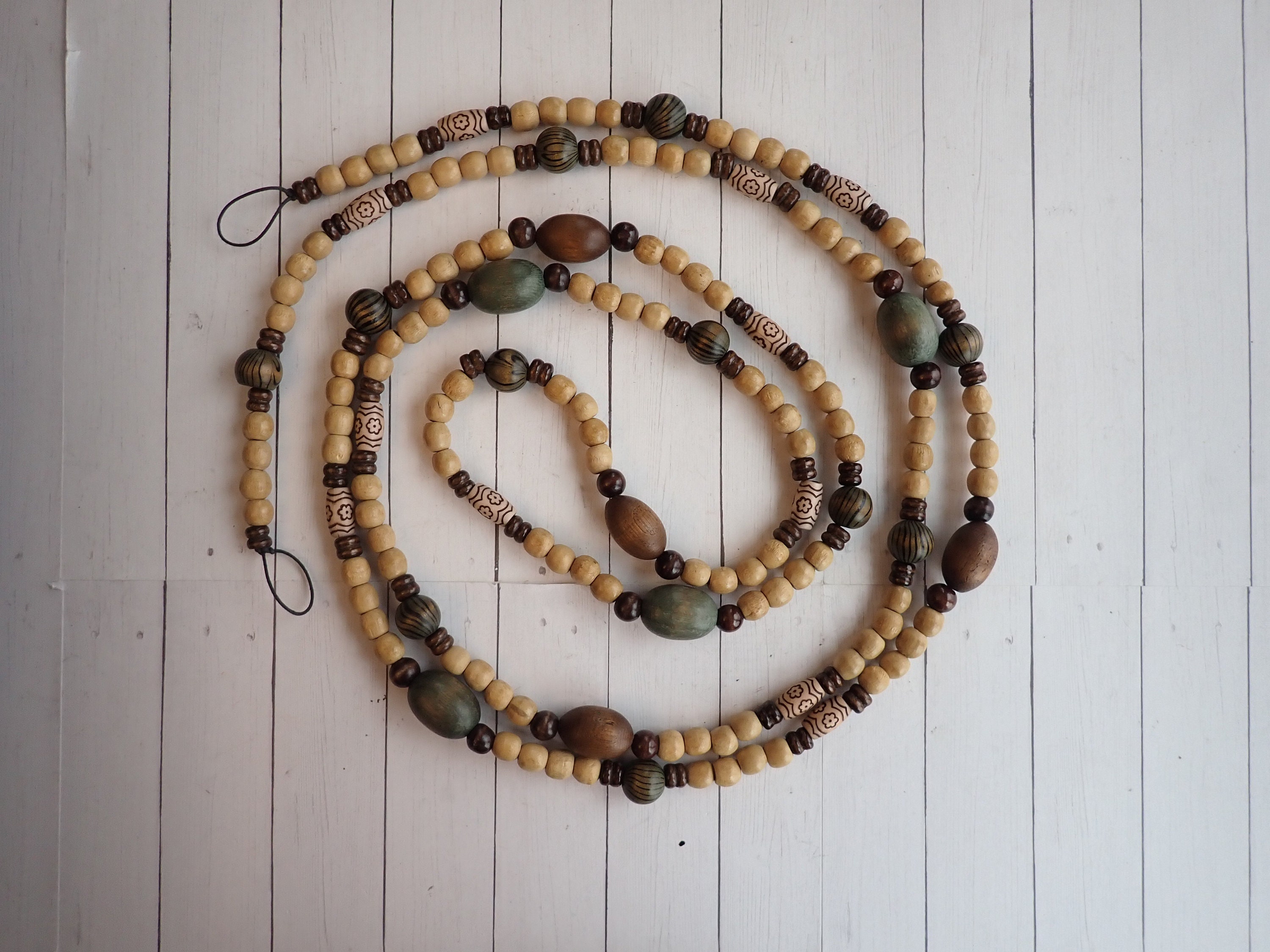 This wood bead garland is 8' long and is made of cream-colored wood beads, and accented with brown and blue decorative wood and plastic beads. The garland is strung on a high-quality waxed cotton word and has a loop hanger on each end. The cream-colored beads are 1/2" in diameter, and the larger egg-shaped beads are 1 1/4" long.