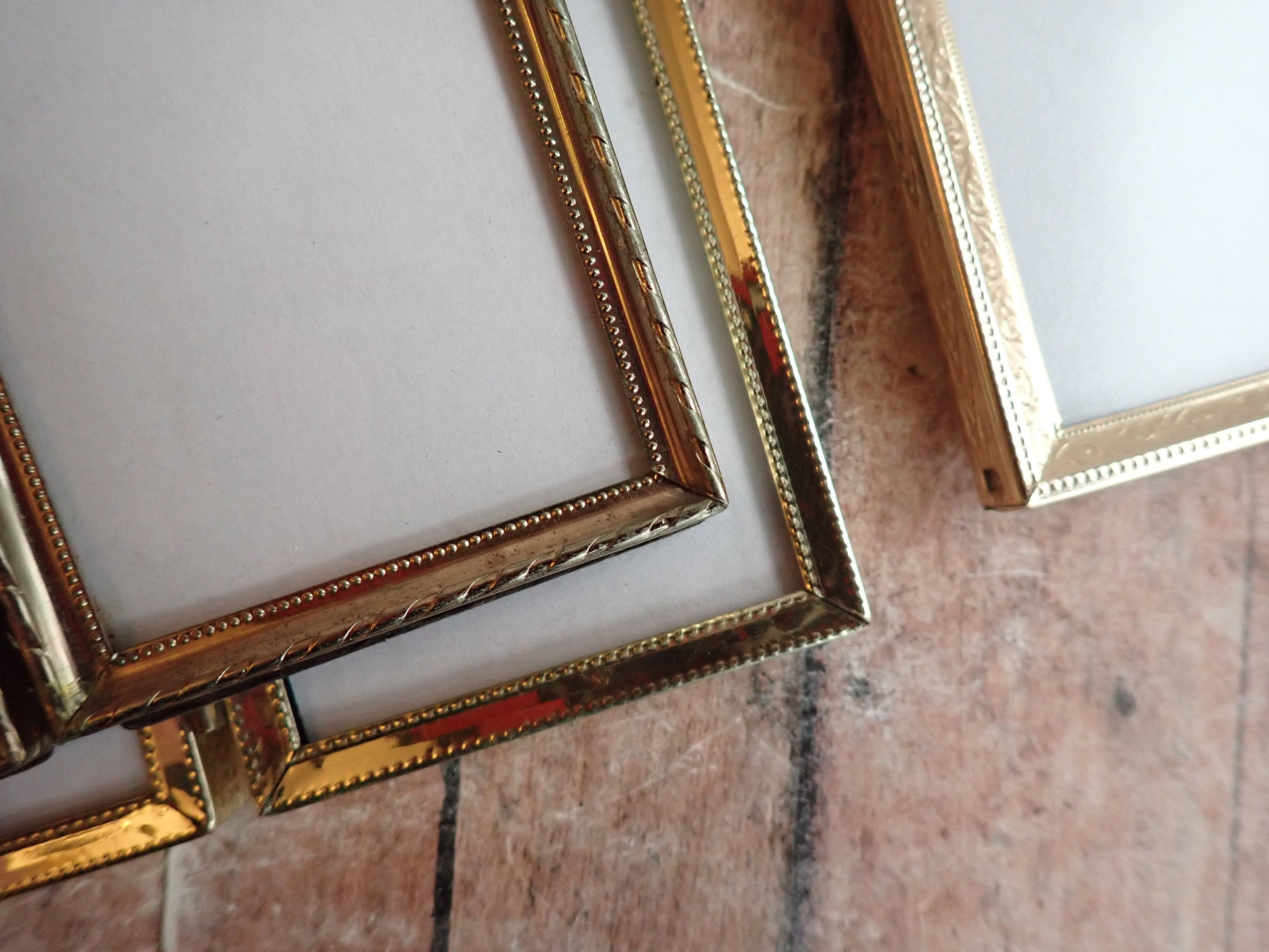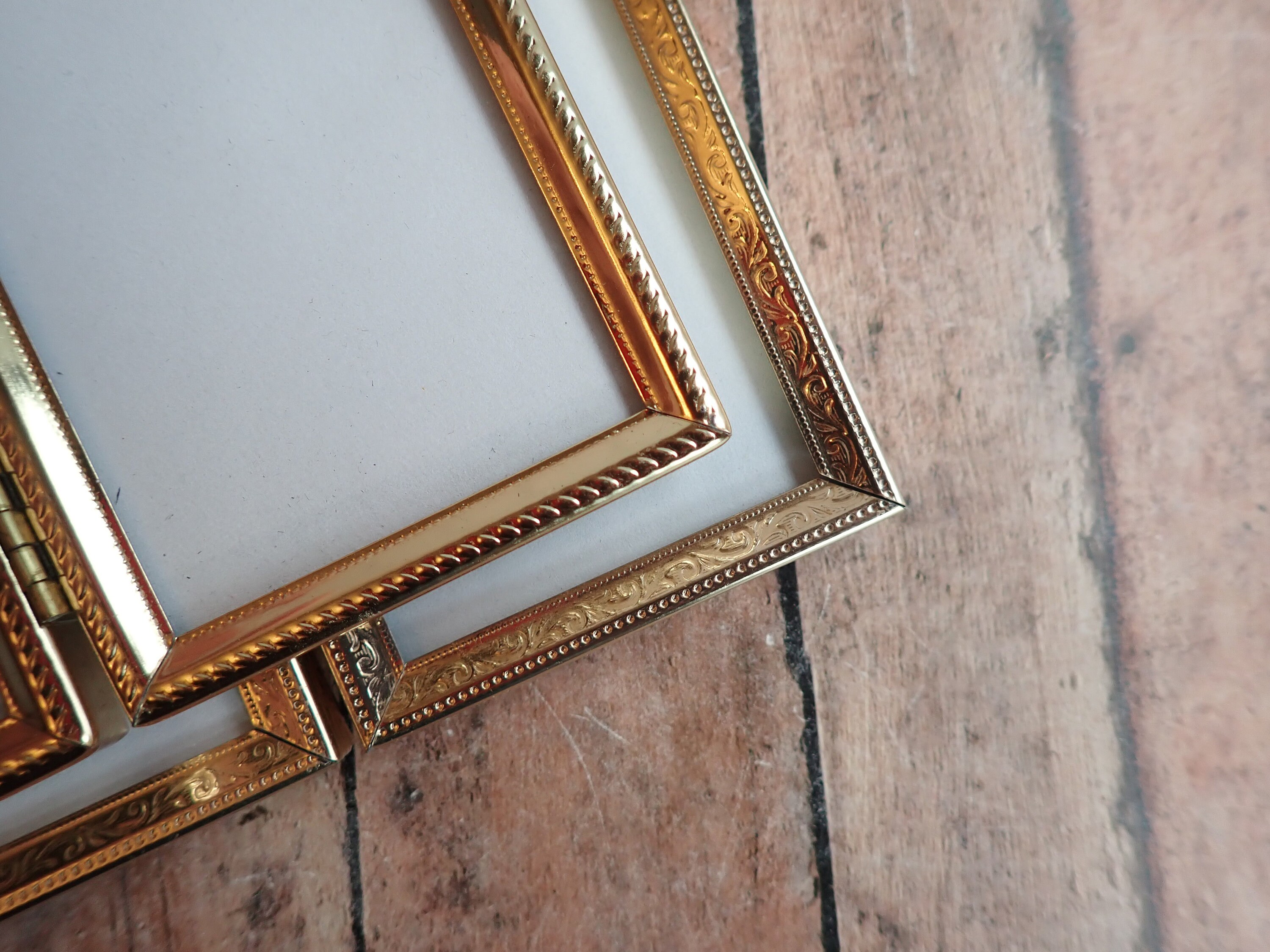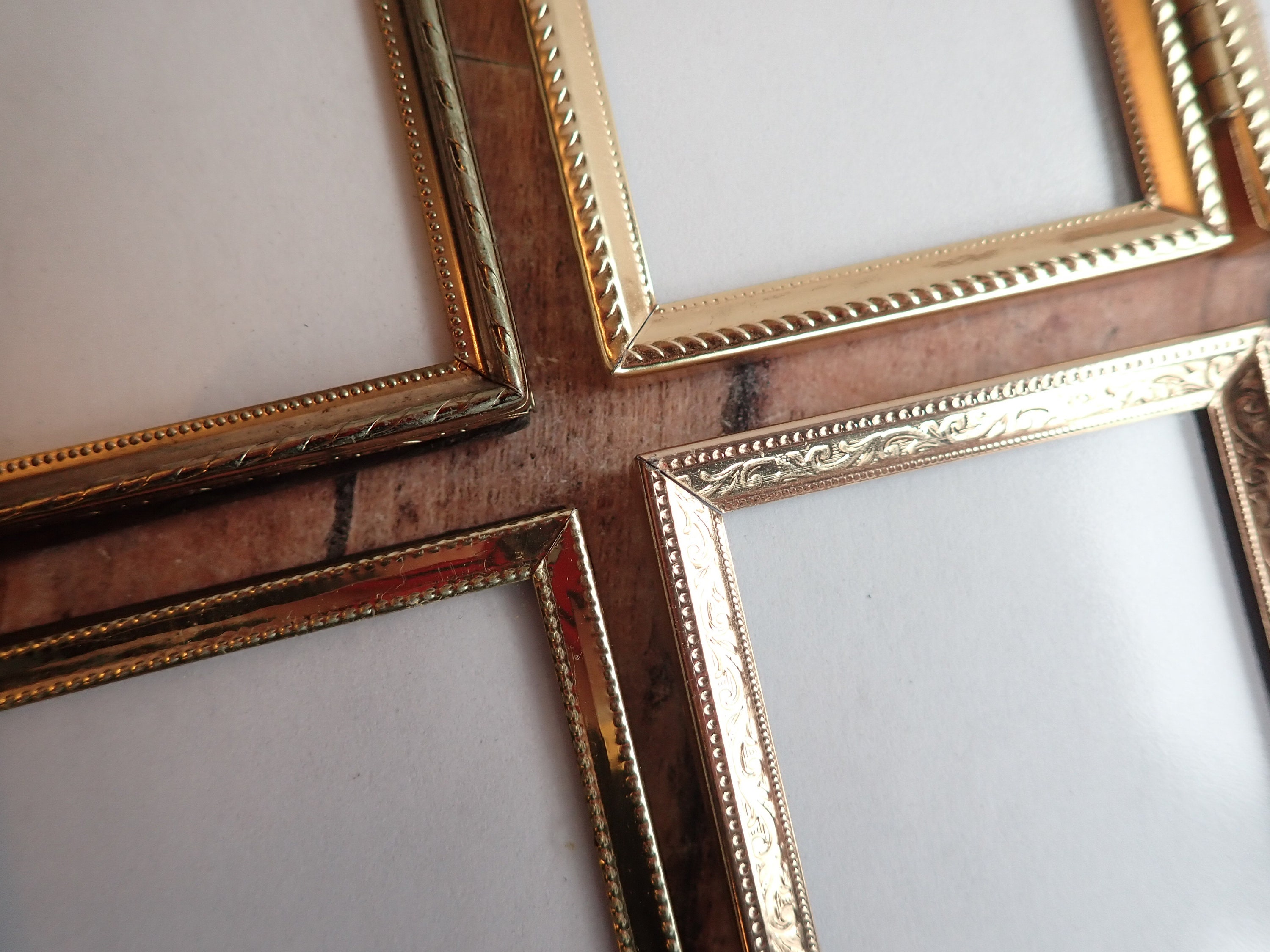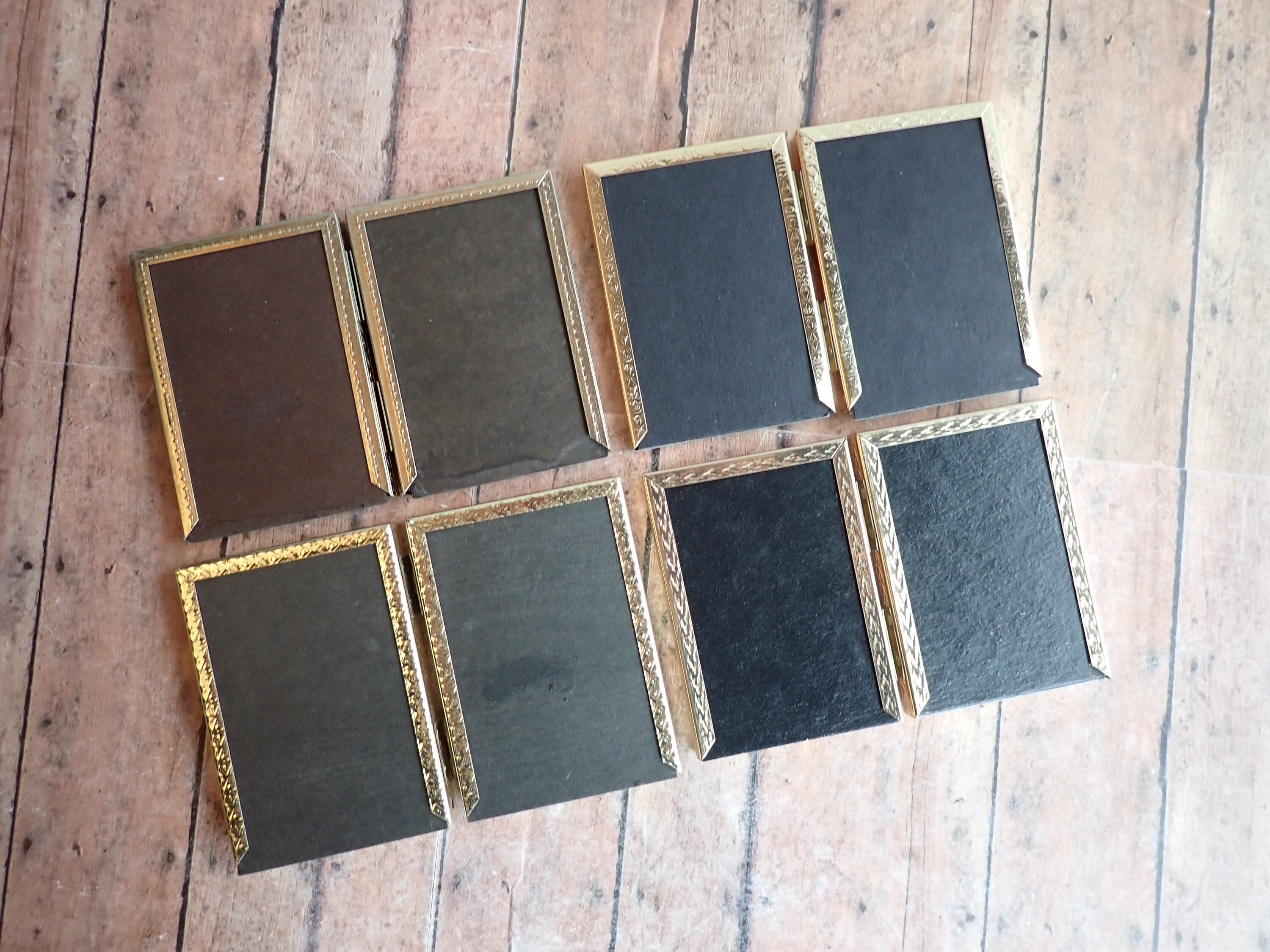 This set of brass colored metal frames includes four 2" x 3" double hinged frames, in different designs and patterns. They are all a golden brass colored metal, and have nicely detailed designs around the edges. The overall dimensions of the frames are 5.25" wide by 3.5" tall. They each have a clear glass insert that covers the photo opening. The frames are in nice condition but do have some light tarnish here and there. Great set of vintage brass frames!