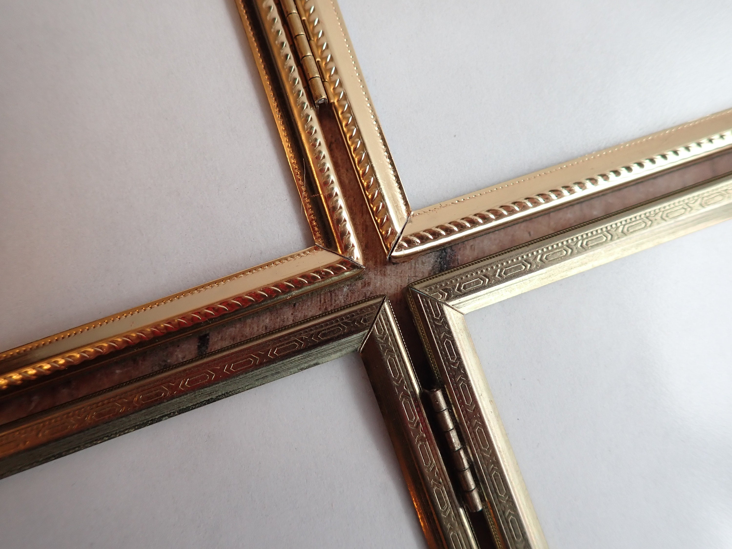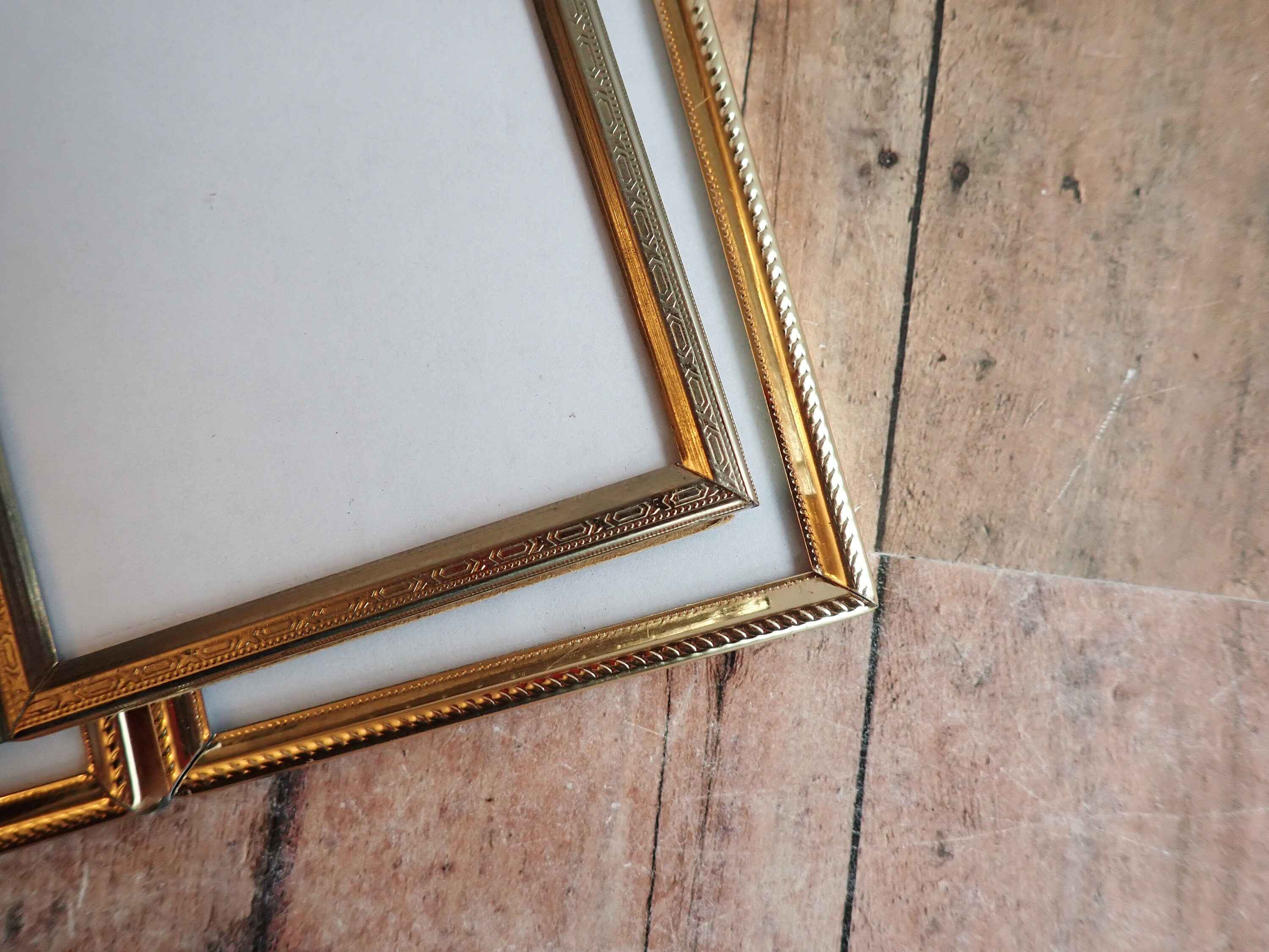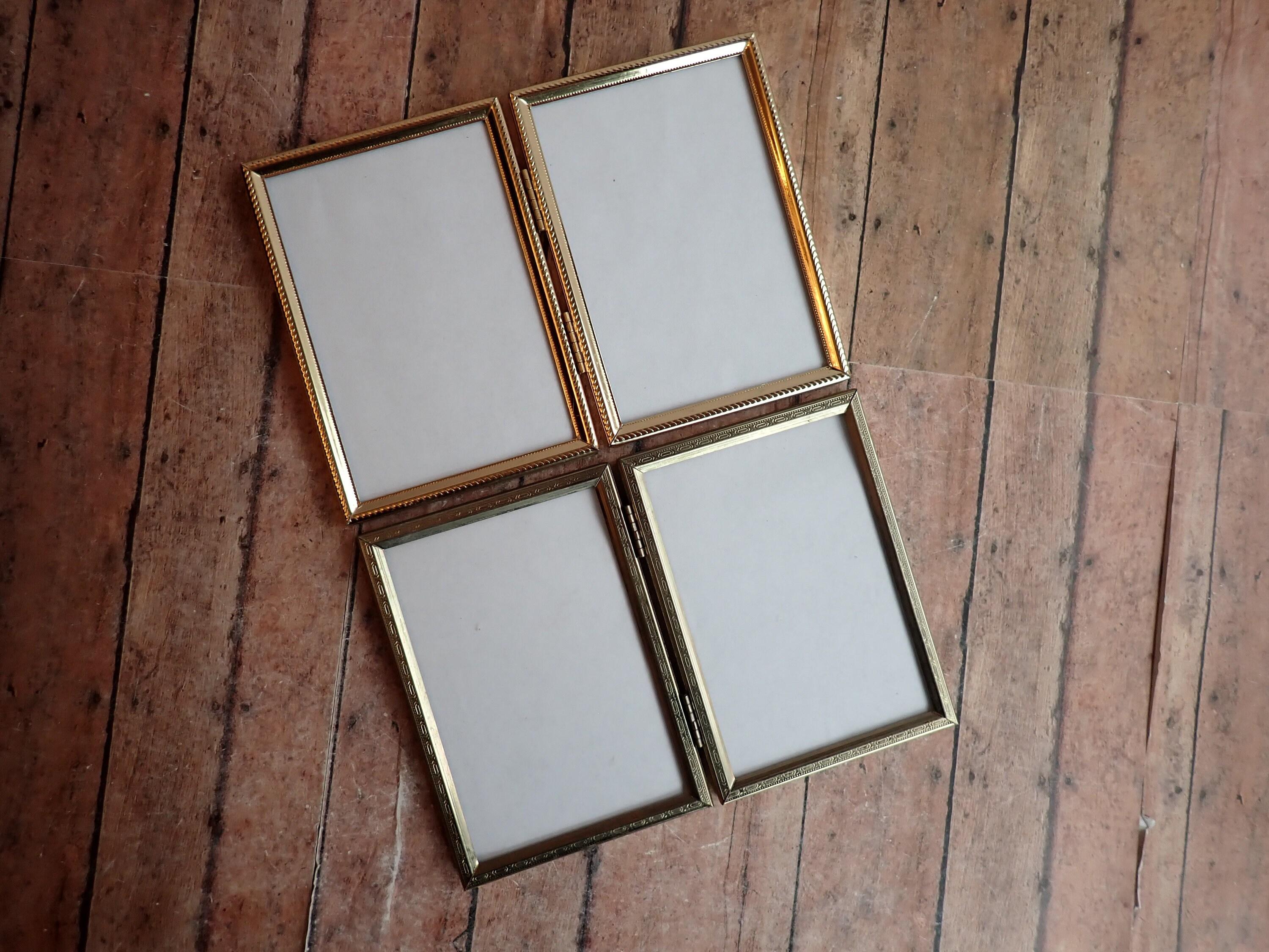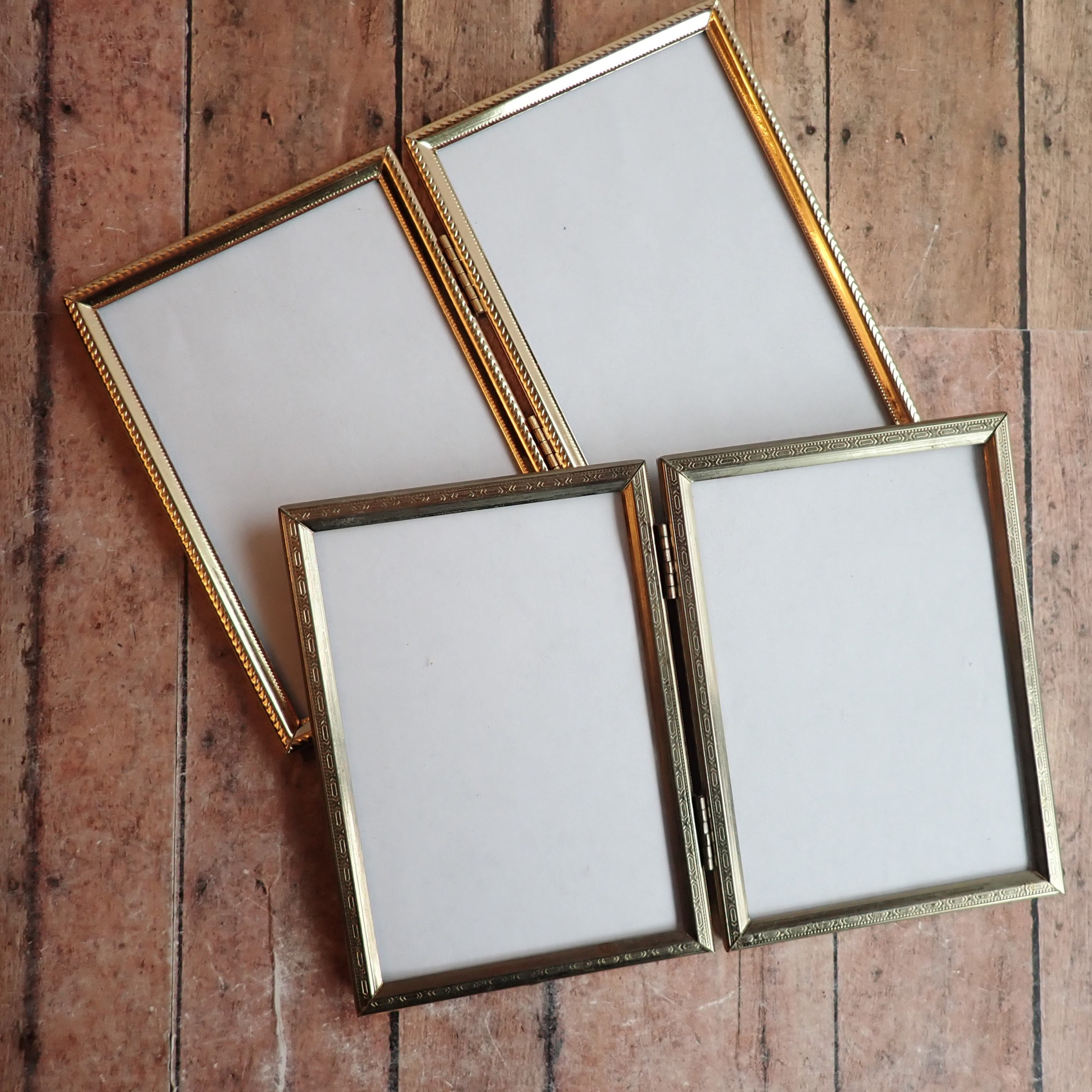 This set of brass frames includes two 3 1/2" x 5" double hinged frames, all in different designs and patterns. They are both a golden brass colored metal, and have nicely detailed designs around the edges. The overall dimensions of the frames are 7 1/2" wide by 5 1/4" tall. They each have a clear glass insert that covers the photo opening. Great set of vintage brass frames!