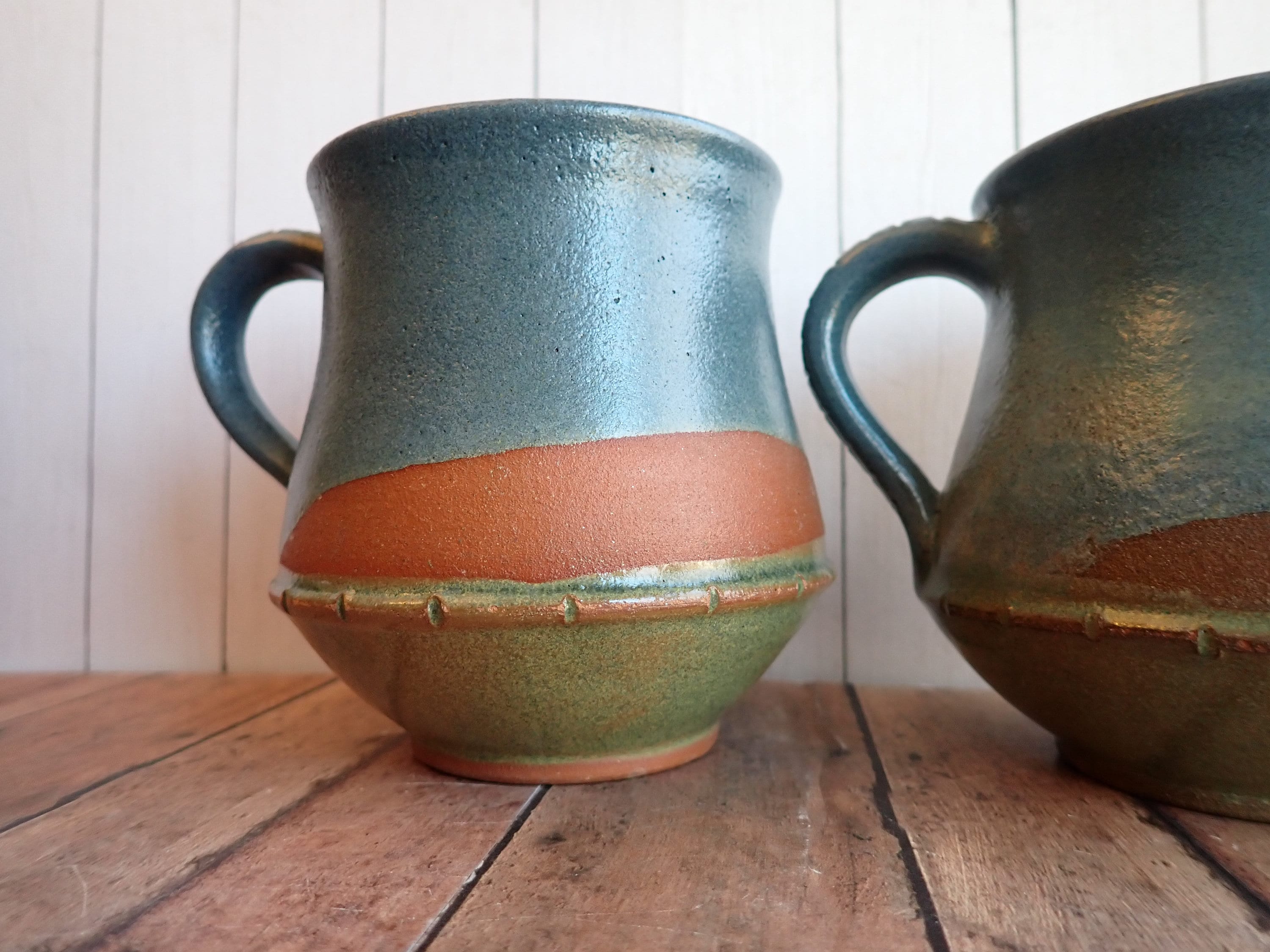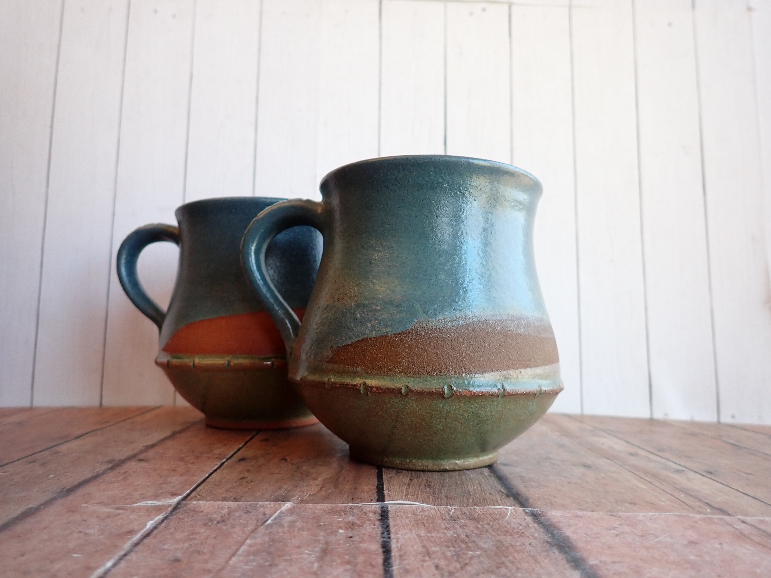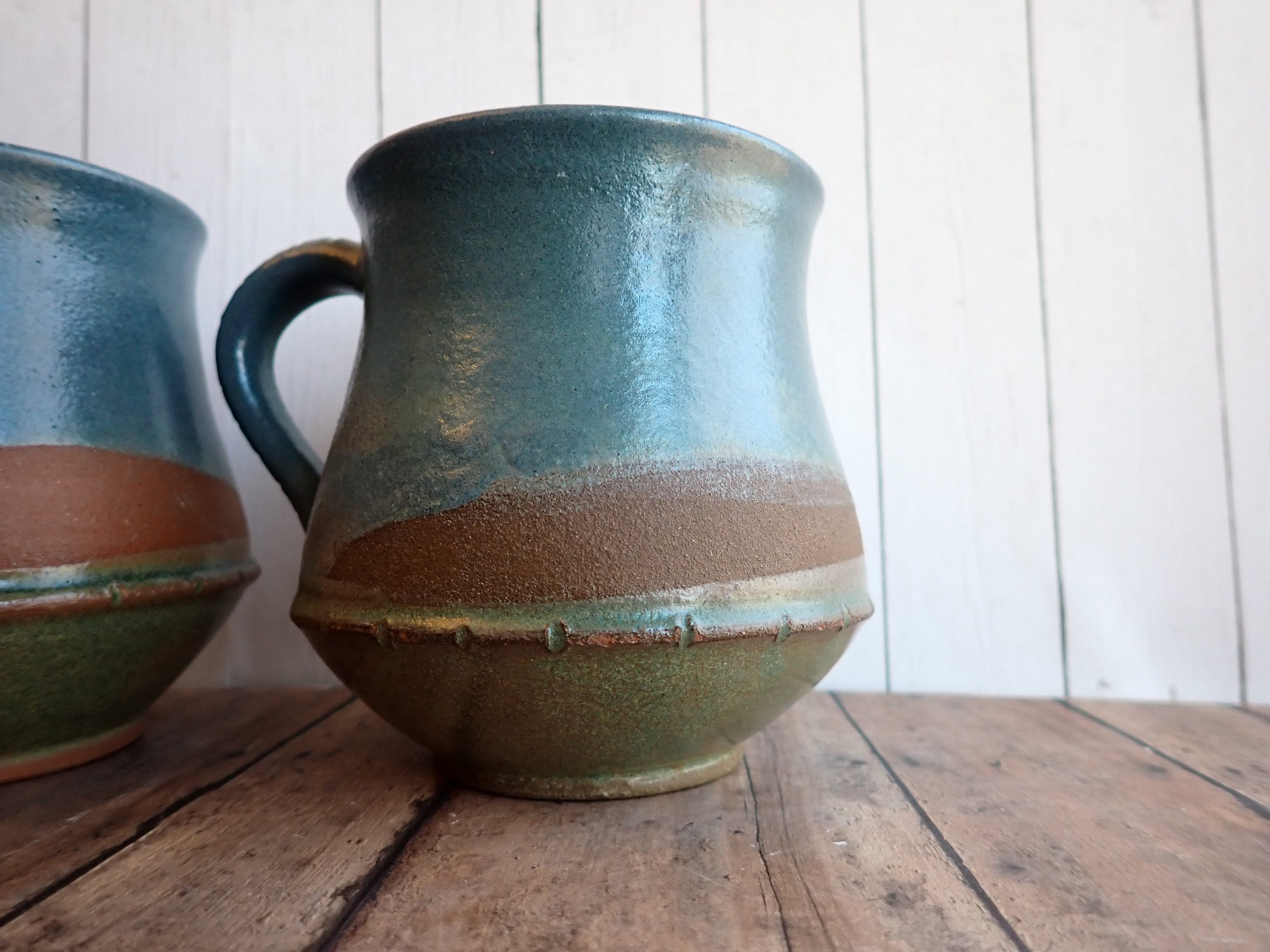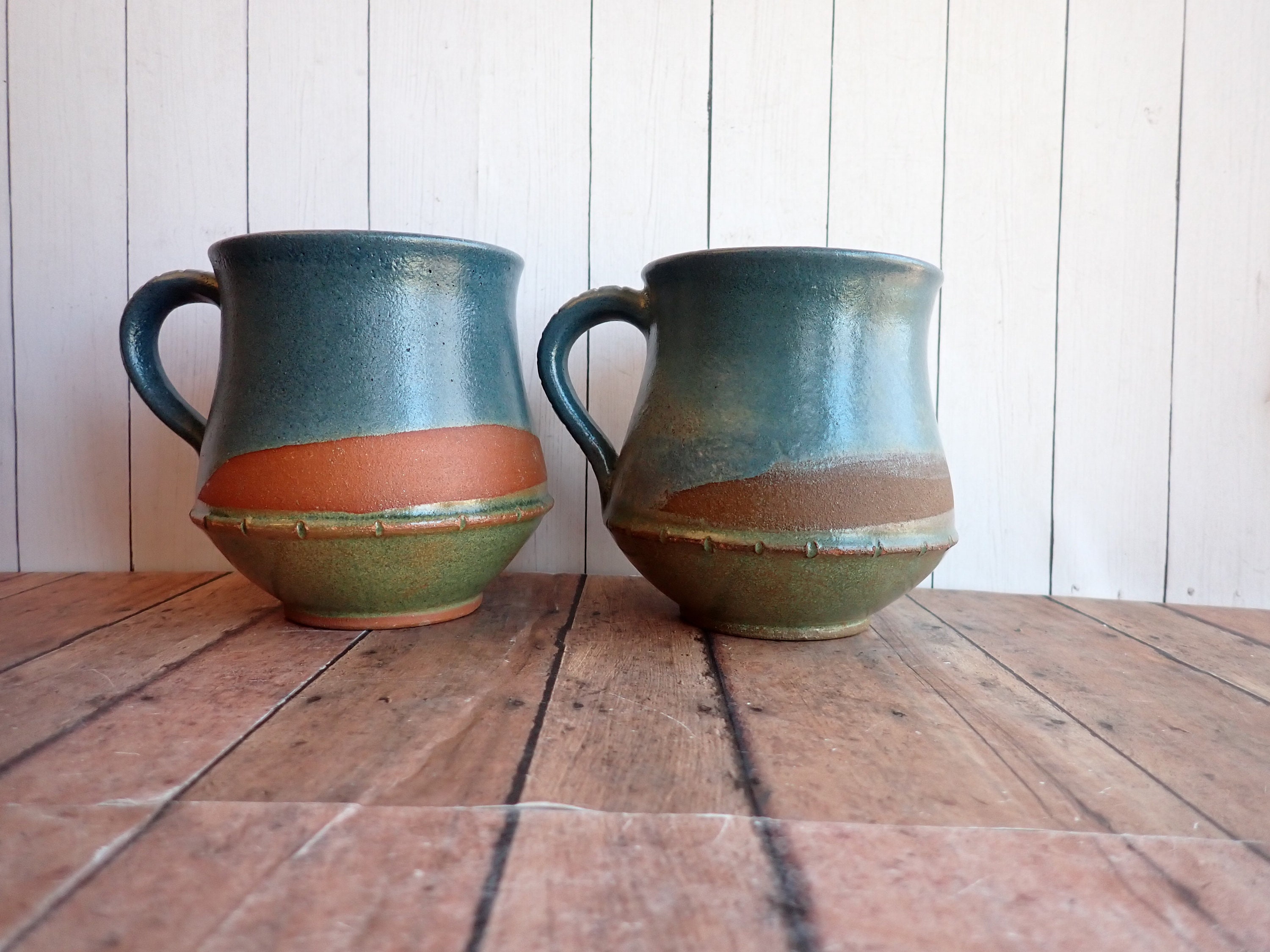 This set of mugs includes 2 matching pottery mugs. The mugs are 4.25" tall and 4" in diameter at the widest point. With the handle they are 5" wide. They are a blue stoneware, and are decorated with overlapping colored glazes in blue, green, and a rusty red/brown color. They are stamped on the bottom with a makers mark SI or IS. These mugs can hold 16 oz. filled to the rim.