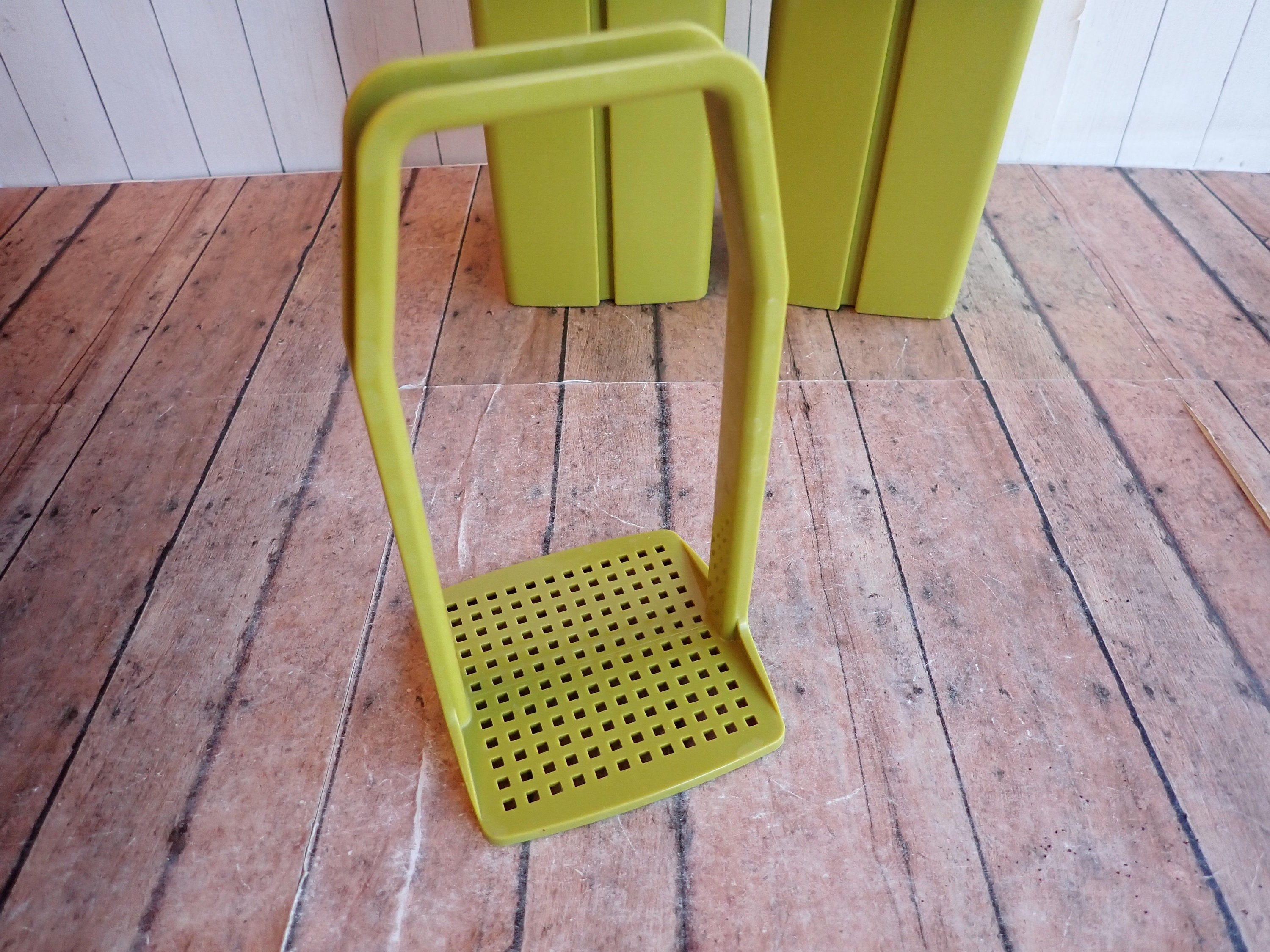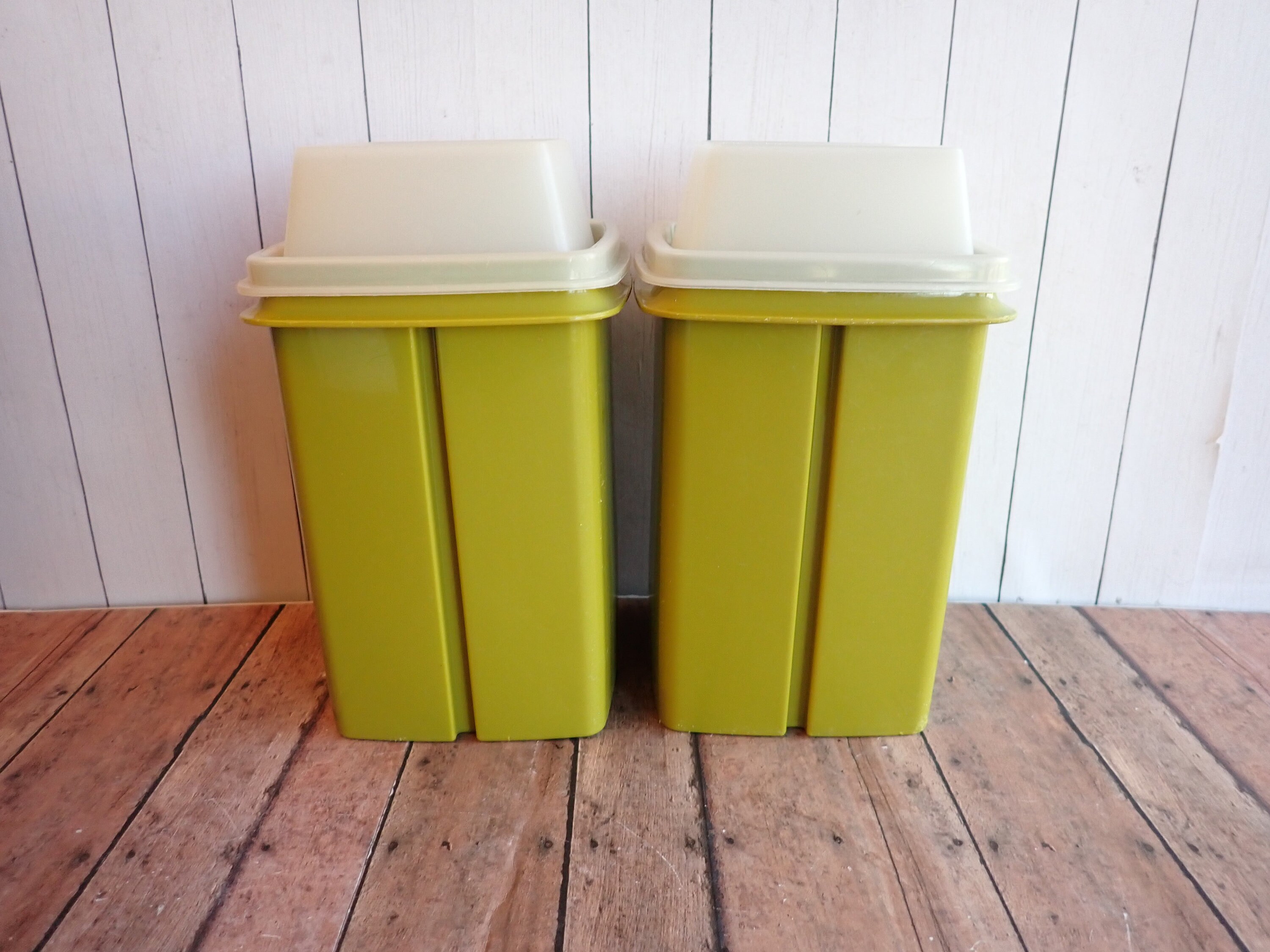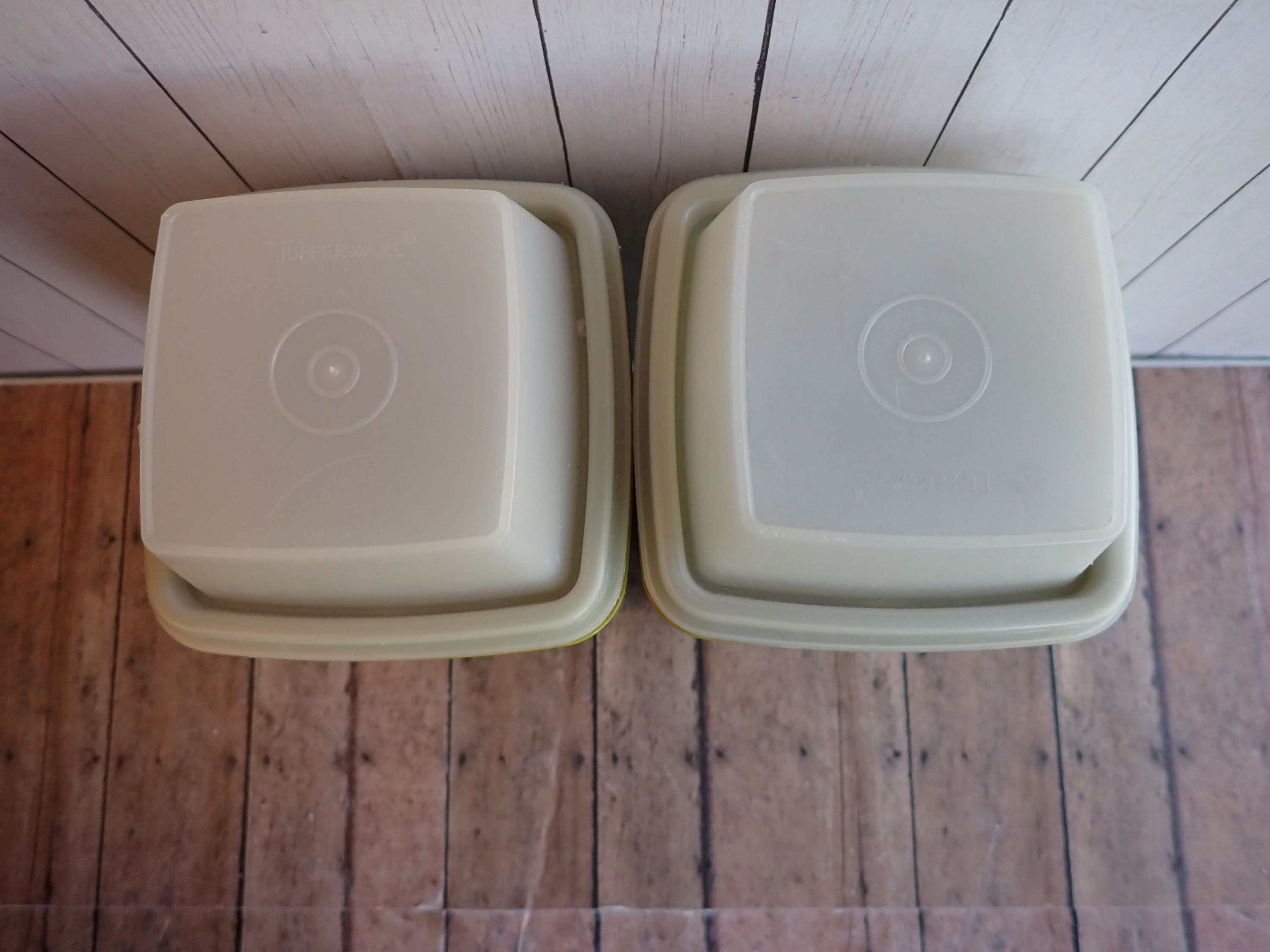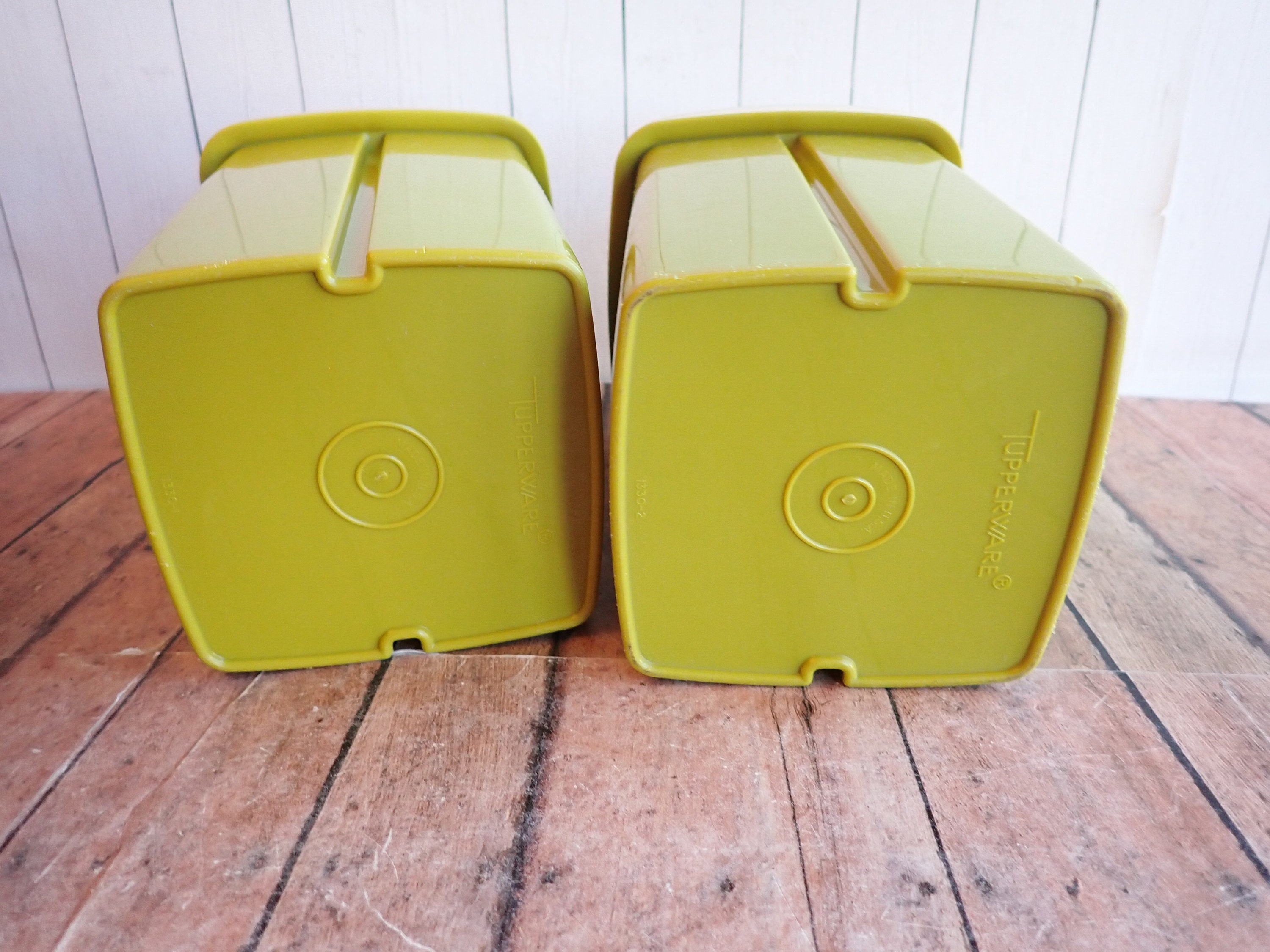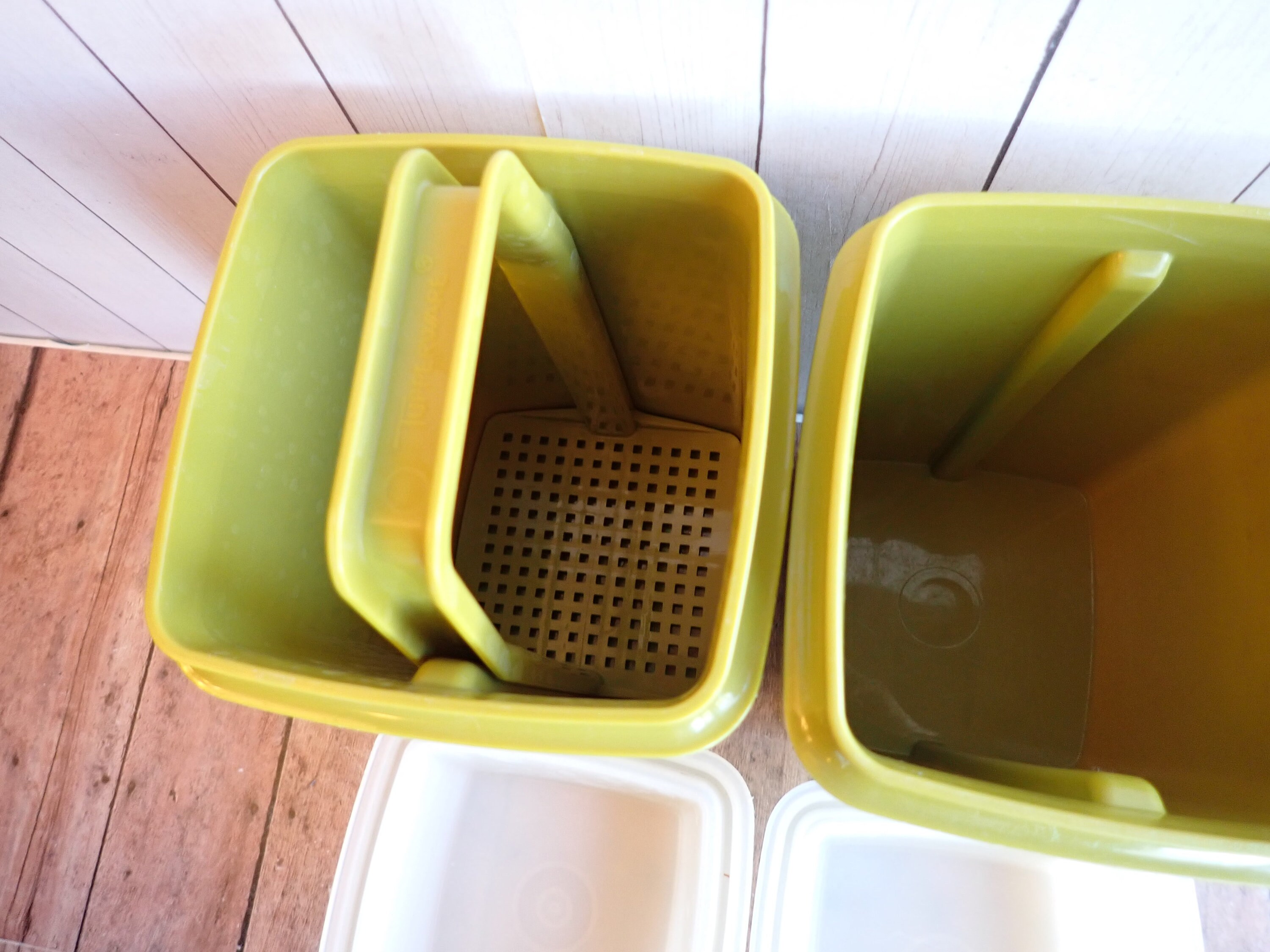 This set of 2 plastic containers by Tupperware includes 2 matching containers and lids, and one insert for the set. These containers are 7.5" tall with the lids on and 3.5" square at the base. They are an olive green color with opaque clear lids. There is one lift out strainer included that fits both containers. They both include their matching lids and are marked Tupperware 1330-1 on the bottom.