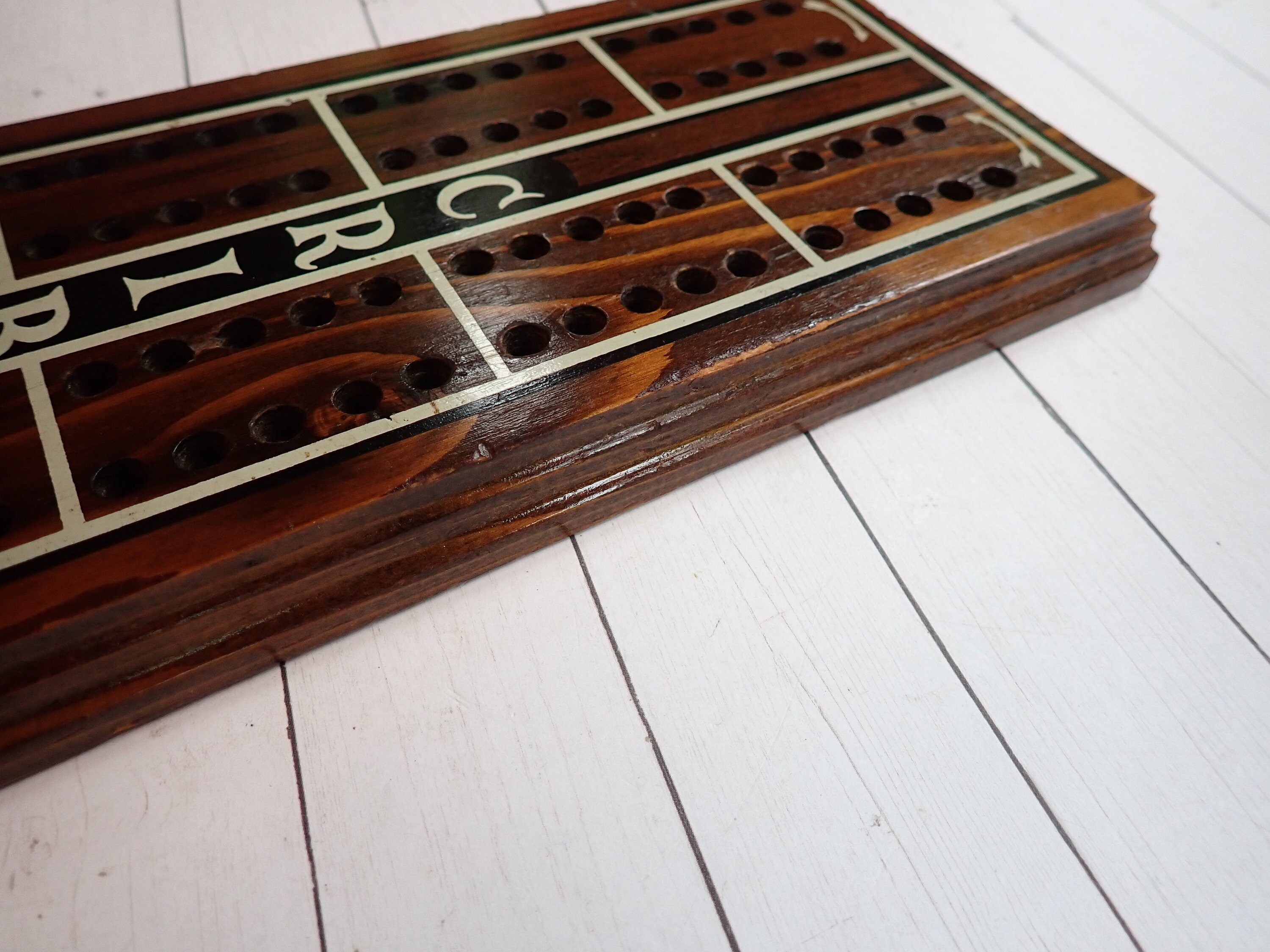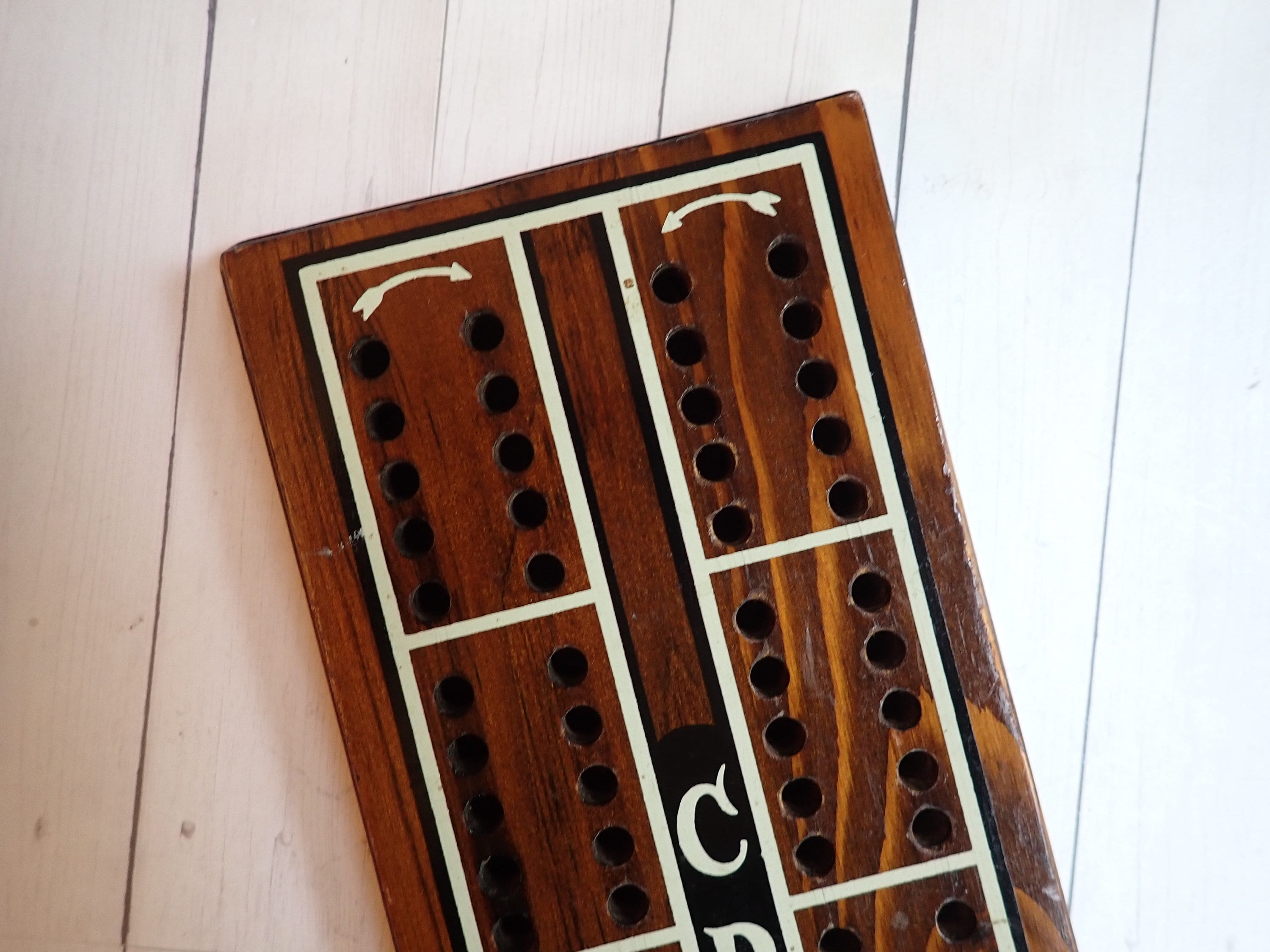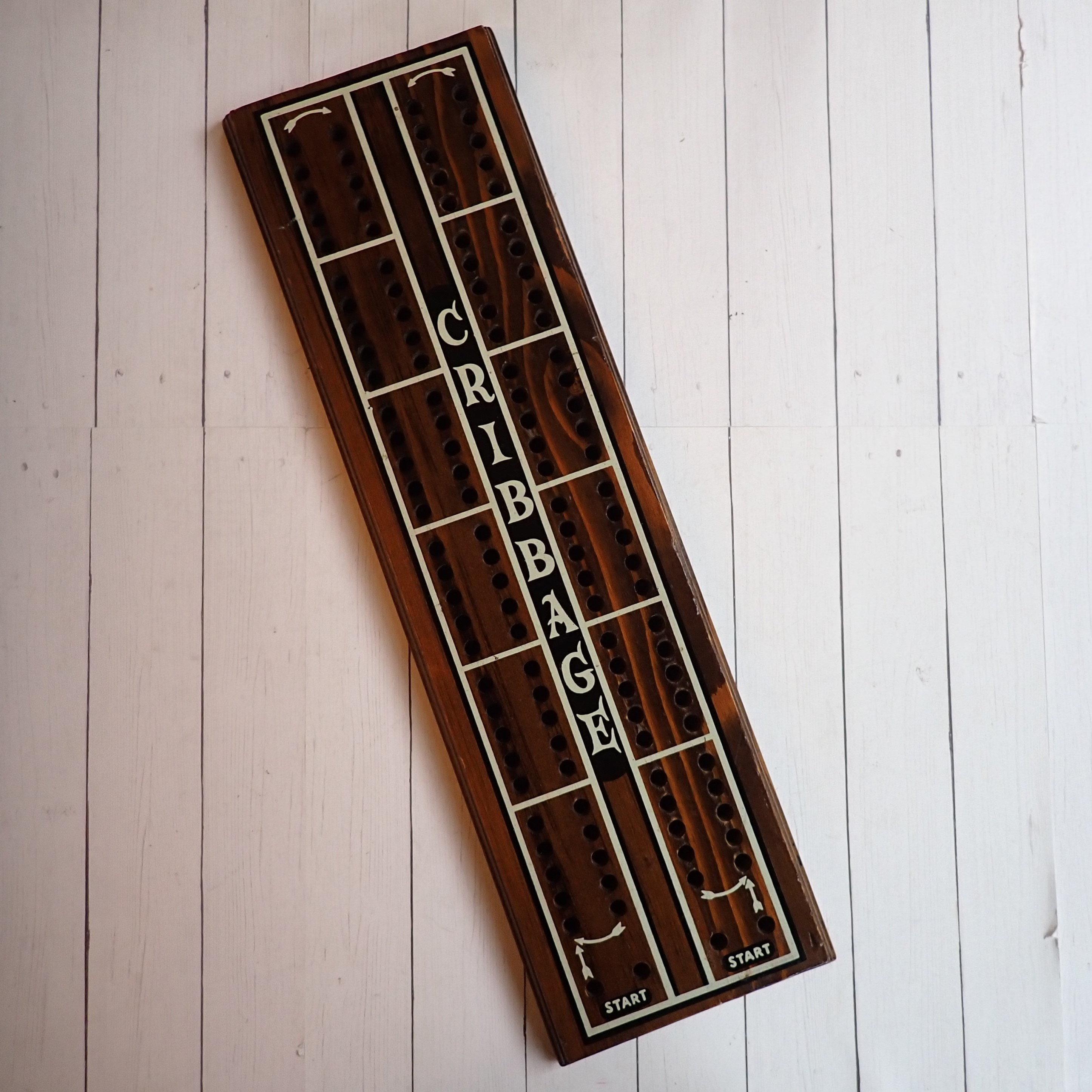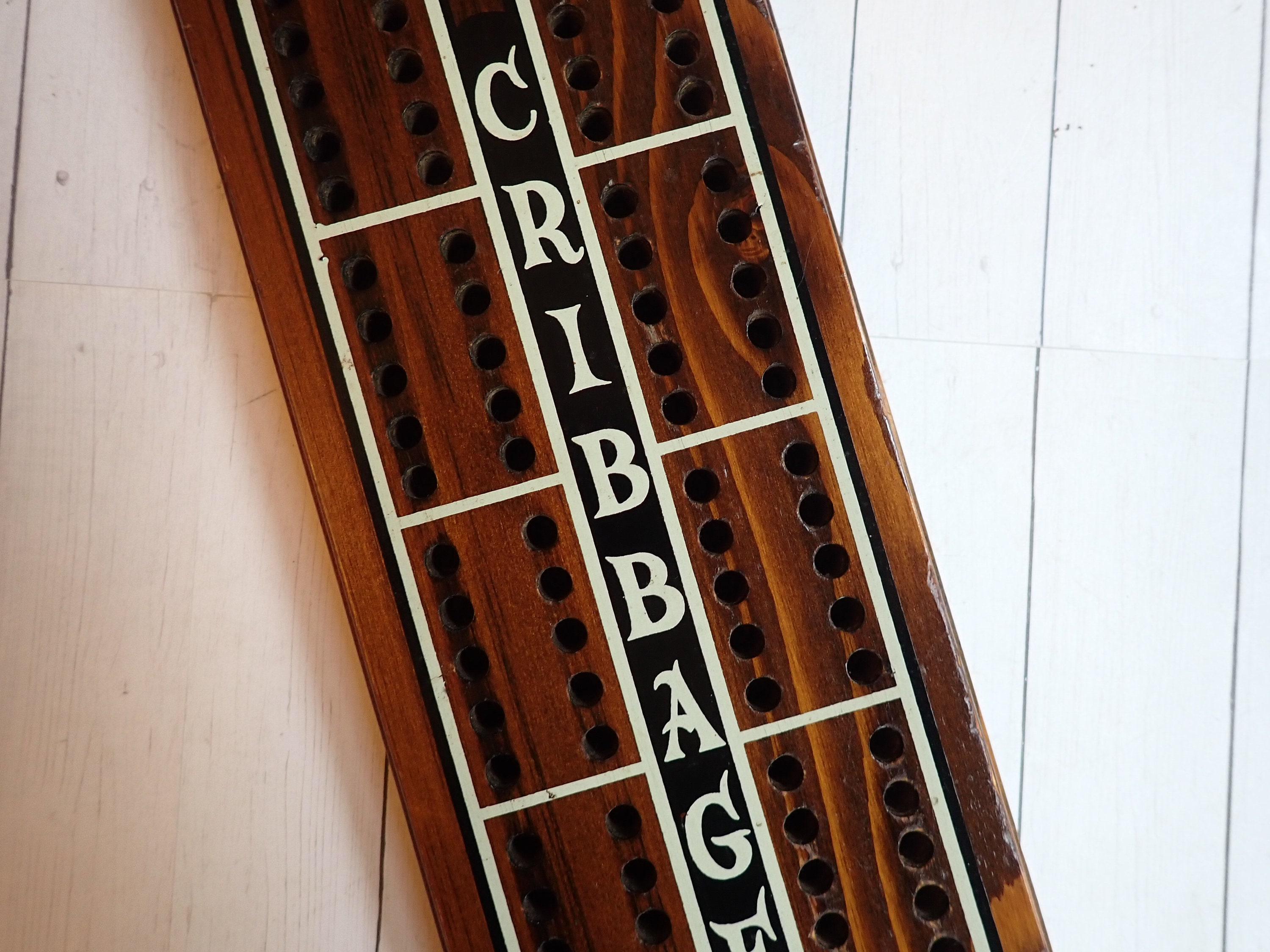 This vintage cribbage board is 16" long, 4.75" wide, and .75" thick and was made by Cornwall Wood Products. It is a large size board but there are no pegs. The board is a dark brown with white and black accents, and says CRIBBAGE down the center of the board. There is a Cornwall label on the back of the board, as well as a hole for hanging the board on the wall. There are no pegs included with this board.