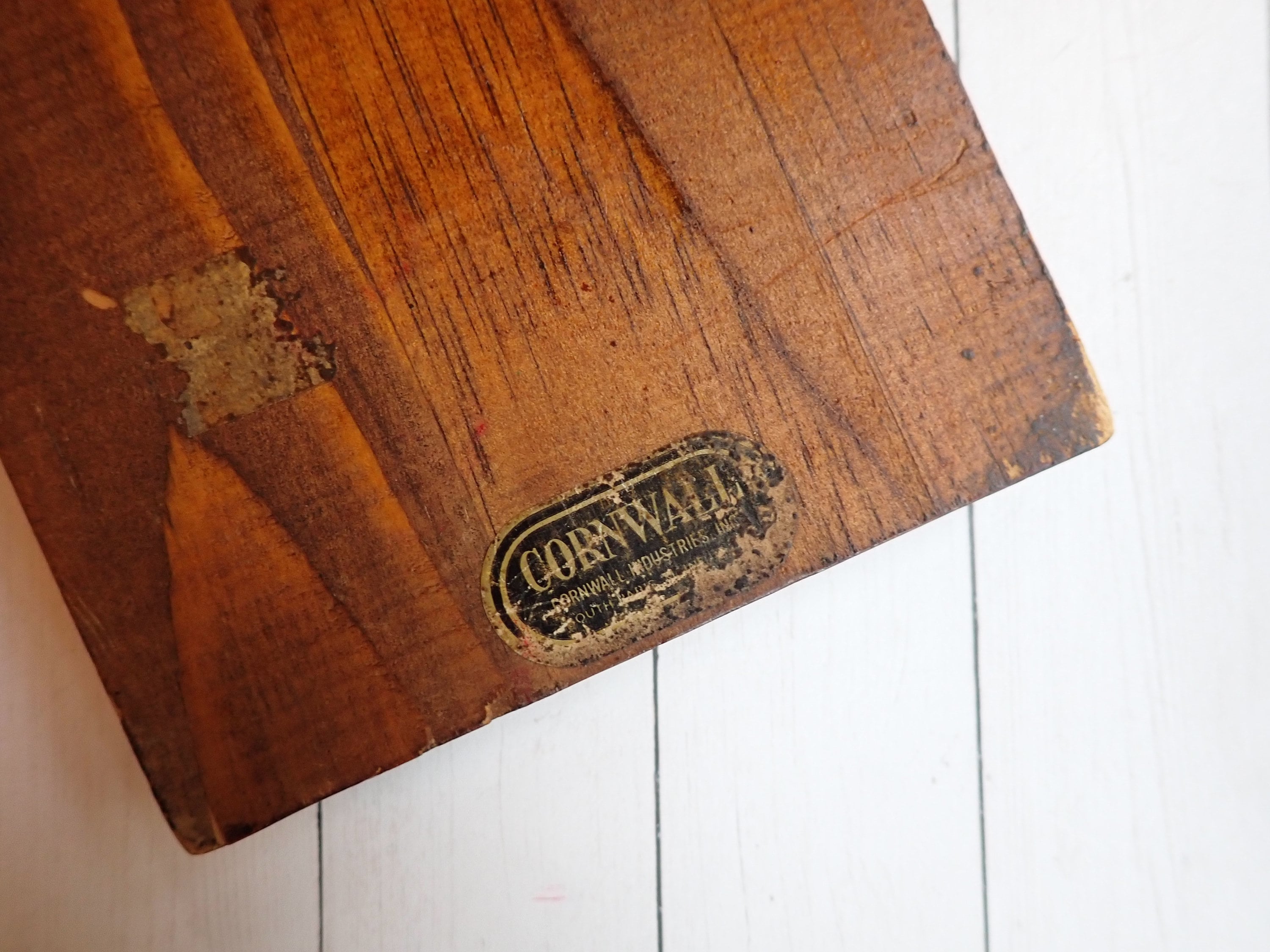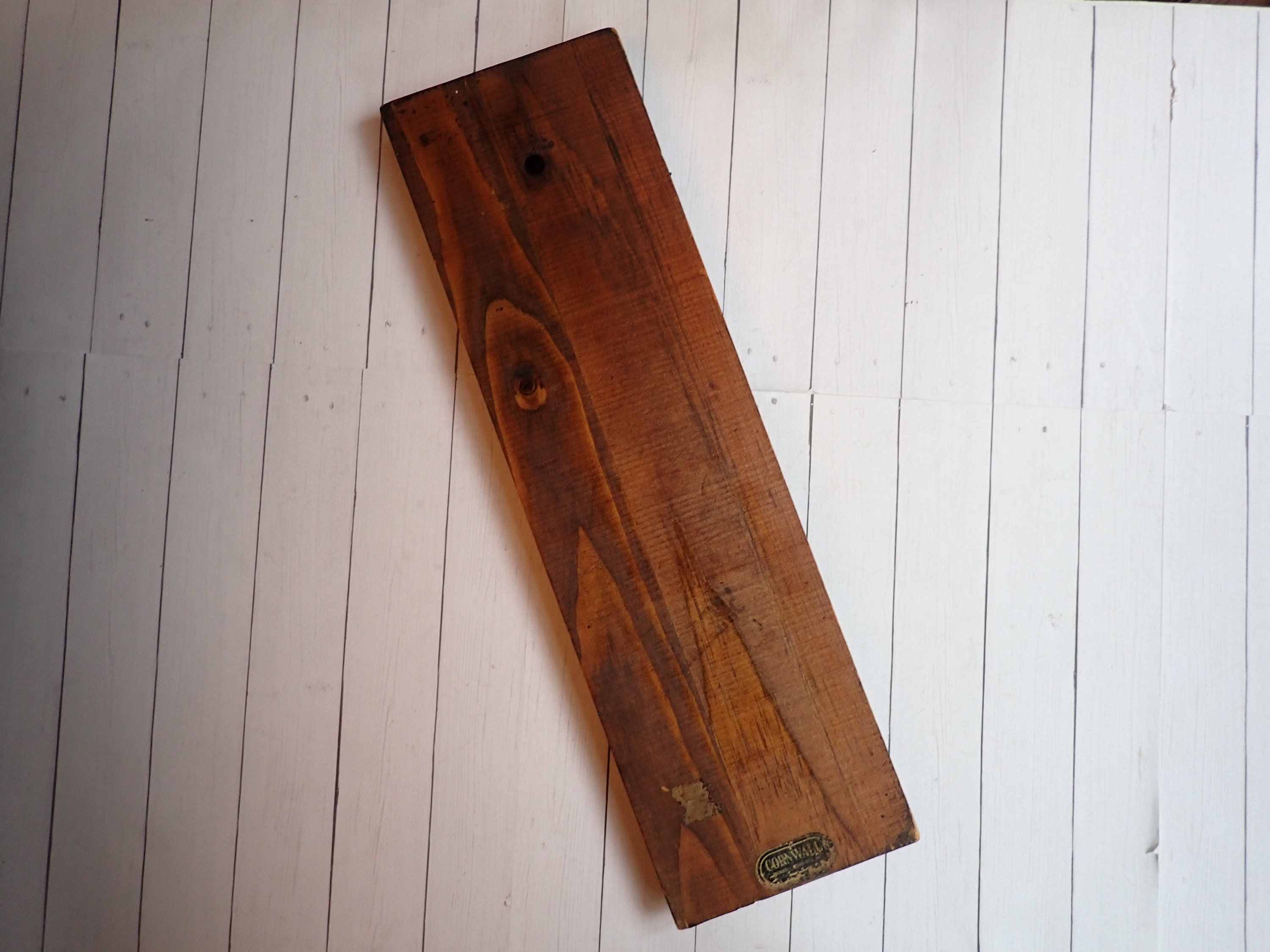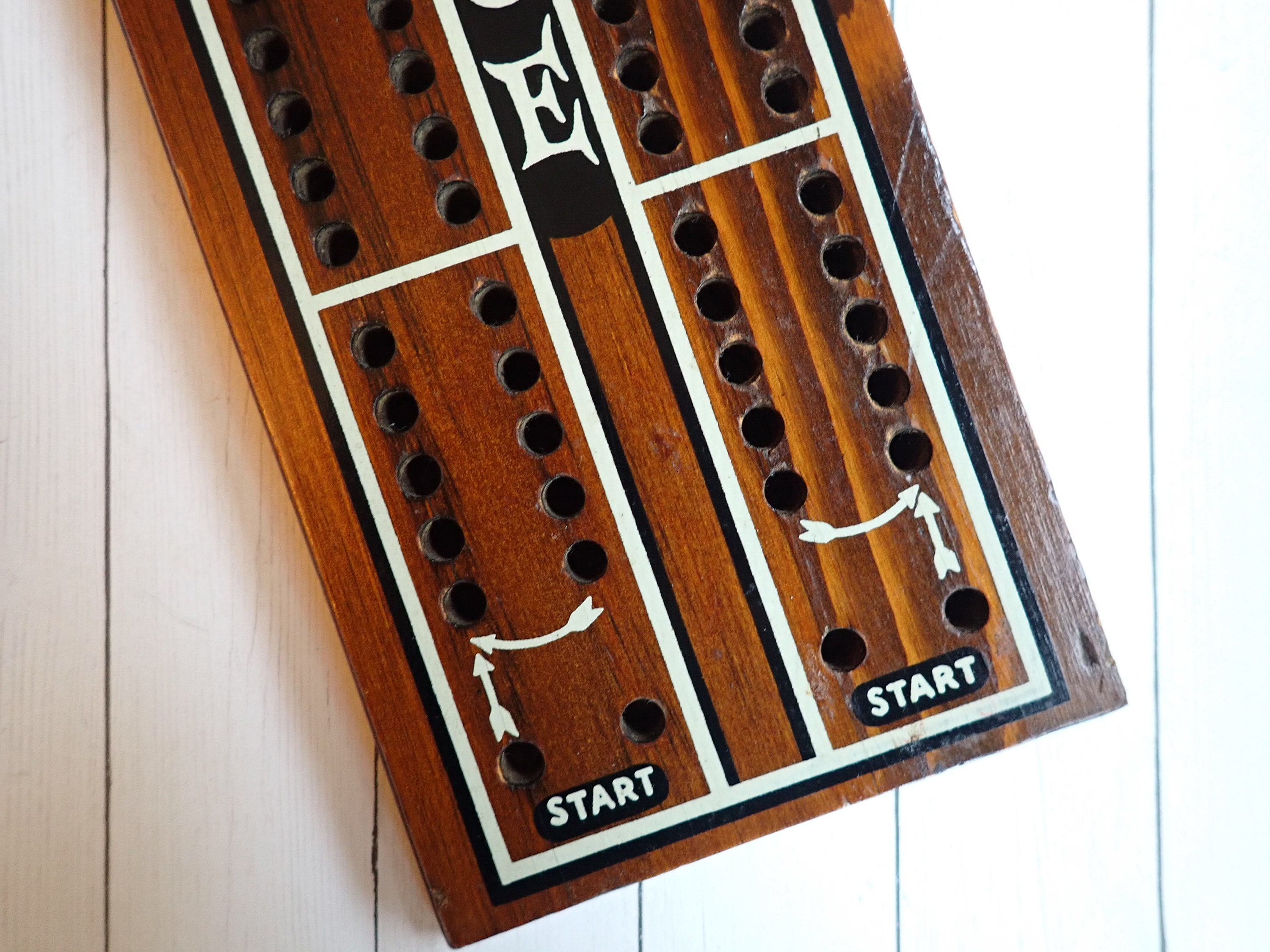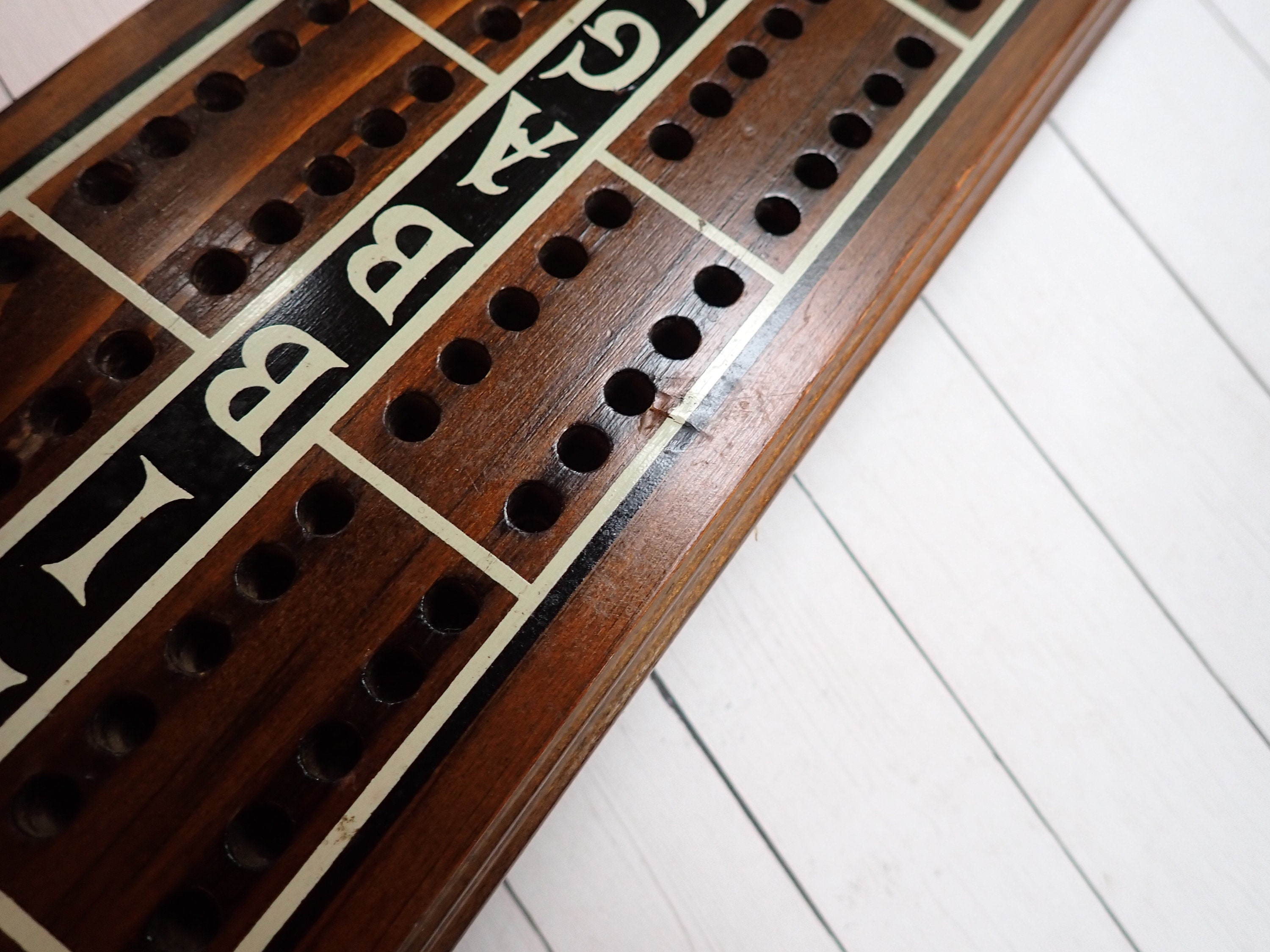 This vintage cribbage board is 16" long, 4.75" wide, and .75" thick and was made by Cornwall Wood Products. It is a large size board but there are no pegs. The board is a dark brown with white and black accents, and says CRIBBAGE down the center of the board. There is a Cornwall label on the back of the board, as well as a hole for hanging the board on the wall. There are no pegs included with this board.