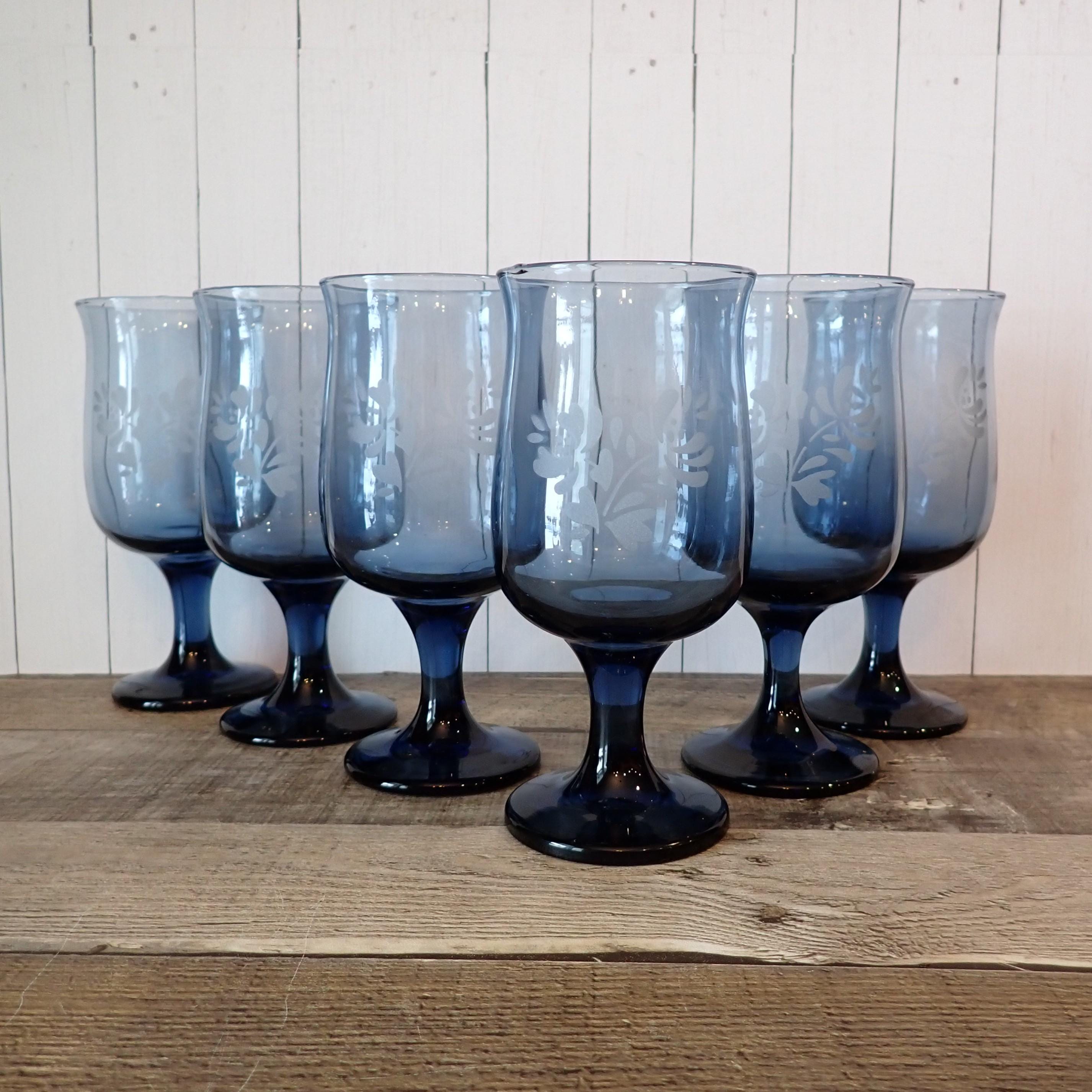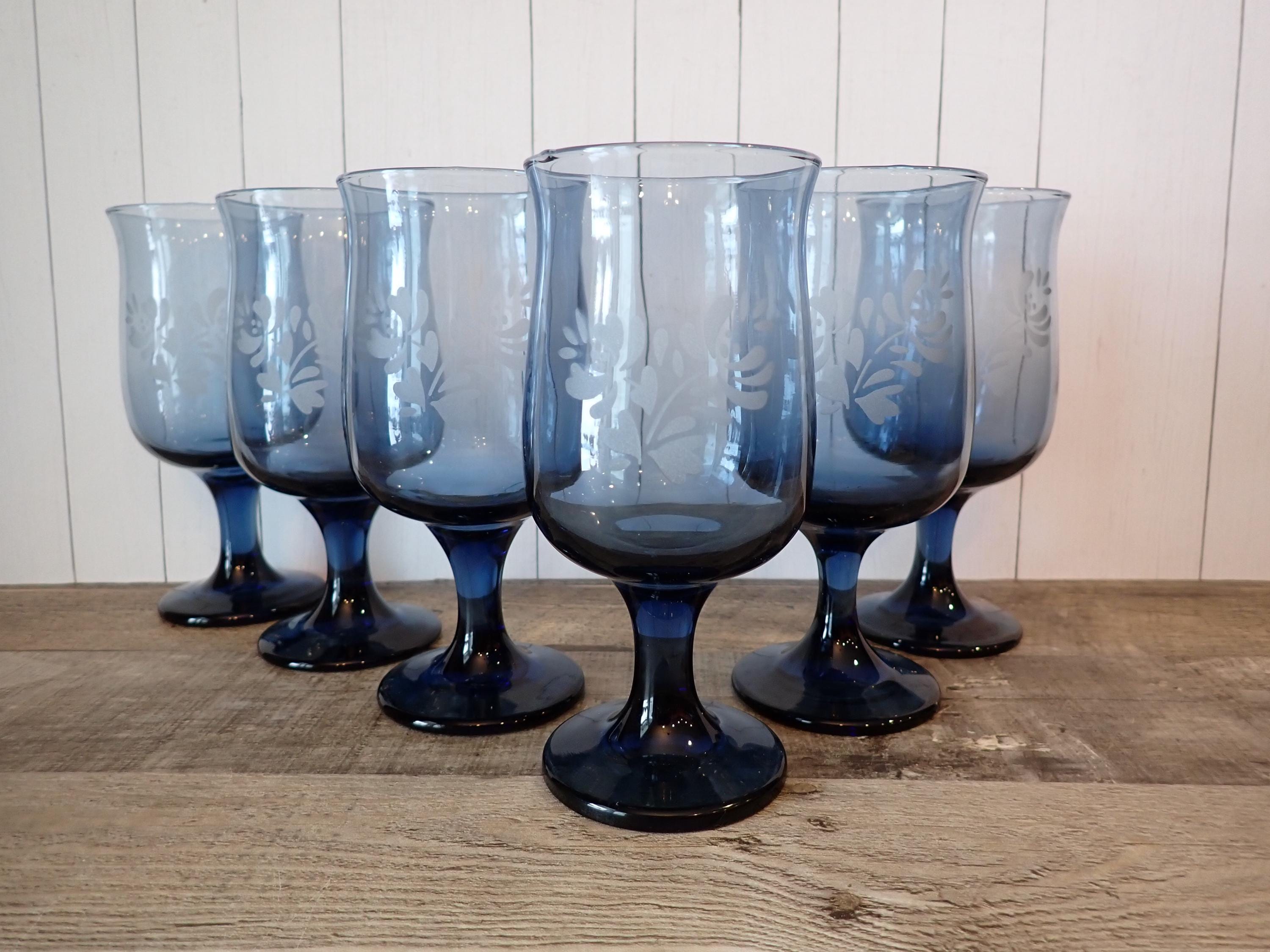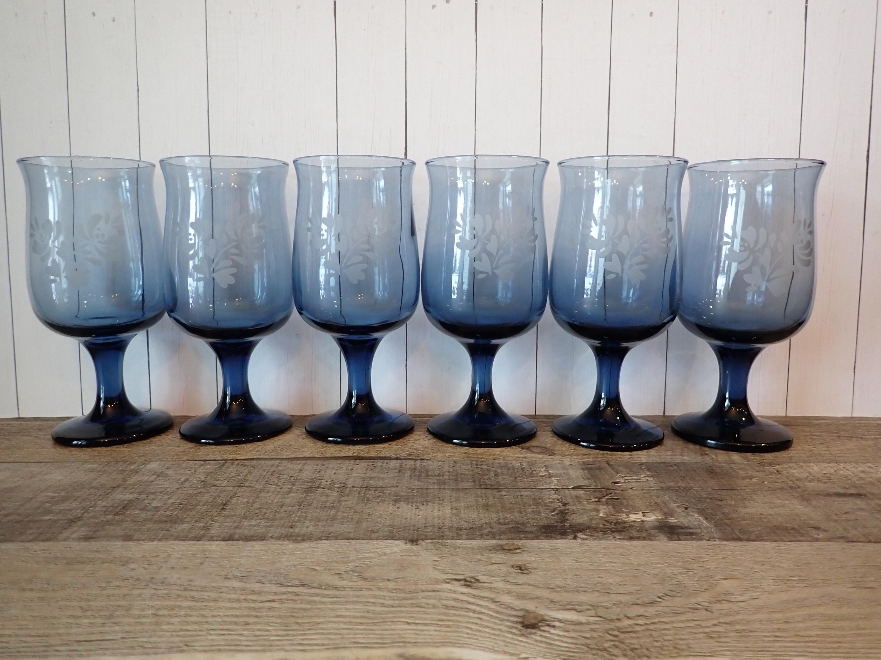 This set of Pfaltzgraff glasses includes 6 of the 12 oz. Glassware Goblets in the Yorktowne pattern. The goblets are 6.5" tall and can hold 12 oz. The pretty blue glass is accented with an etched design of the Yorktowne pattern flower on the front side of the glass. They have a nice, thick stem that leads to a circular base. The bases are marked Pfaltzgraff U.S.A. All 6 glasses are in very good condition with no chips or cracks. Very nice set of Pfaltzgraff goblets! There are 2 sets of 6 available if you are looking for a larger set.