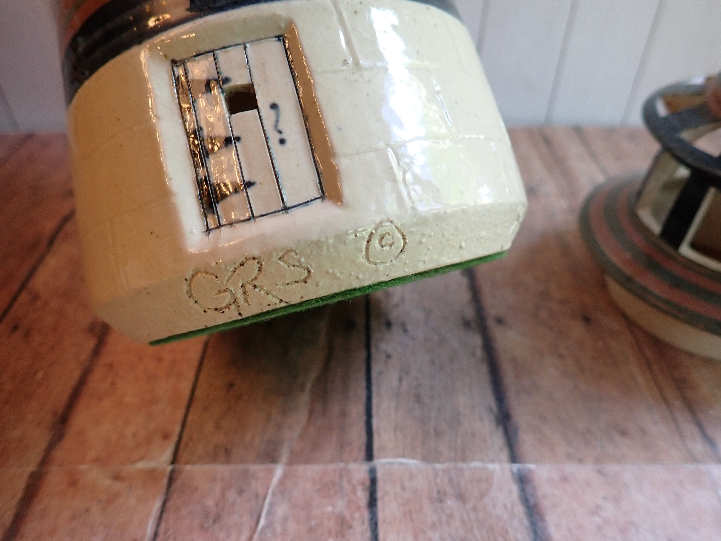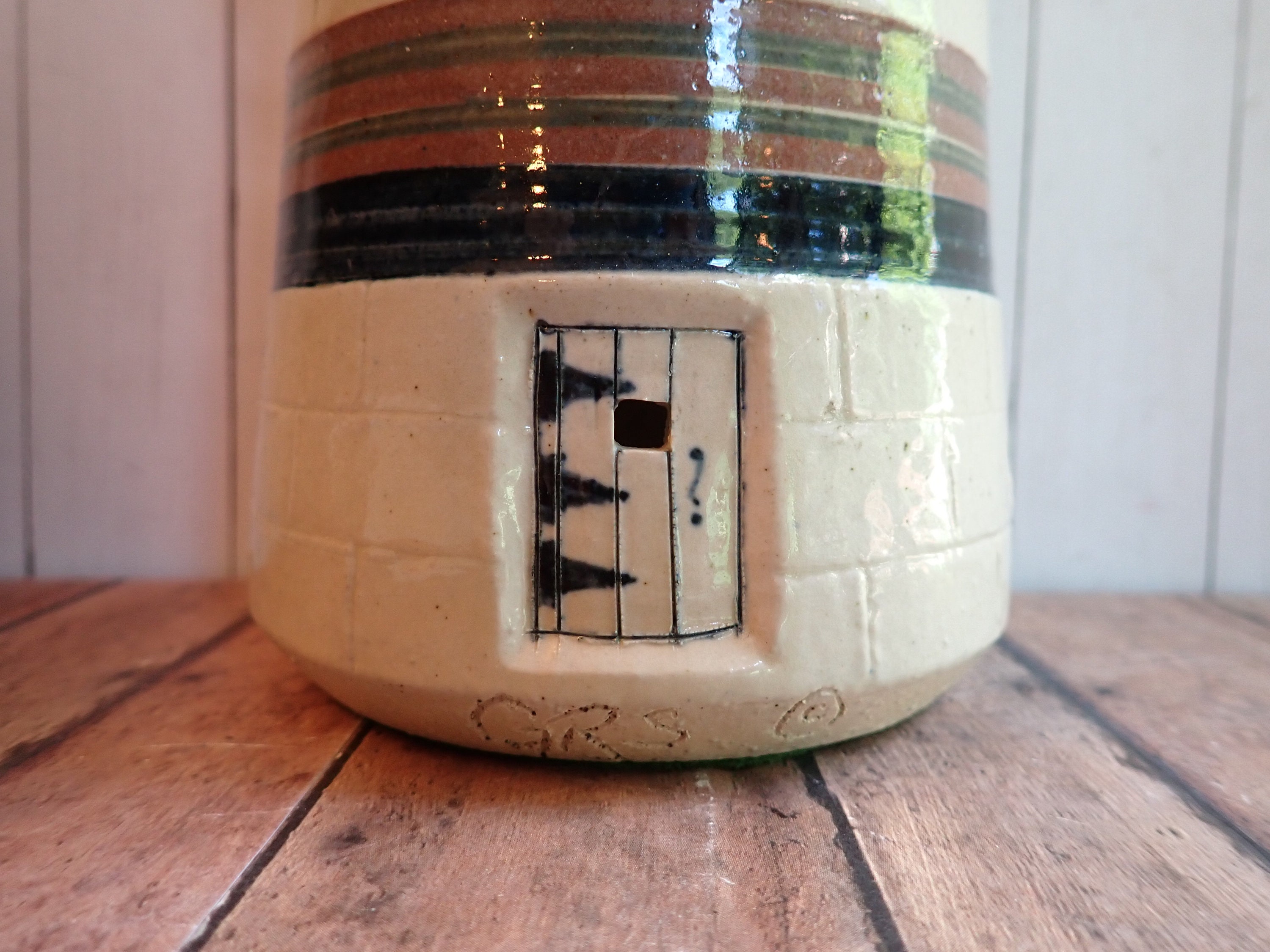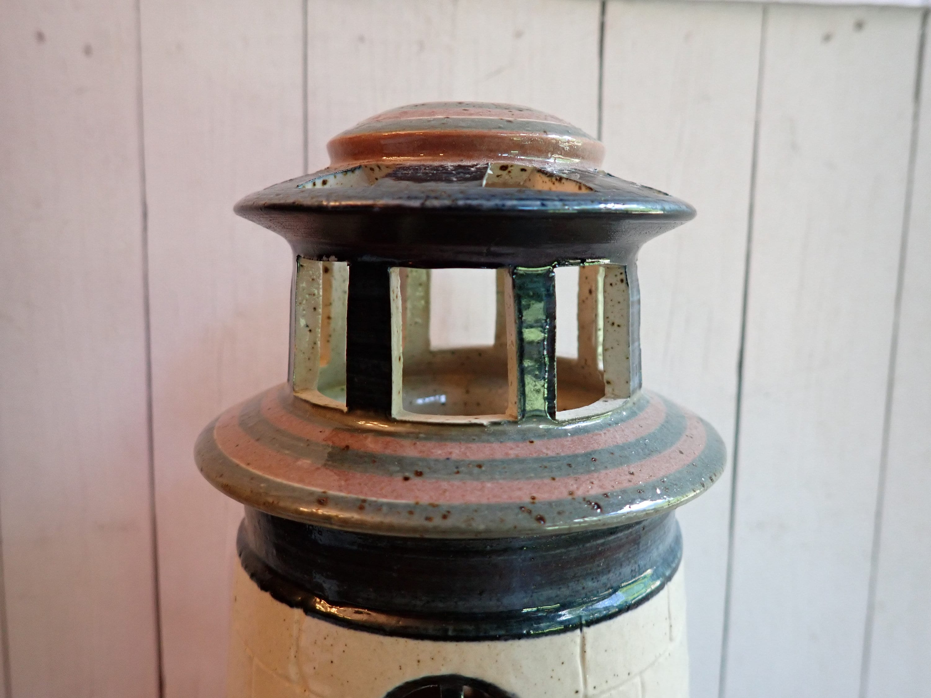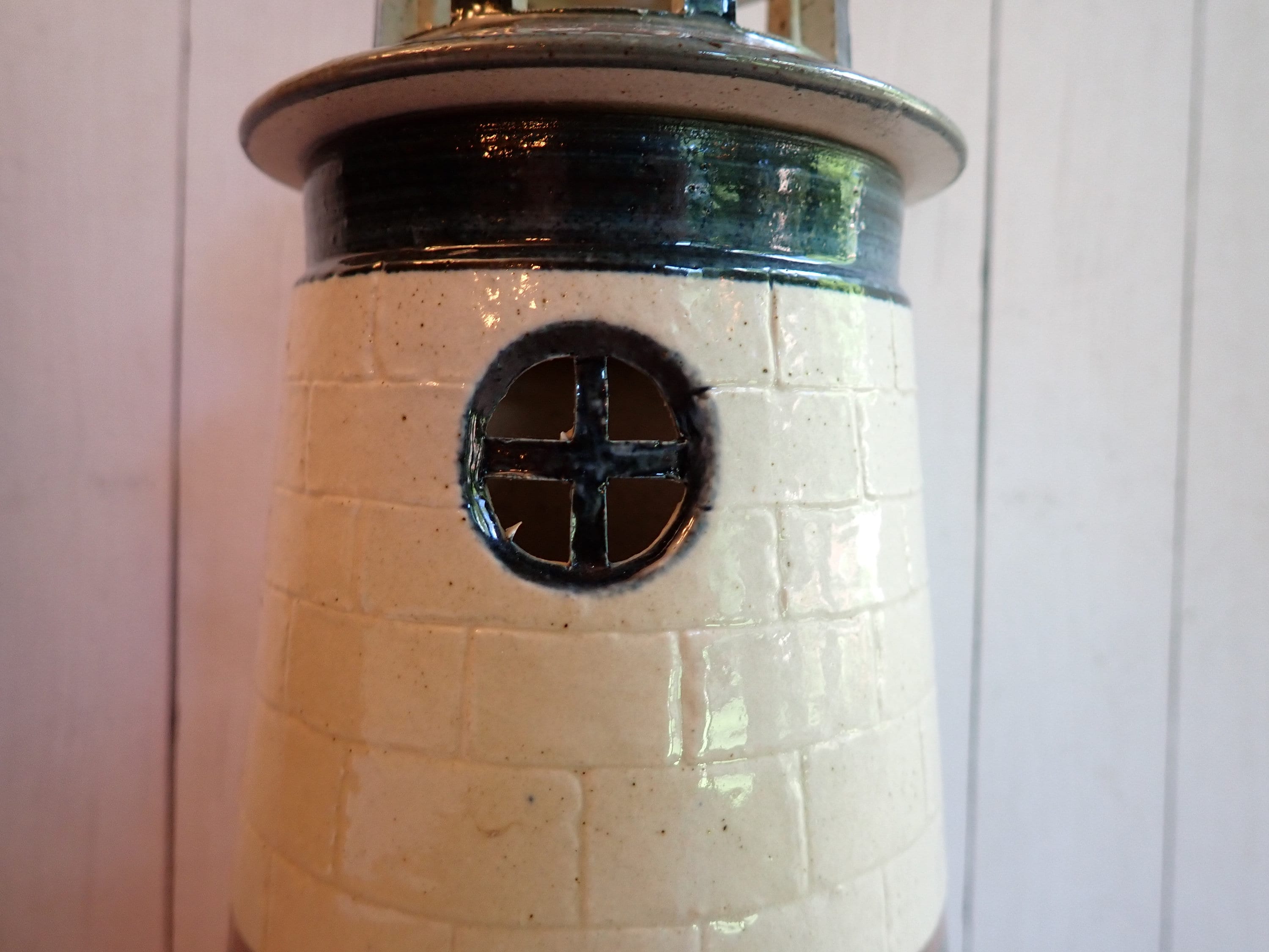 This pottery lighthouse by Gills Rock Stoneware is 9.5" tall and 4.25" in diameter. It is a light gray stoneware, and is accented with blue and purple bands and blue trim around the windows and door. The top portion of the lighthouse lifts off, and an oil canister can be placed inside. The base of the figurine is marked: GRS and 86.
