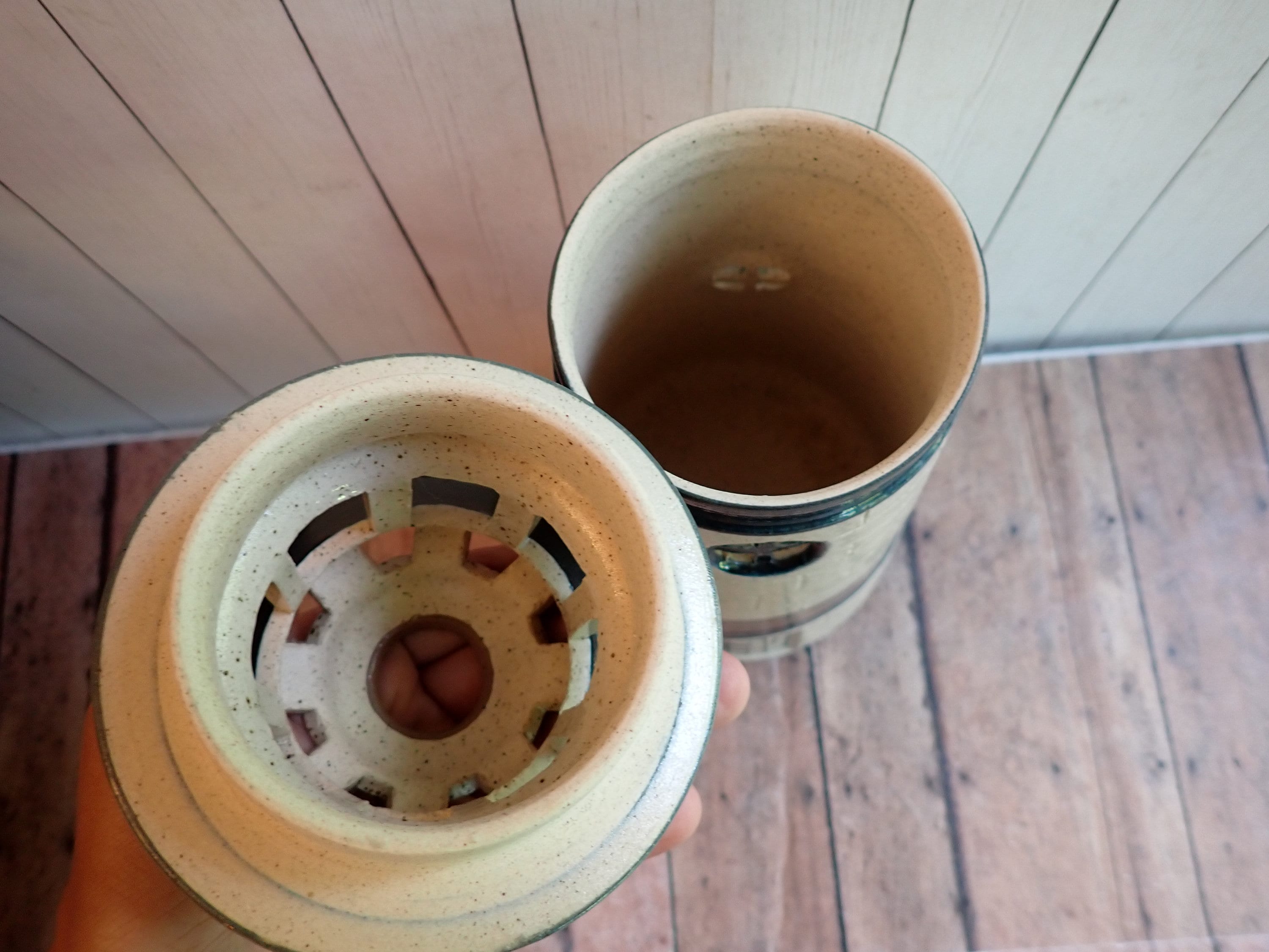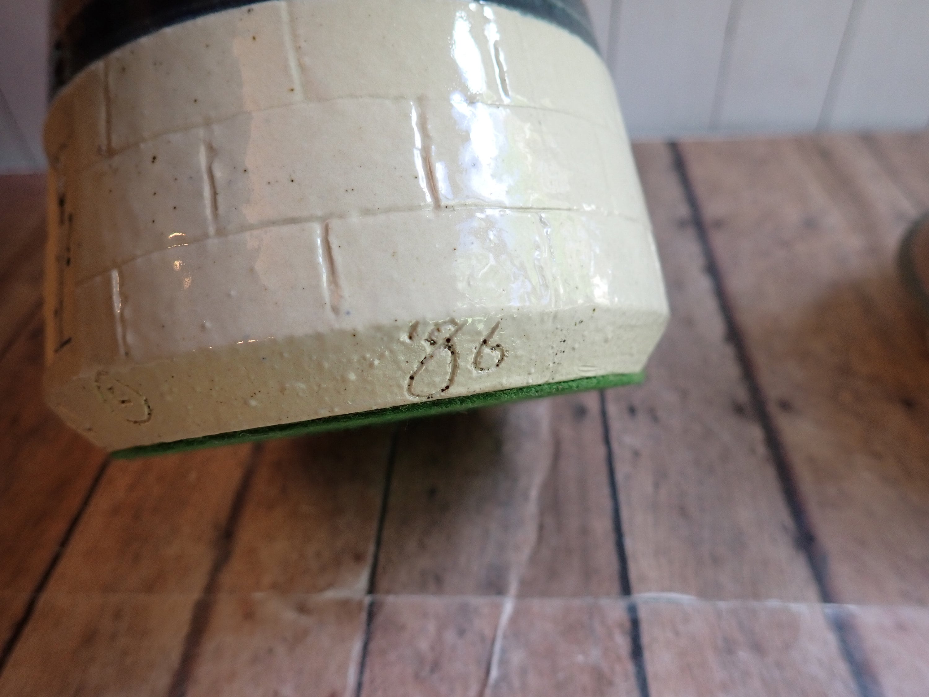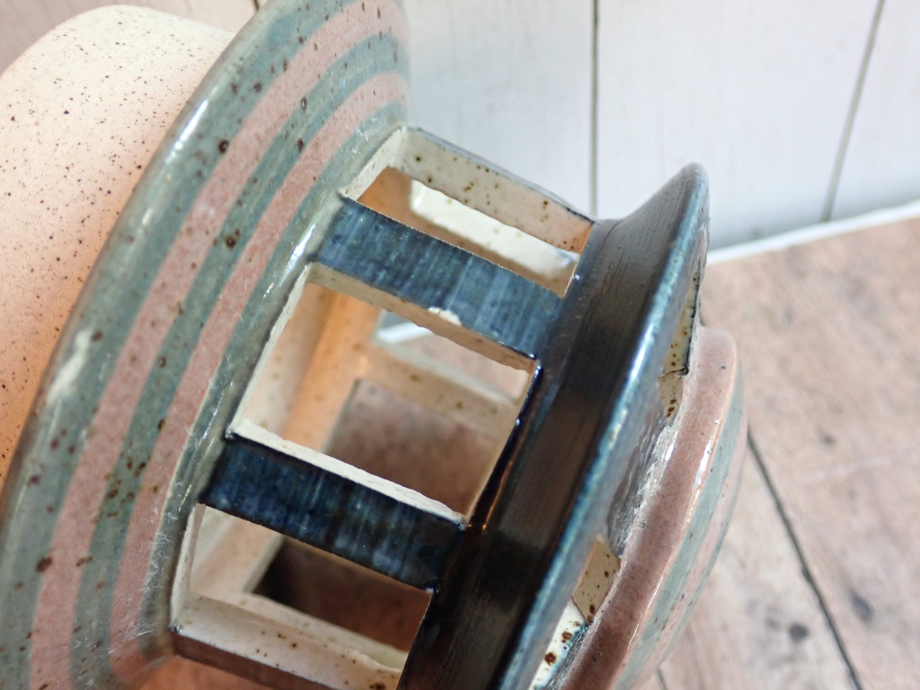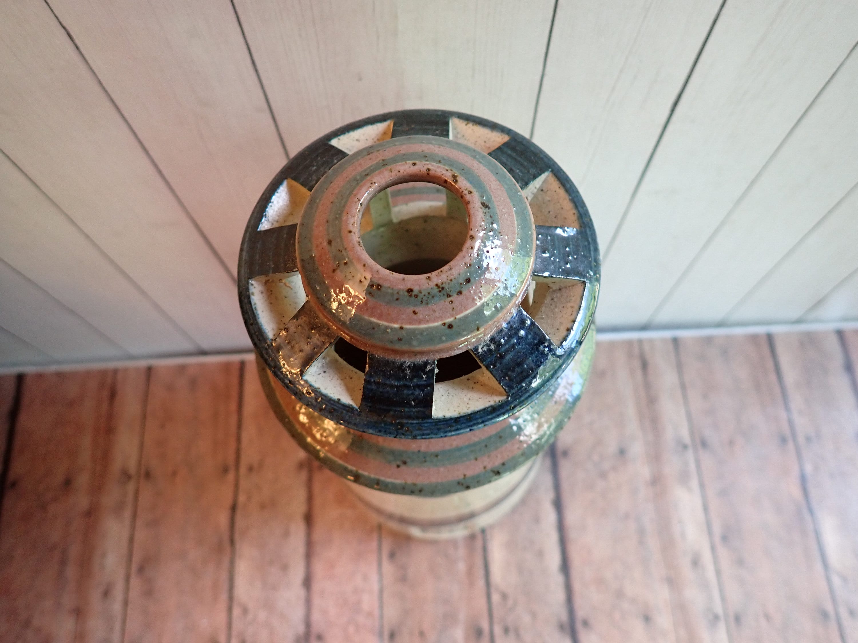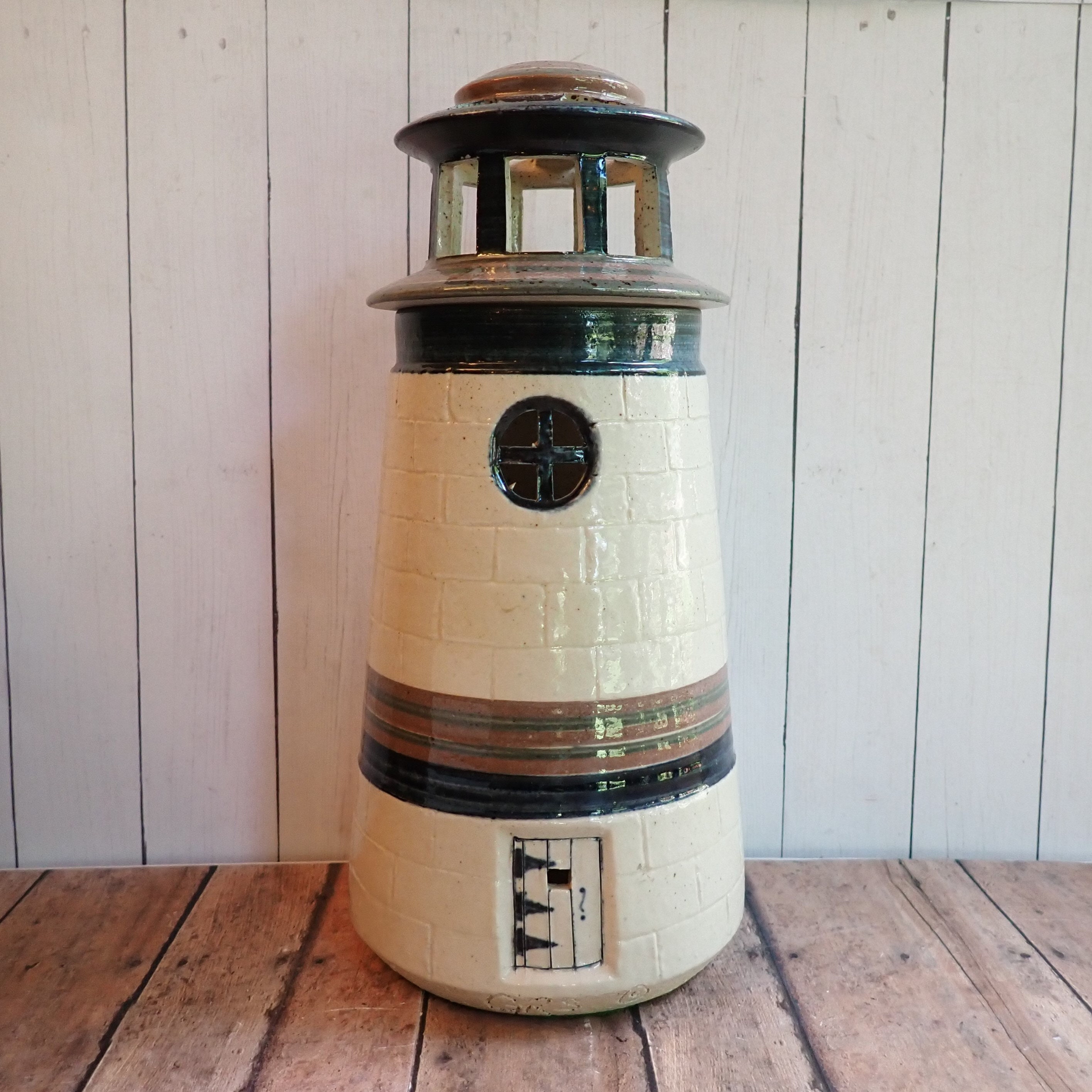 This pottery lighthouse by Gills Rock Stoneware is 9.5" tall and 4.25" in diameter. It is a light gray stoneware, and is accented with blue and purple bands and blue trim around the windows and door. The top portion of the lighthouse lifts off, and an oil canister can be placed inside. The base of the figurine is marked: GRS and 86.