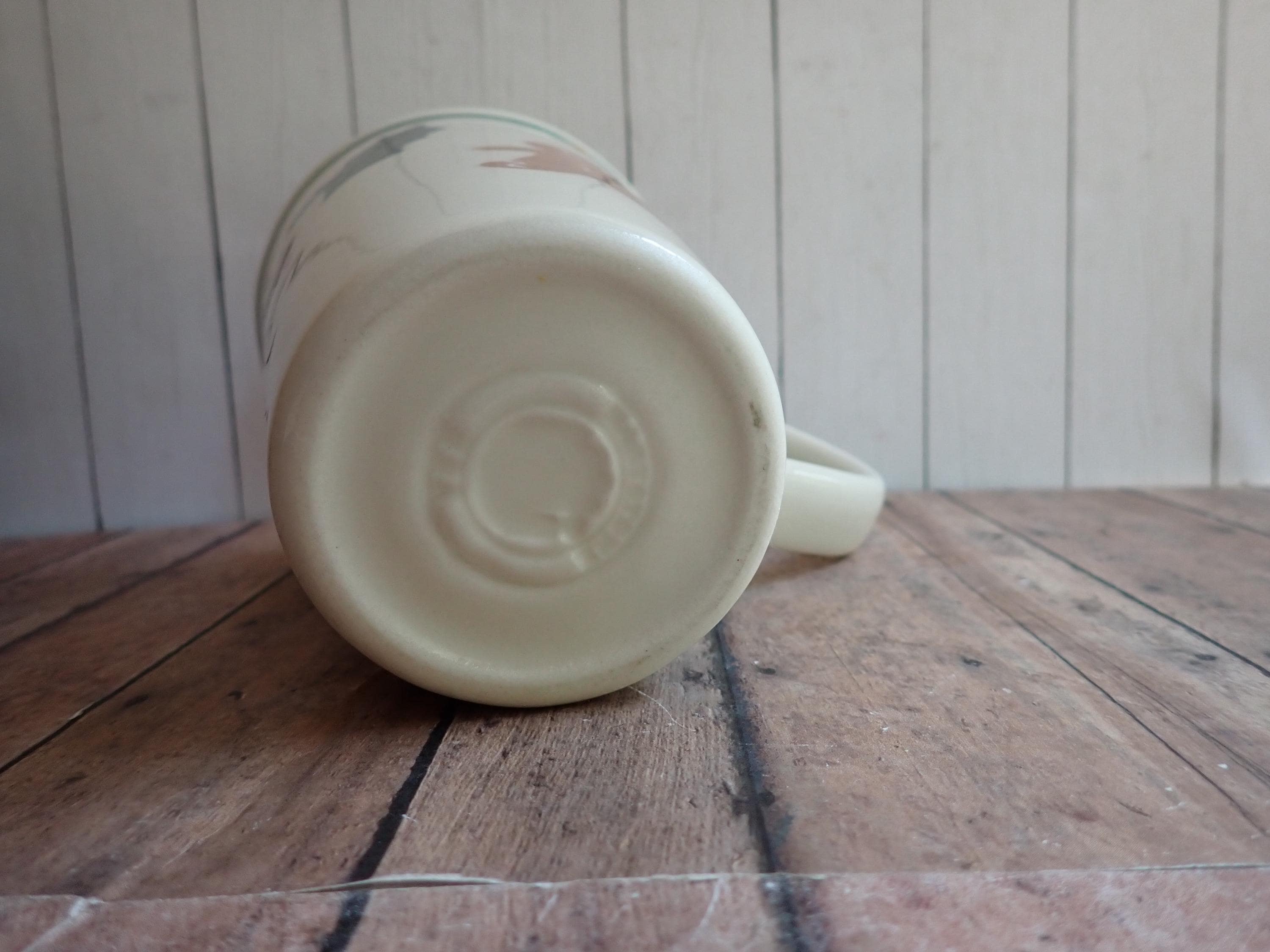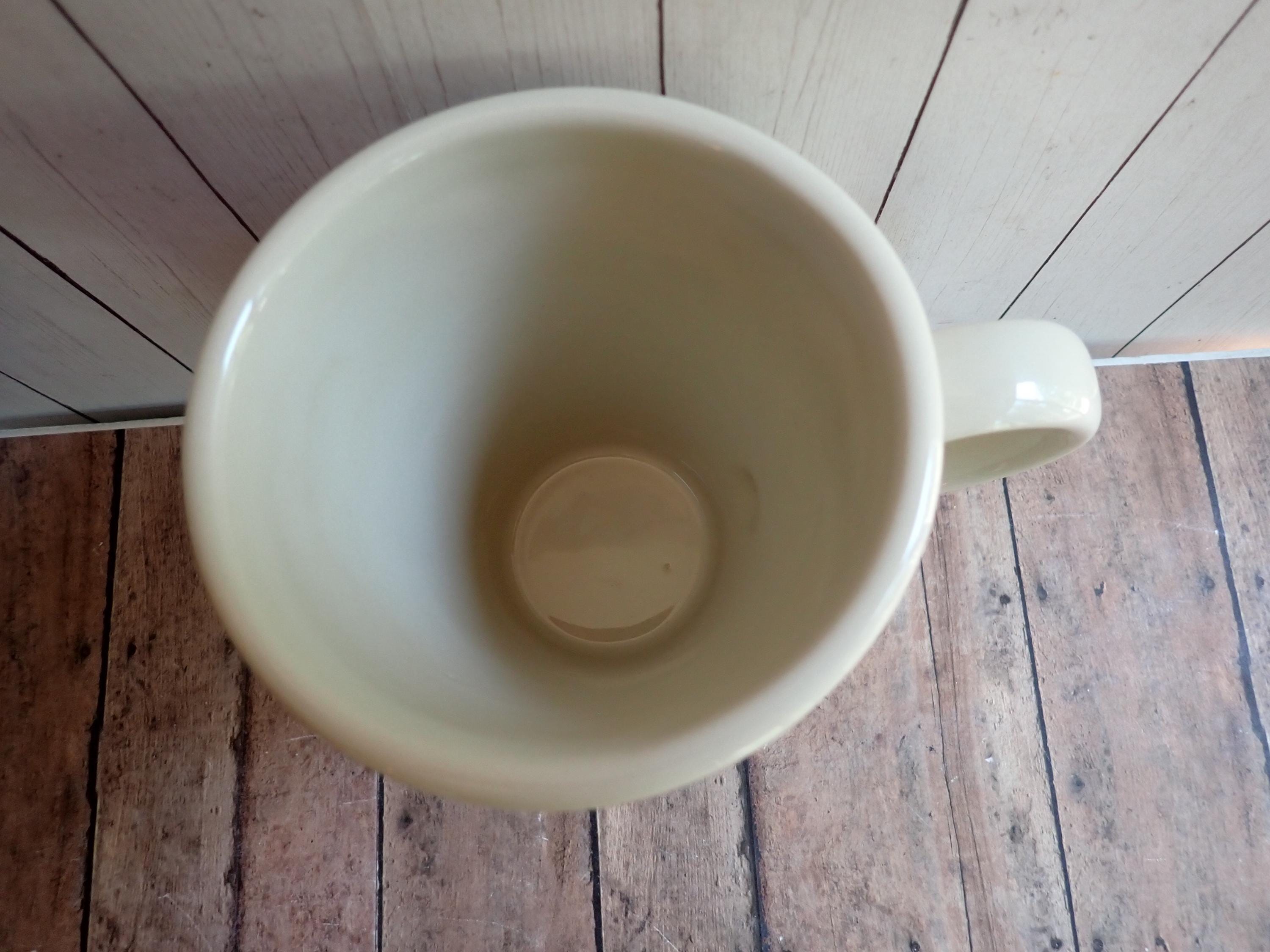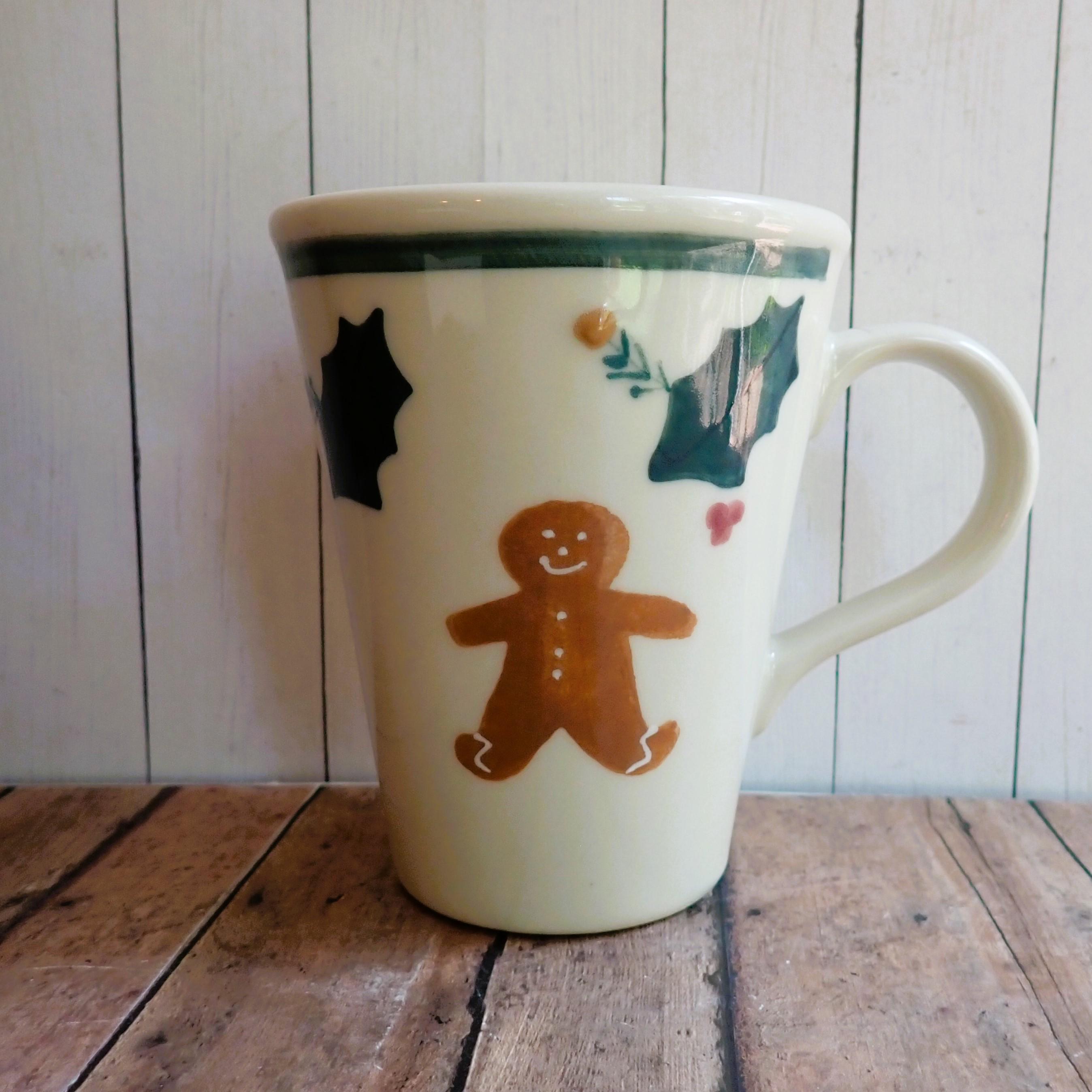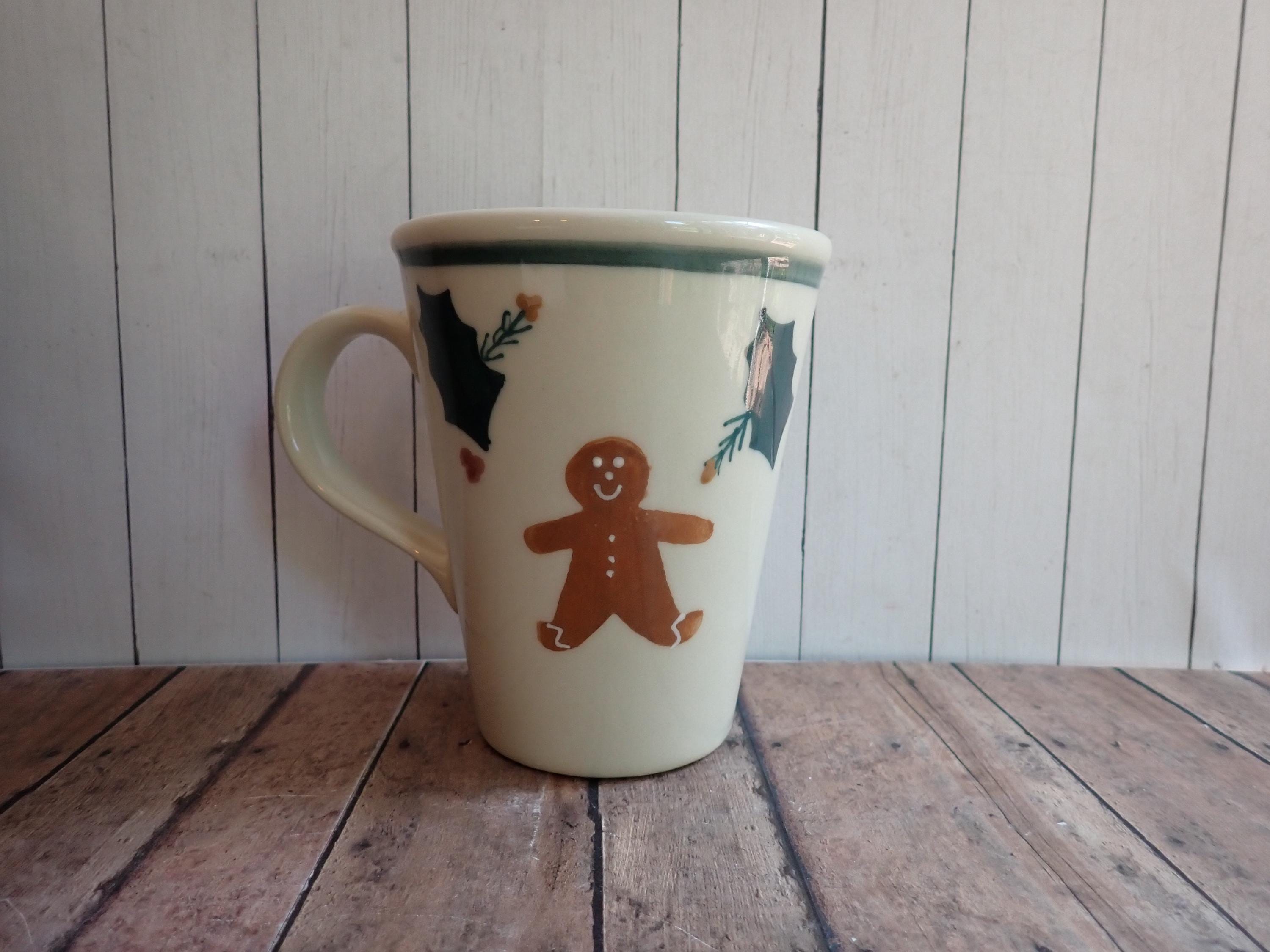 This tall ceramic mug by Hartstone Pottery is in the Gingerbread pattern and is 5.25" tall and 4.25" in diameter at the rim. It is a white stoneware with a green holly and brown gingerbread man pattern around the mug. The bottom of the mug is marked with Hartstone logo. This large mug can hold 16 oz.