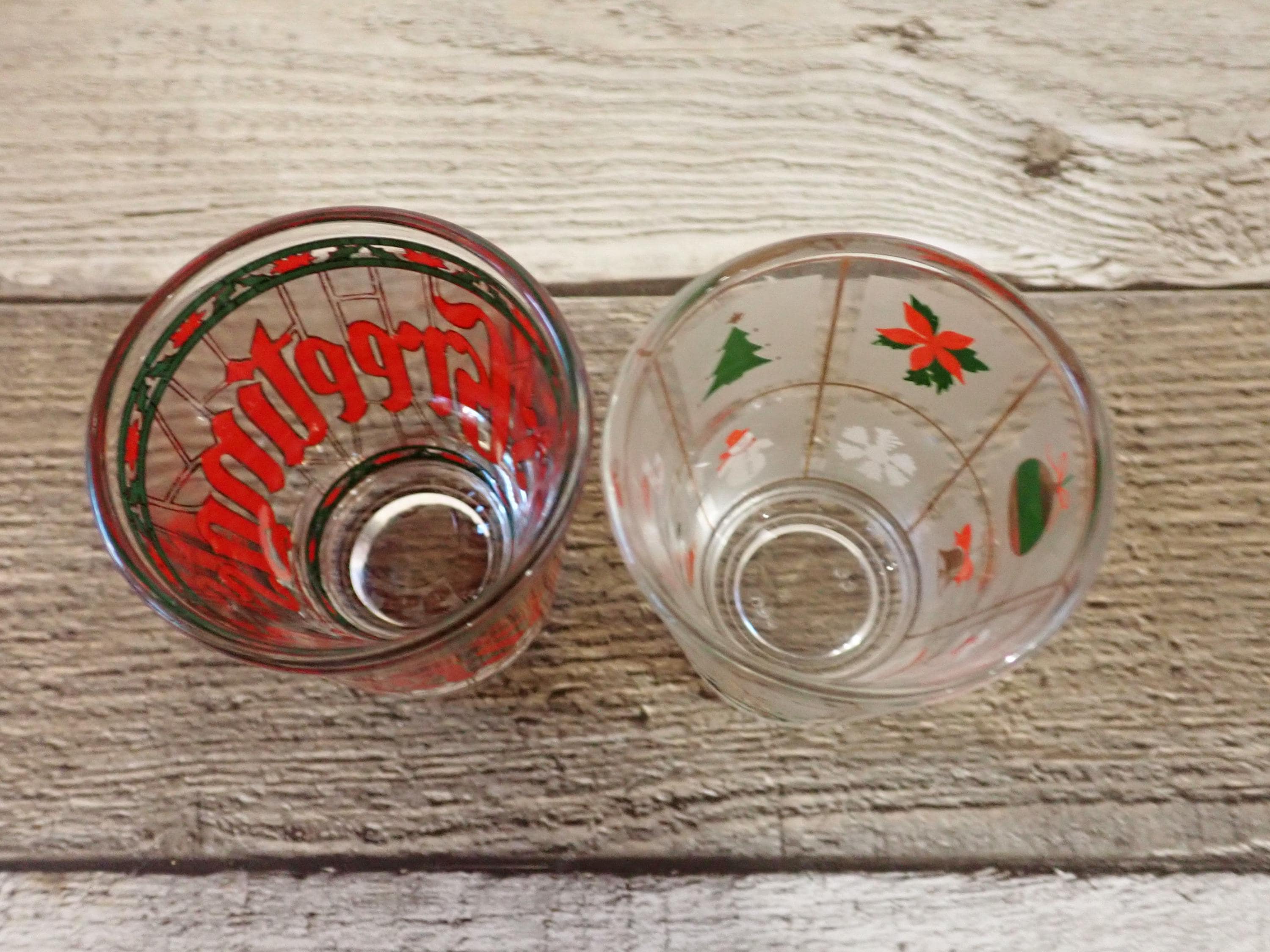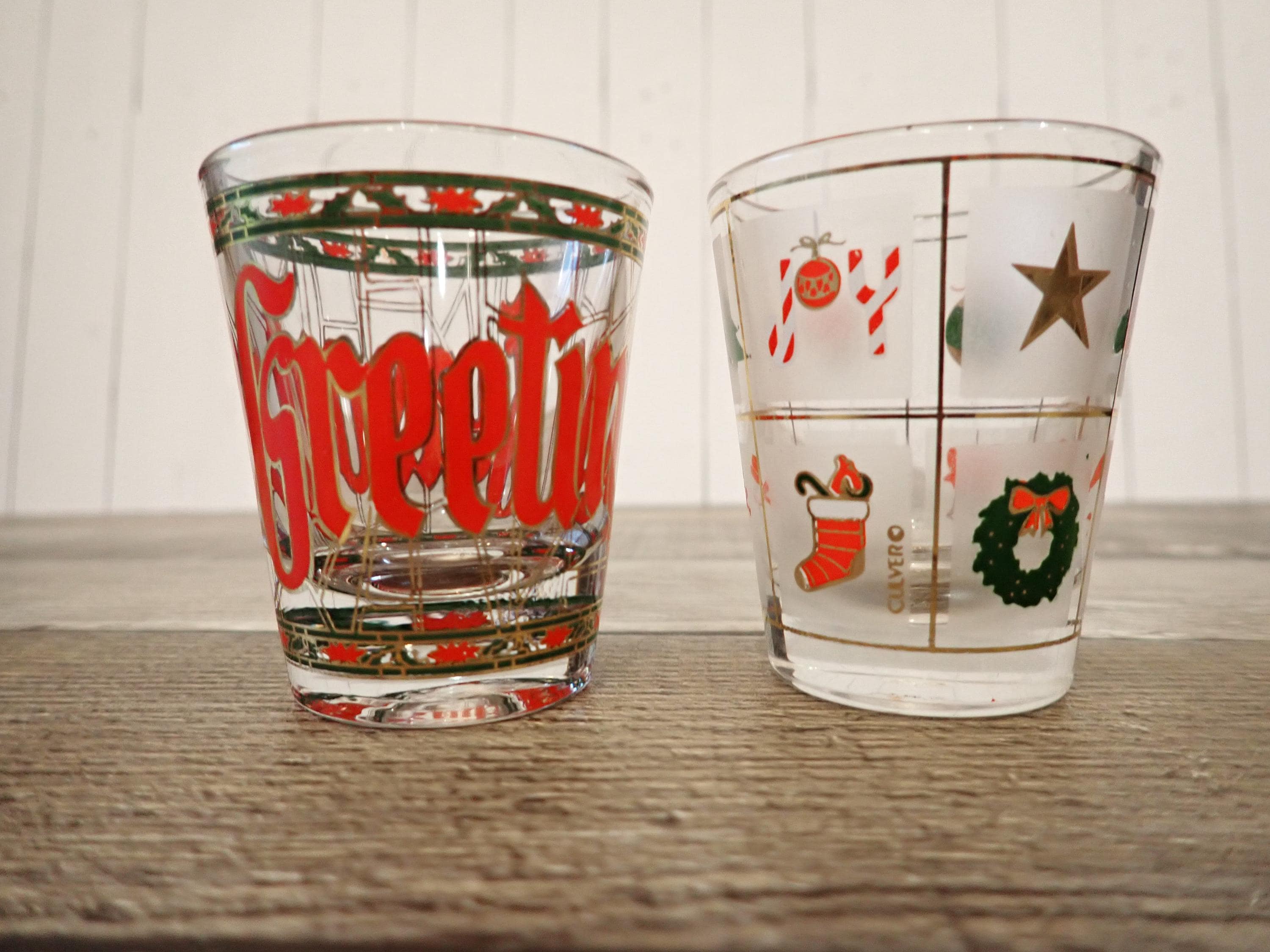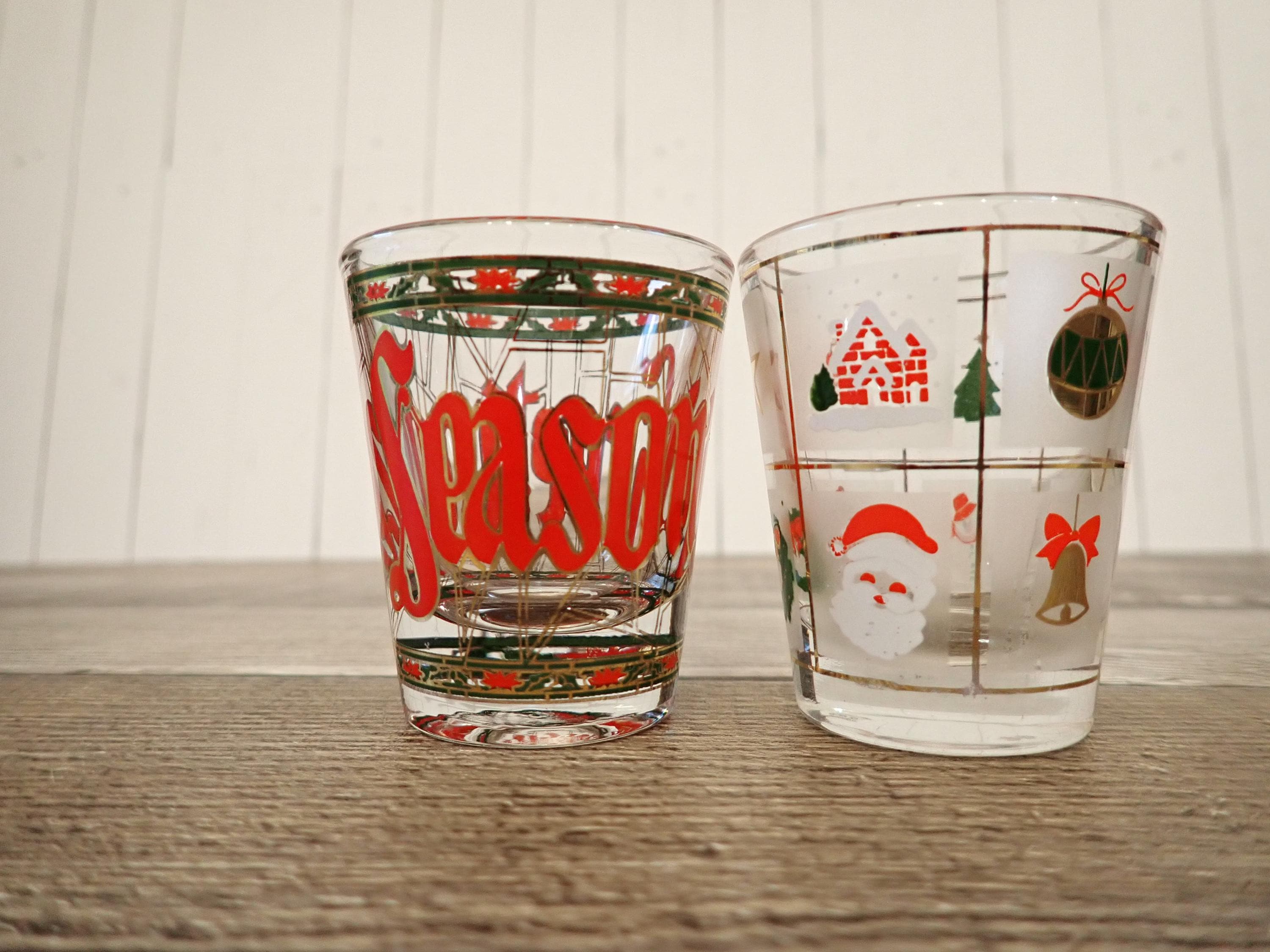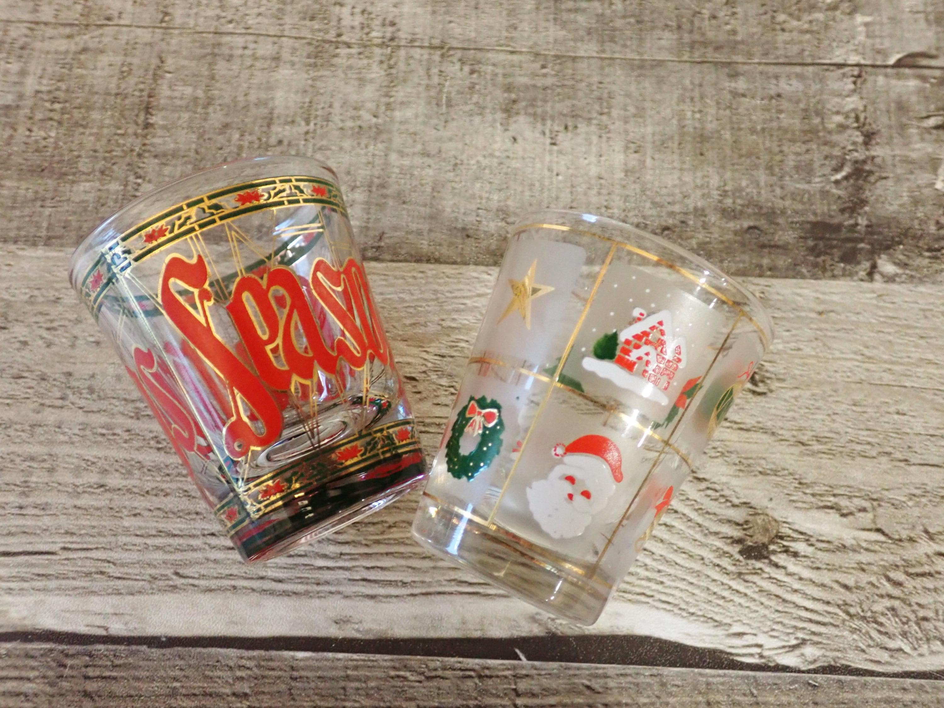 This set of 2 shot glasses by Culver are each 2.25" tall and 2" in diameter at the rim. They are clear glass and one has a has a red, green, and gold stained glass look with poinsettias and holly, and letters that spell out SEASONS GREETINGS around the glass. The other is in the Xmas Potpouri pattern with a geometric square pattern with Christmas designs in each square. The shot glasses can hold 1 oz. Both shot glasses are in very good condition with no chips or cracks. All of the graphics are bright and clear and the gold accents are fully intact.
