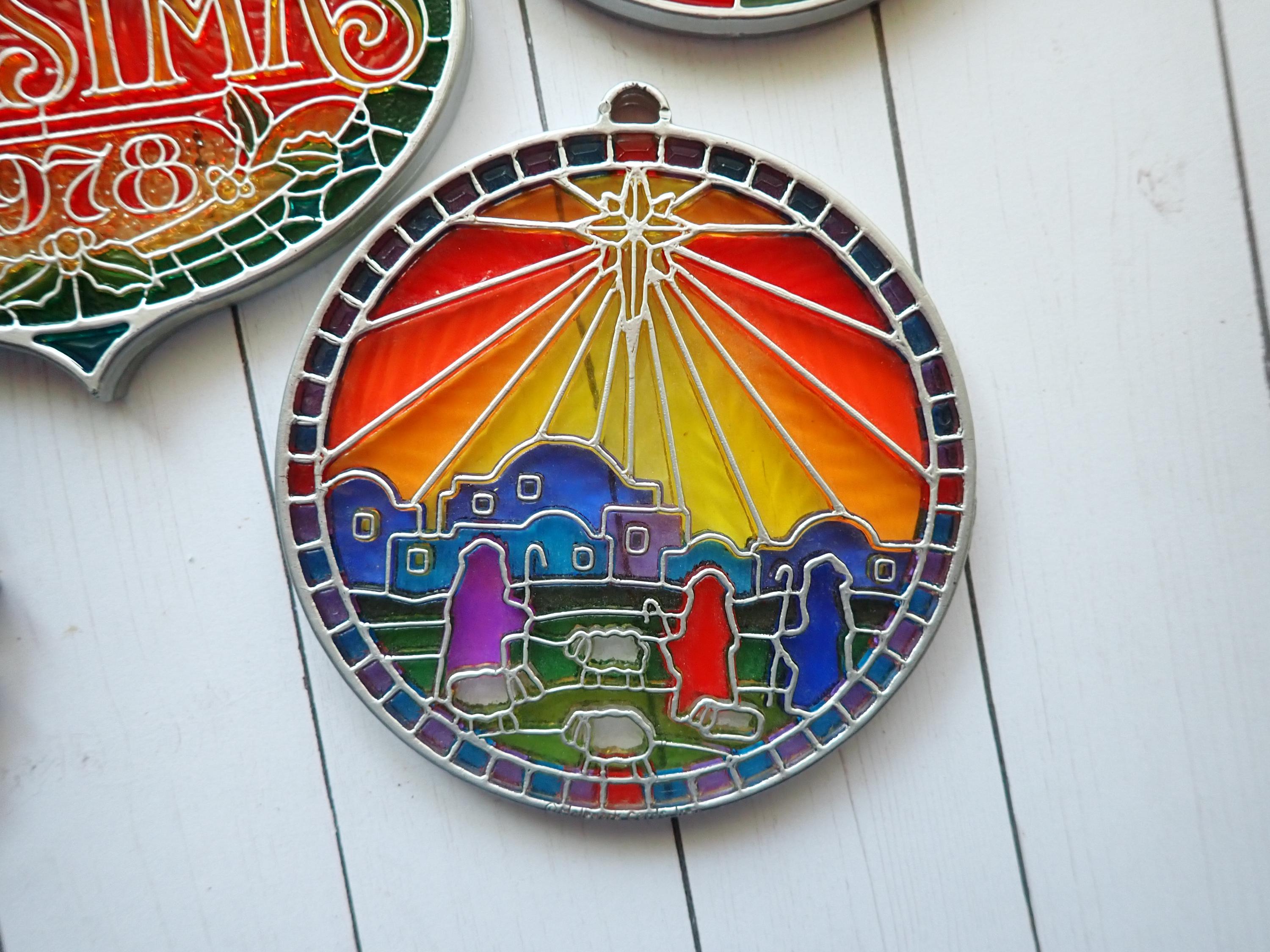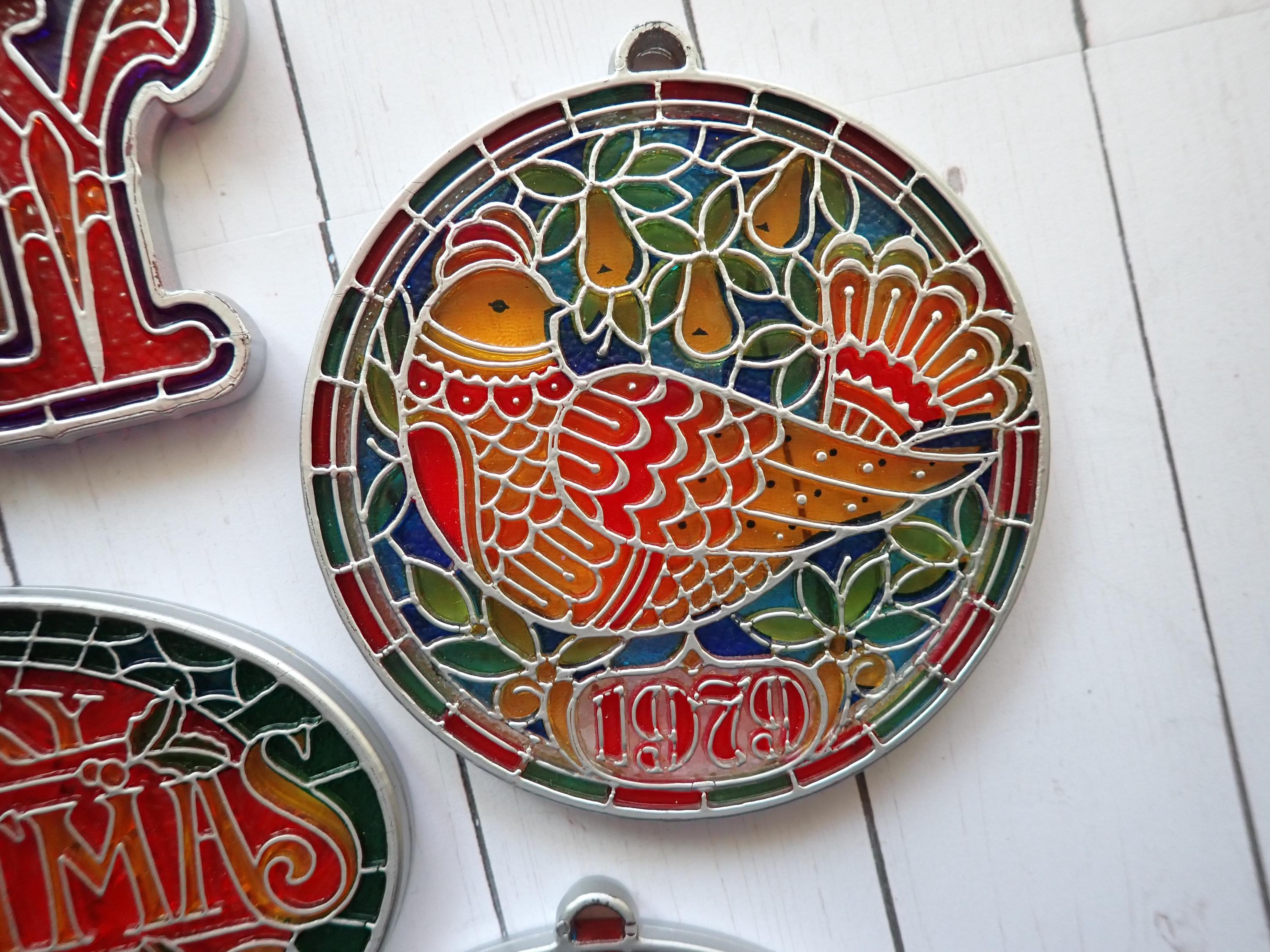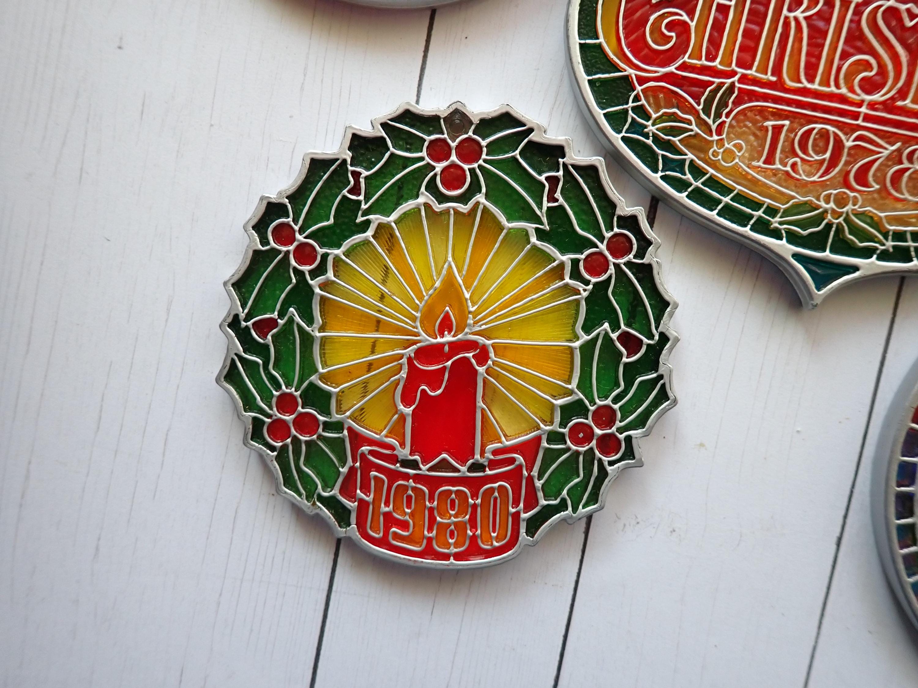 The ornaments are plastic and have a stained-glass style. Great set of vintage Hallmark!