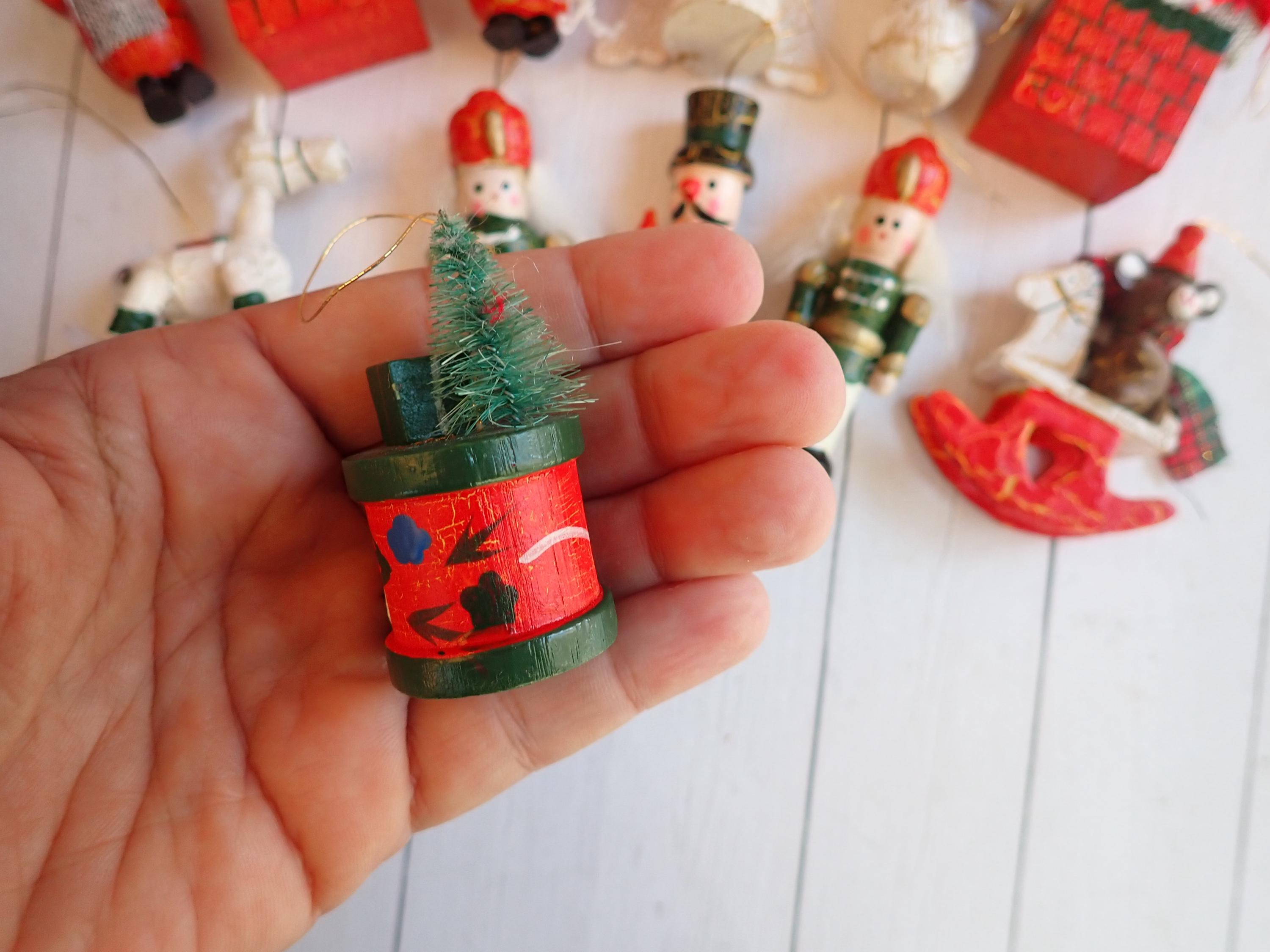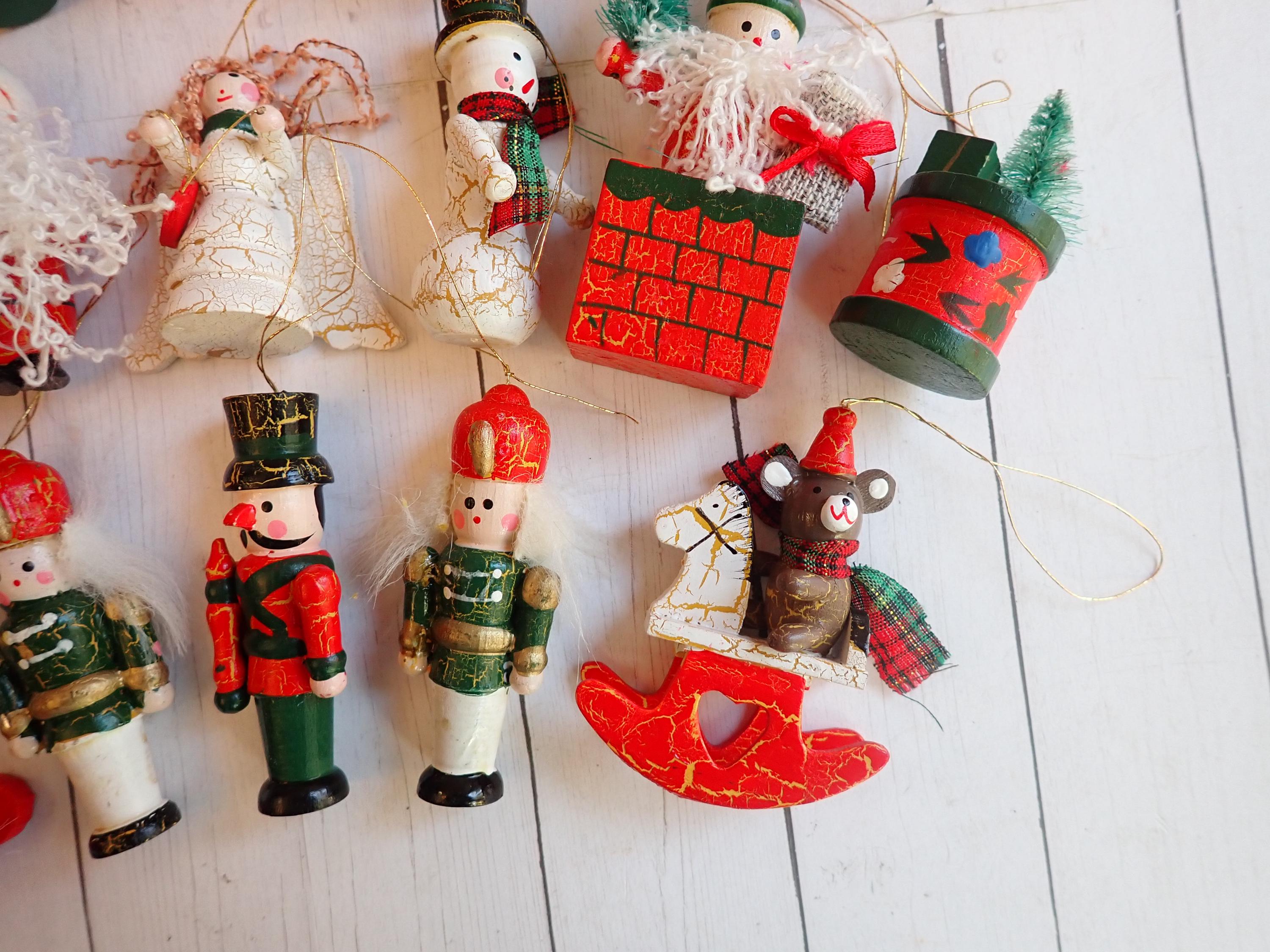 This cute set of wooden ornaments includes 17 vintage wooden ornaments of various shapes and sizes. They range in size from 2" to 3" tall and wide. The ornament include Santas, snowmen, and soldiers. They are all made of wood and painted in red, green, and white colors.