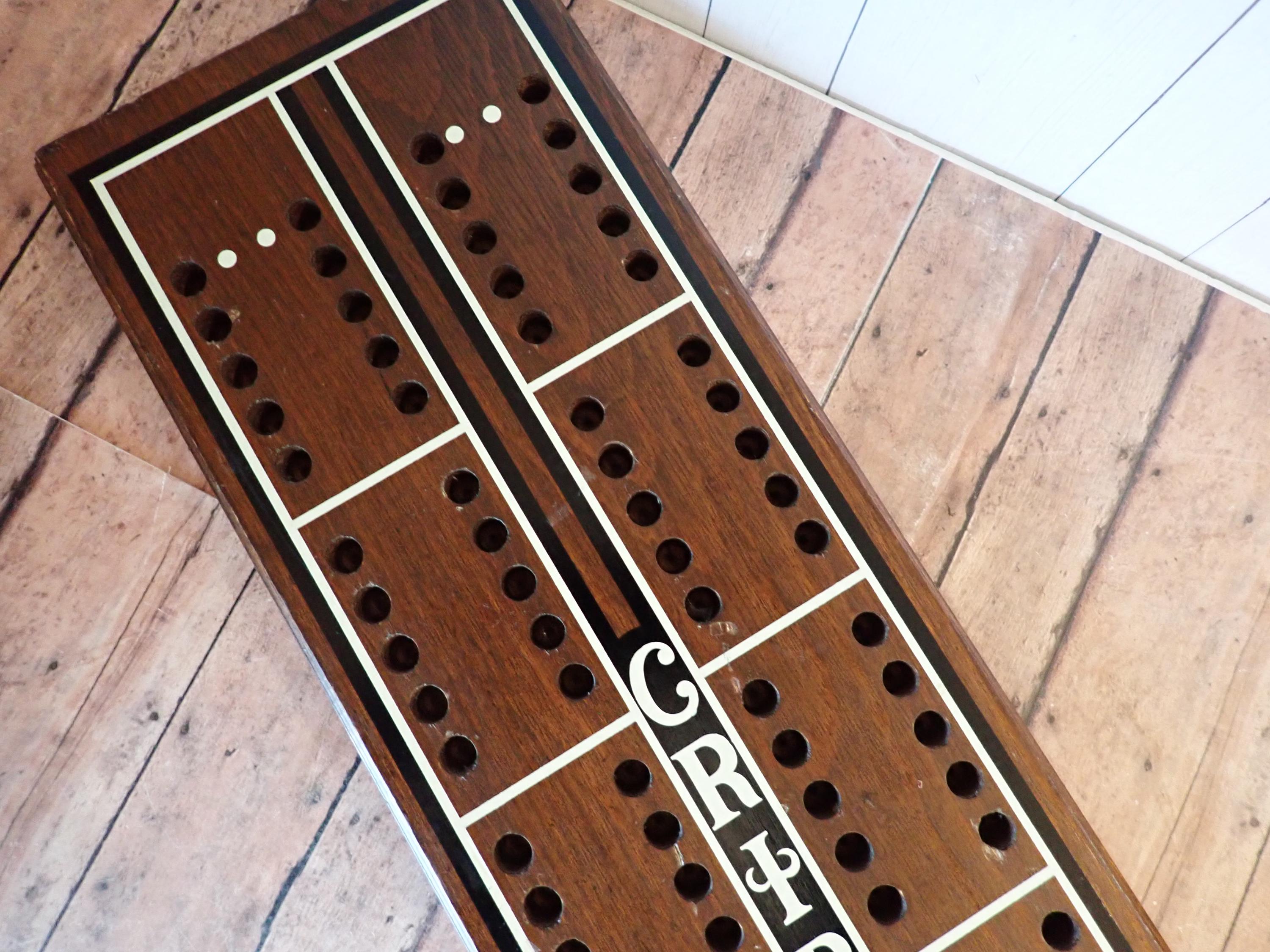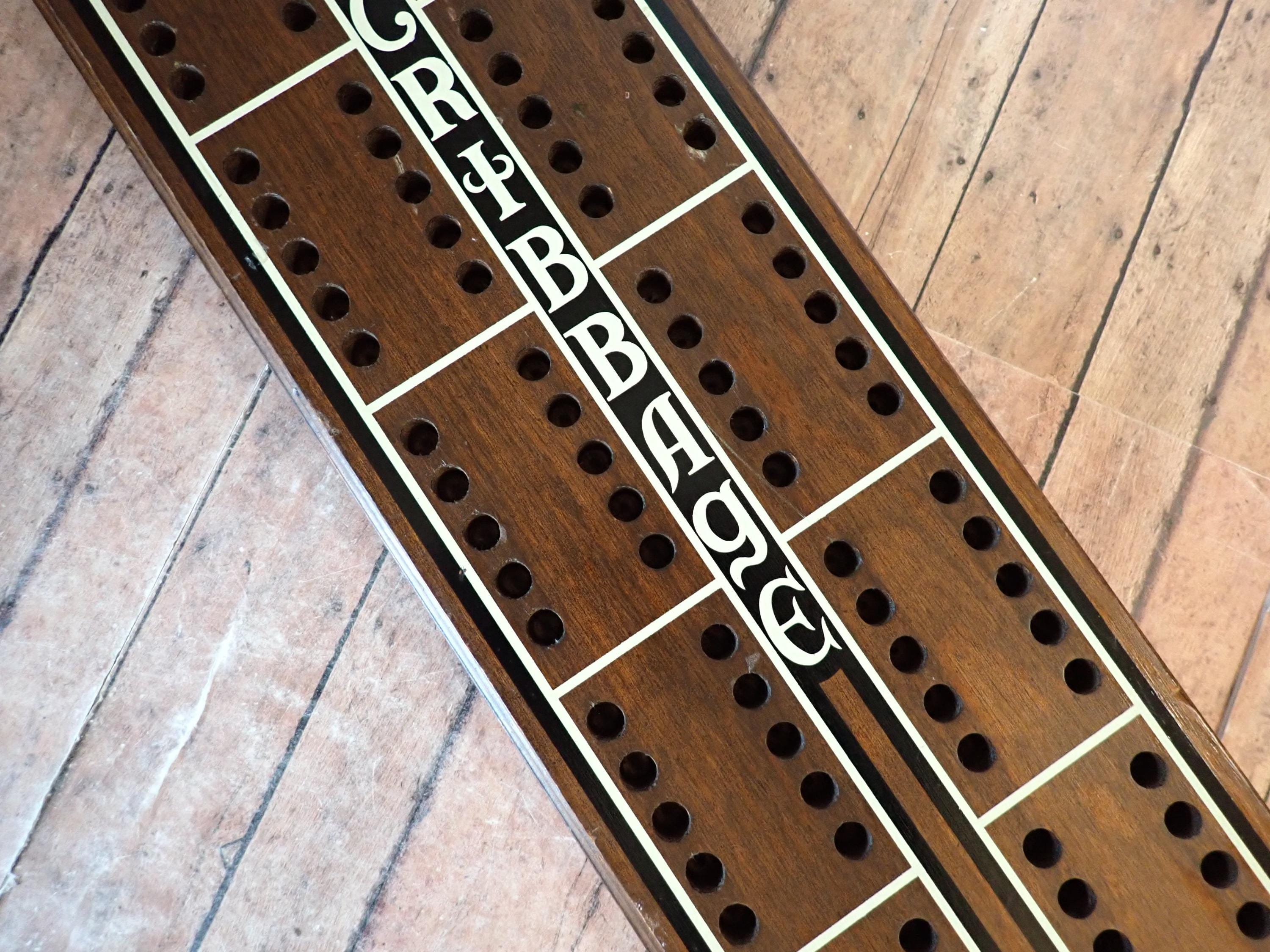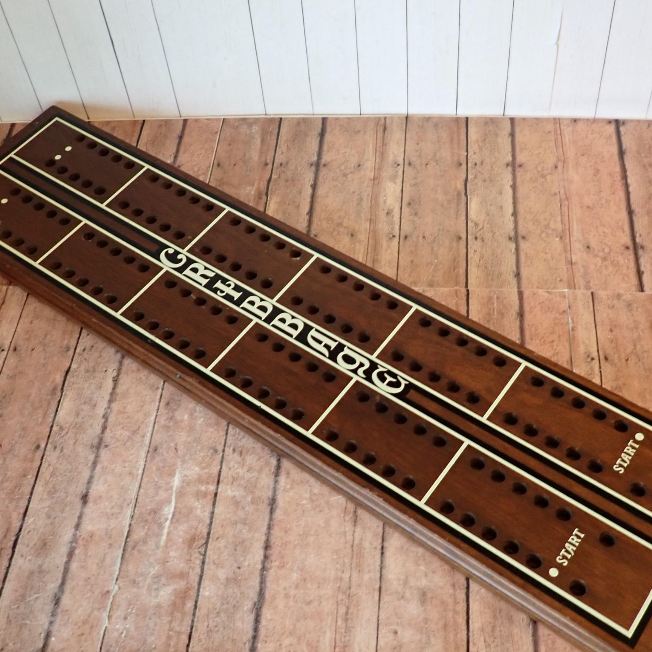 This large cribbage board is 27" long, 6.5" wide, and .75" thick and was made by Cornwall Wood Products. It is a large size board but there are no pegs. The board is a dark brown with white and black accents, and says CRIBBAGE down the center of the board. There is a hole on the backside for hanging on a wall.
