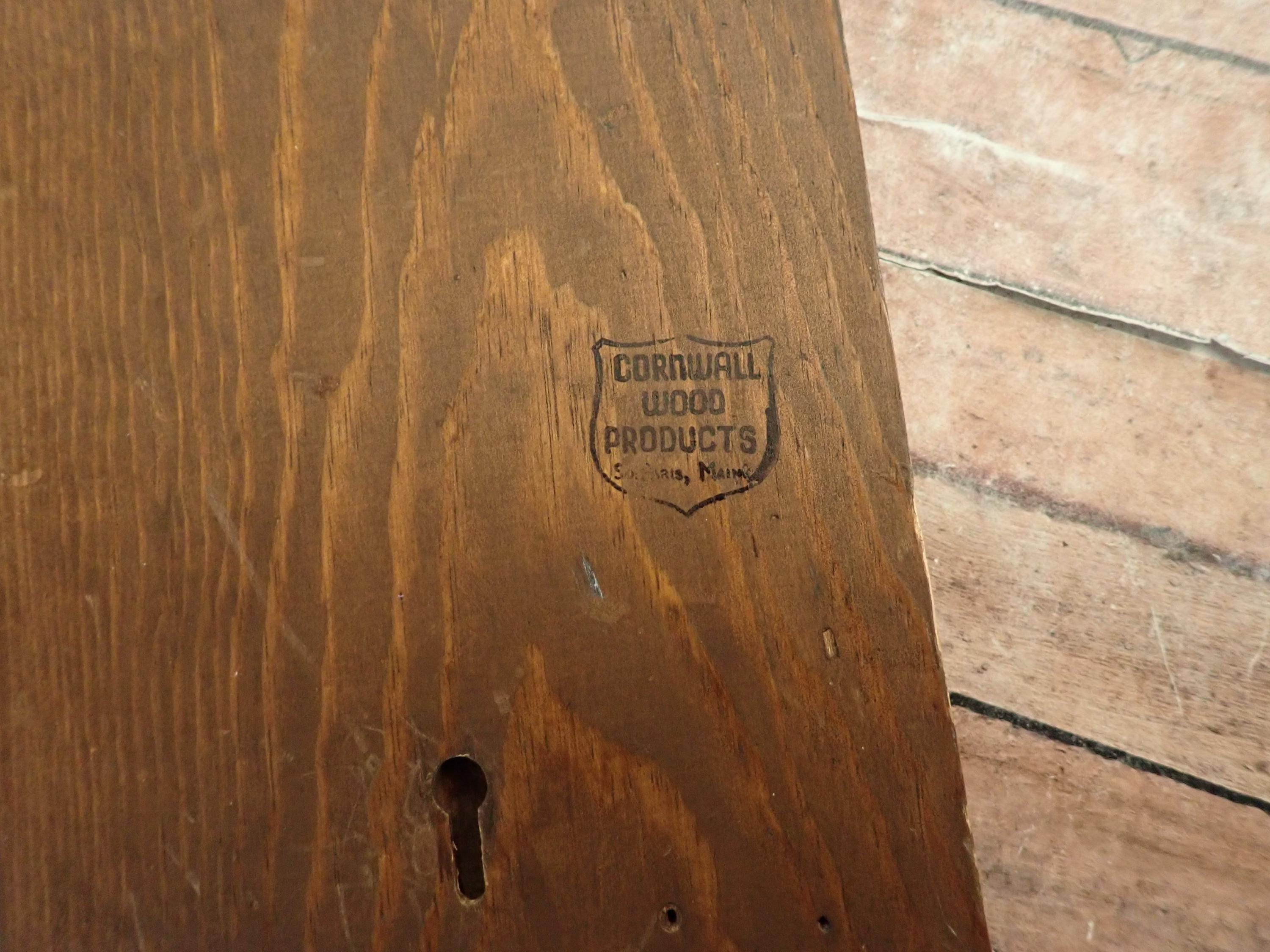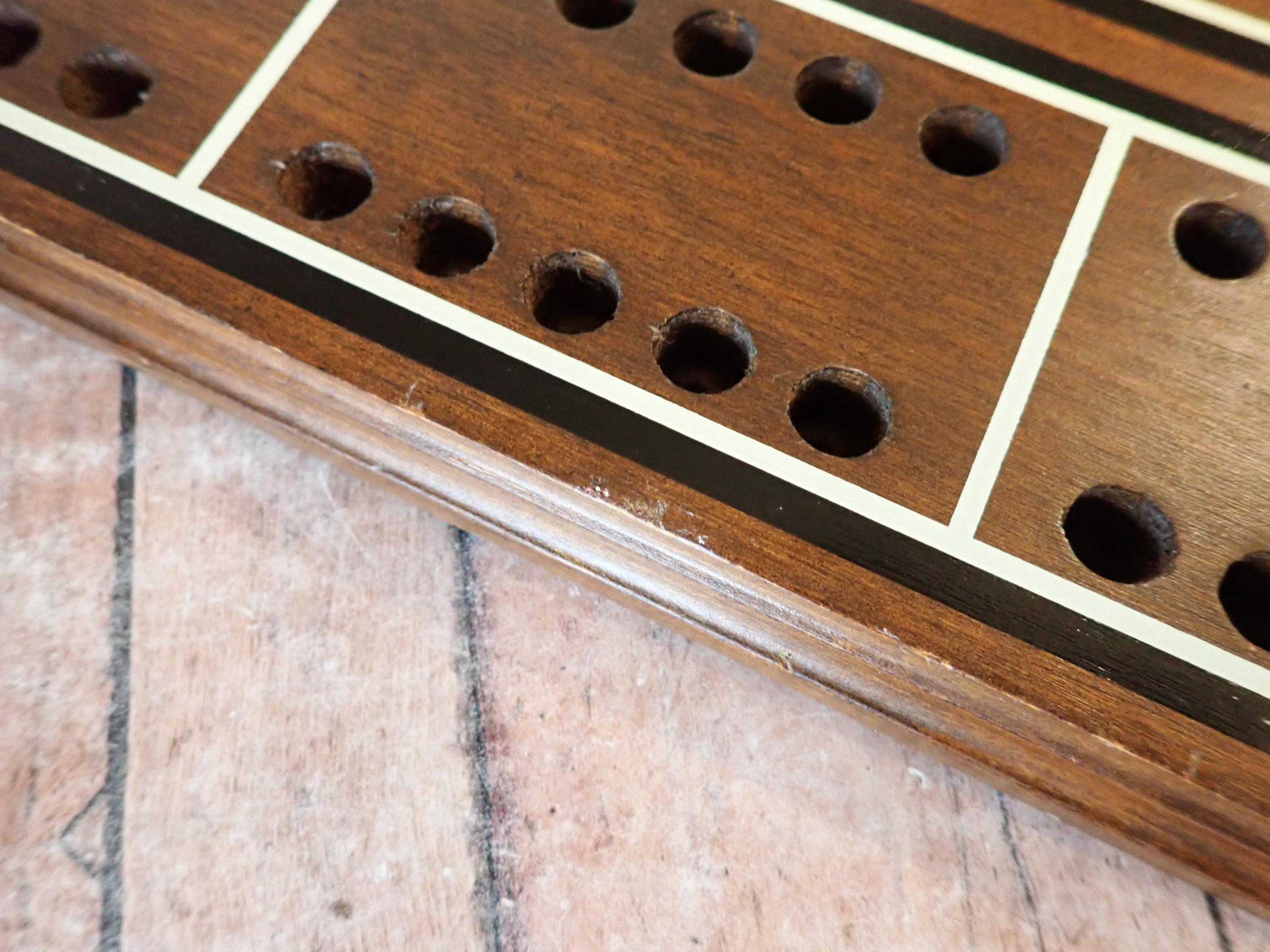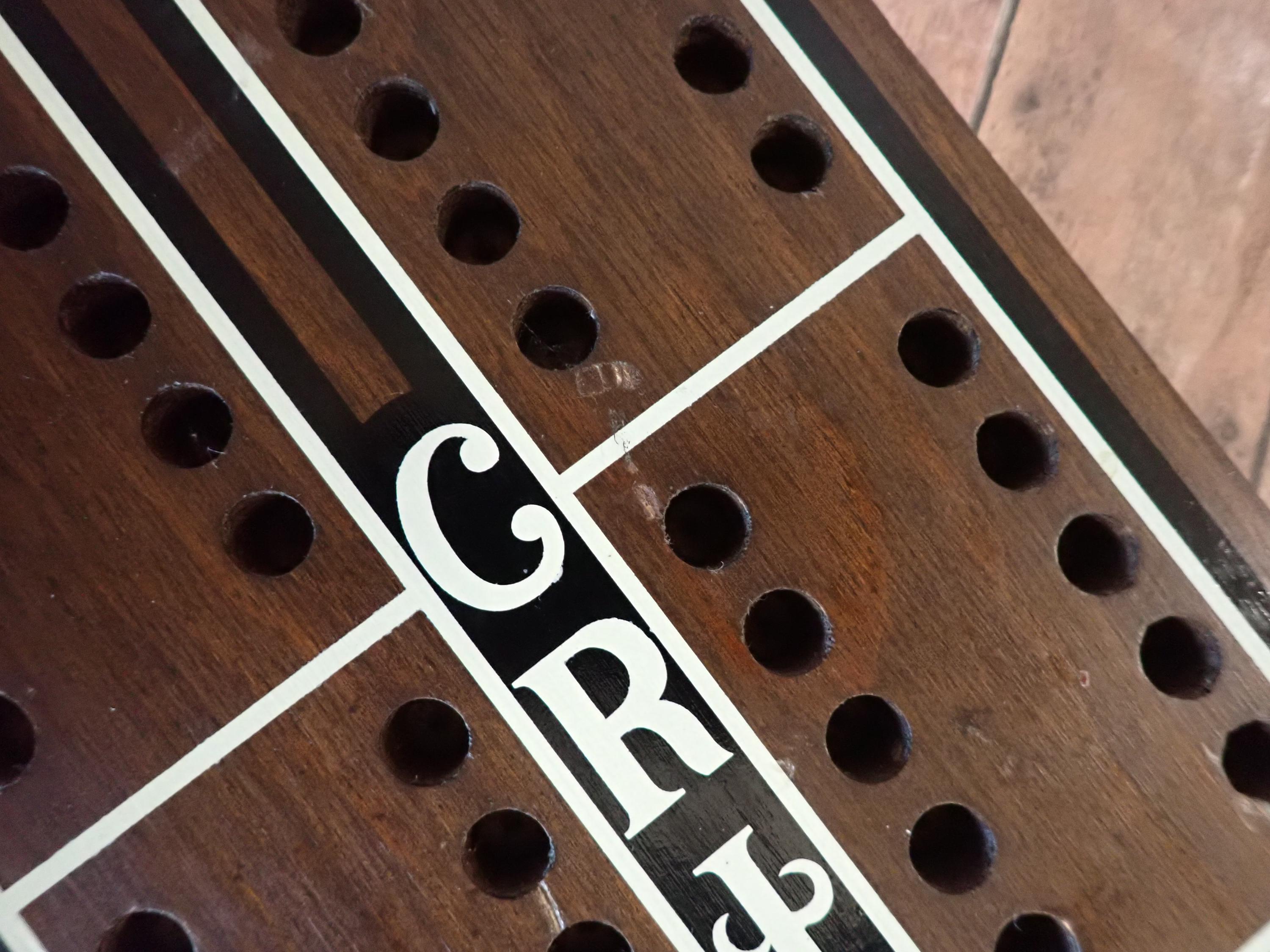 This large cribbage board is 27" long, 6.5" wide, and .75" thick and was made by Cornwall Wood Products. It is a large size board but there are no pegs. The board is a dark brown with white and black accents, and says CRIBBAGE down the center of the board. There is a hole on the backside for hanging on a wall.