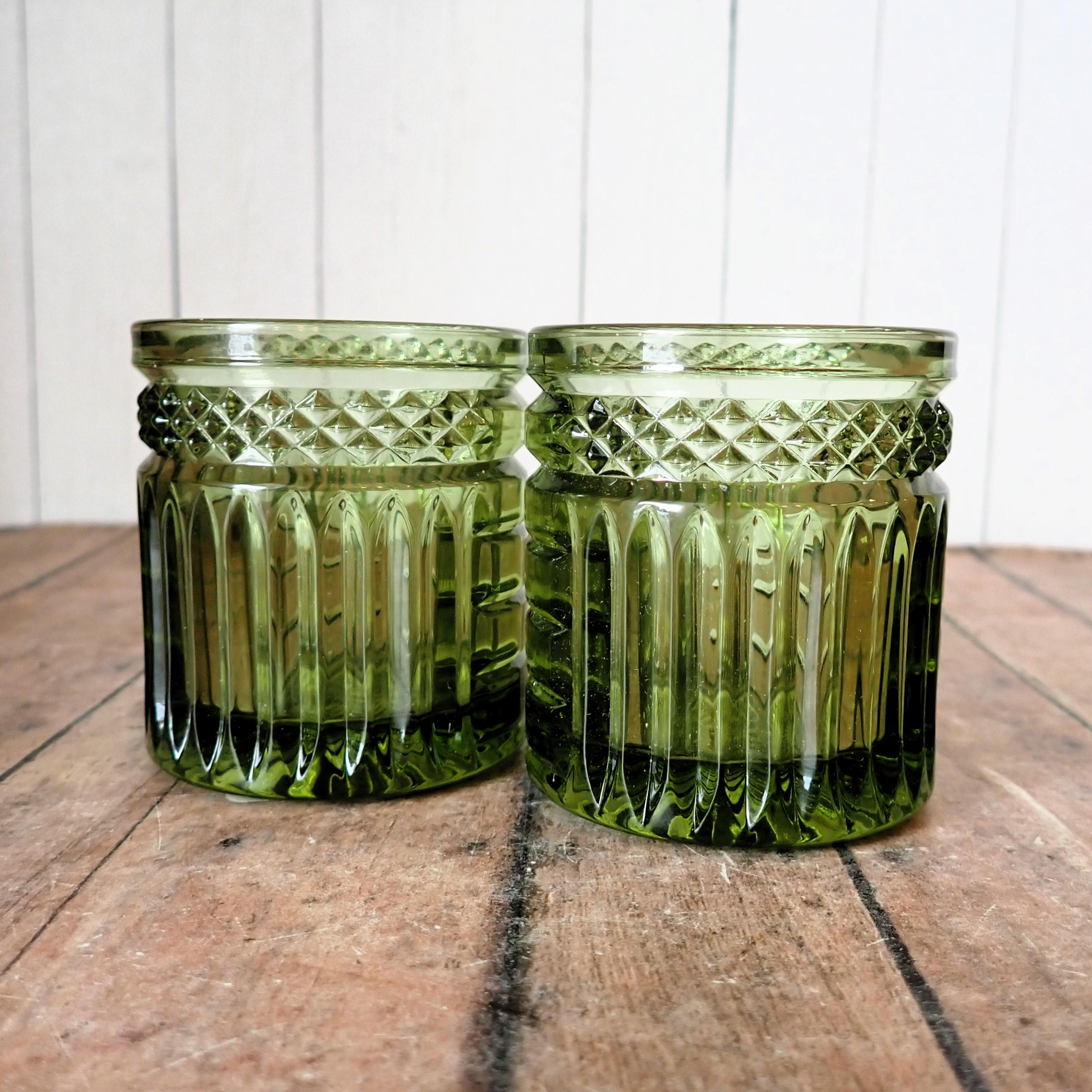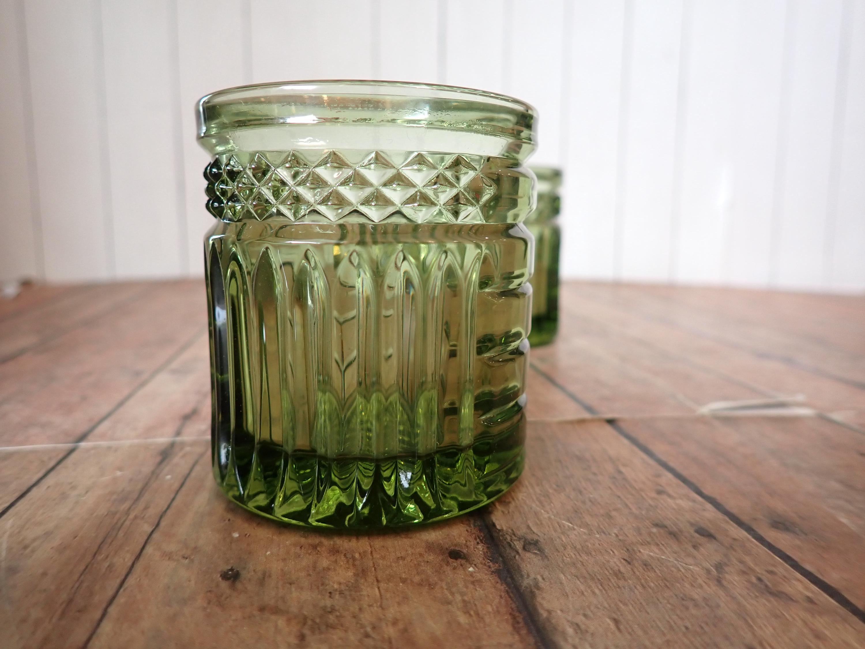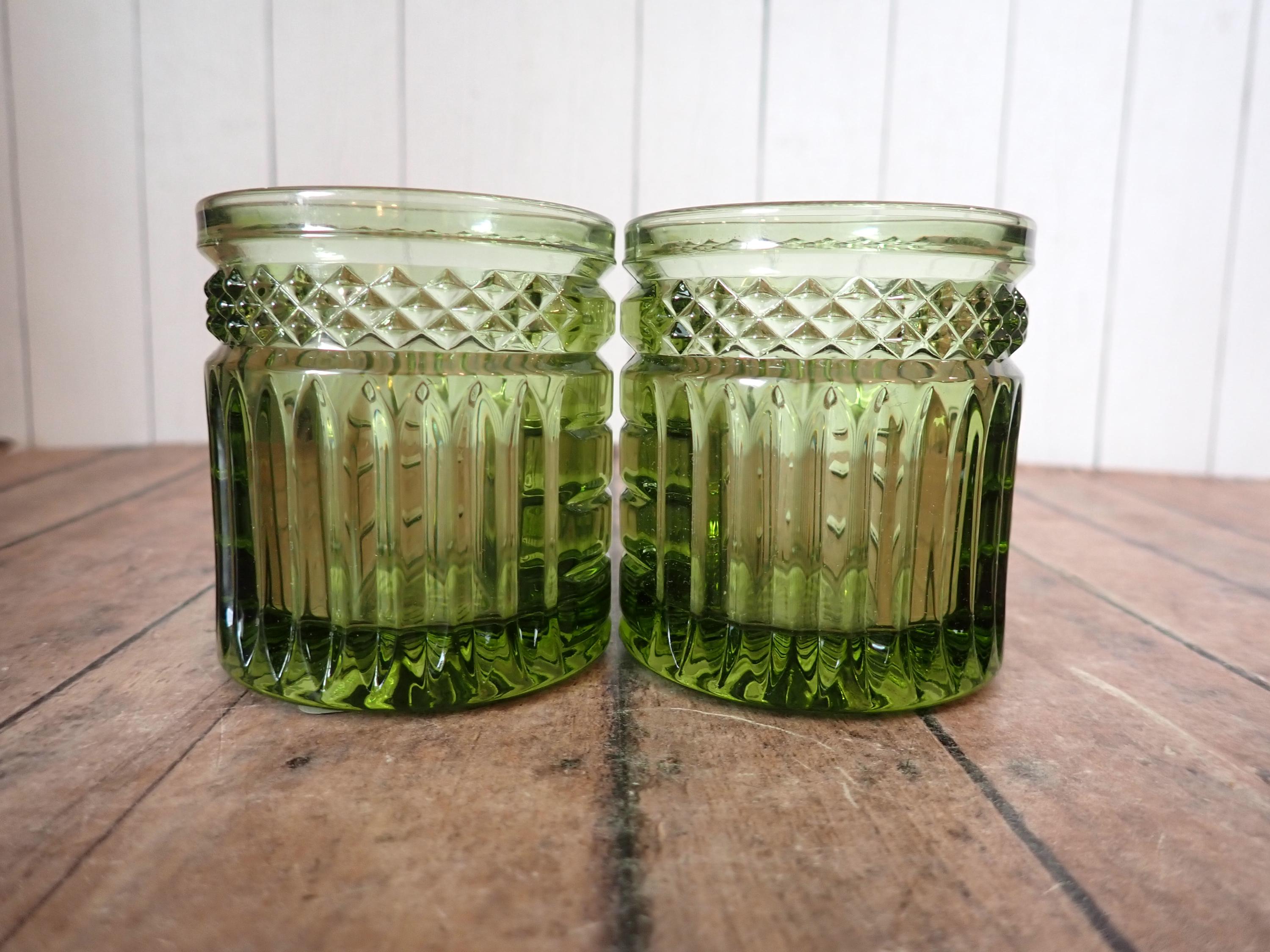 This set of 2 green glass candle holders by PartyLite measure 2.5" tall and 2.25" in diameter. They have a 1.75" opening at the top to hold a tealight or small votive candle. They are a round shape with diamond and ribbed design in the glass. Both of the candle holders are in very good condition with no chips or cracks.