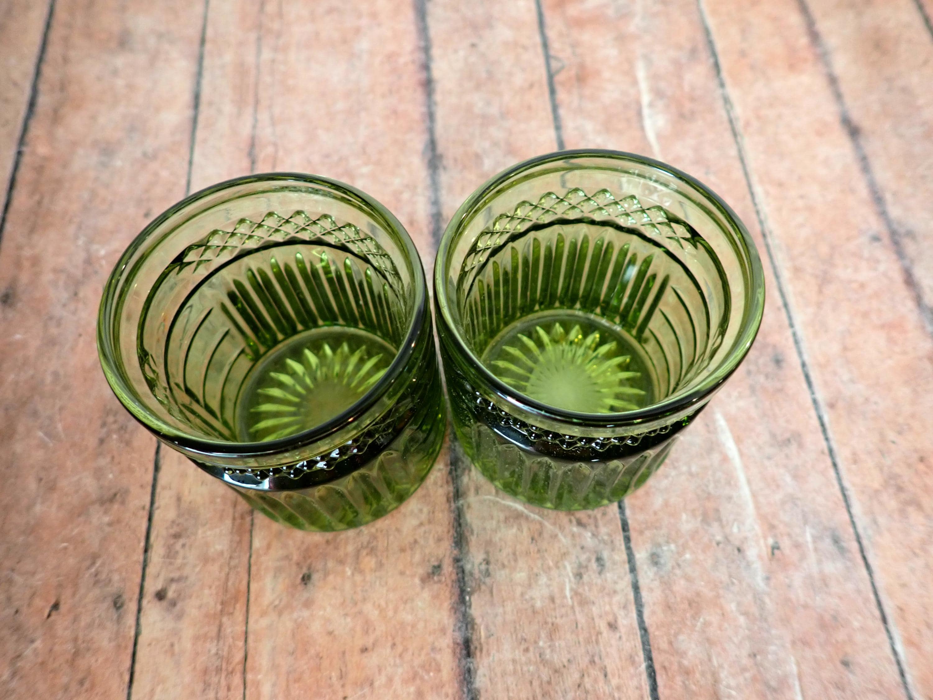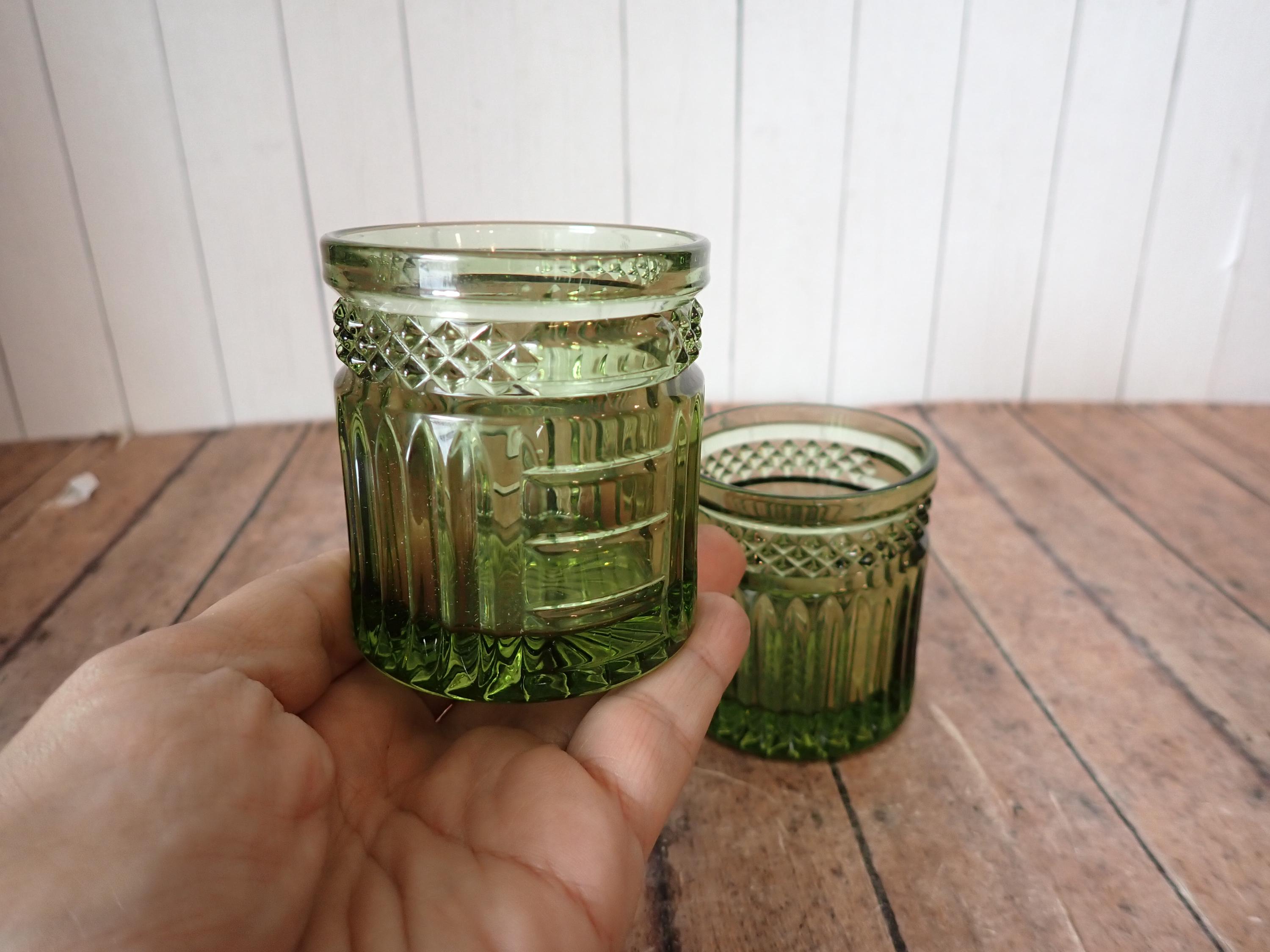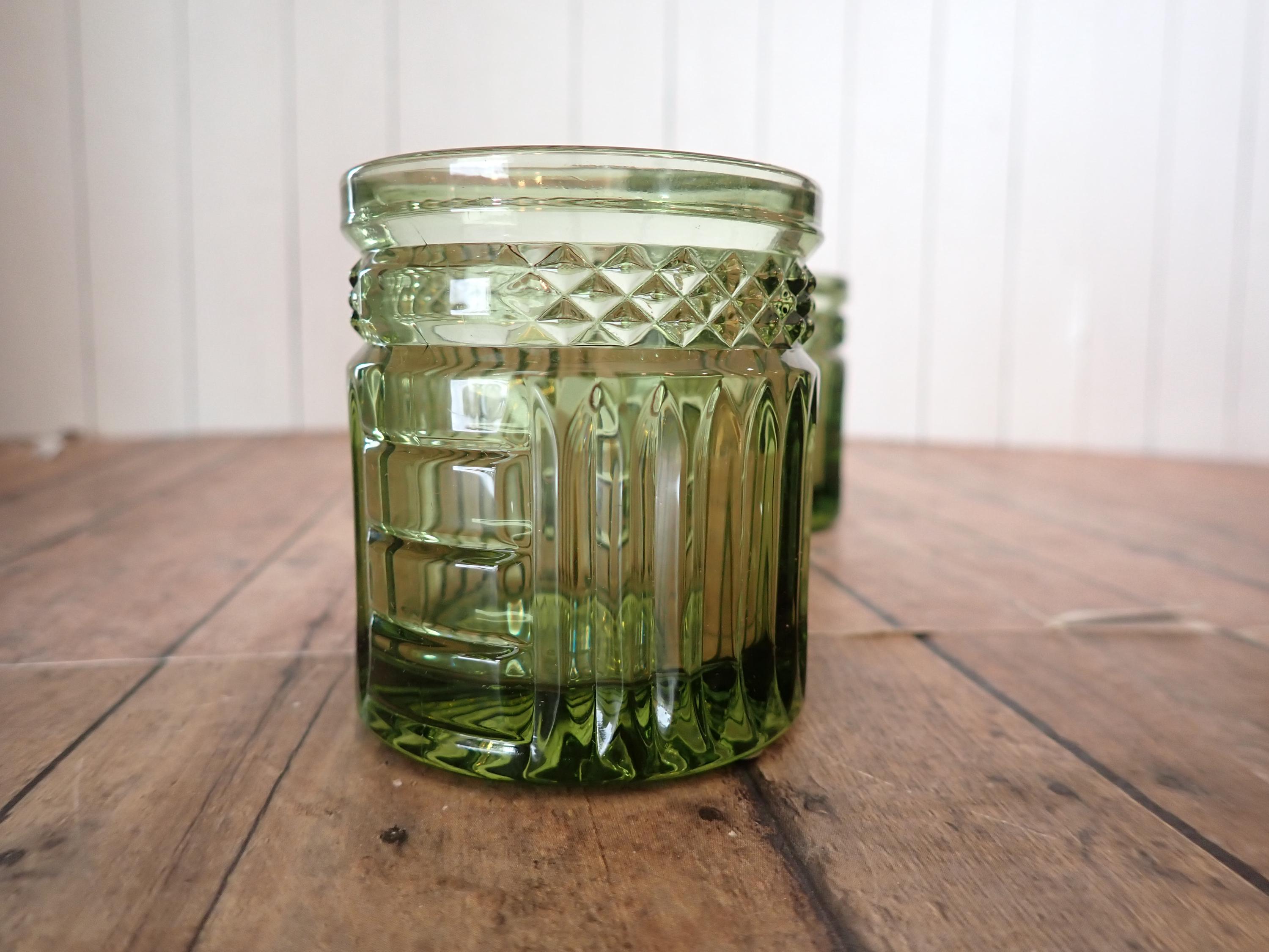 This set of 2 green glass candle holders by PartyLite measure 2.5" tall and 2.25" in diameter. They have a 1.75" opening at the top to hold a tealight or small votive candle. They are a round shape with diamond and ribbed design in the glass. Both of the candle holders are in very good condition with no chips or cracks.