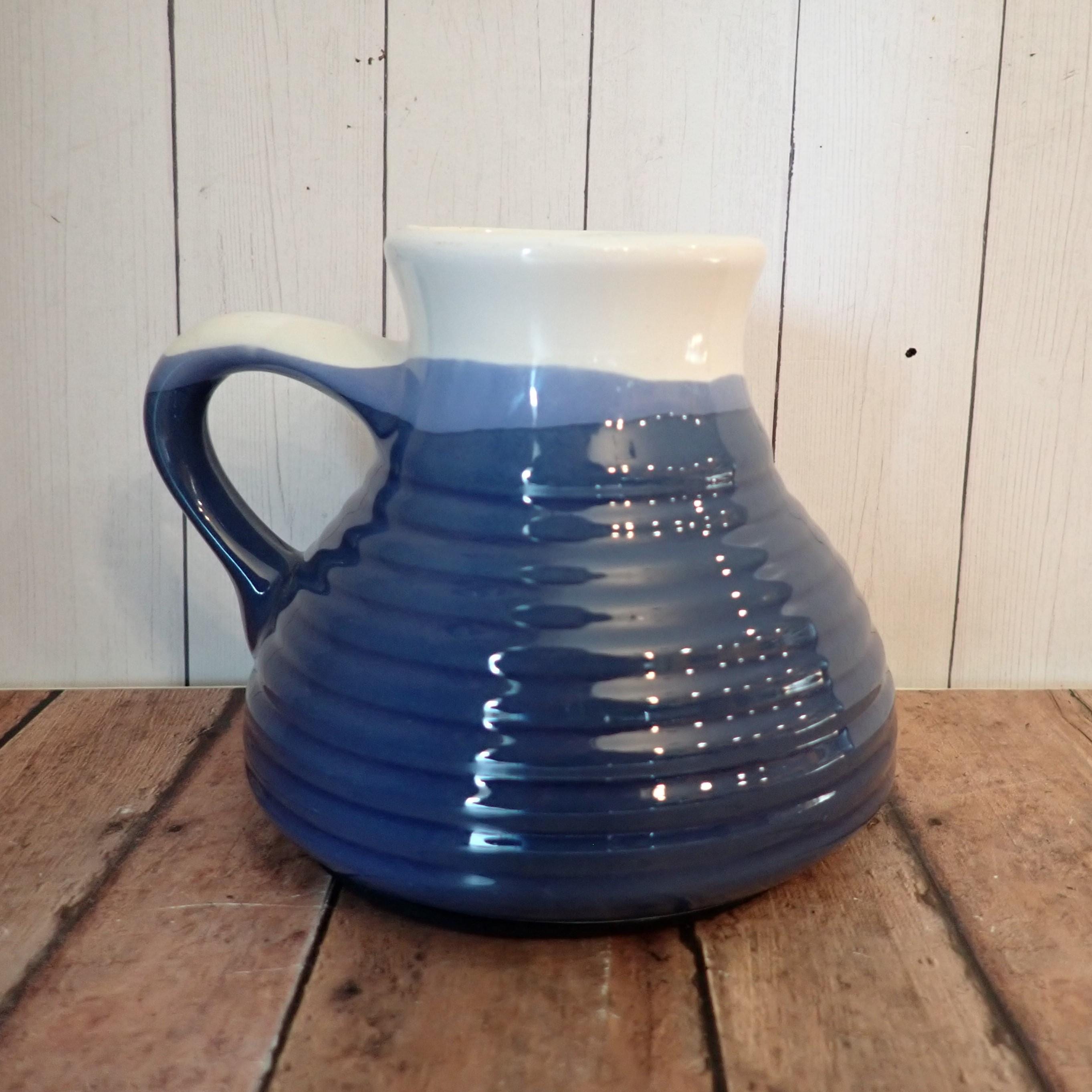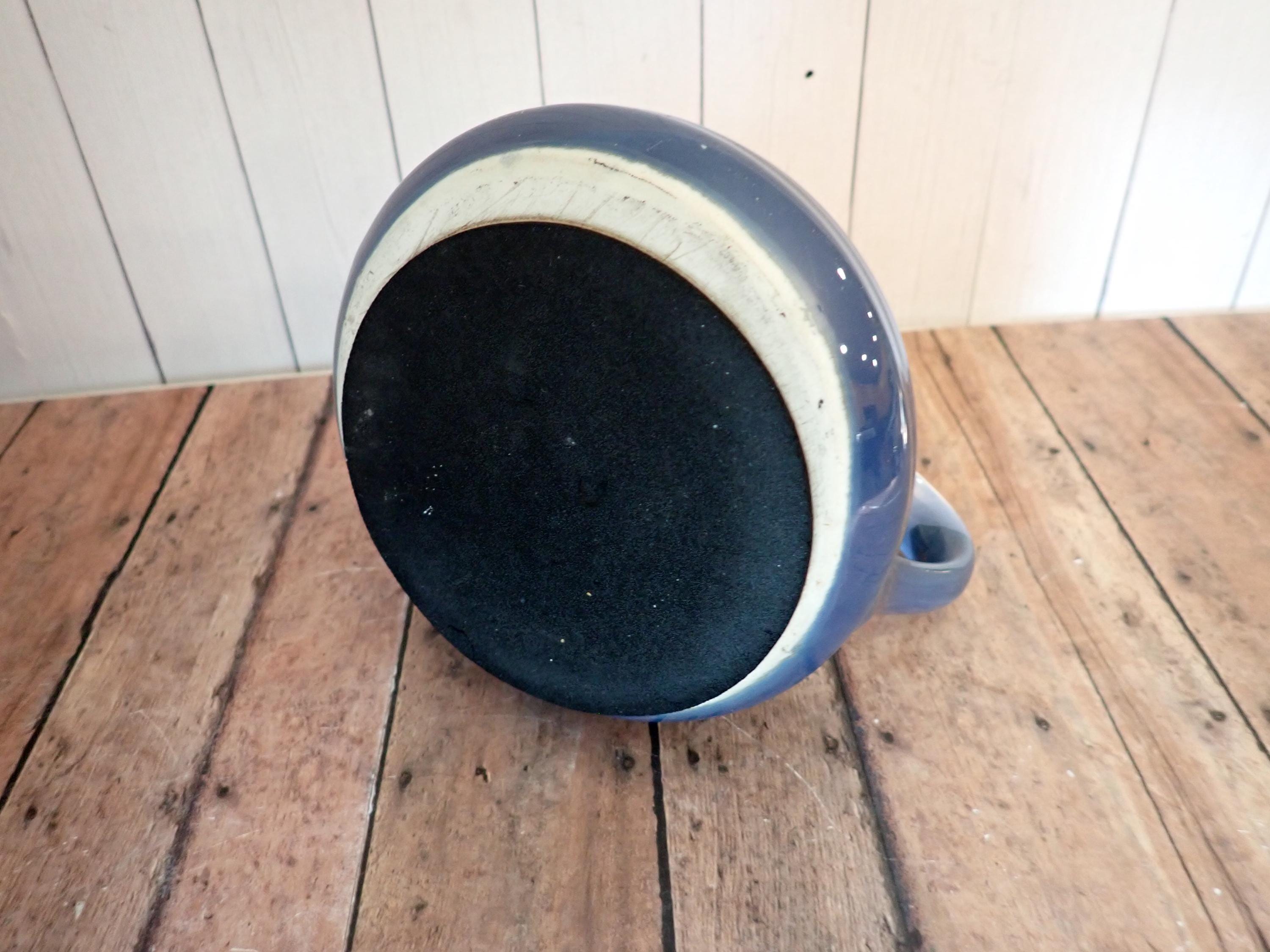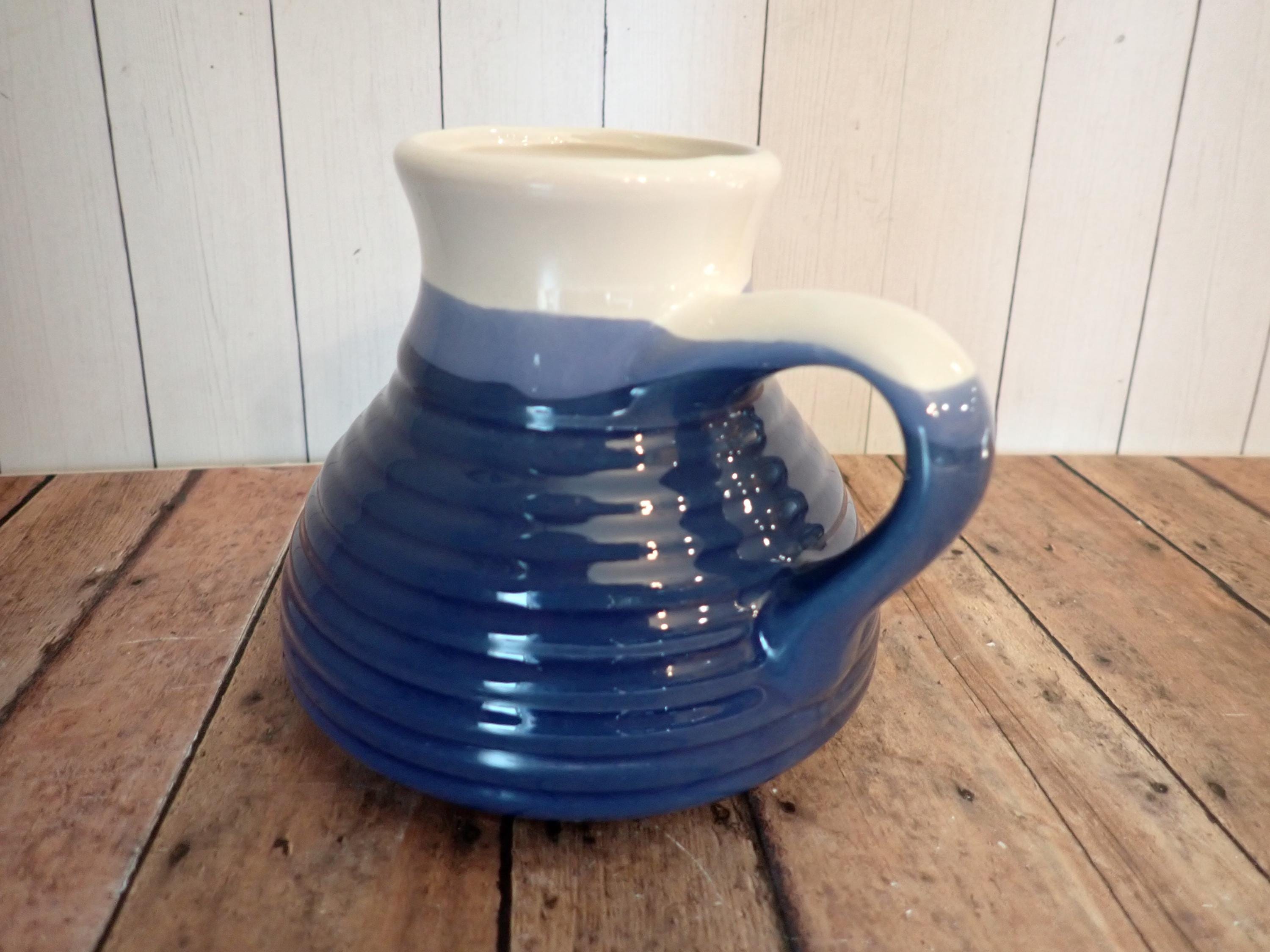 This vintage ceramic travel mug is a stoneware piece with white and blue glazes. It is 4" tall and the bases measure 4.5" in diameter. The top opening is 1.75" in diameter. It is a white ceramic with a blue overlapping glaze bands. There is a lightly ribbed or banded texture around the middle. The mug can comfortably hold 12 oz. - filled to the rim it holds 14 oz. There are no makers marks on the mug, and there is a rubber grippy pad on the bottom.