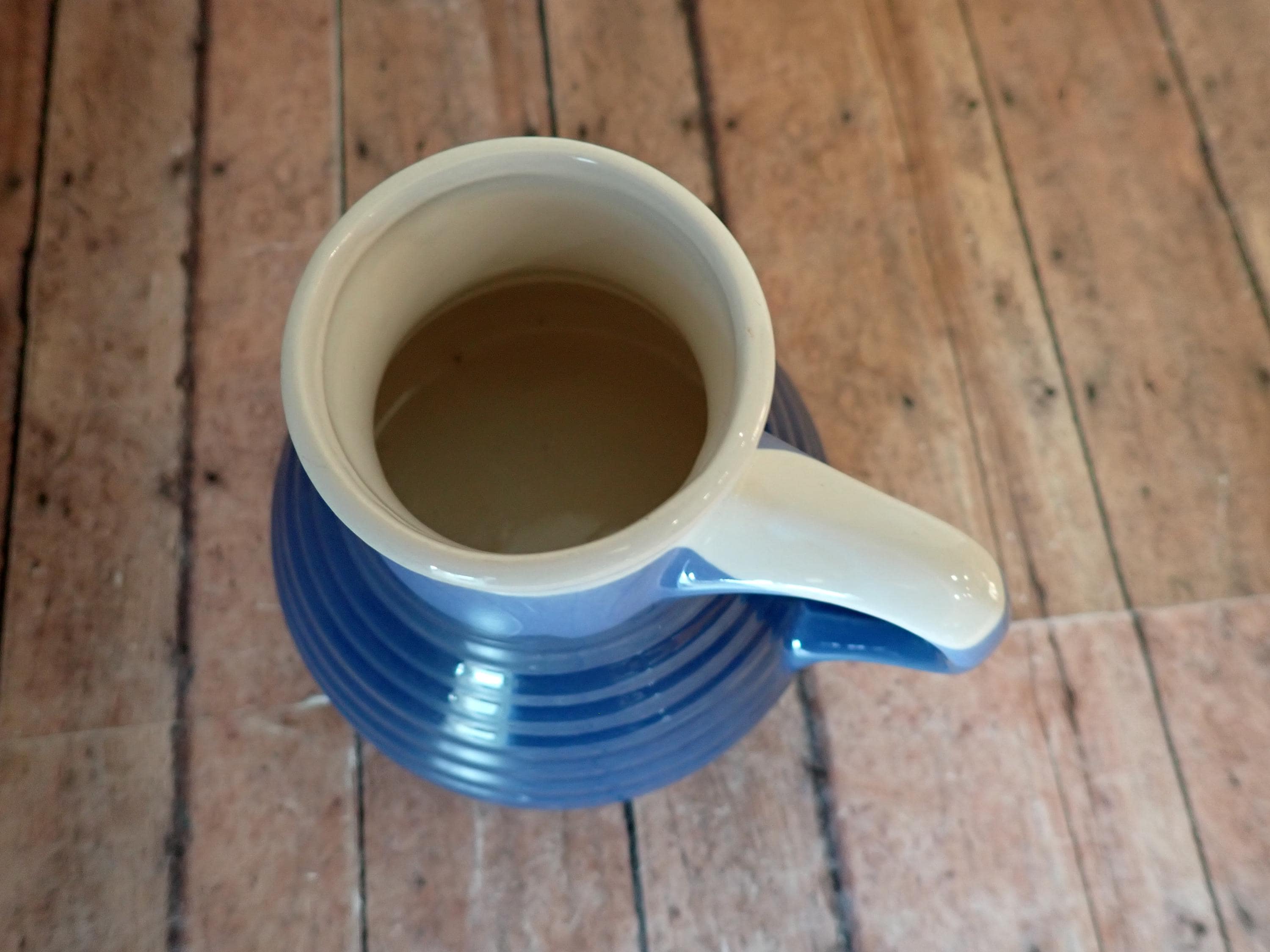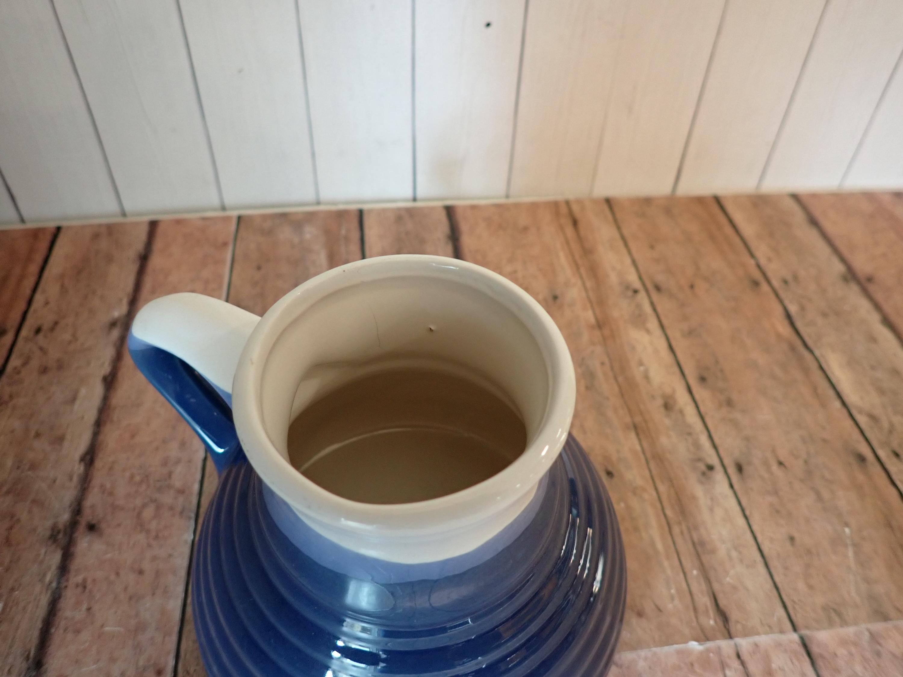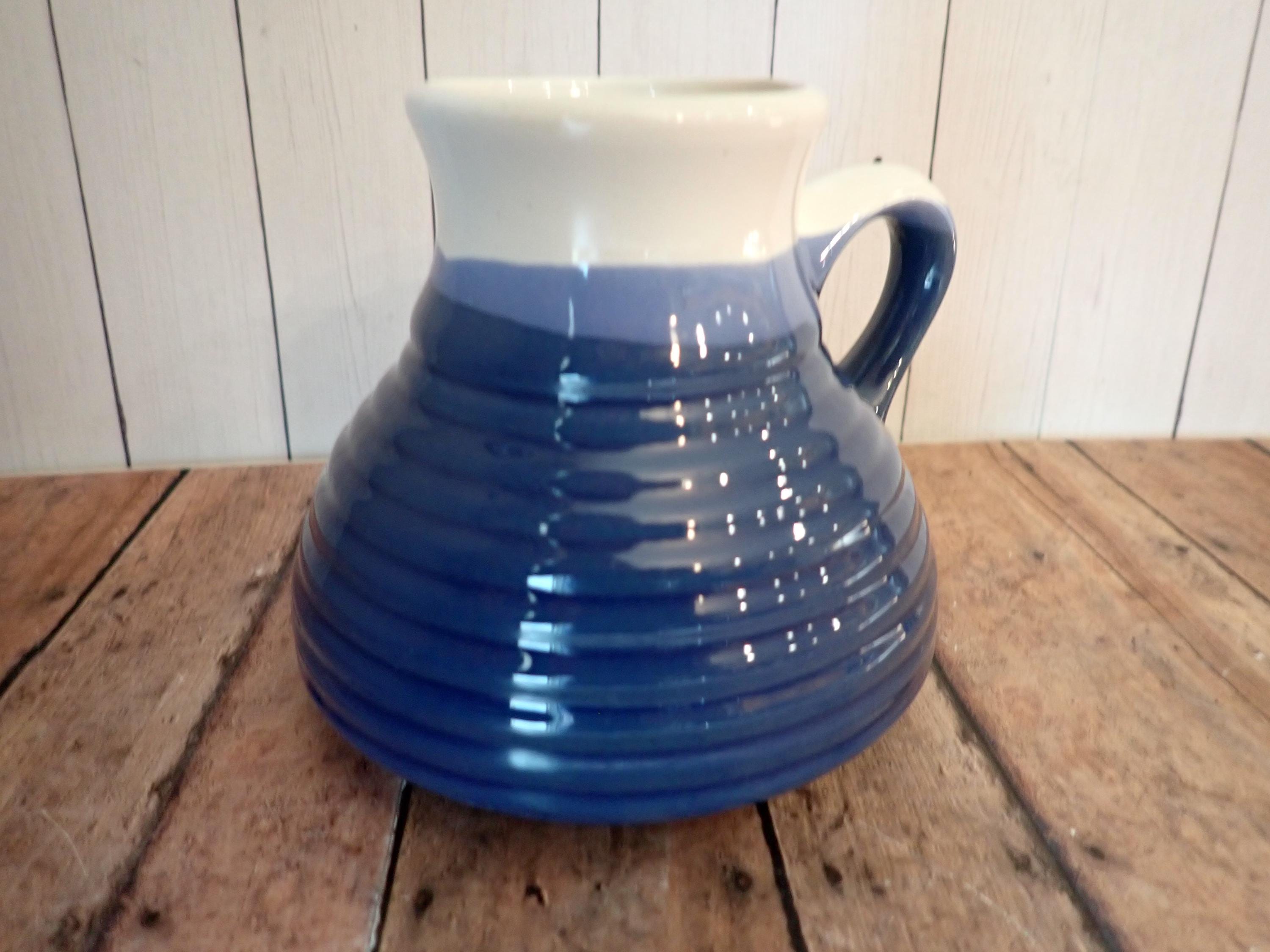 This vintage ceramic travel mug is a stoneware piece with white and blue glazes. It is 4" tall and the bases measure 4.5" in diameter. The top opening is 1.75" in diameter. It is a white ceramic with a blue overlapping glaze bands. There is a lightly ribbed or banded texture around the middle. The mug can comfortably hold 12 oz. - filled to the rim it holds 14 oz. There are no makers marks on the mug, and there is a rubber grippy pad on the bottom.