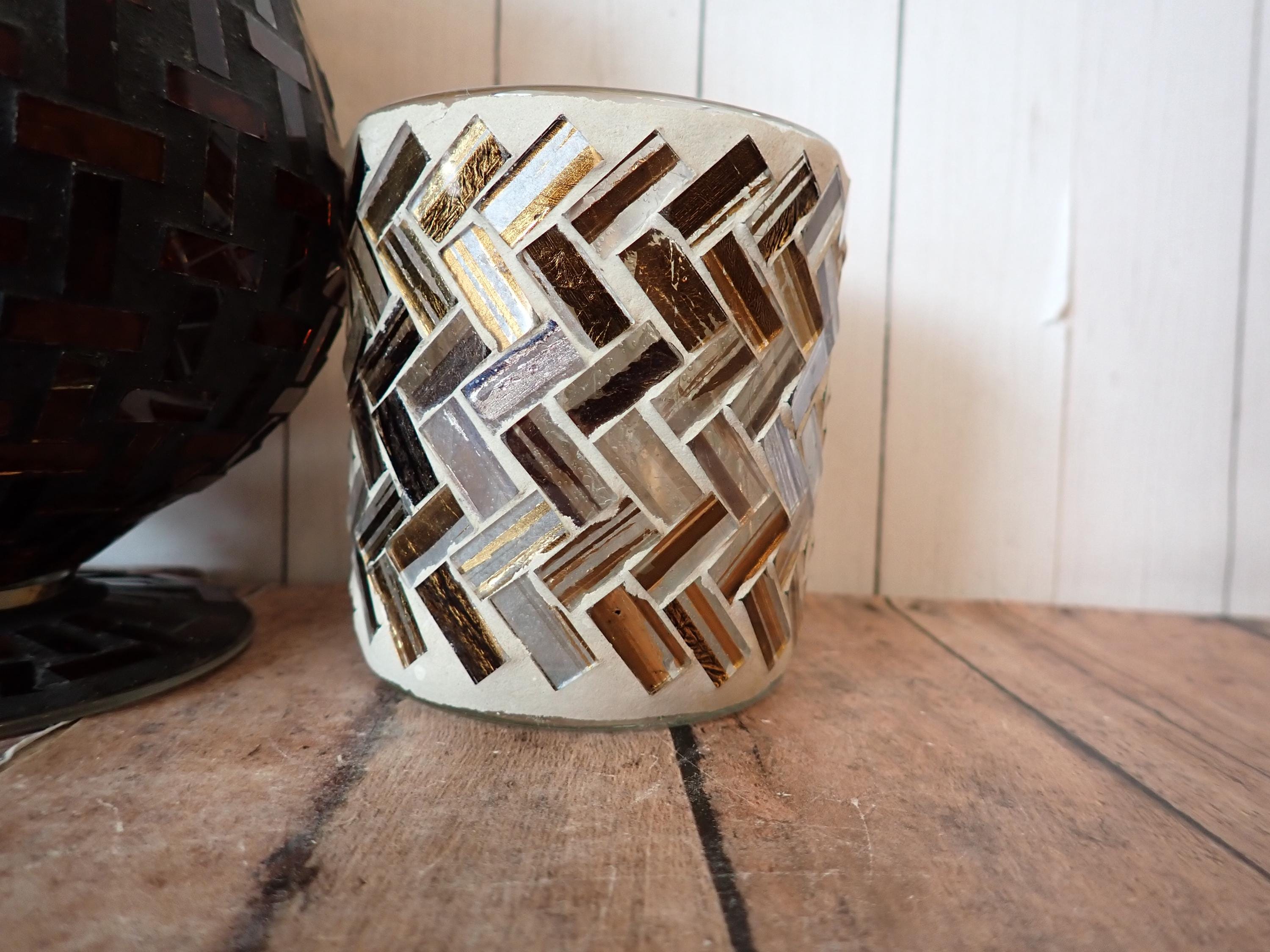All 3 candle holders are in good condition, however there are some imperfections on some of the mosaic and a few lightly chipped or cracked panels in the mosaic. You are able to see some of the glue through the glass pieces here and there.