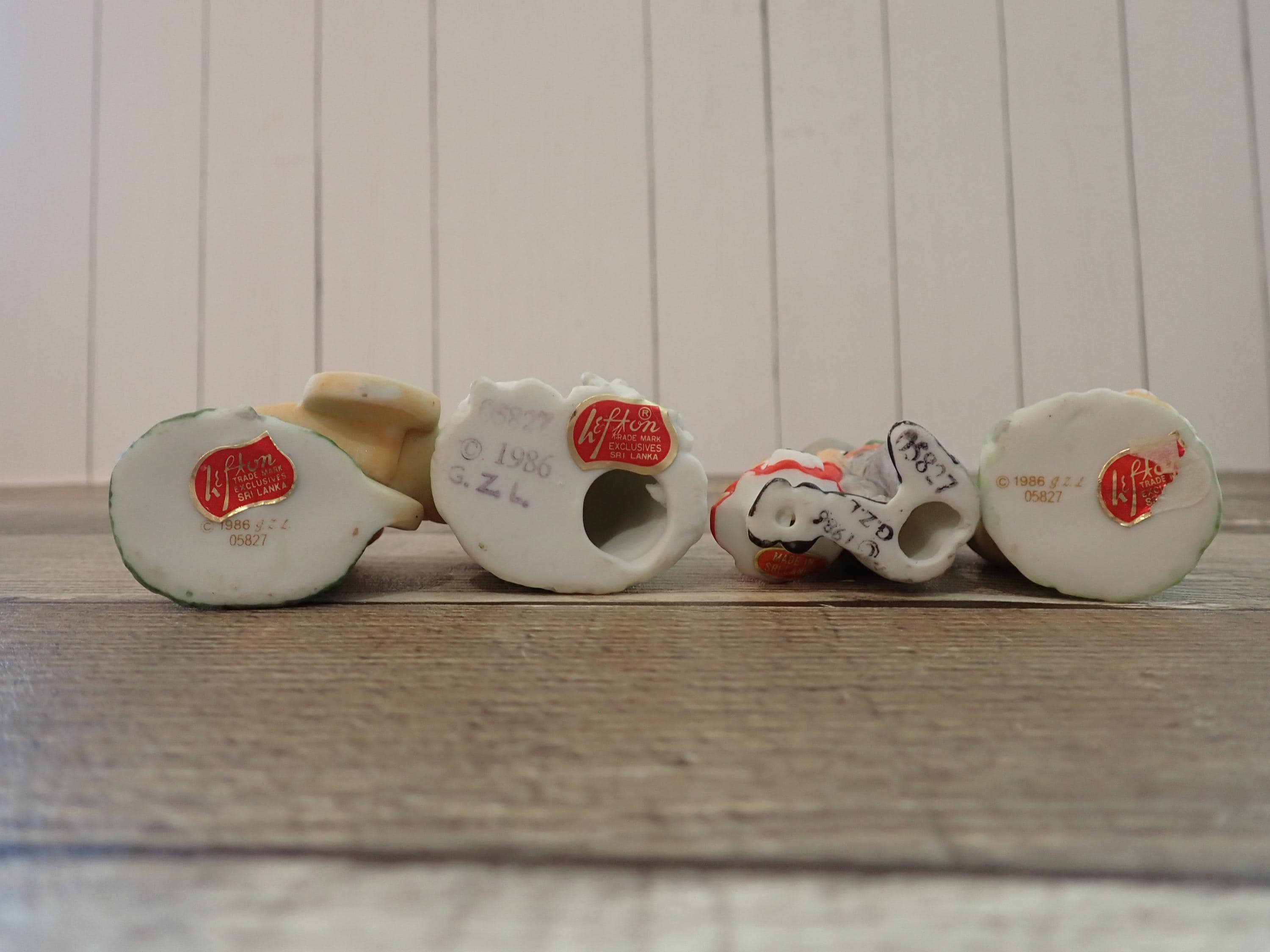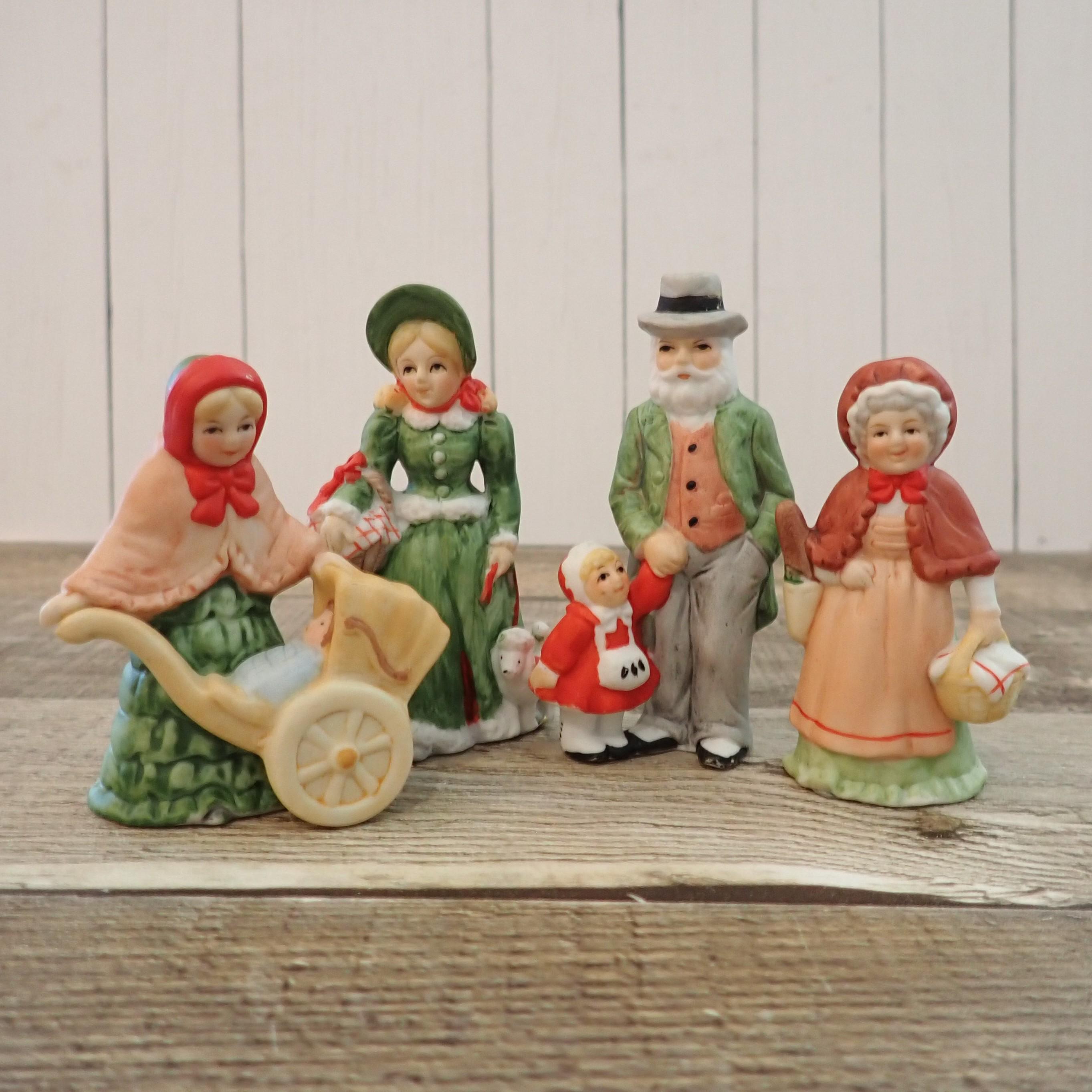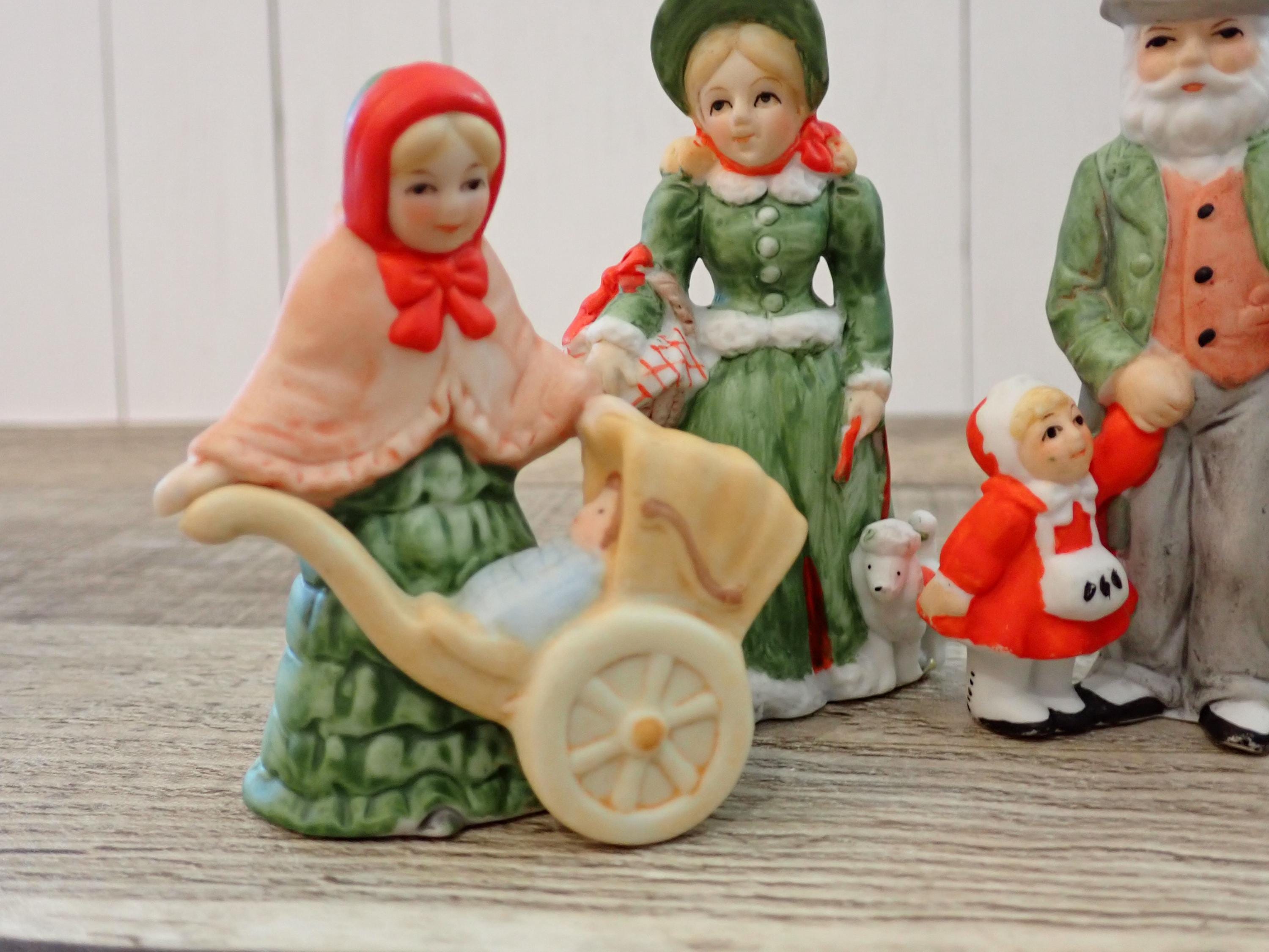 These Lefton Colonial Village figurines is a set of 4 of the Eberhardts and includes the Grandma figurine, Grandpa with Child, Girl with Dog, and the Mother and Baby figurine. They are all marked 1986 / GZL / 05827. They are all about 2.75" tall. All 4 figurines are in very good condition with no chips or cracks.