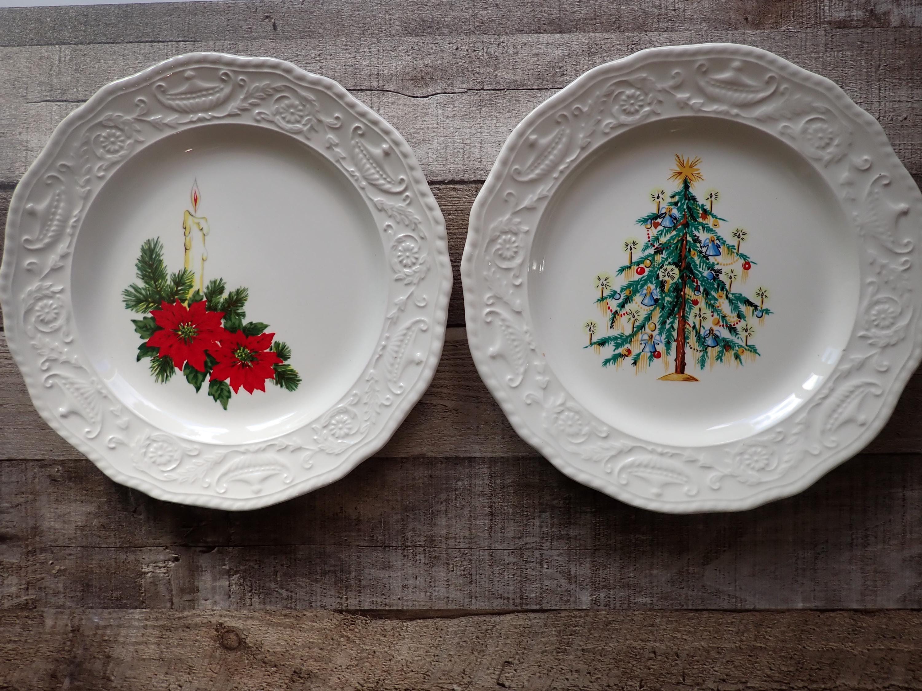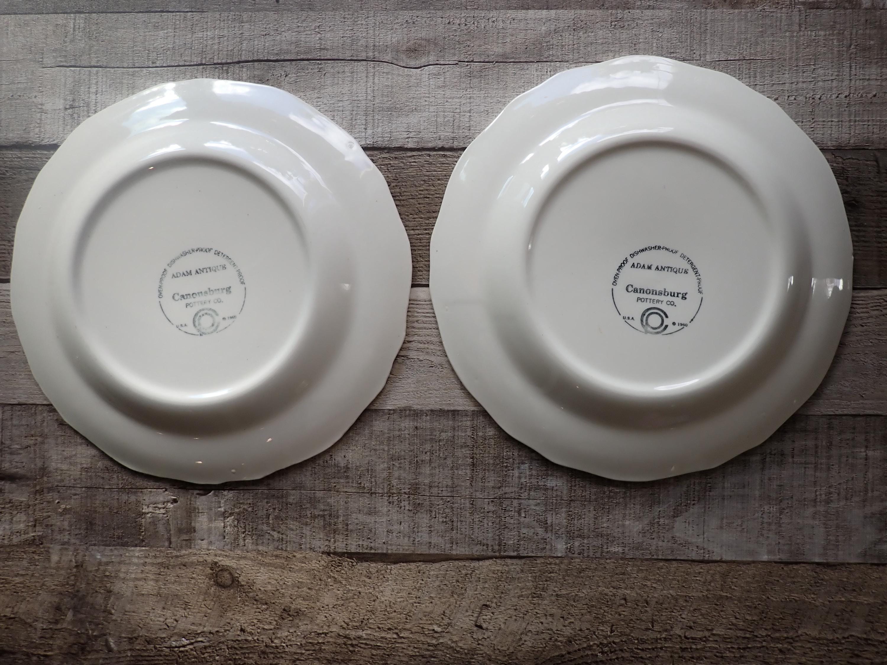 This set of 2 plates by Canonsburg Pottery Co. are dinner plates in the Adam Antique style. One plate has a Christmas Tree design in the center and the other has a candle and pine bough. They are a white ceramic plate with a scroll and leaf pattern around the rims. The plates are 10" in diameter. The bottoms is marked: ADAMANTIQUE / CANONSBURG POTTERY CO. / USA 1960. Both plates are in good condition, however there are 2 small nicks on the underside of the rim of the Christmas Tree plate - this is shown in detail in the last photo.