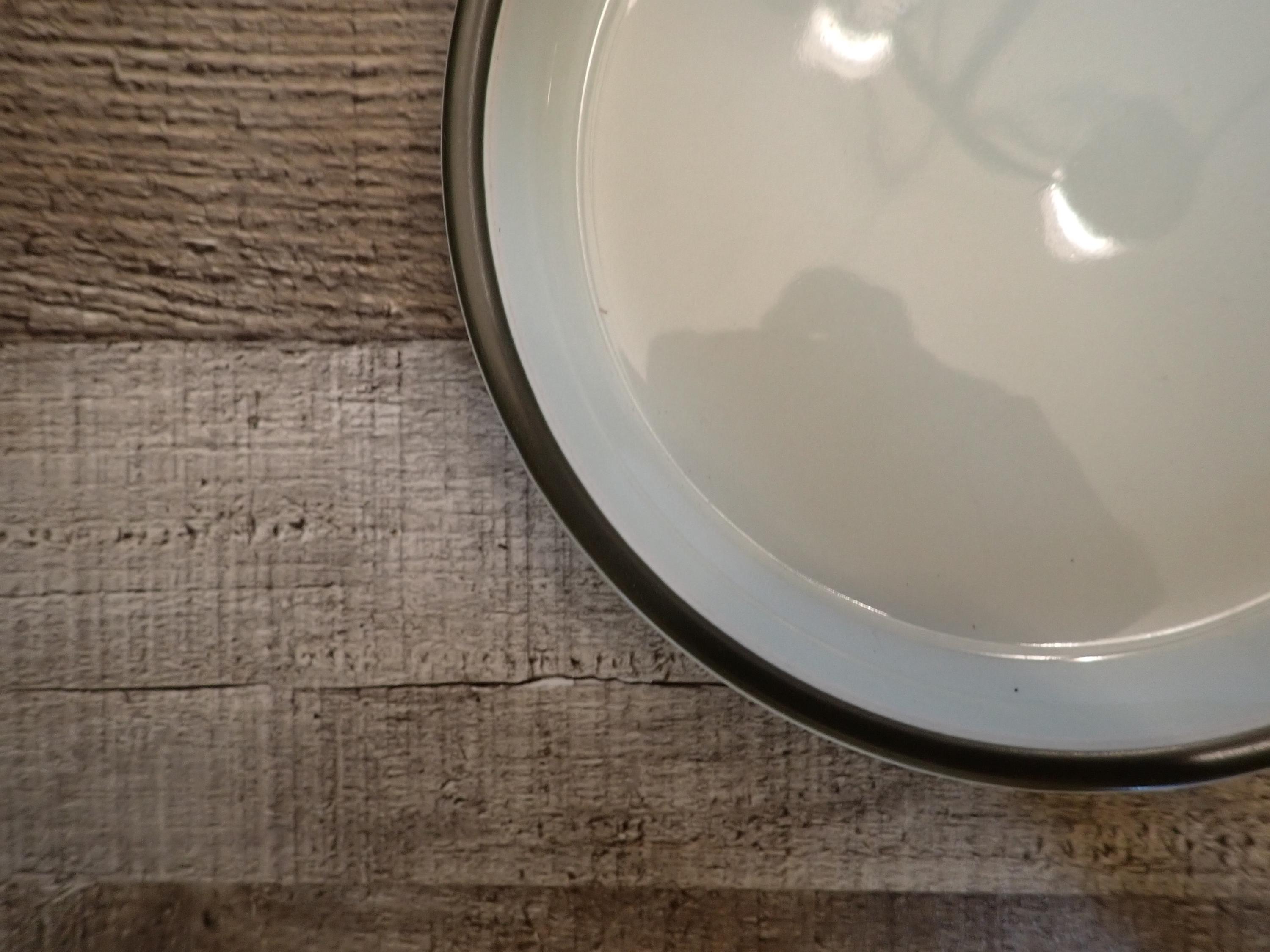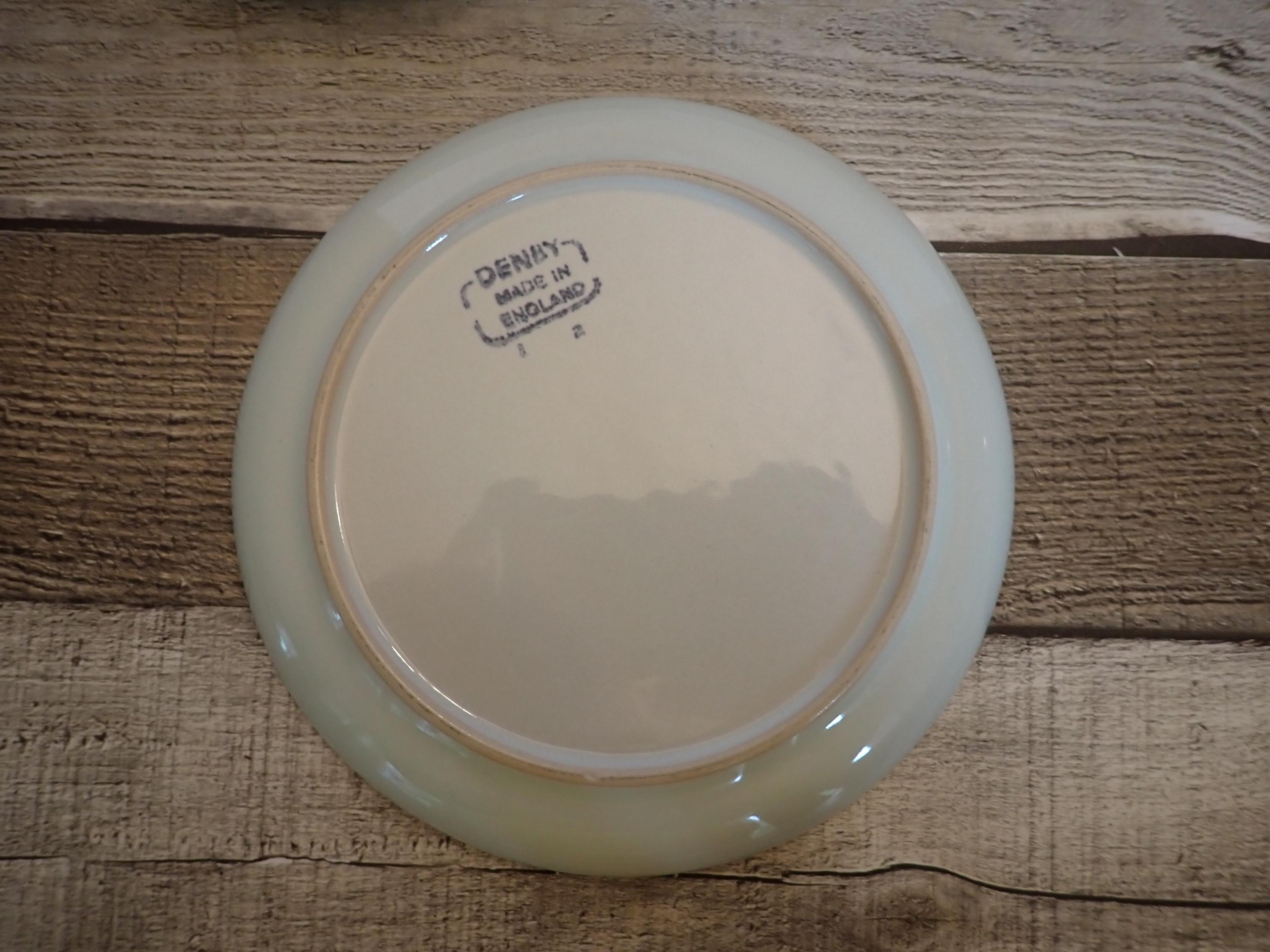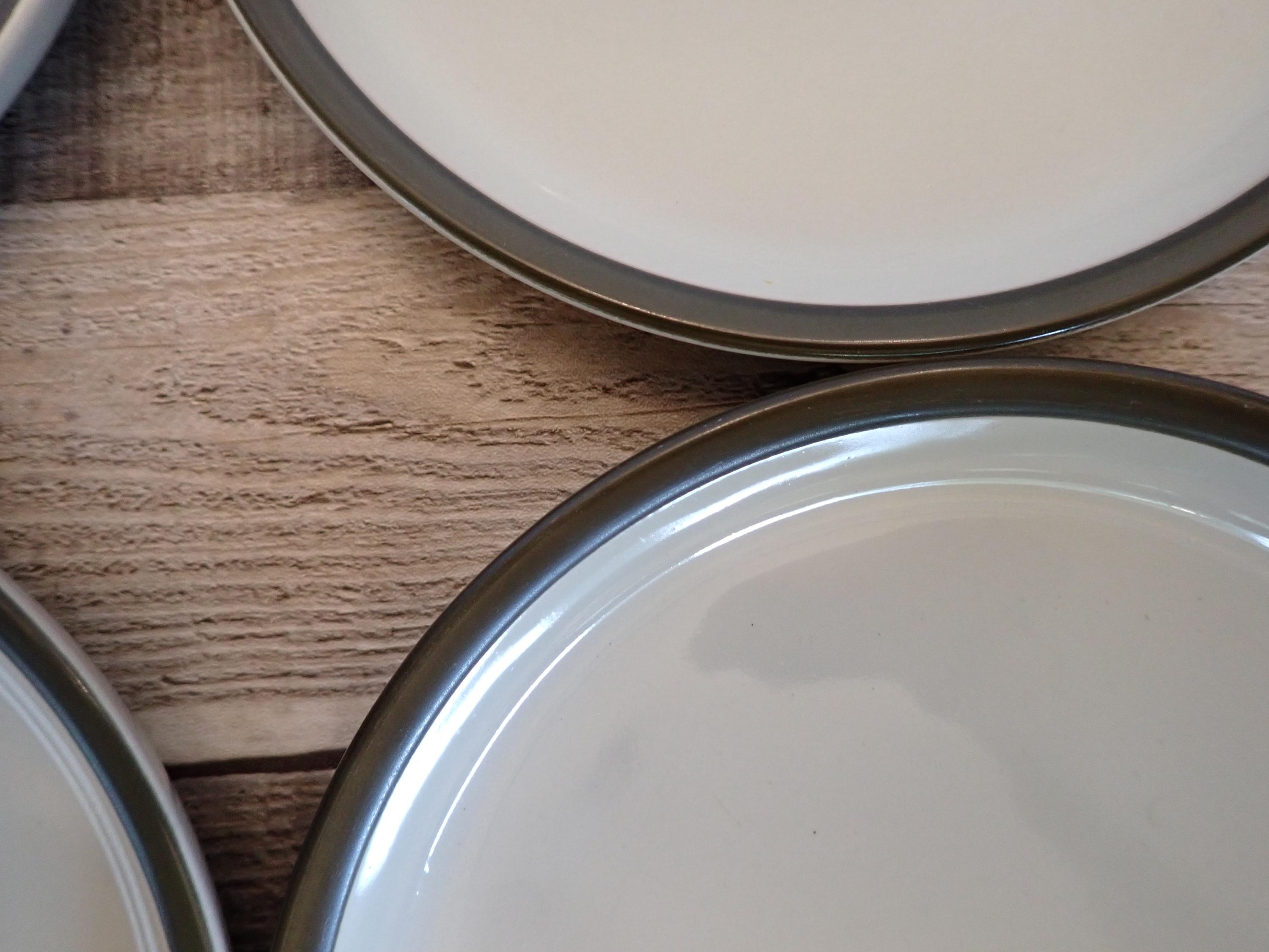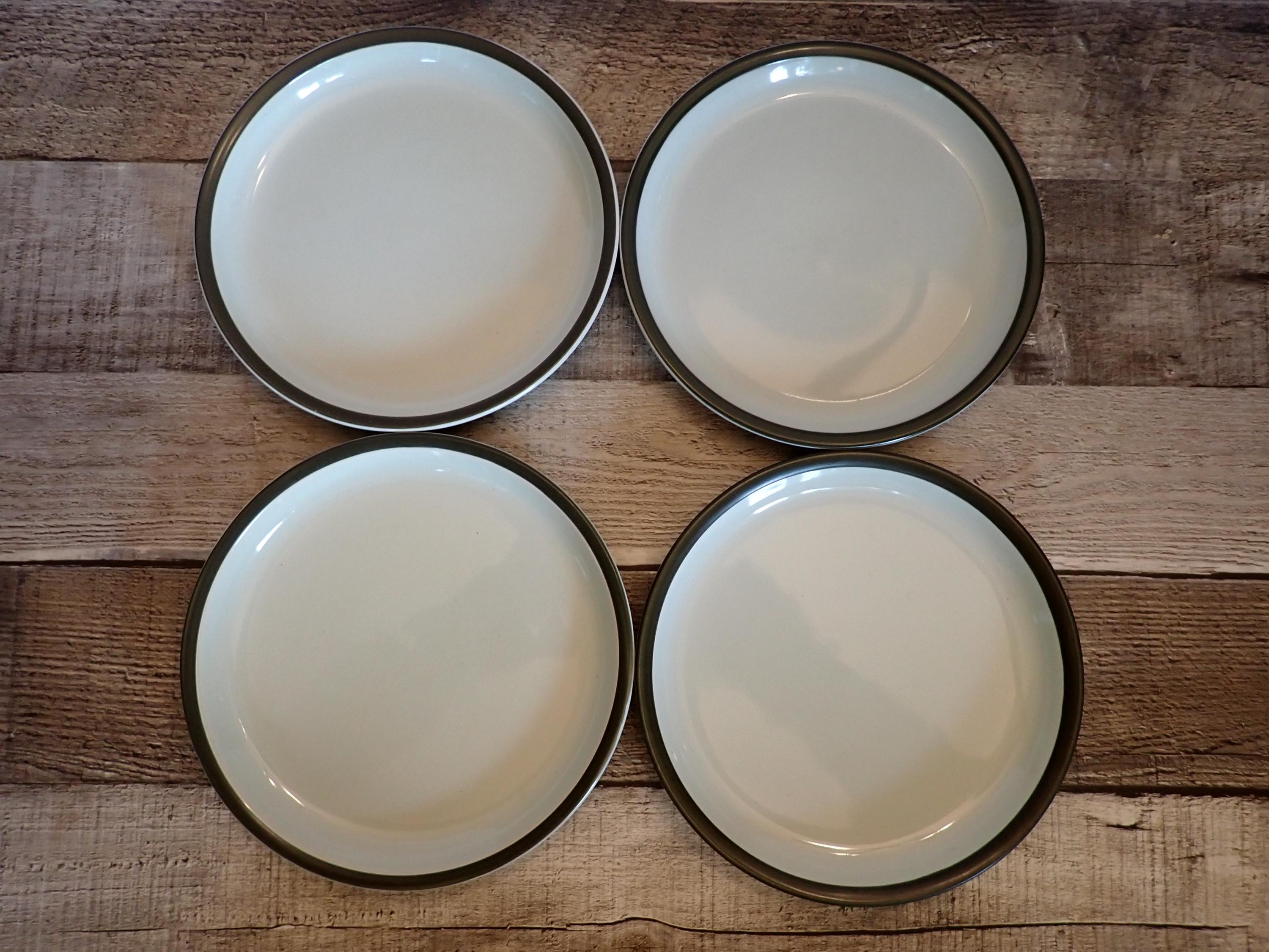 This set of 4 plates by Denby are in the Summit pattern and are the Bread and Butter Plates. Each plate is 6.5" in diameter and 1" tall. They are an off-white color and have a dark green/brown band around the rim. The bottoms are marked with the Denby logo. I believe these are the celadon color, as they have a bit of a light green hue to them. All 4 plates are in very good condition with no chips or cracks and few scratches.