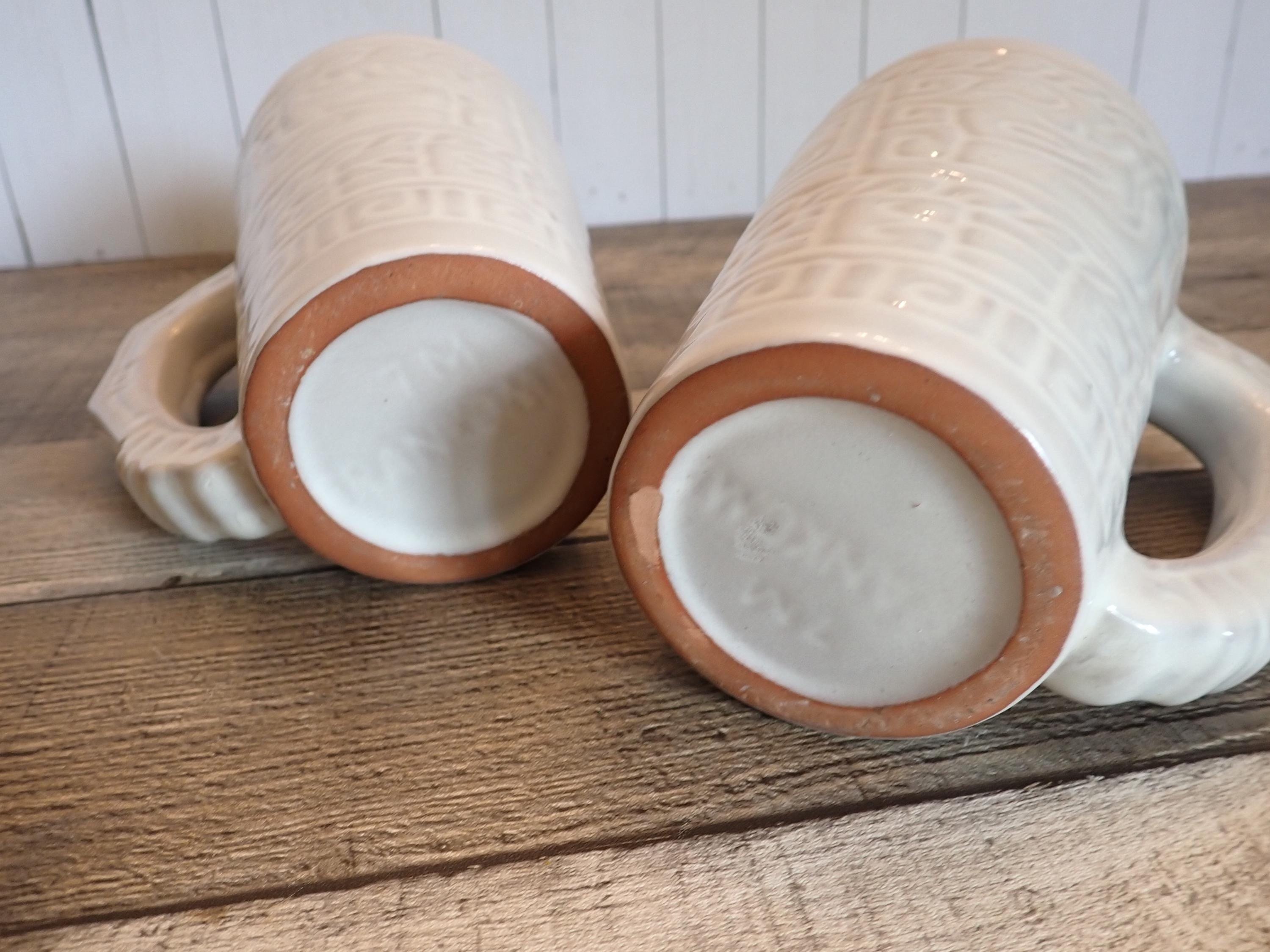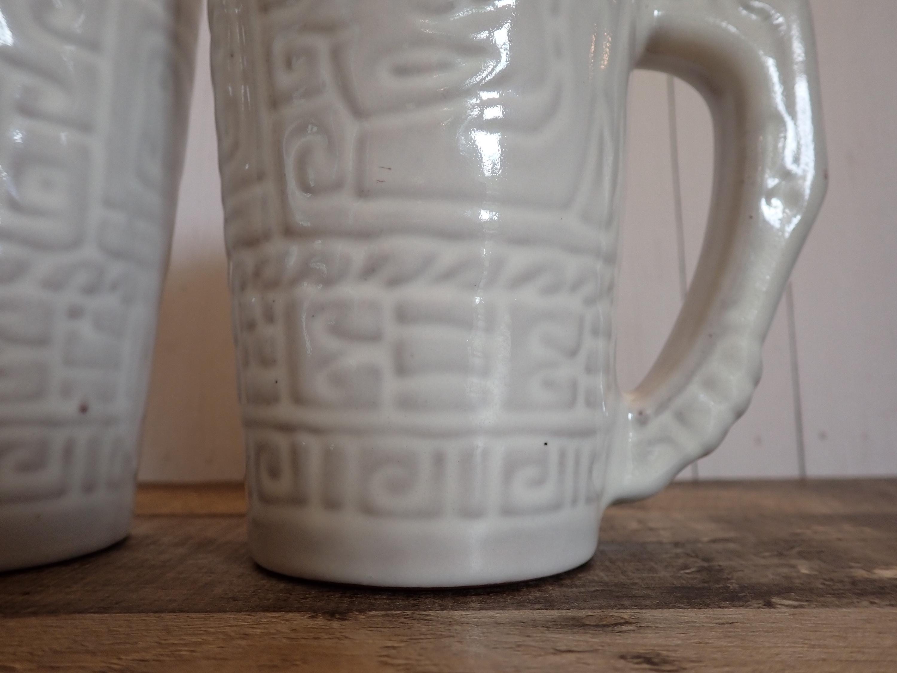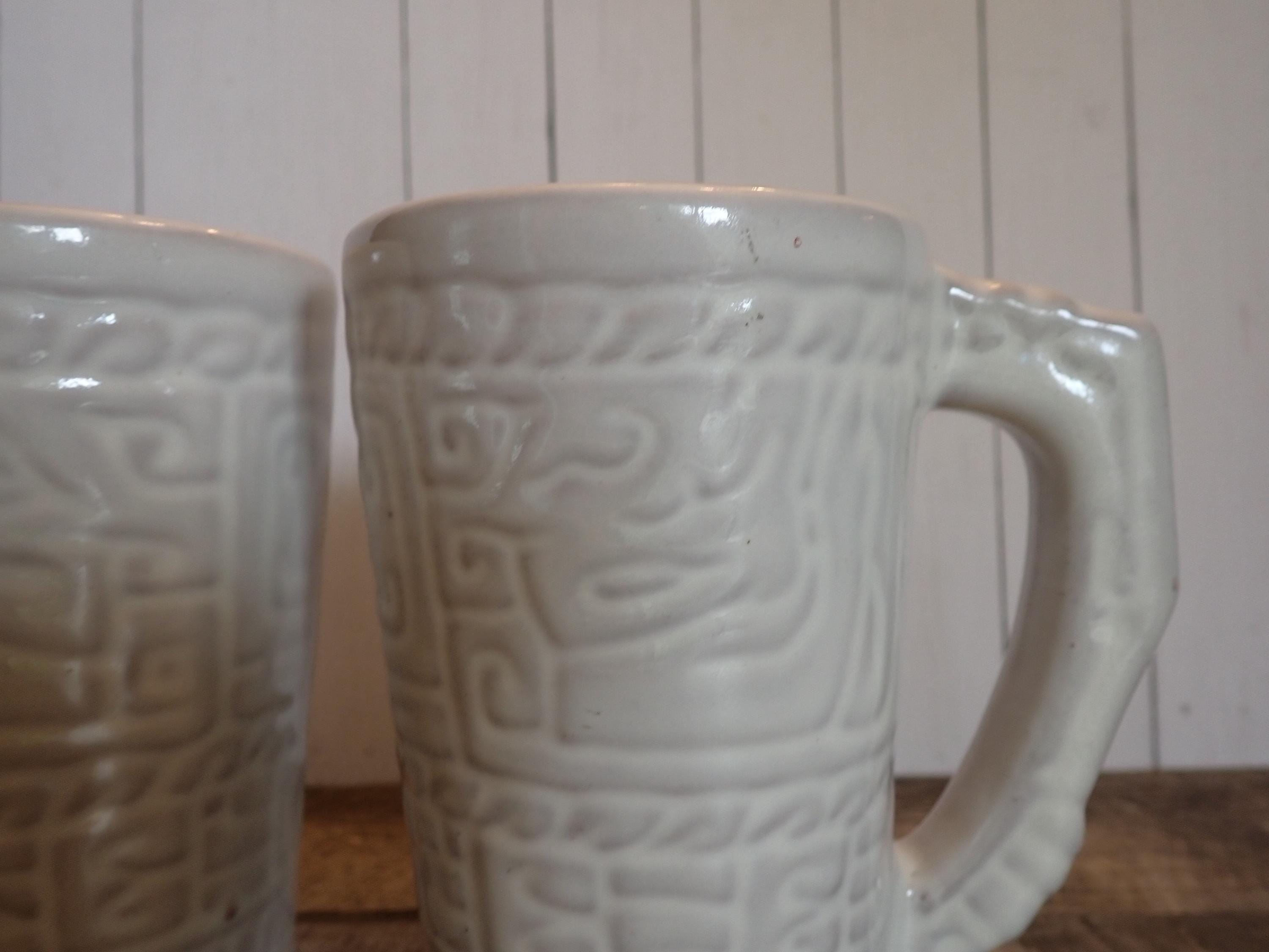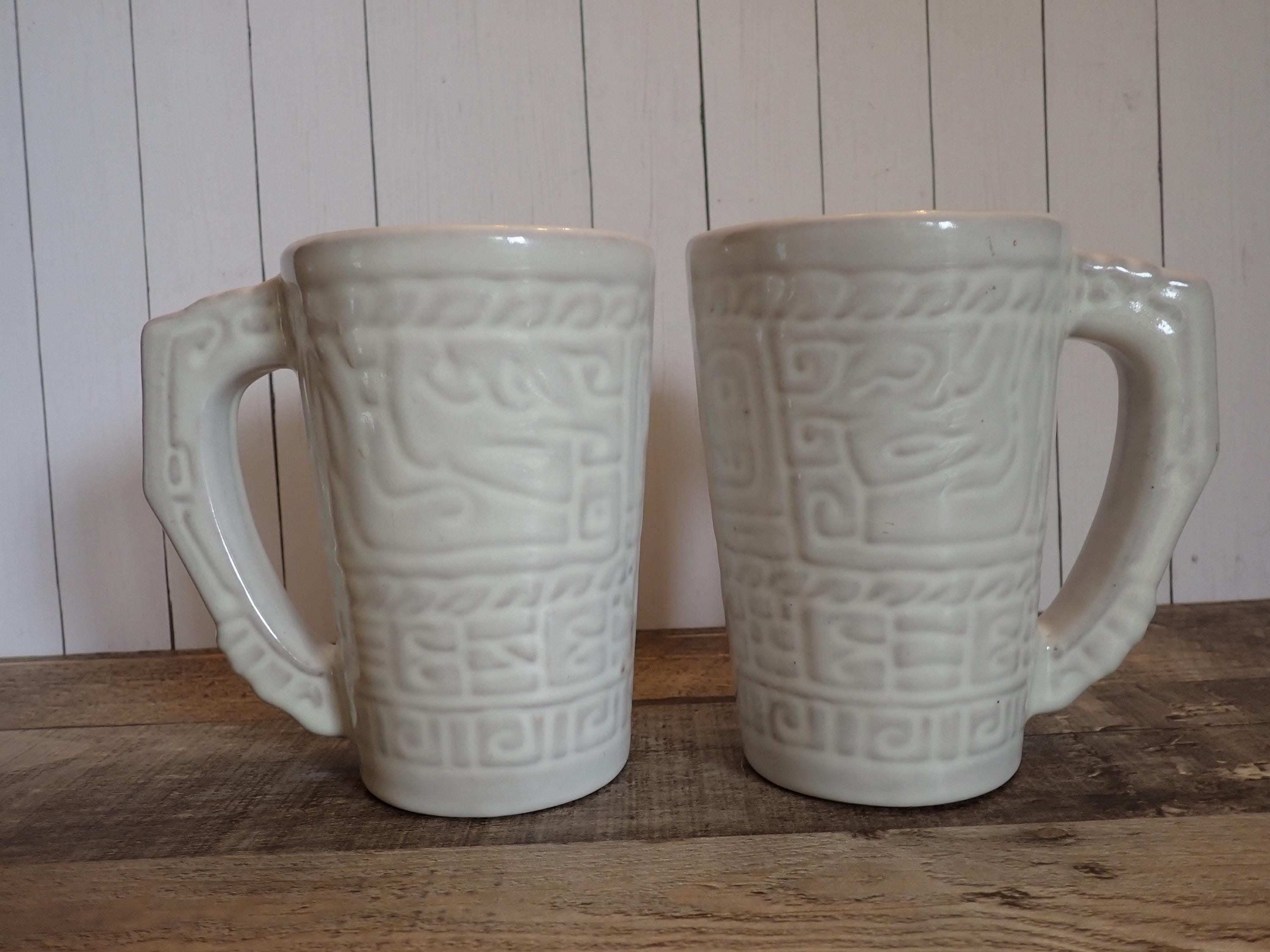 This set of 2 Frankoma grandmugs are in the White Mayan Aztec pattern. This set includes 2 matching grandmugs - they are 5.5" tall and 3.75" in diameter (without the handle.) They are glazed with a white glaze and have an impressed hieroglyph design. The mugs are in very nice condition however one mug does an a crack/repair along the rim near the handle - this is shown in detail in the last 3 photos.