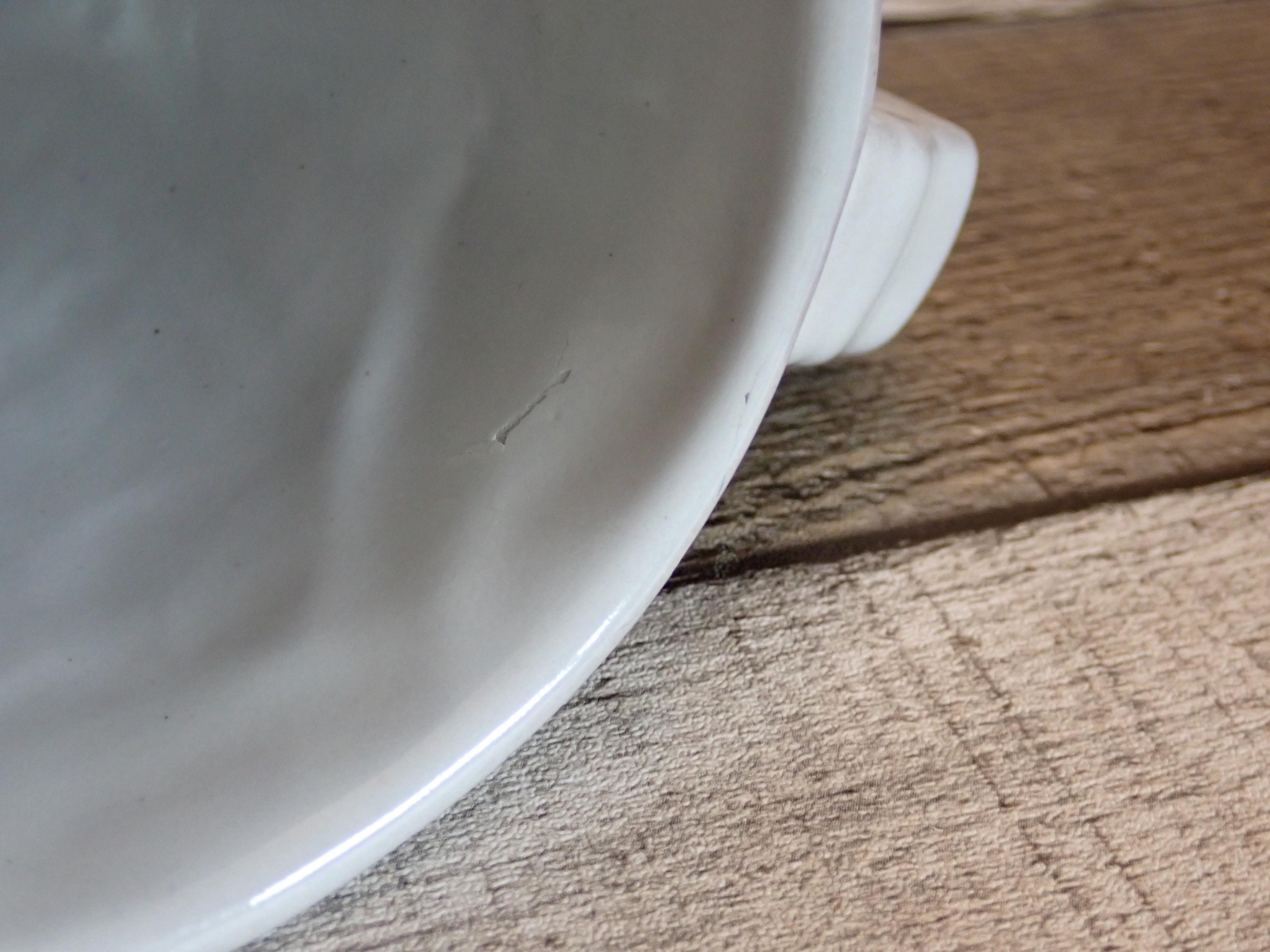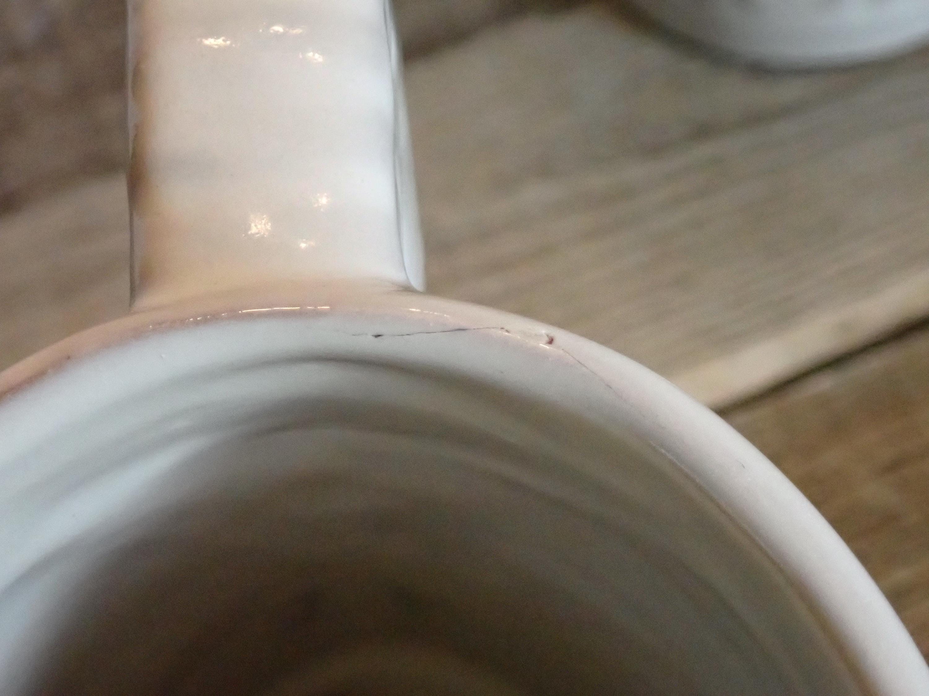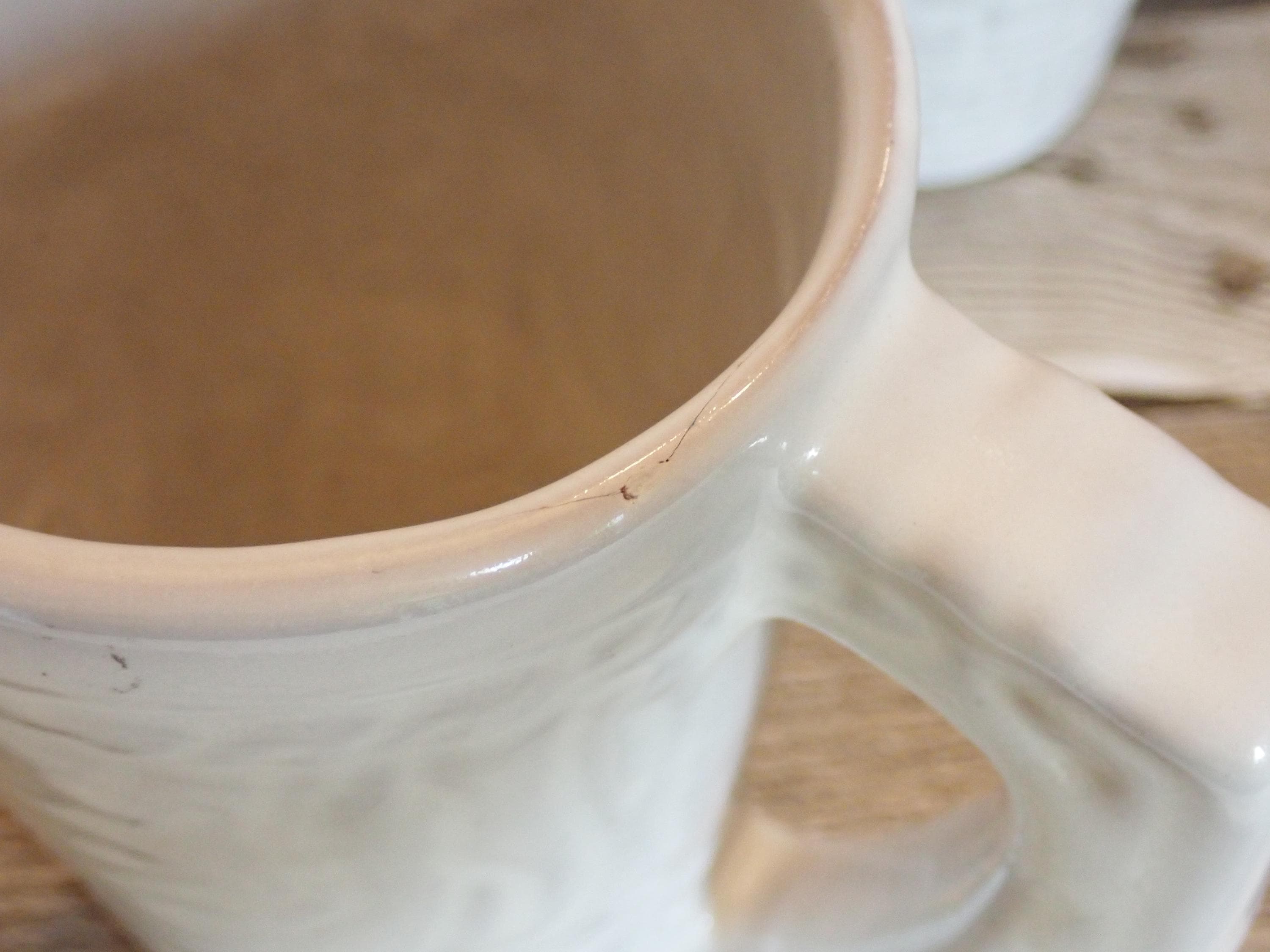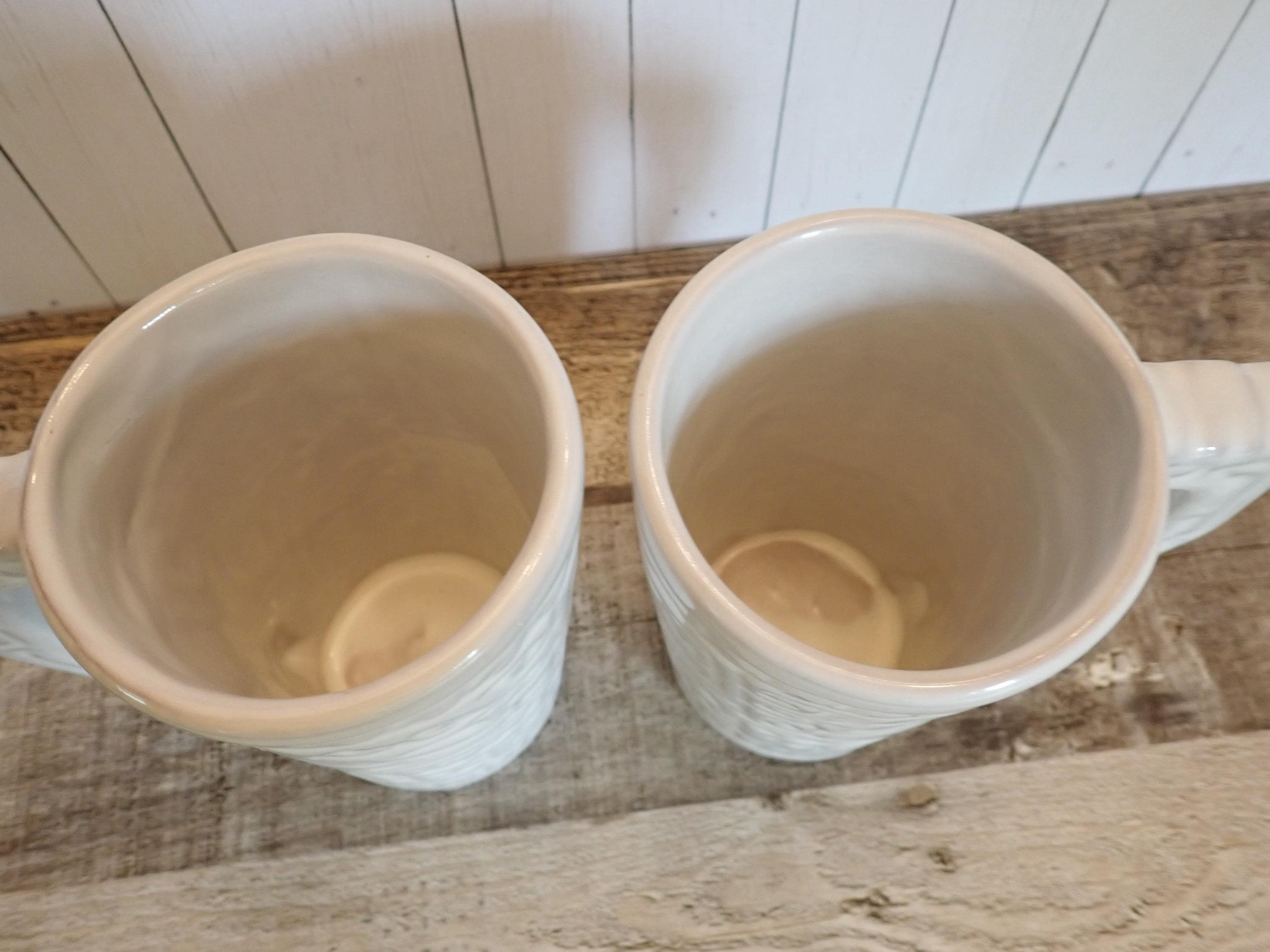 This set of 2 Frankoma grandmugs are in the White Mayan Aztec pattern. This set includes 2 matching grandmugs - they are 5.5" tall and 3.75" in diameter (without the handle.) They are glazed with a white glaze and have an impressed hieroglyph design. The mugs are in very nice condition however one mug does an a crack/repair along the rim near the handle - this is shown in detail in the last 3 photos.