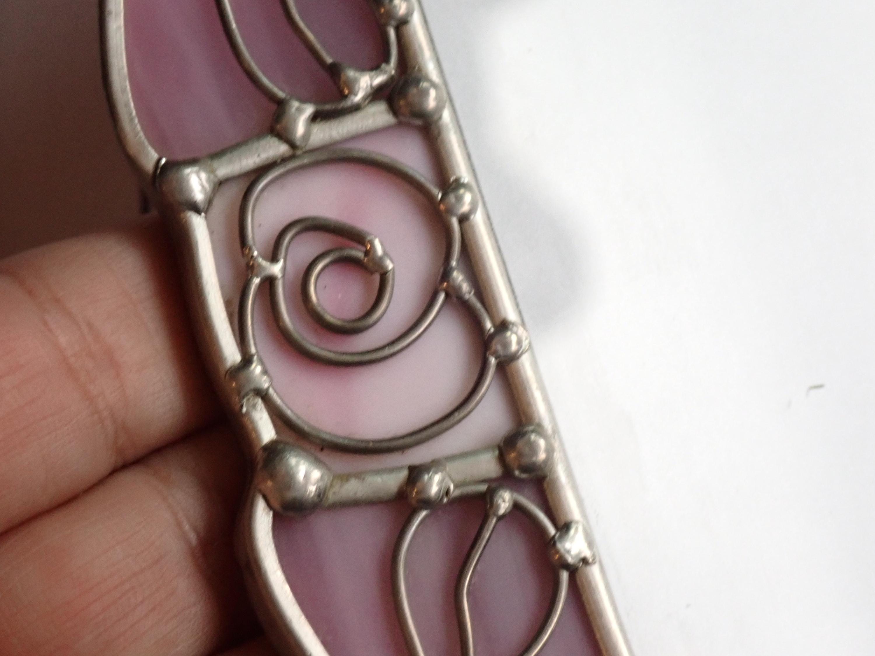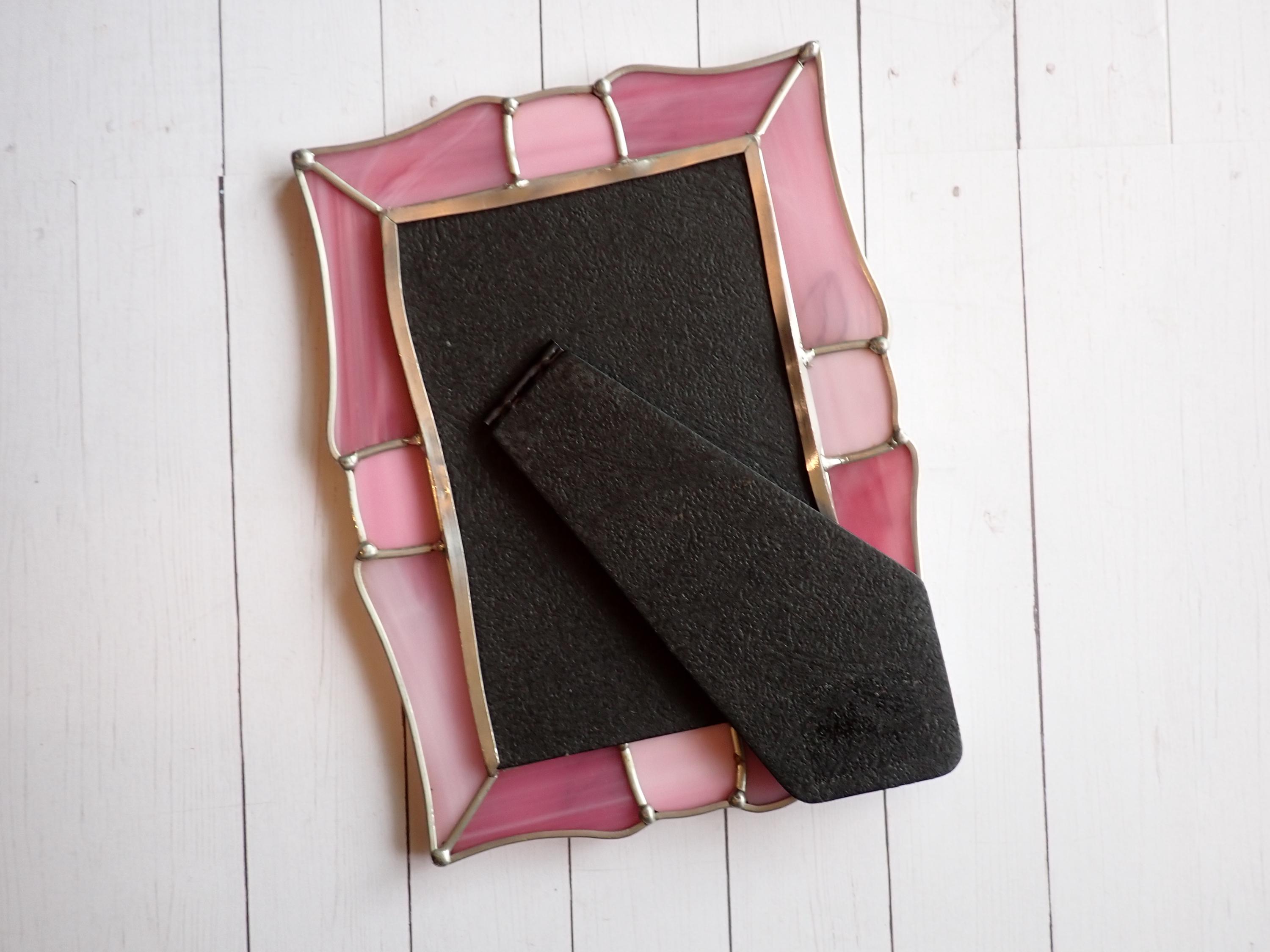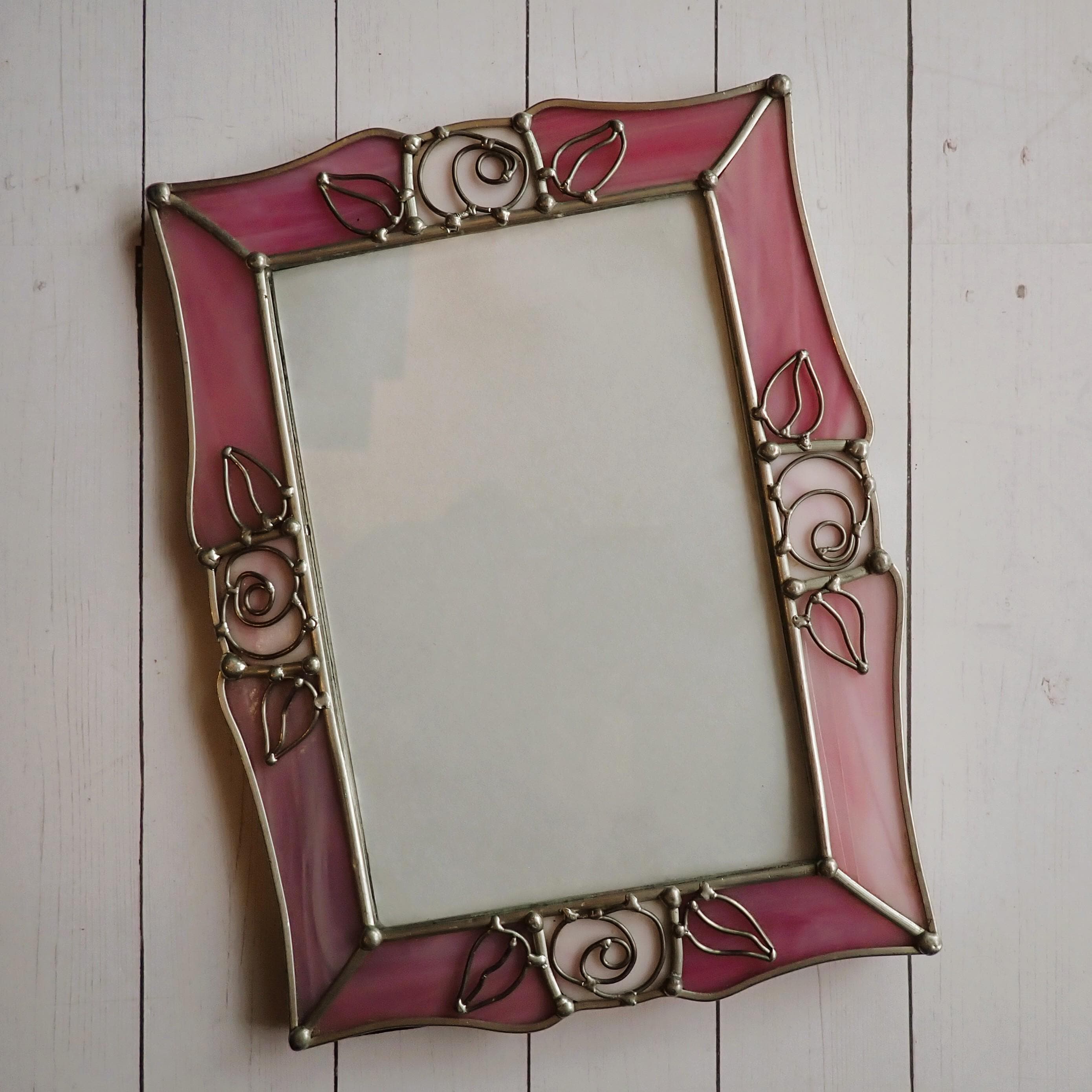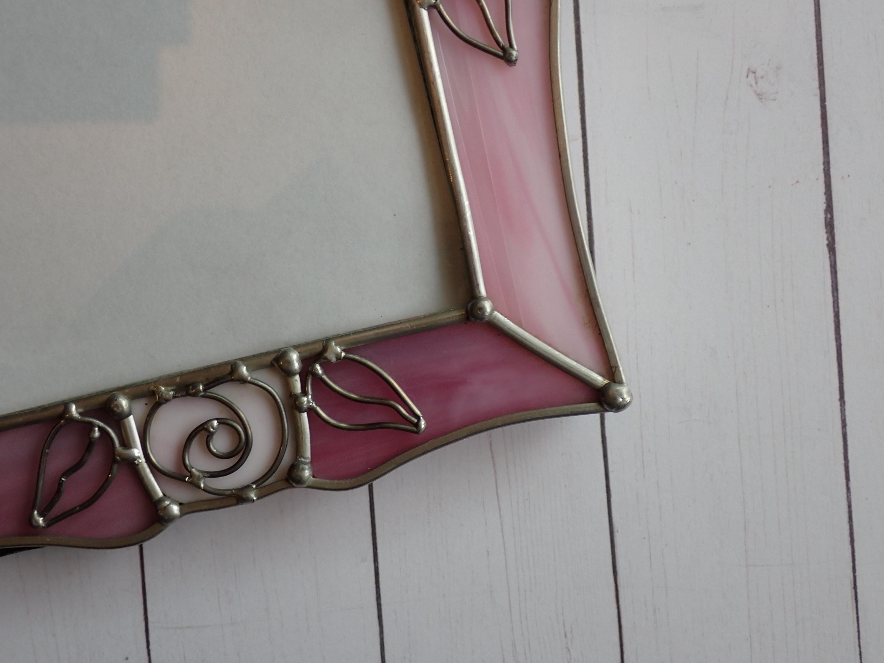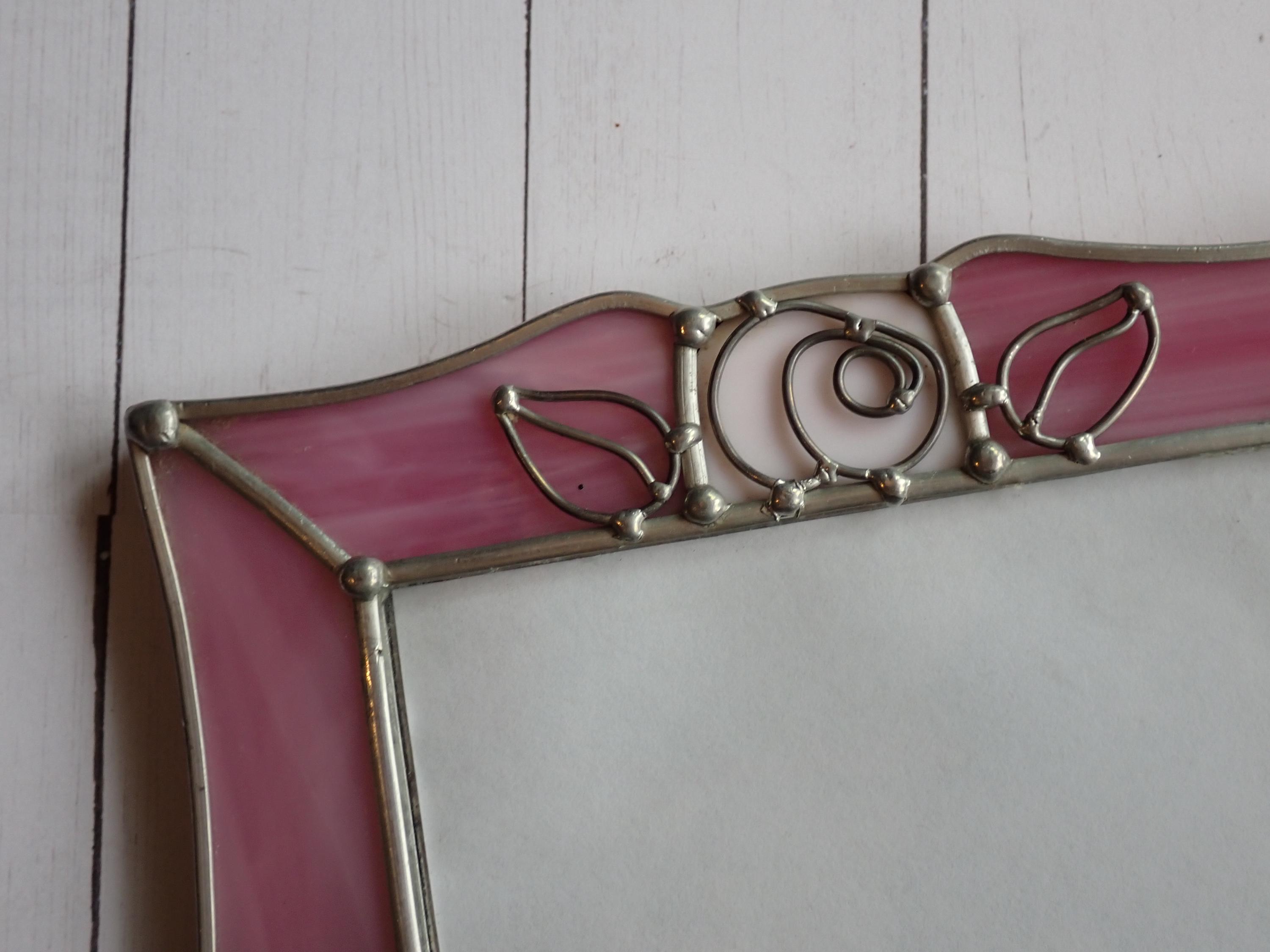 This stained glass and silver metal photo frame is 8" tall by 6" wide and can hold one 4x6 photo vertically or horizontally. The frame is a silver metal with pink stained glass panels and a rose and leaf design. The frame has a clear glass insert over the photo opening, and a cardboard backing piece with a photo stand. The frame is in very good condition.