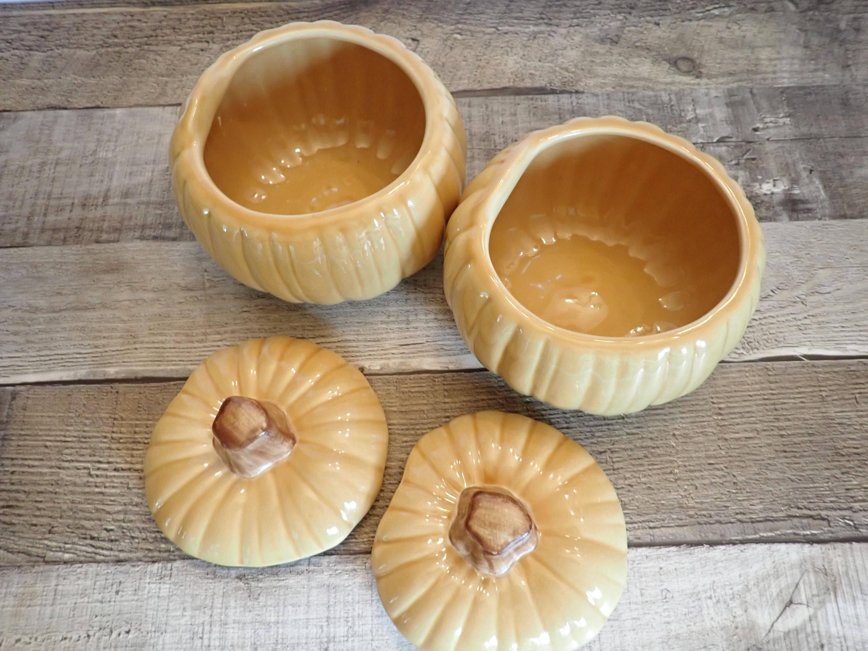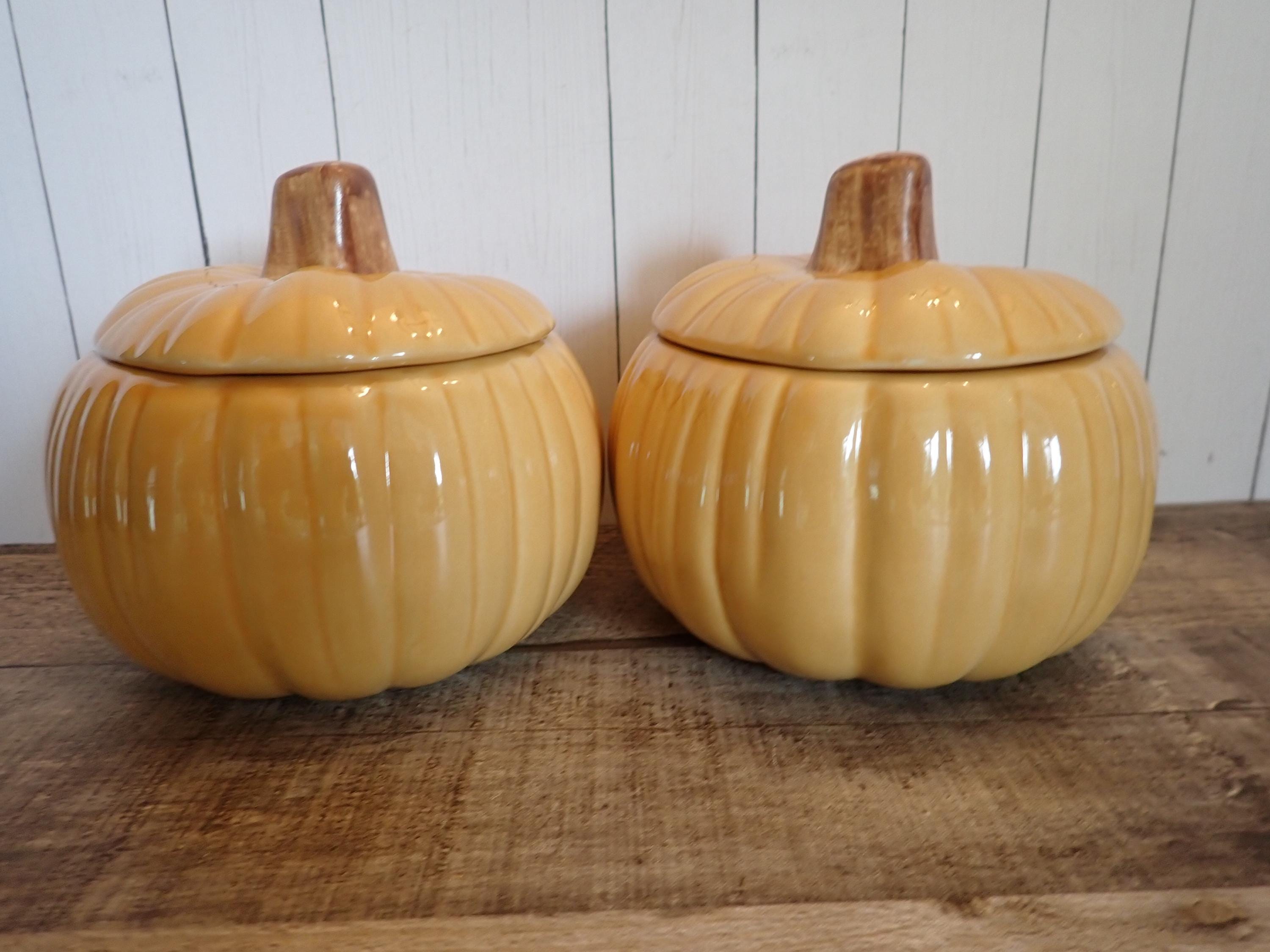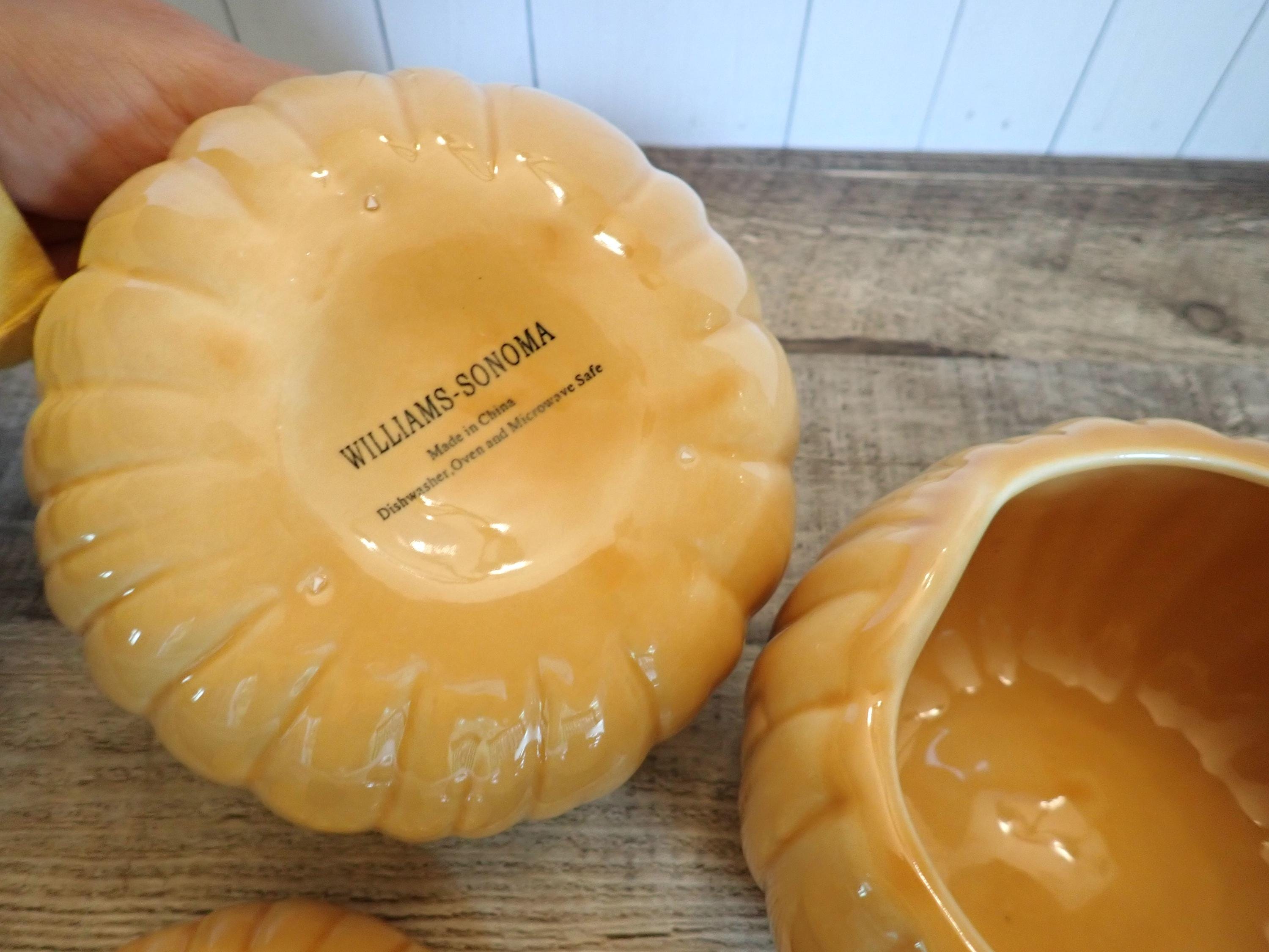 This set of 2 ceramic pumpkin shaped bowls by William Sonoma are 5" tall and 5" in diameter. This set includes 2 of these matching pumpkin bowls with lids. They are both are a light orange color with a brown stalk. The bottoms are marked William Sonoma. Both bowls are in very nice condition with no chips or cracks.