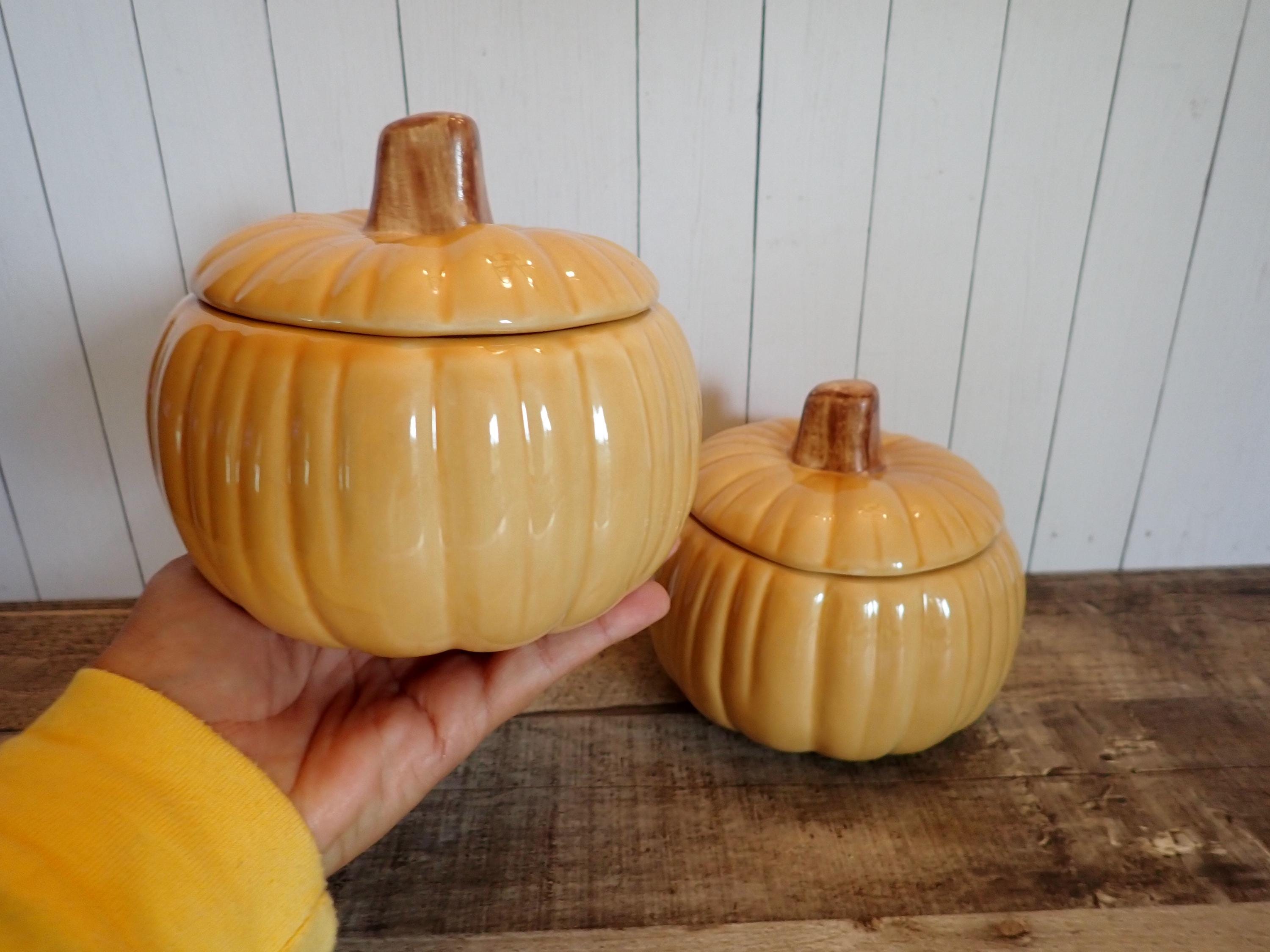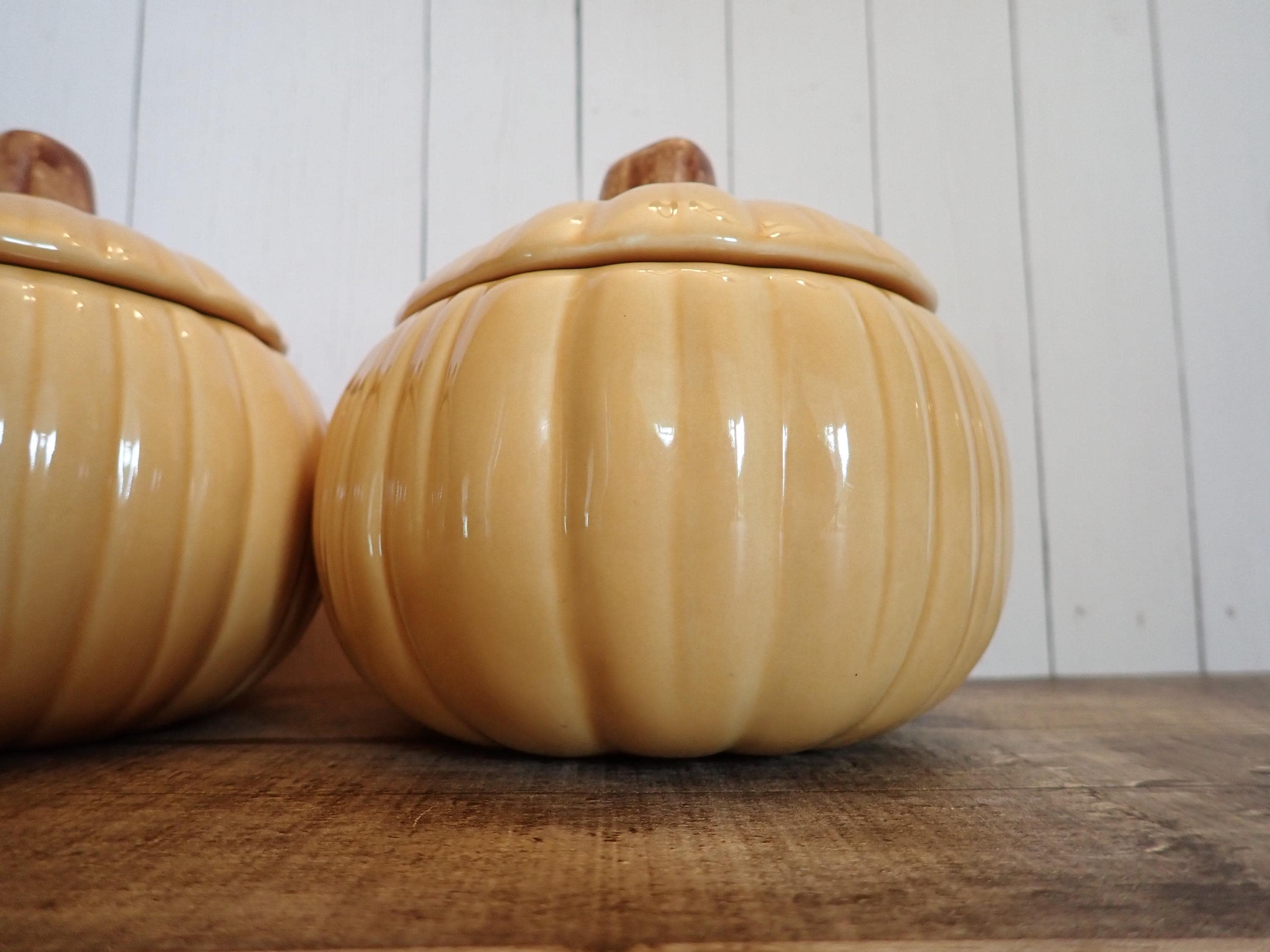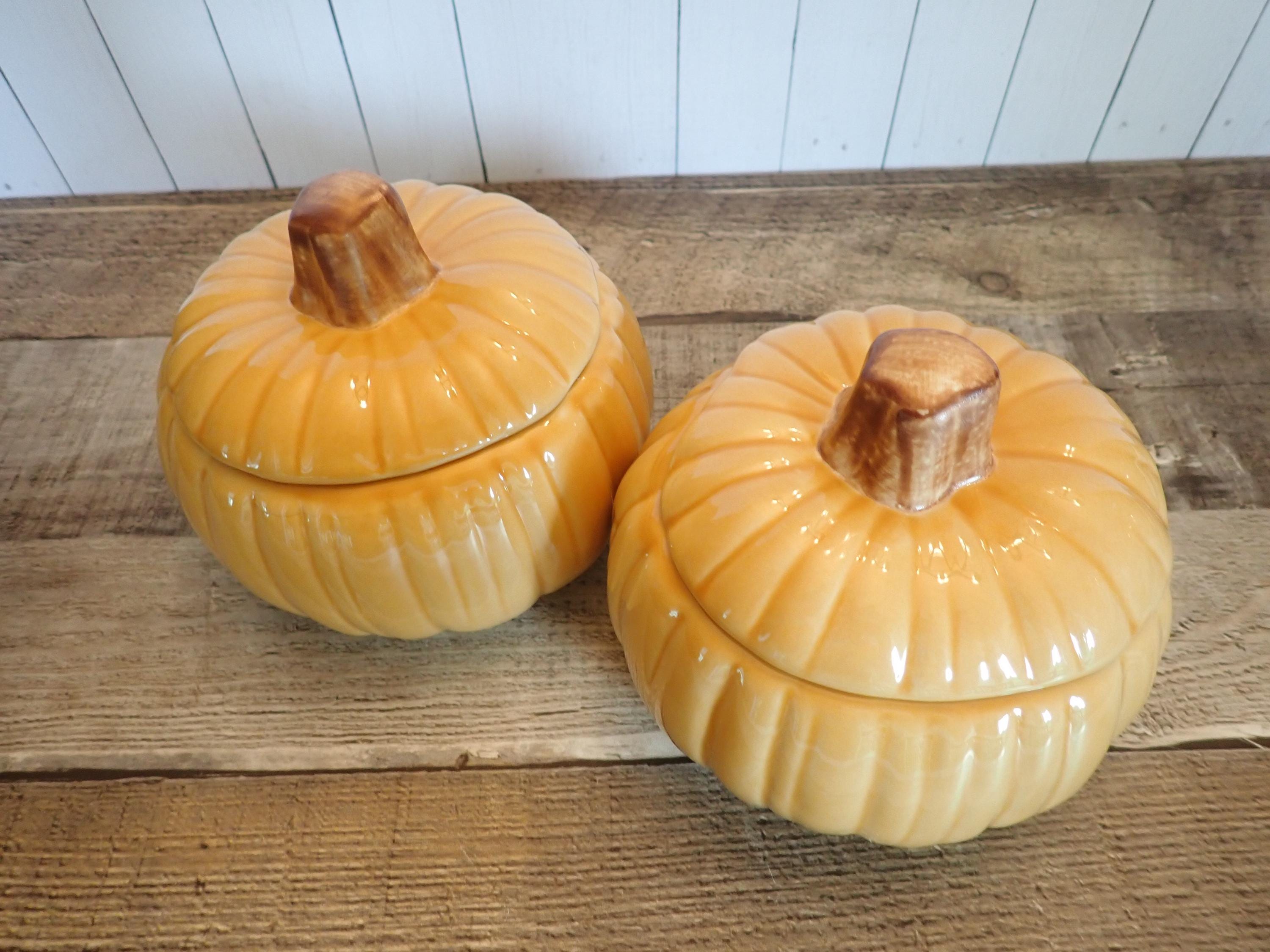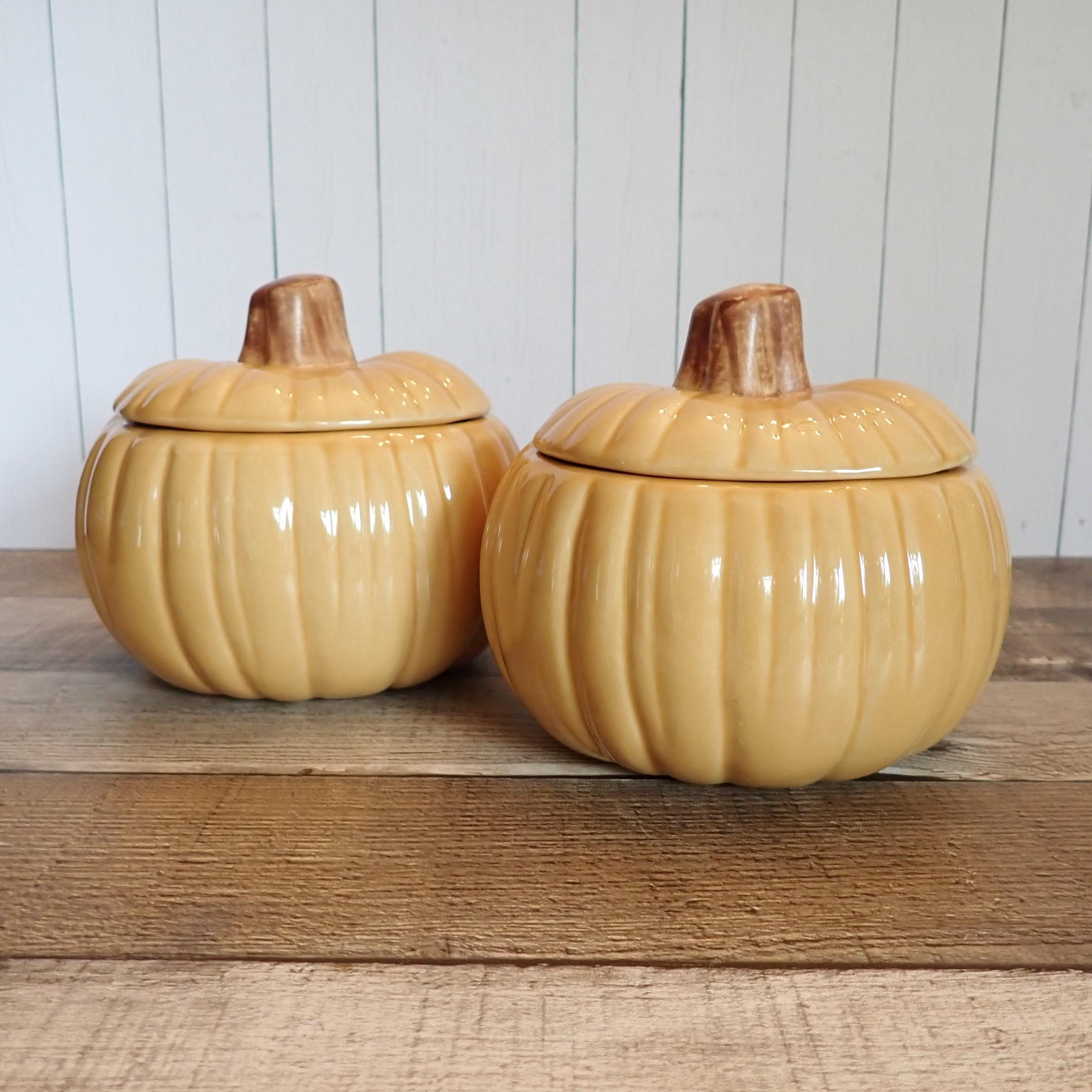 This set of 2 ceramic pumpkin shaped bowls by William Sonoma are 5" tall and 5" in diameter. This set includes 2 of these matching pumpkin bowls with lids. They are both are a light orange color with a brown stalk. The bottoms are marked William Sonoma. Both bowls are in very nice condition with no chips or cracks.