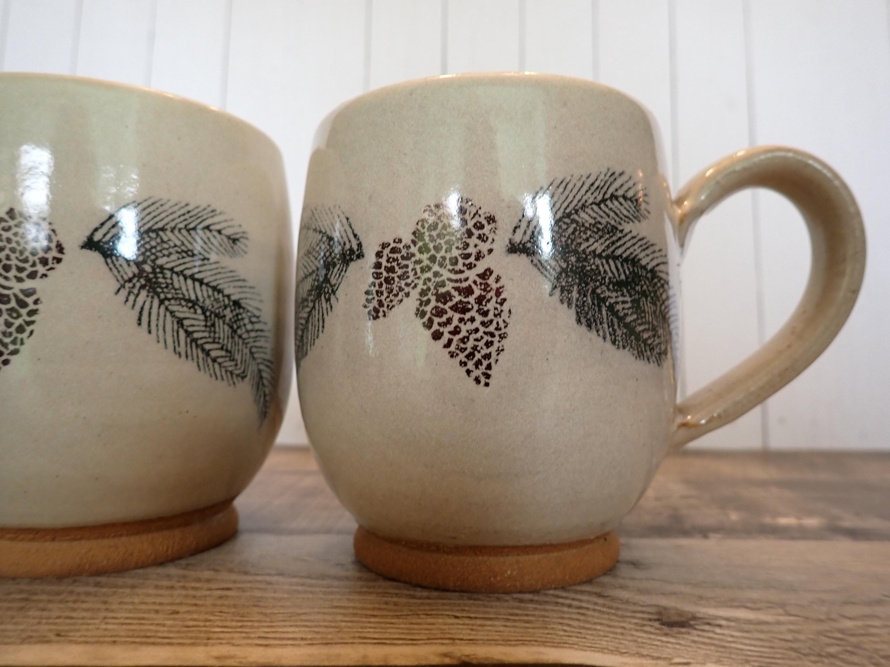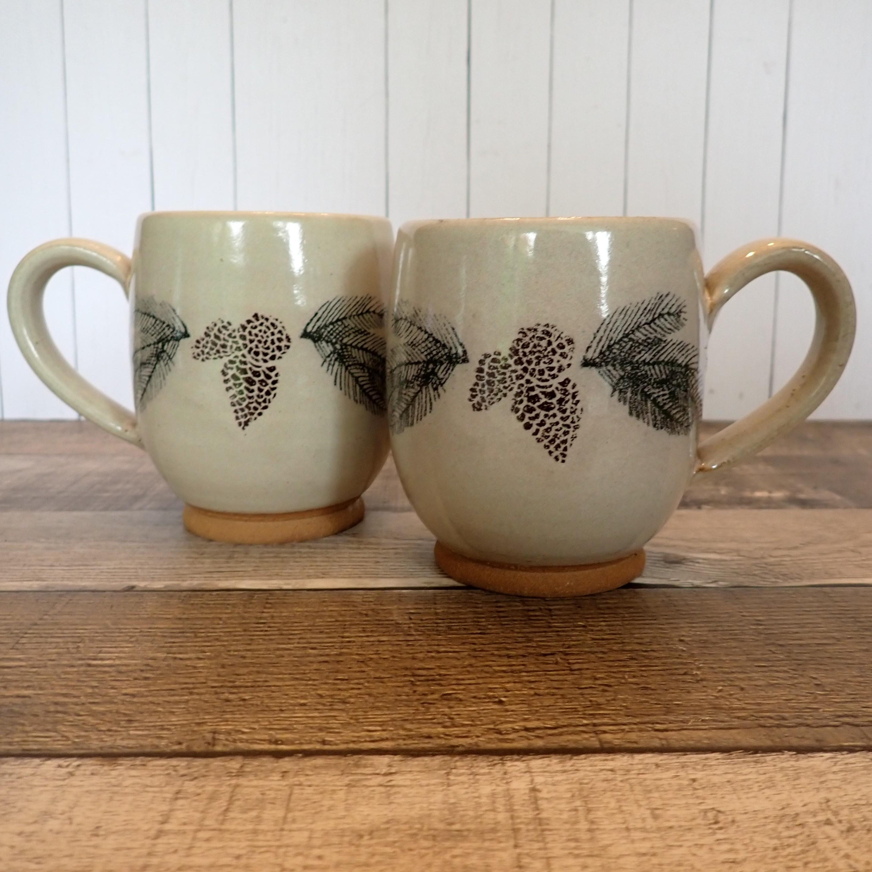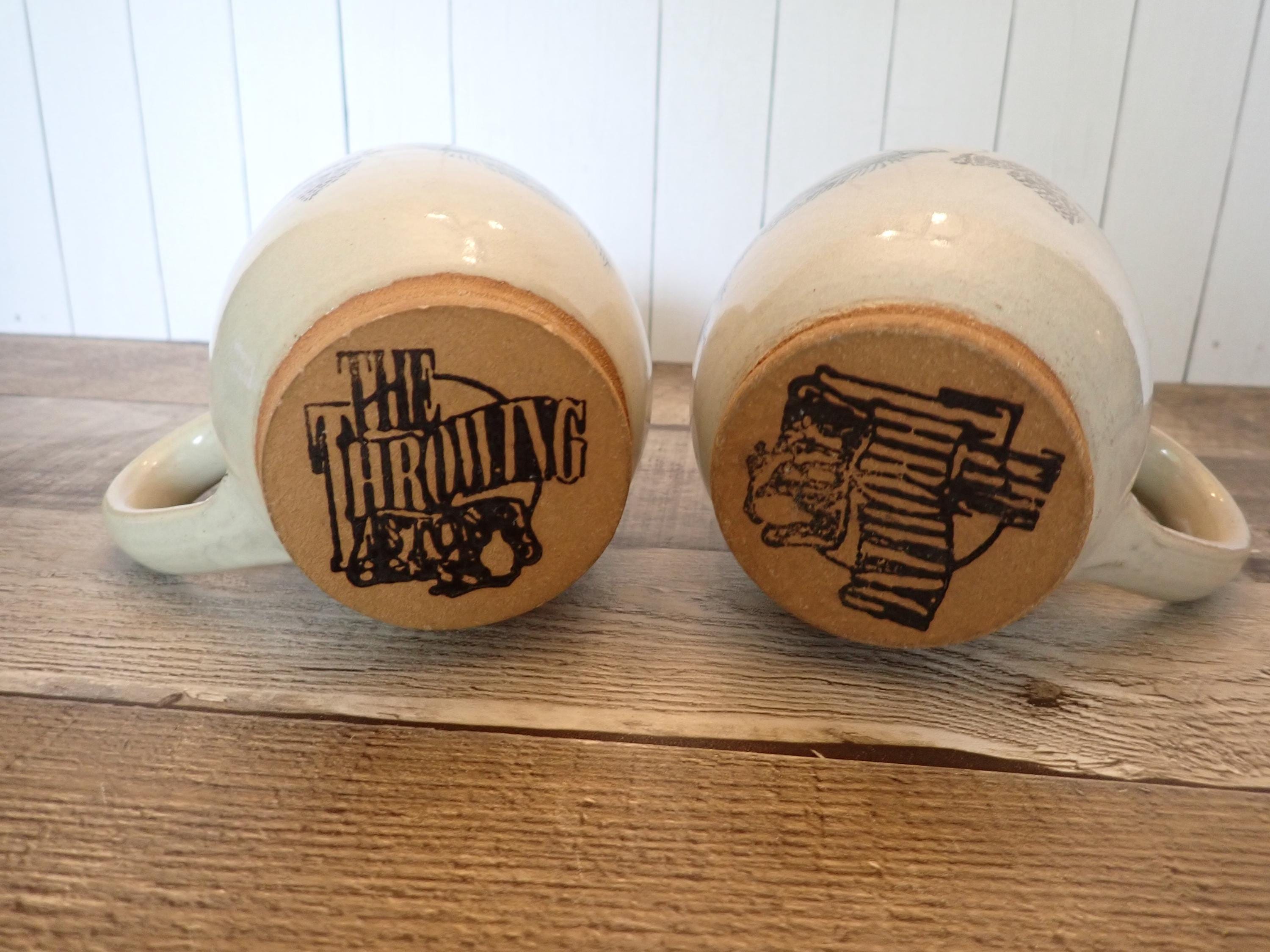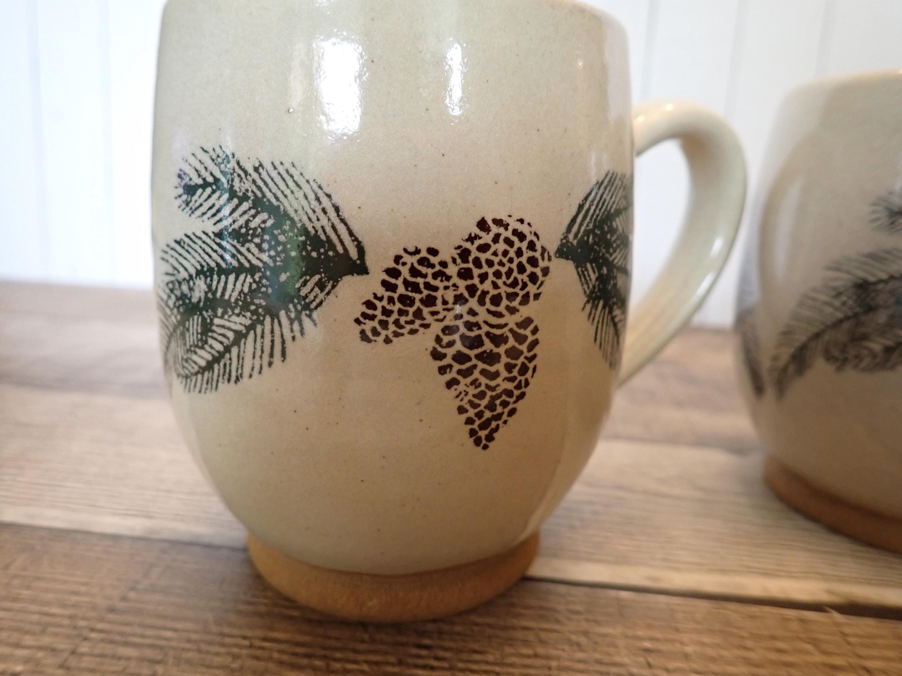 This set of 2 pottery mugs by The Throwing Stone pottery are each 4.25" tall and 3.5" in diameter. They are a cream-colored stoneware with green evergreen branches and brown pinecones around the mug. There is a large, looping handle on one side. The bottom are marked: The Throwing Stone. Both mugs are in very good condition with no chips or cracks. Lovely handmade pottery Christmas mugs!