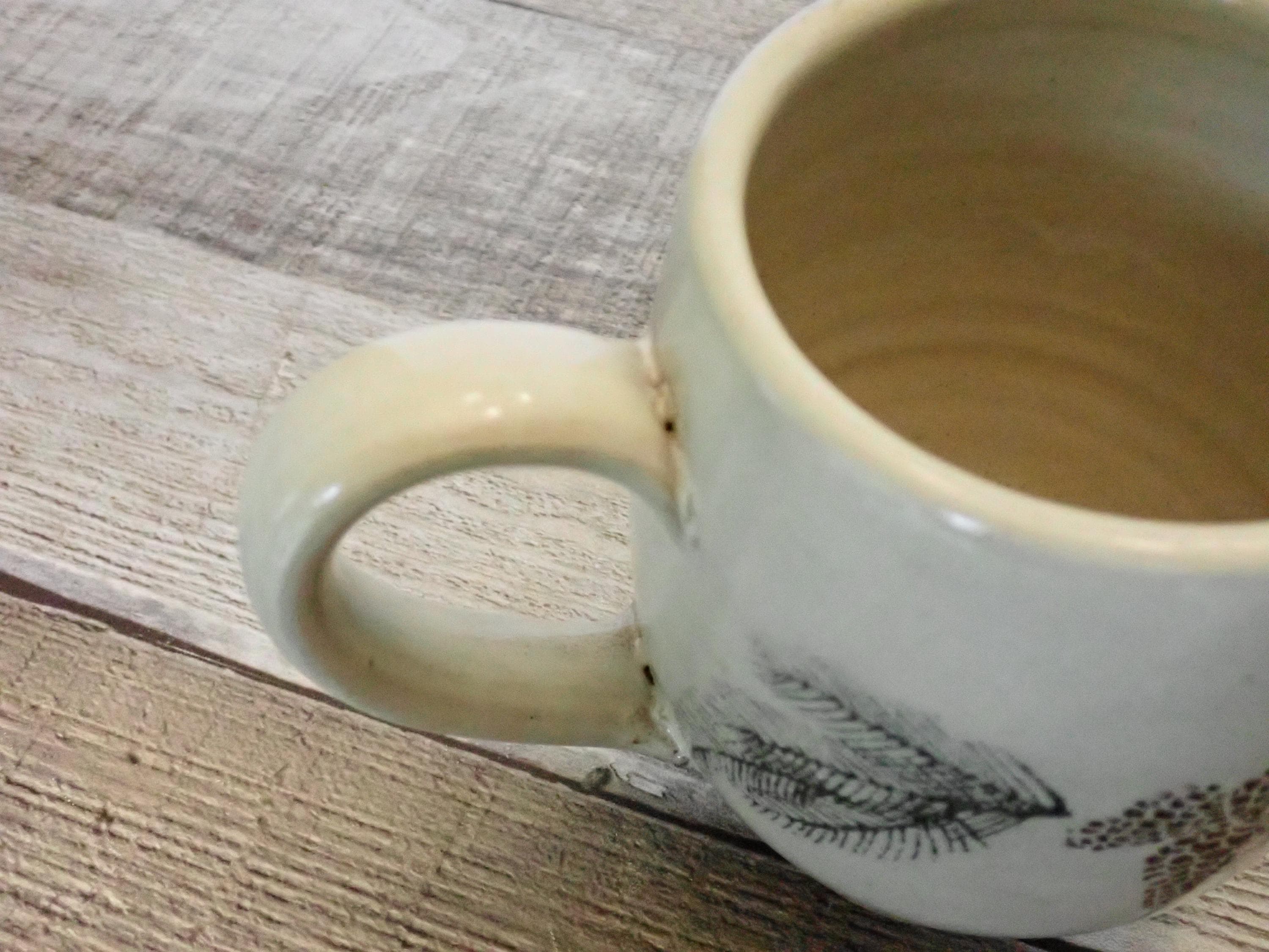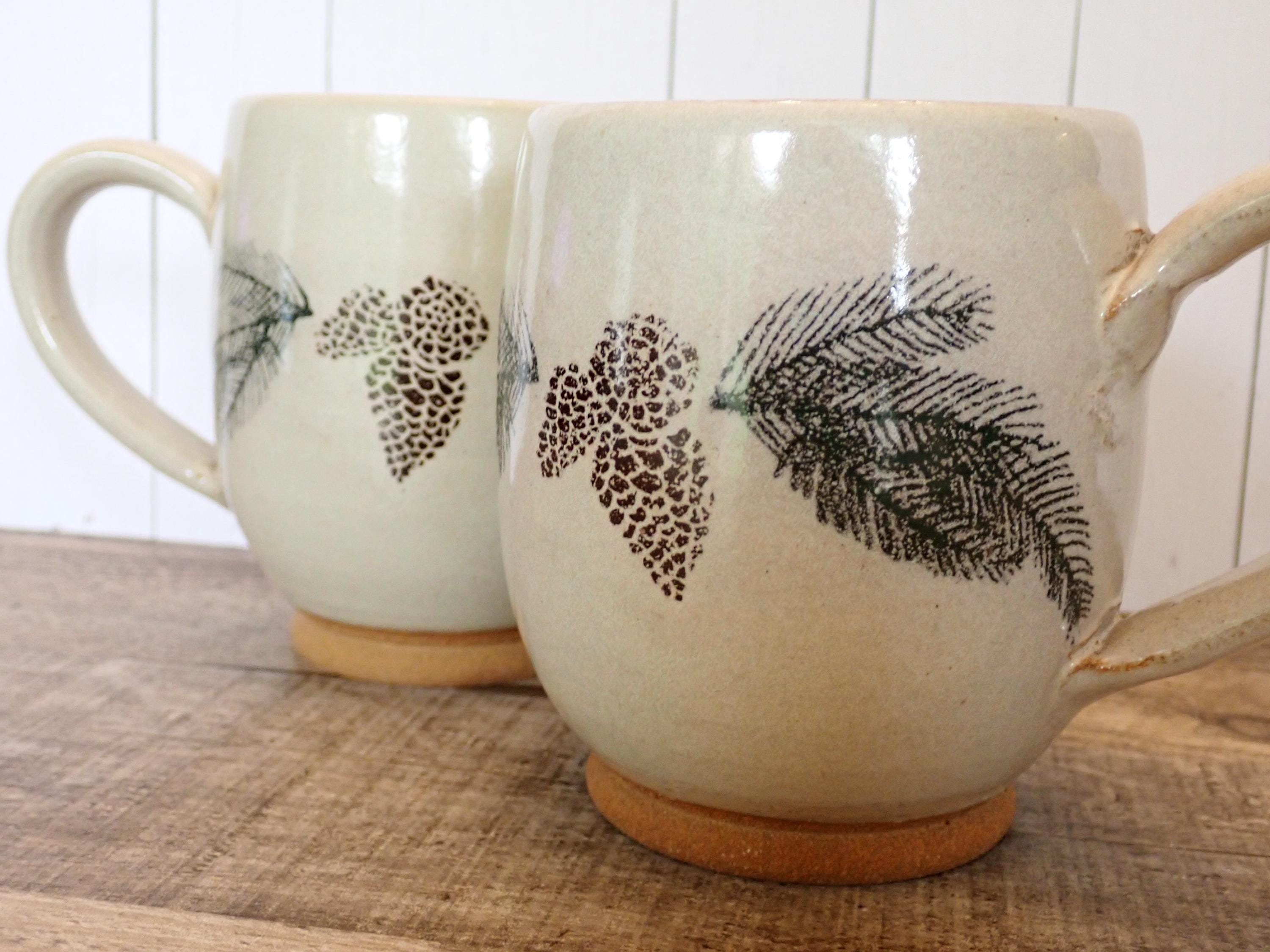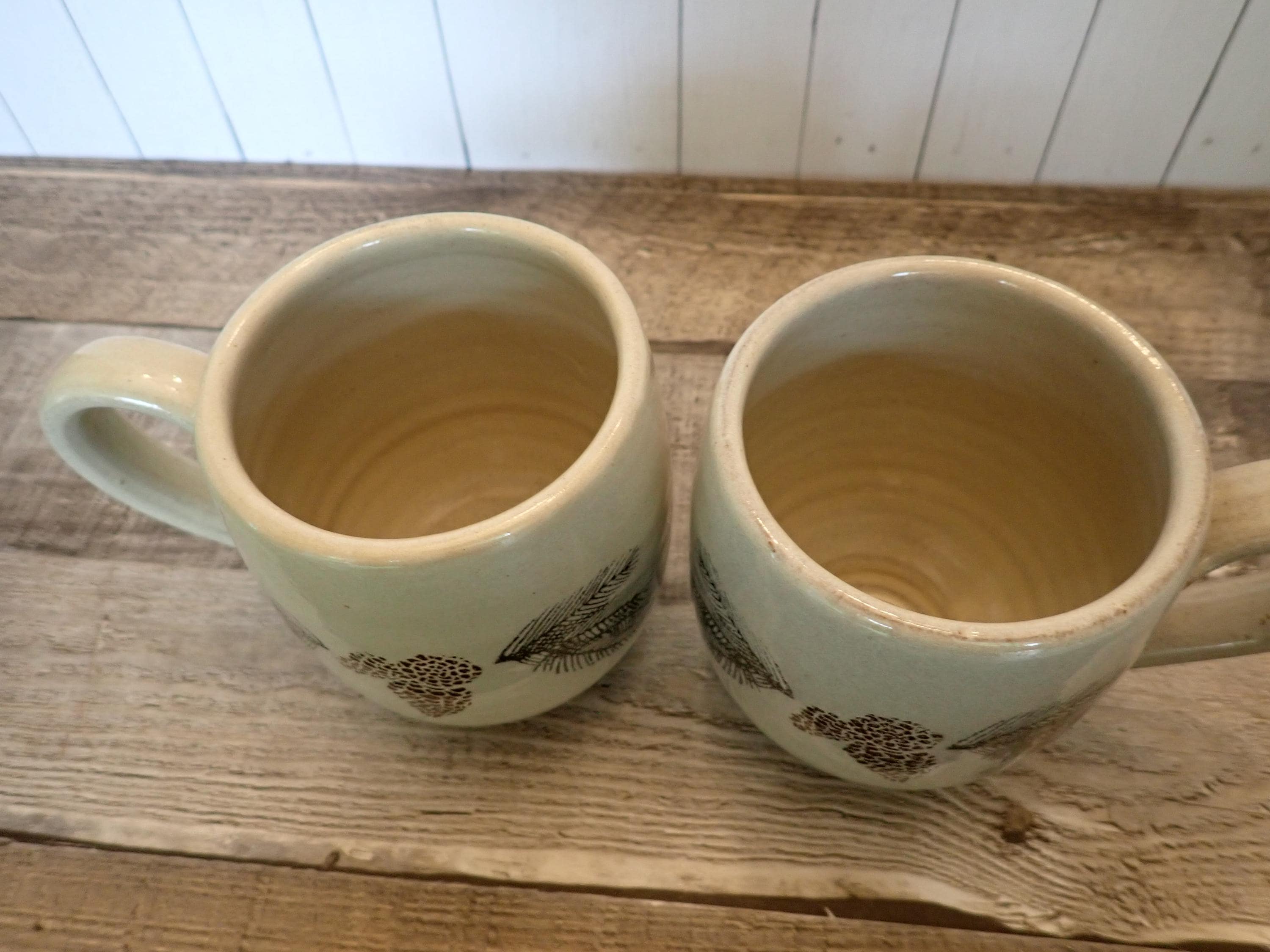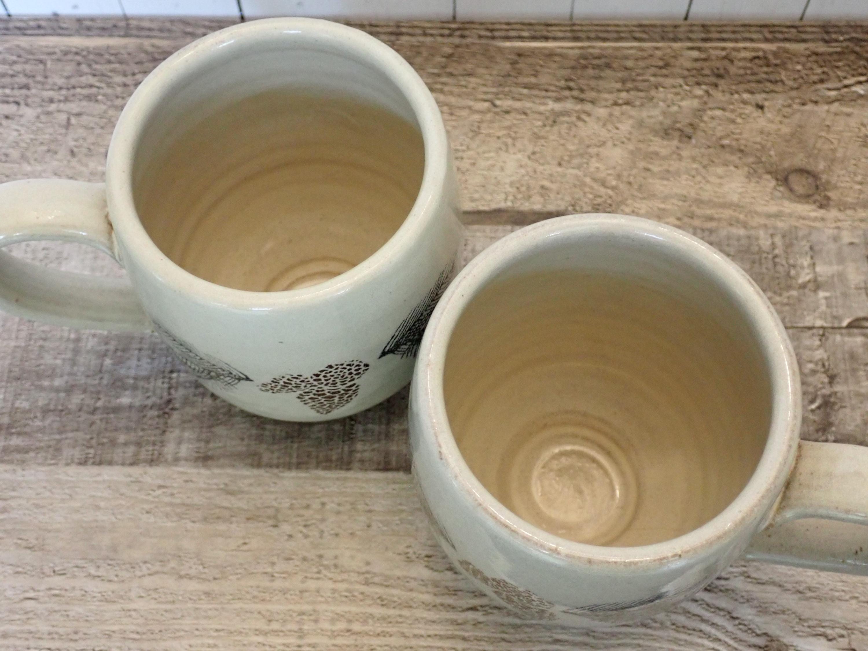 This set of 2 pottery mugs by The Throwing Stone pottery are each 4.25" tall and 3.5" in diameter. They are a cream-colored stoneware with green evergreen branches and brown pinecones around the mug. There is a large, looping handle on one side. The bottom are marked: The Throwing Stone. Both mugs are in very good condition with no chips or cracks. Lovely handmade pottery Christmas mugs!