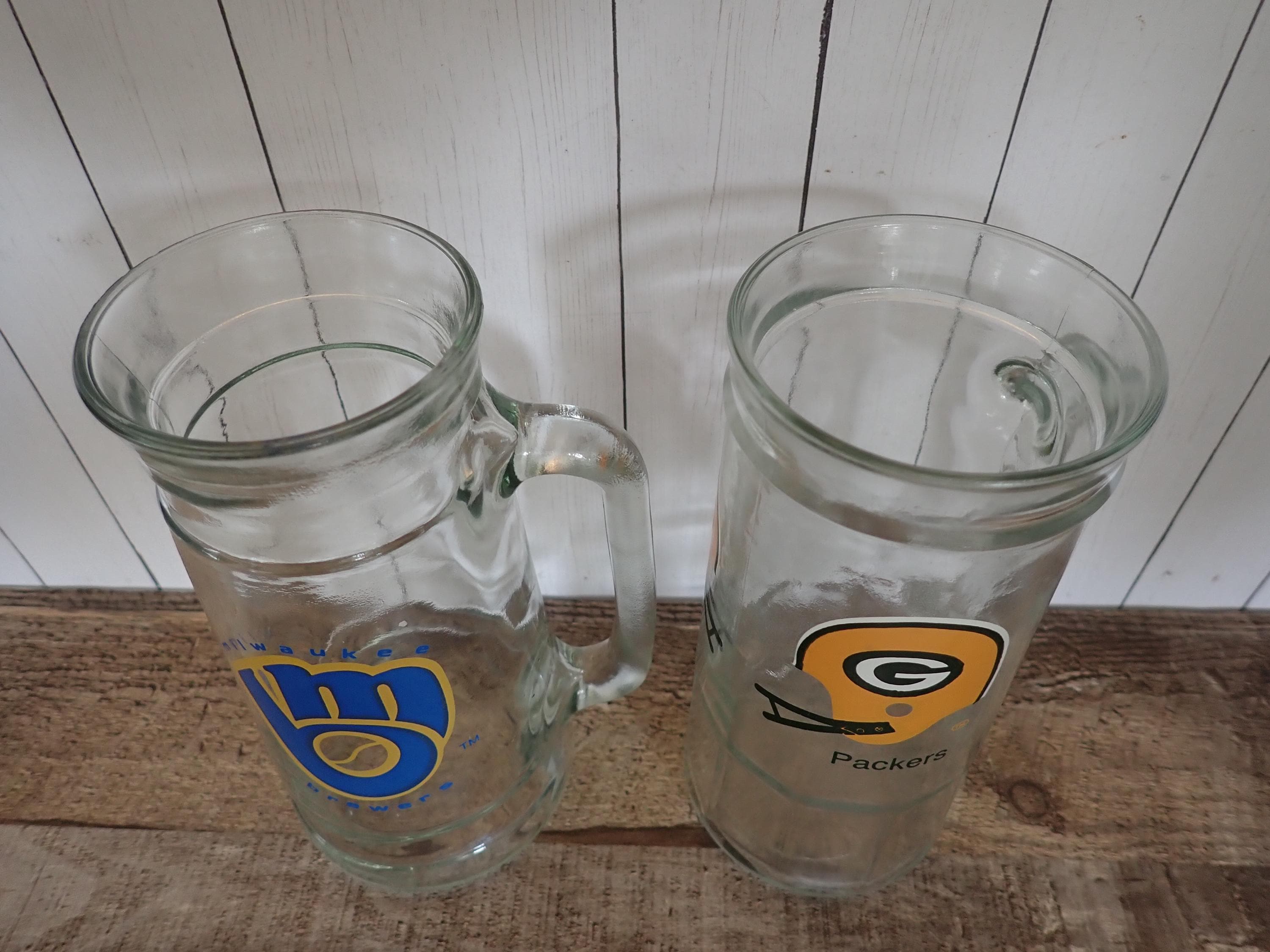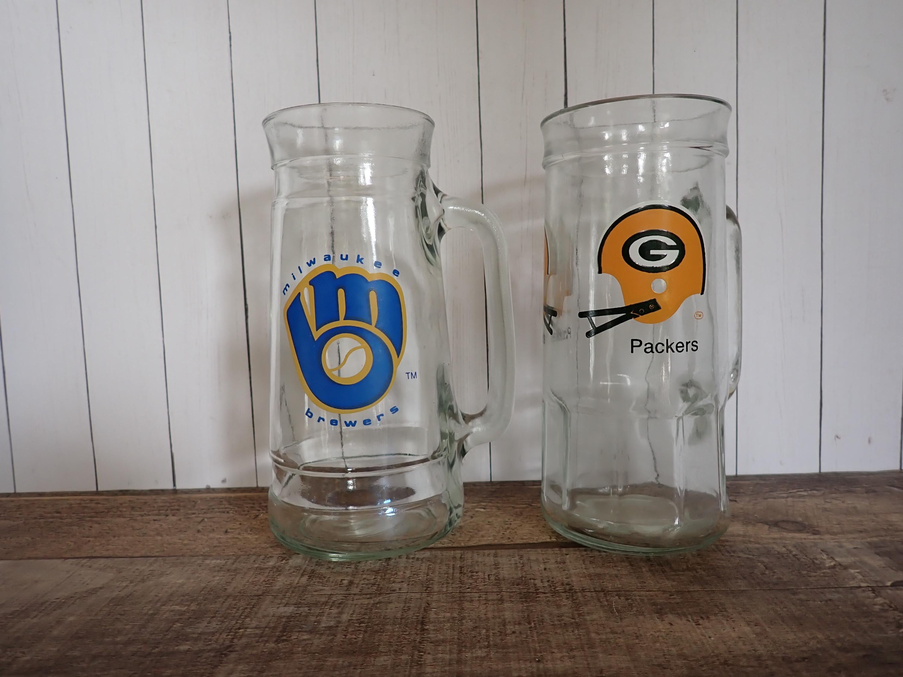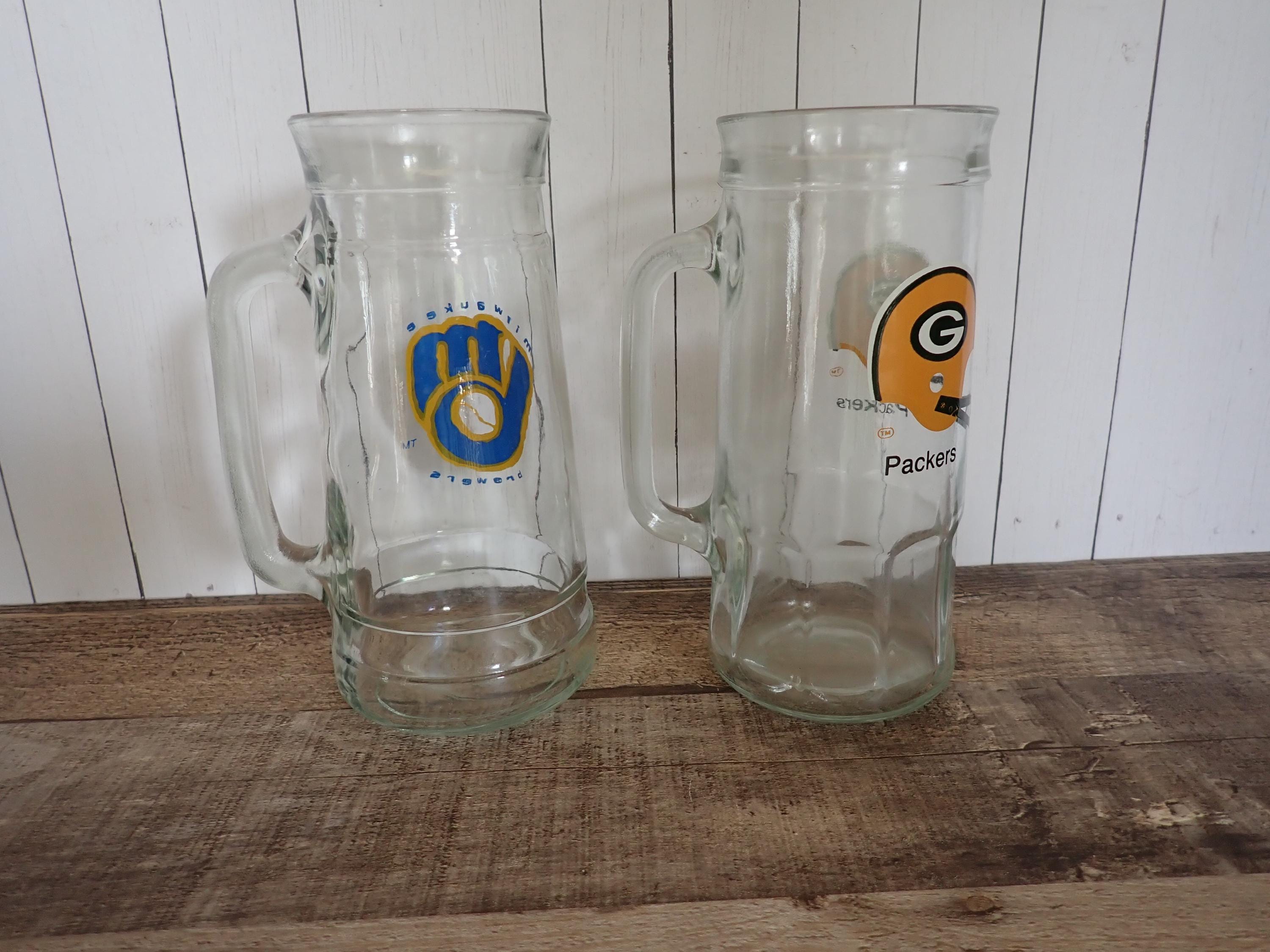 This set of 2 glass mugs or beer steins are clear glass, and includes one Milwaukee Brewers mug and one Green Bay Packers mug. They are quite large, measuring 7" tall and 2.75" in diameter at the top. They widen toward the bottom, and are 3.25" in diameter on the bottom. They have a solid glass handle on one side. Each mug can comfortably hold 18oz of liquid - it is filled to the rim with 20 oz. Both mugs are in very good condition with no chips or cracks, and the graphics are very bright and intact.