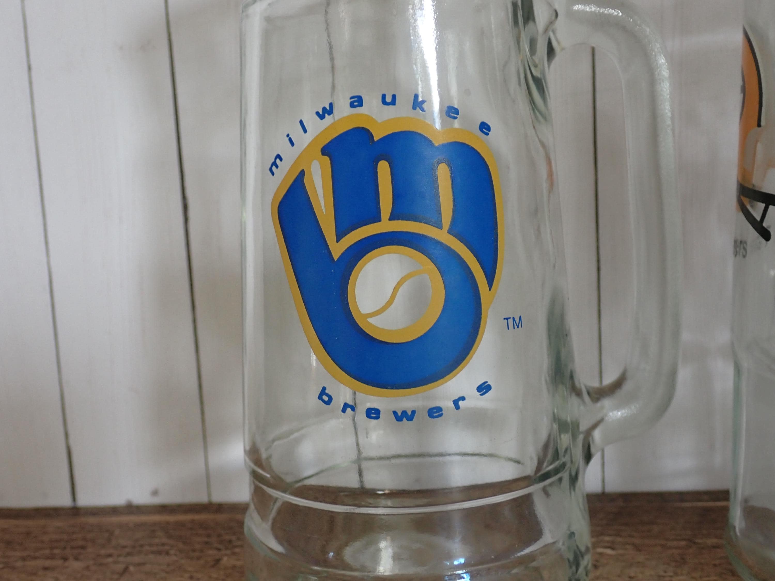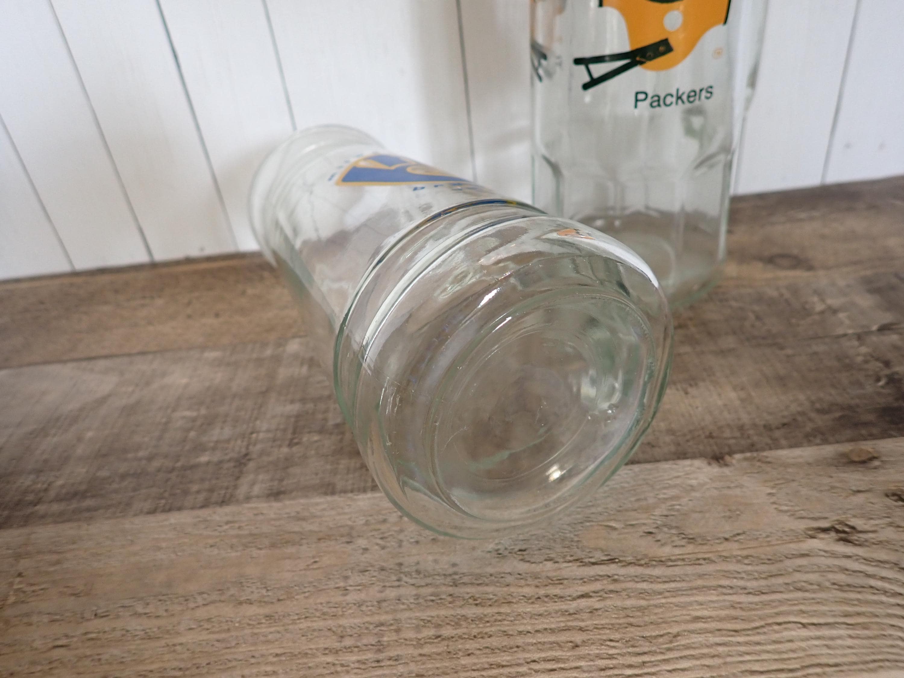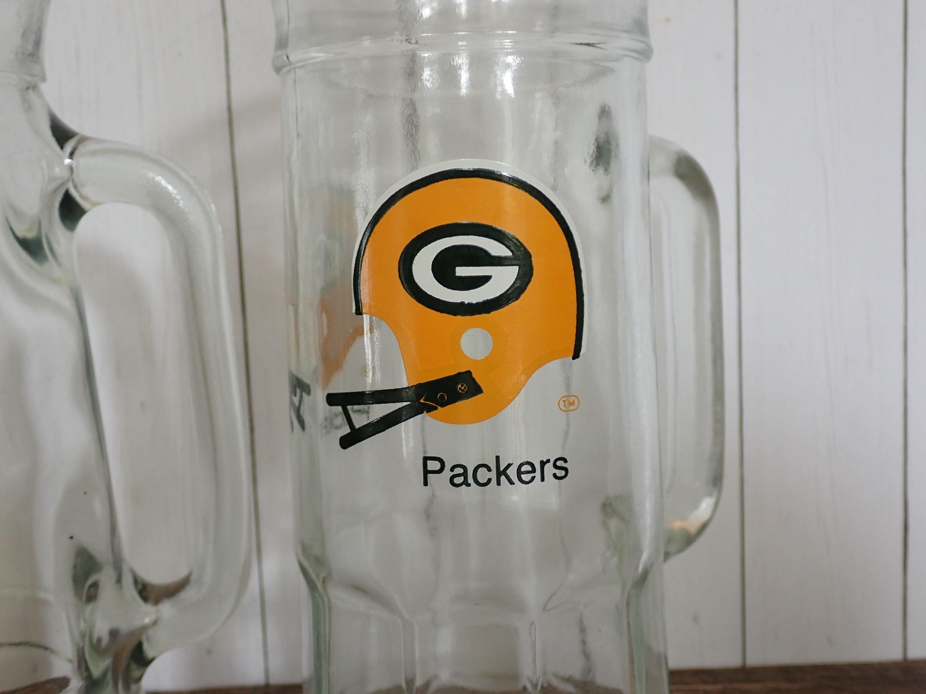 This set of 2 glass mugs or beer steins are clear glass, and includes one Milwaukee Brewers mug and one Green Bay Packers mug. They are quite large, measuring 7" tall and 2.75" in diameter at the top. They widen toward the bottom, and are 3.25" in diameter on the bottom. They have a solid glass handle on one side. Each mug can comfortably hold 18oz of liquid - it is filled to the rim with 20 oz. Both mugs are in very good condition with no chips or cracks, and the graphics are very bright and intact.
