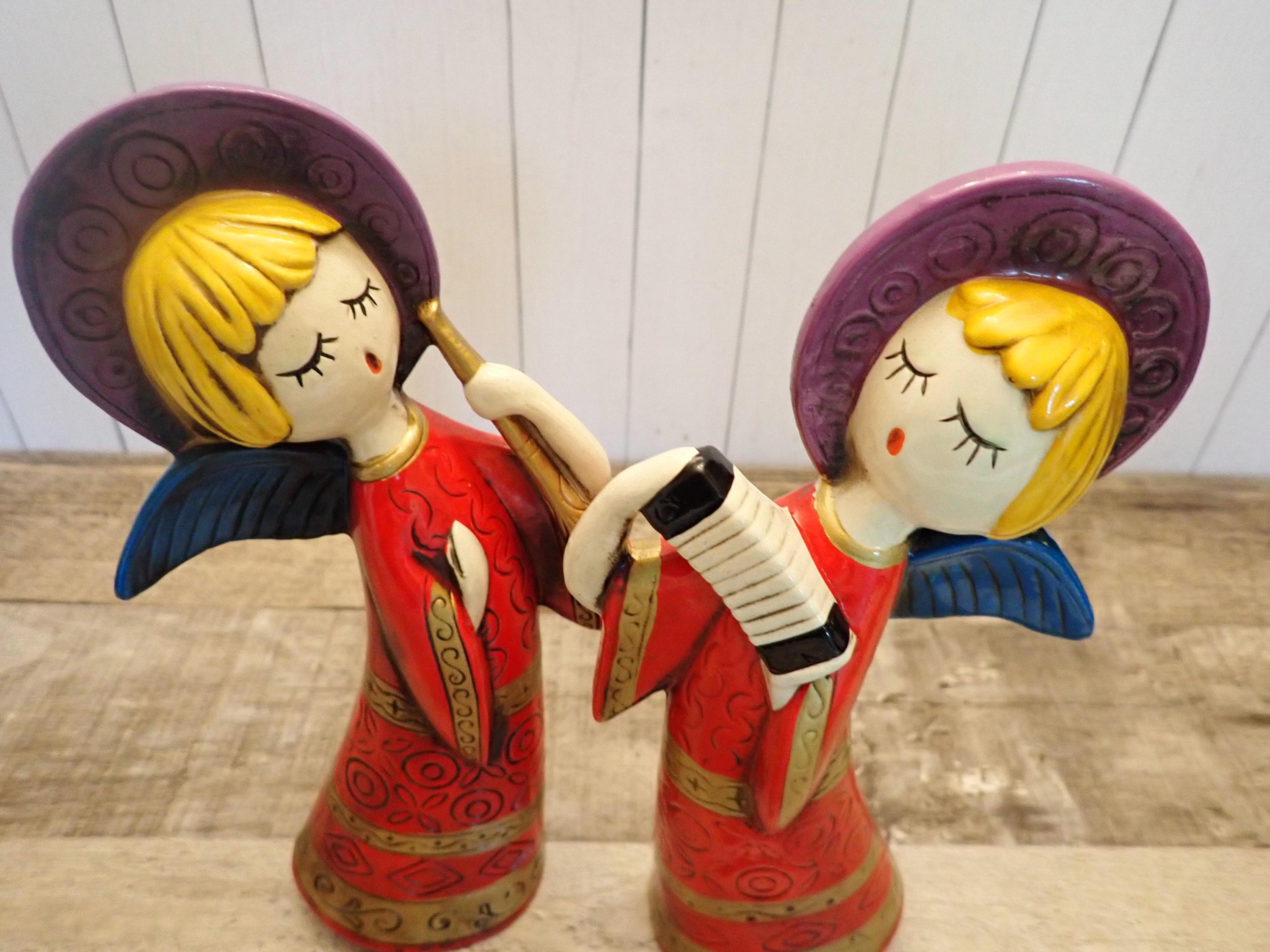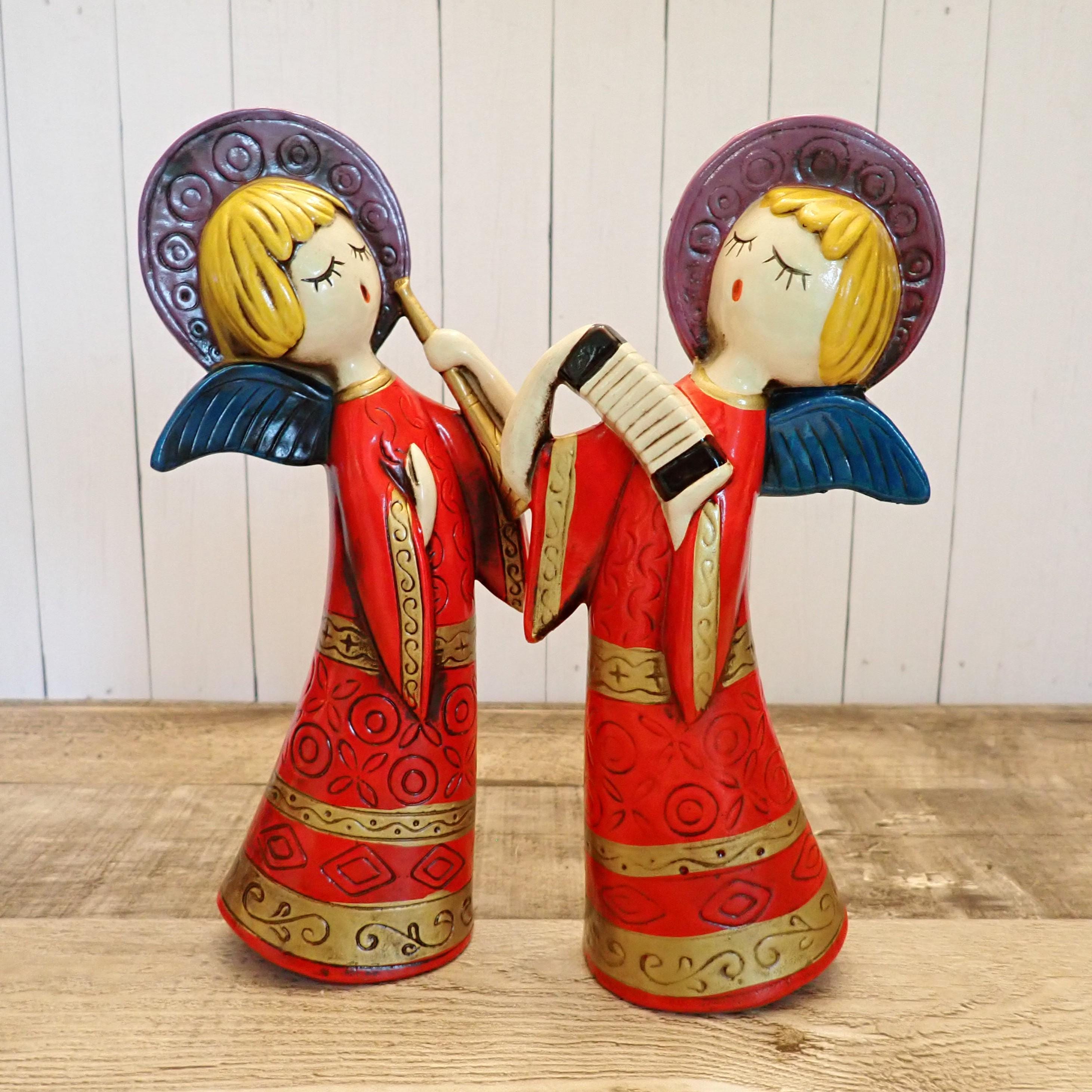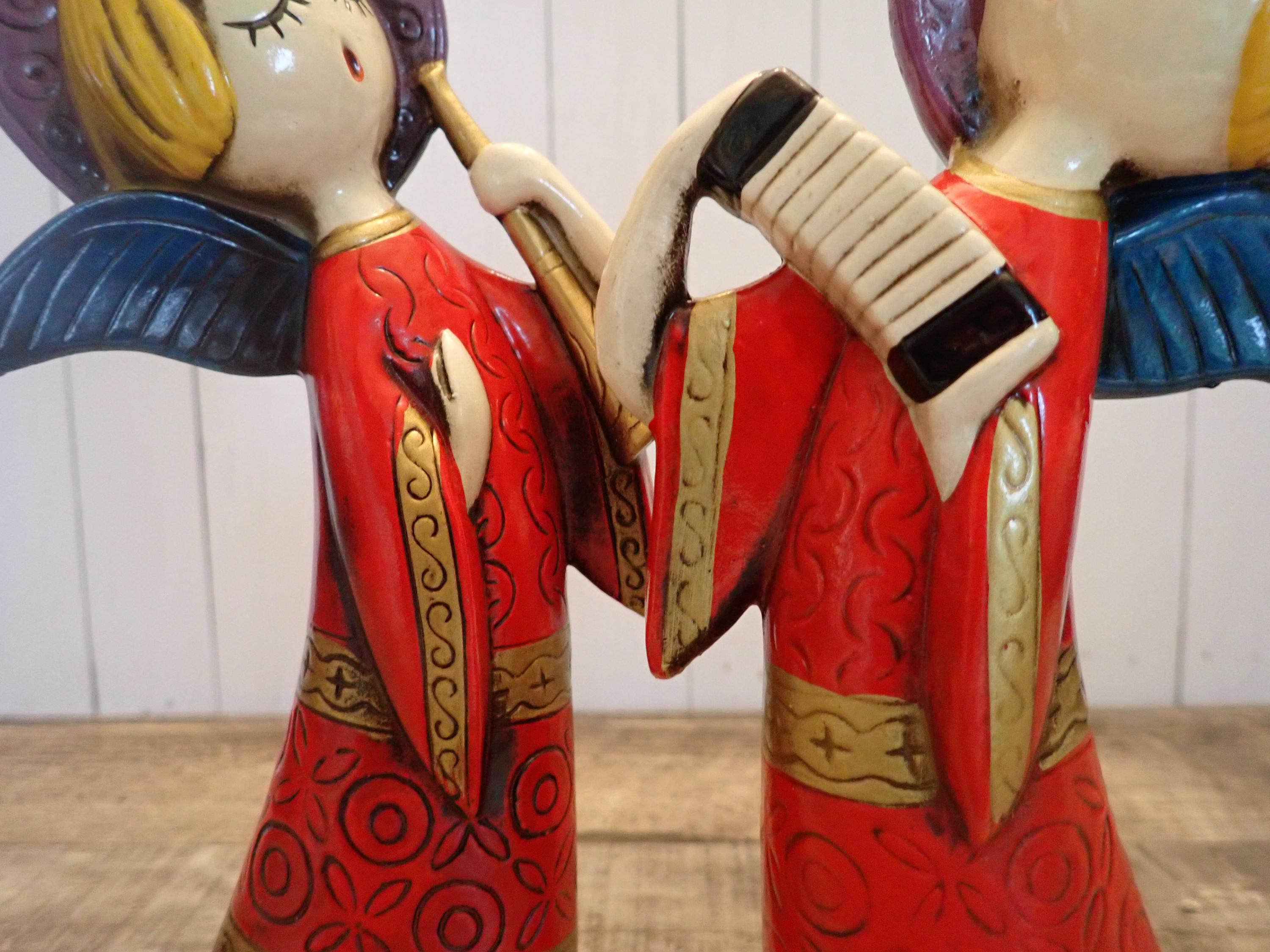 This set of angel figurines includes two coordinating angels holding instruments. They are 8.25" tall, 3" wide, and 2" deep. These modern angels wear a red gown, accented with gold details and a floral design. One angel holds a golden horn while the other has an accordion. The angels are in very good condition.