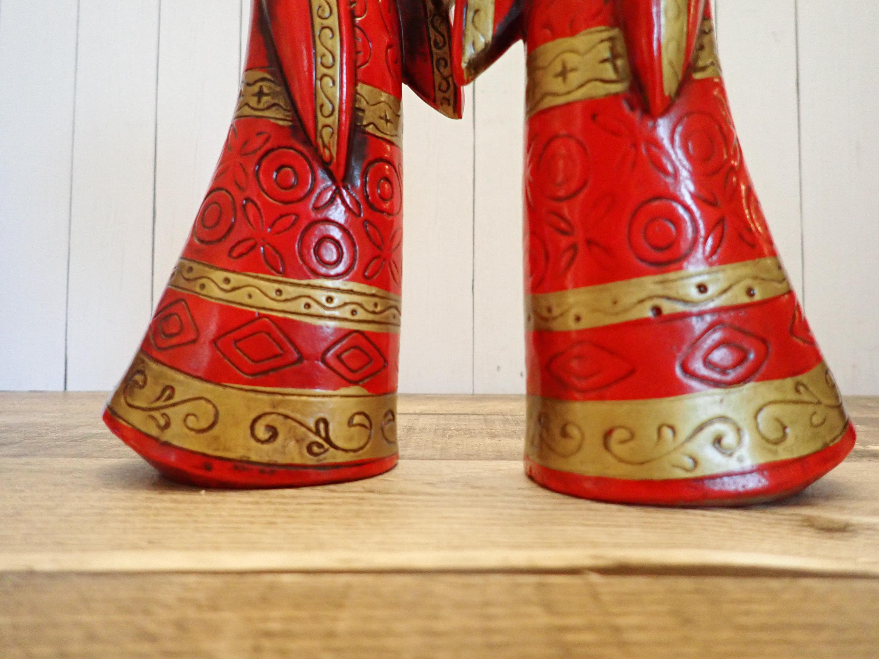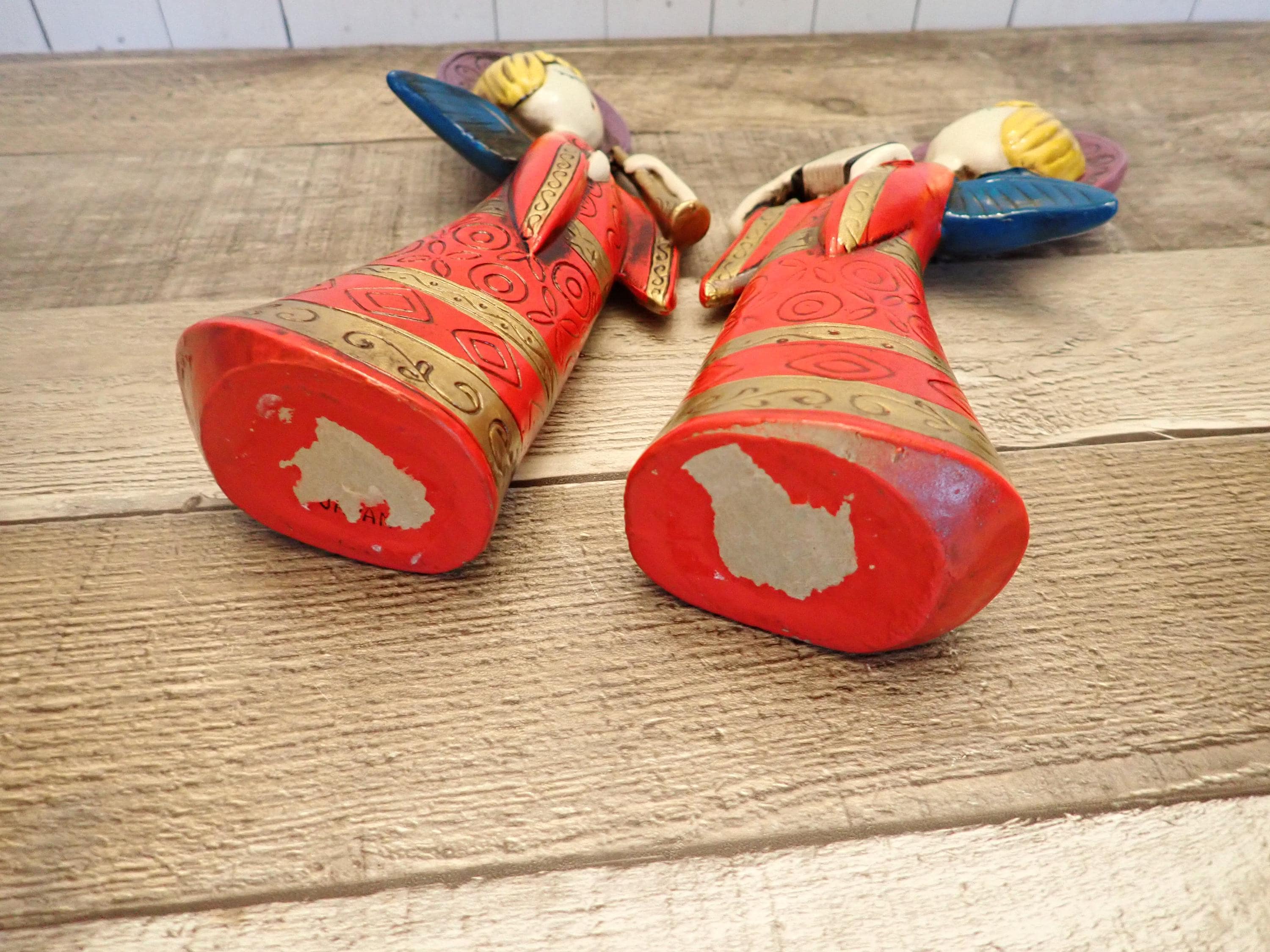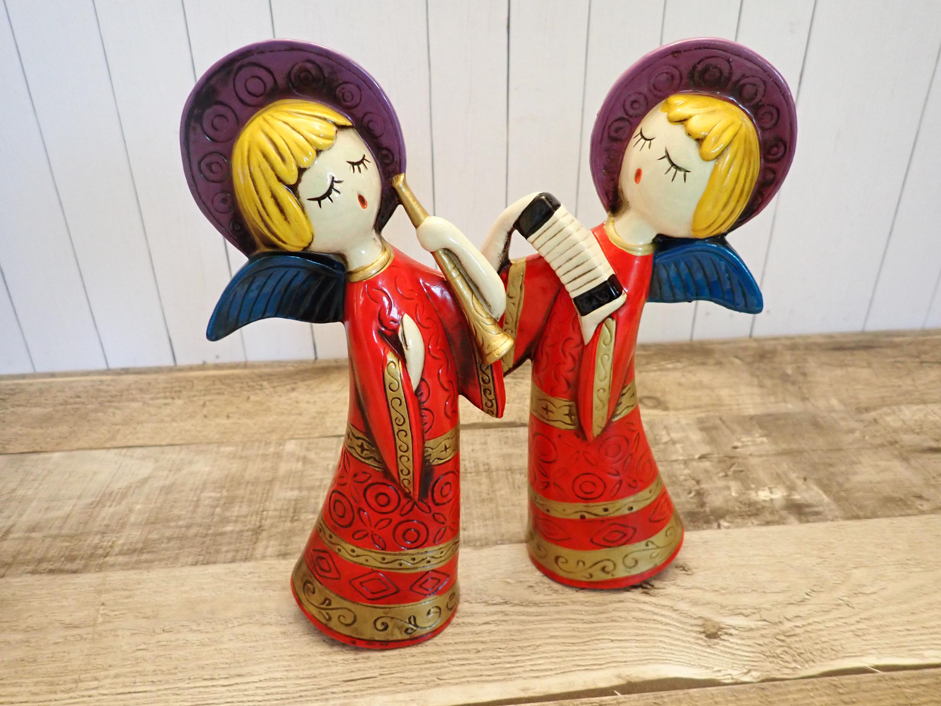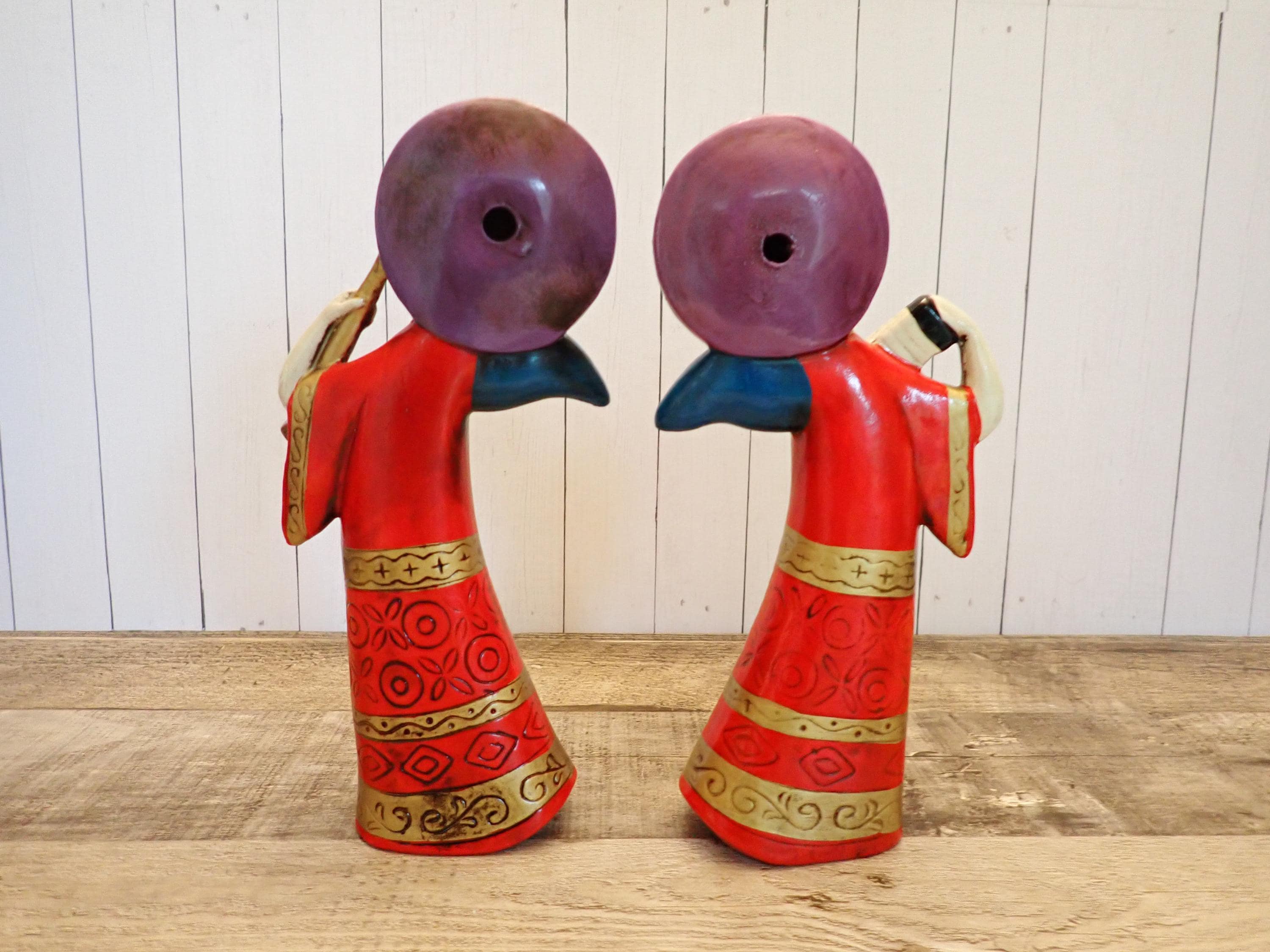 This set of angel figurines includes two coordinating angels holding instruments. They are 8.25" tall, 3" wide, and 2" deep. These modern angels wear a red gown, accented with gold details and a floral design. One angel holds a golden horn while the other has an accordion. The angels are in very good condition.