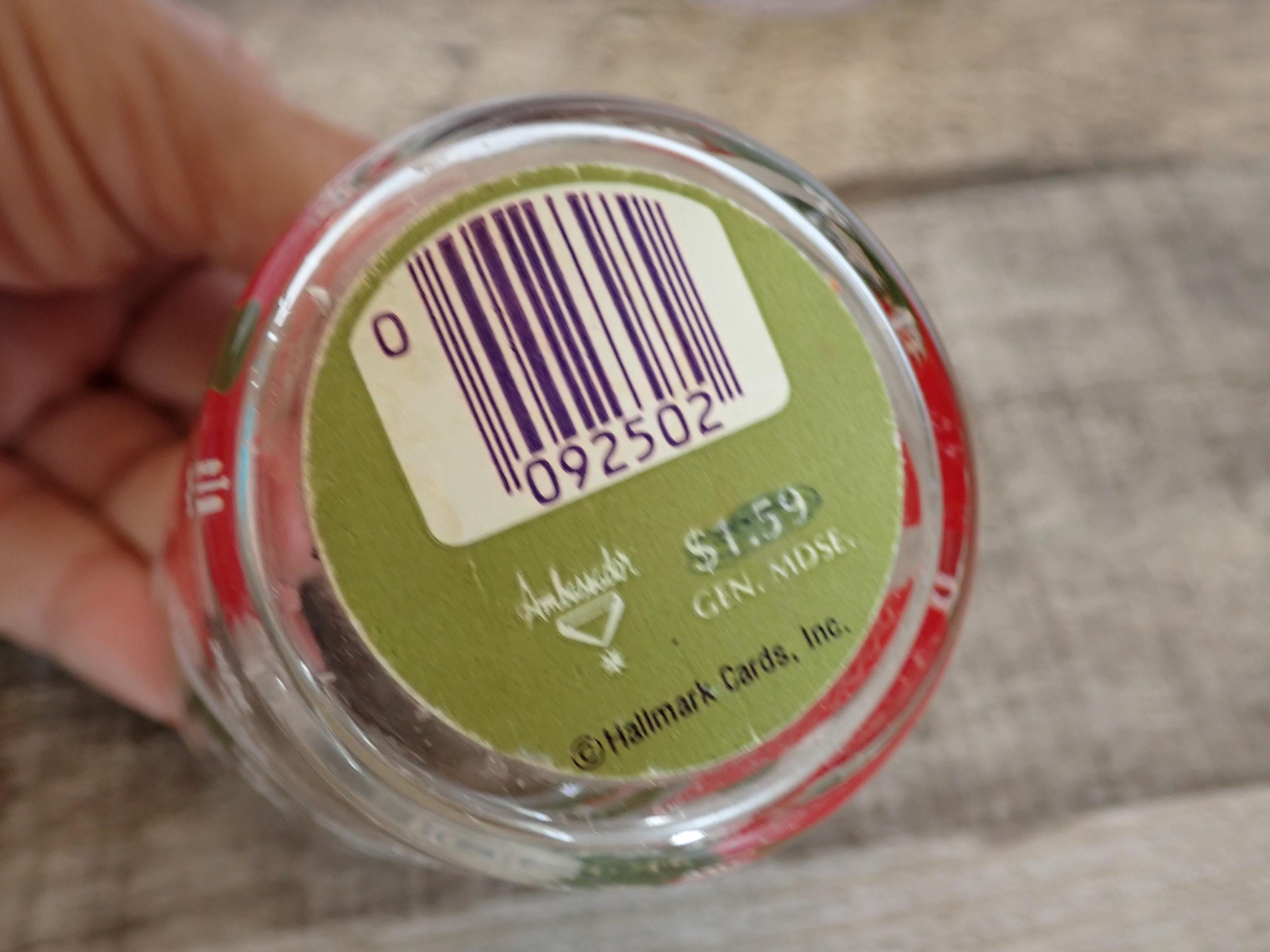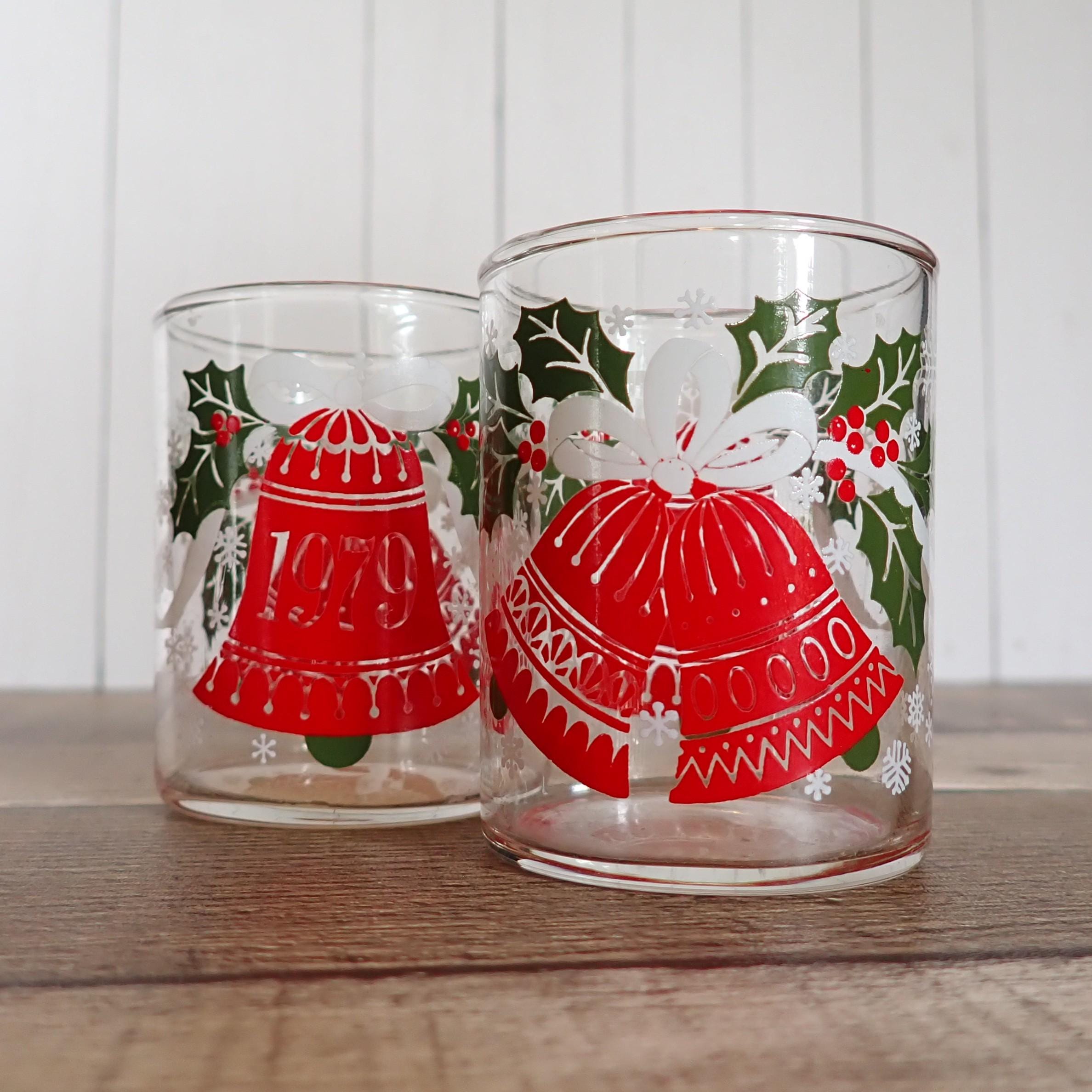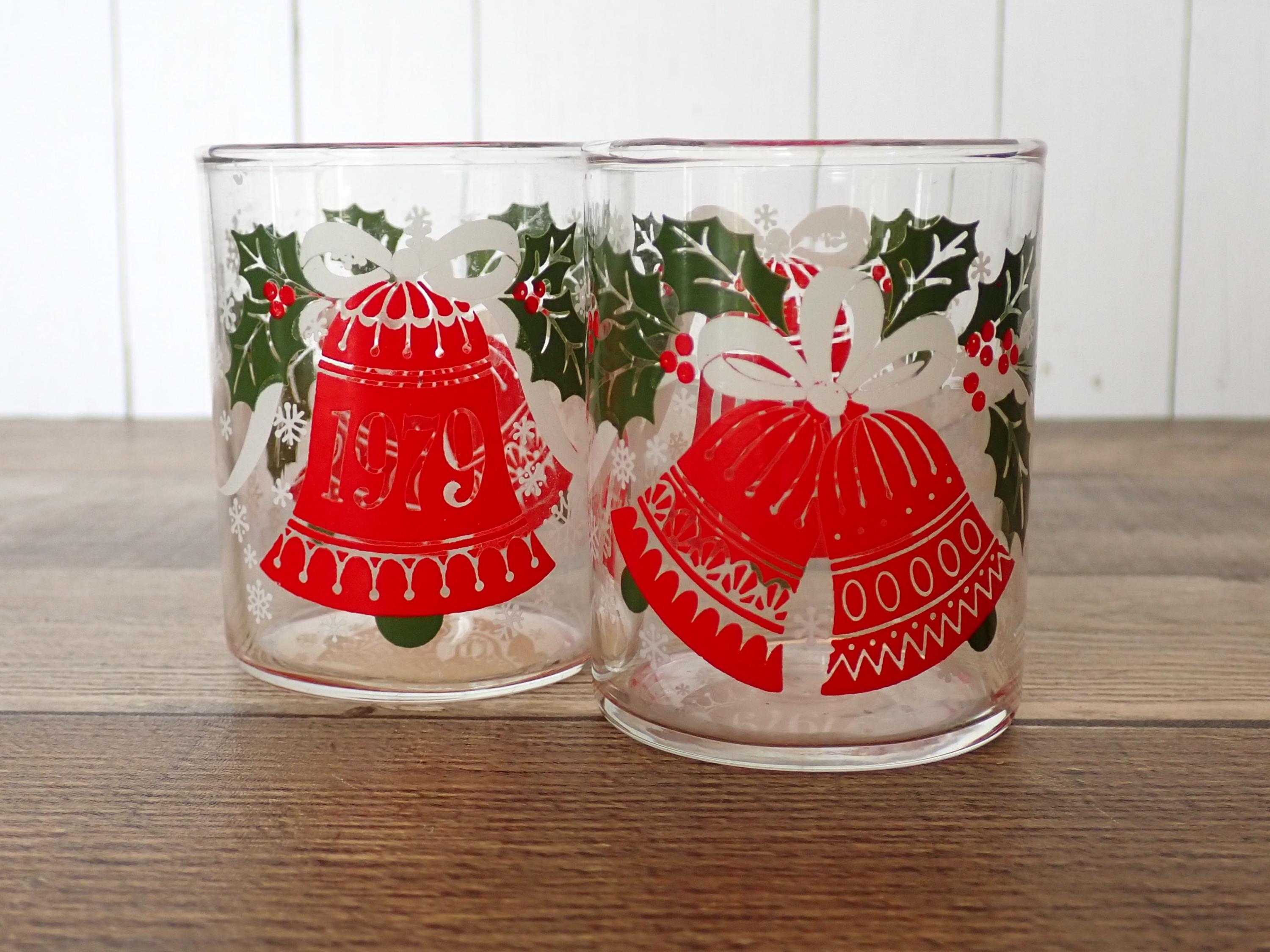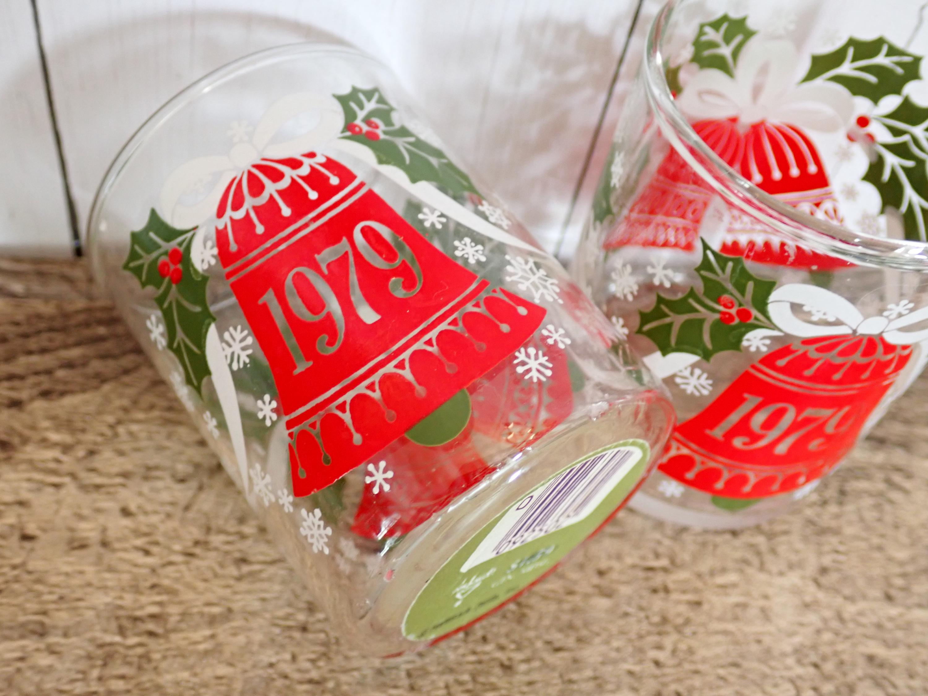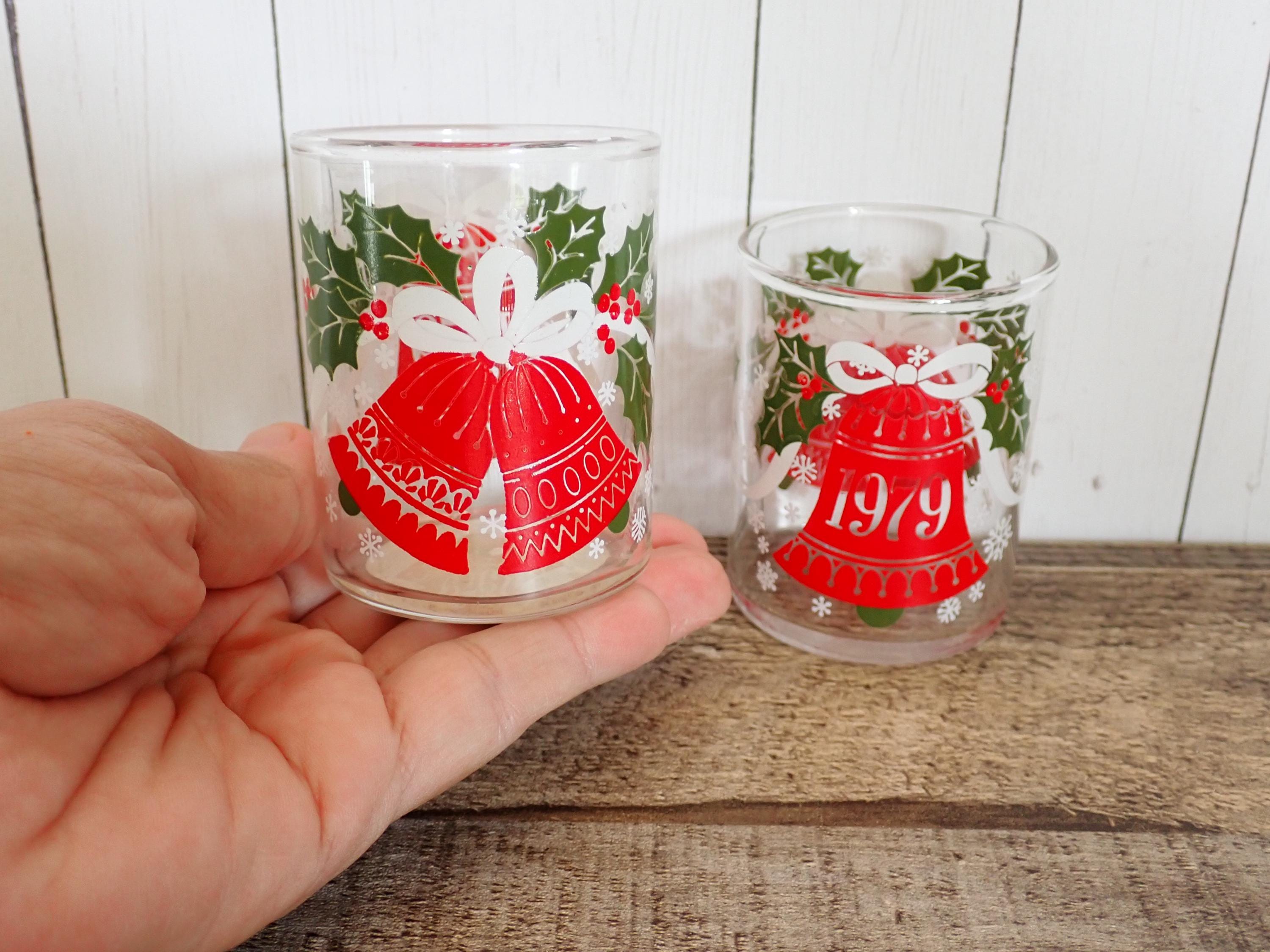 This pair of glass candle holders includes two matching Hallmark/Ambassador holders featuring a red bell and holly design. They are 2.75" tall and 2" in diameter, and can hold a standard tea light or a small votive candle. The holders are a clear glass with a red bell, white ribbon, and green holly design. One side of the holder is marked 1979 on the bell One of the holders has an original Hallmark/Ambassador label. Both candle holders are in very good condition with no chips or cracks, and the graphics are bright and clear. These are very hard to find candle holders.