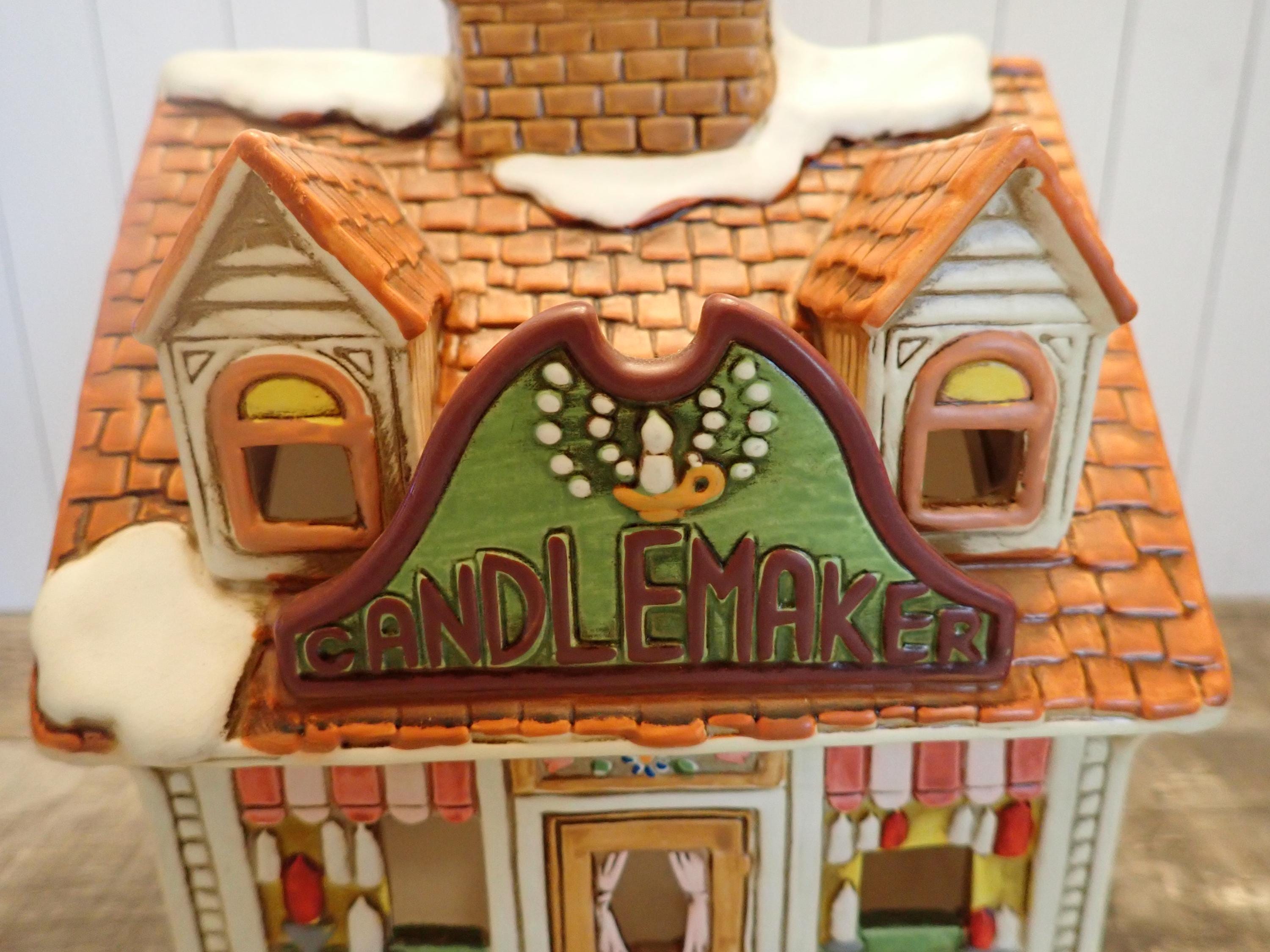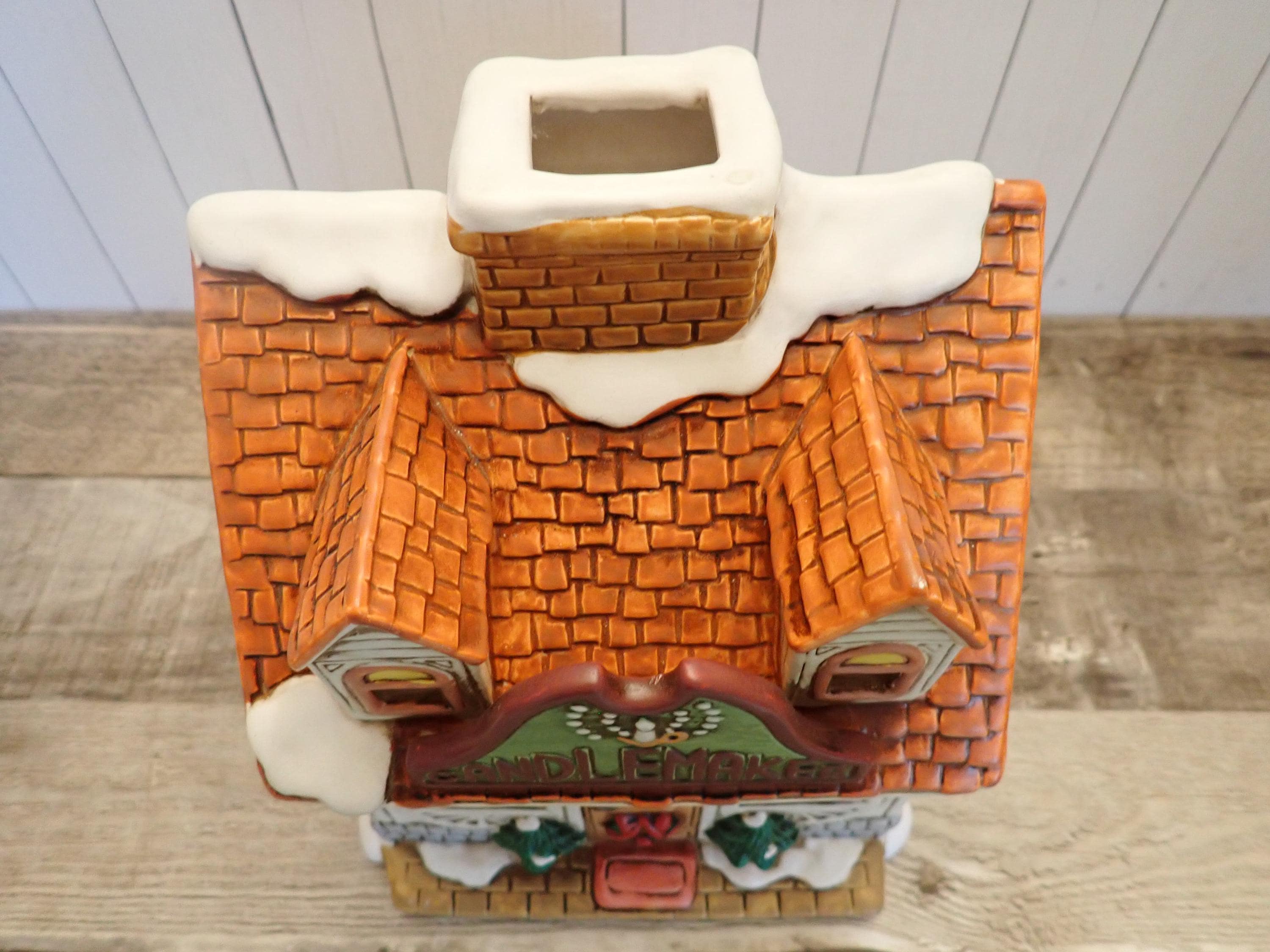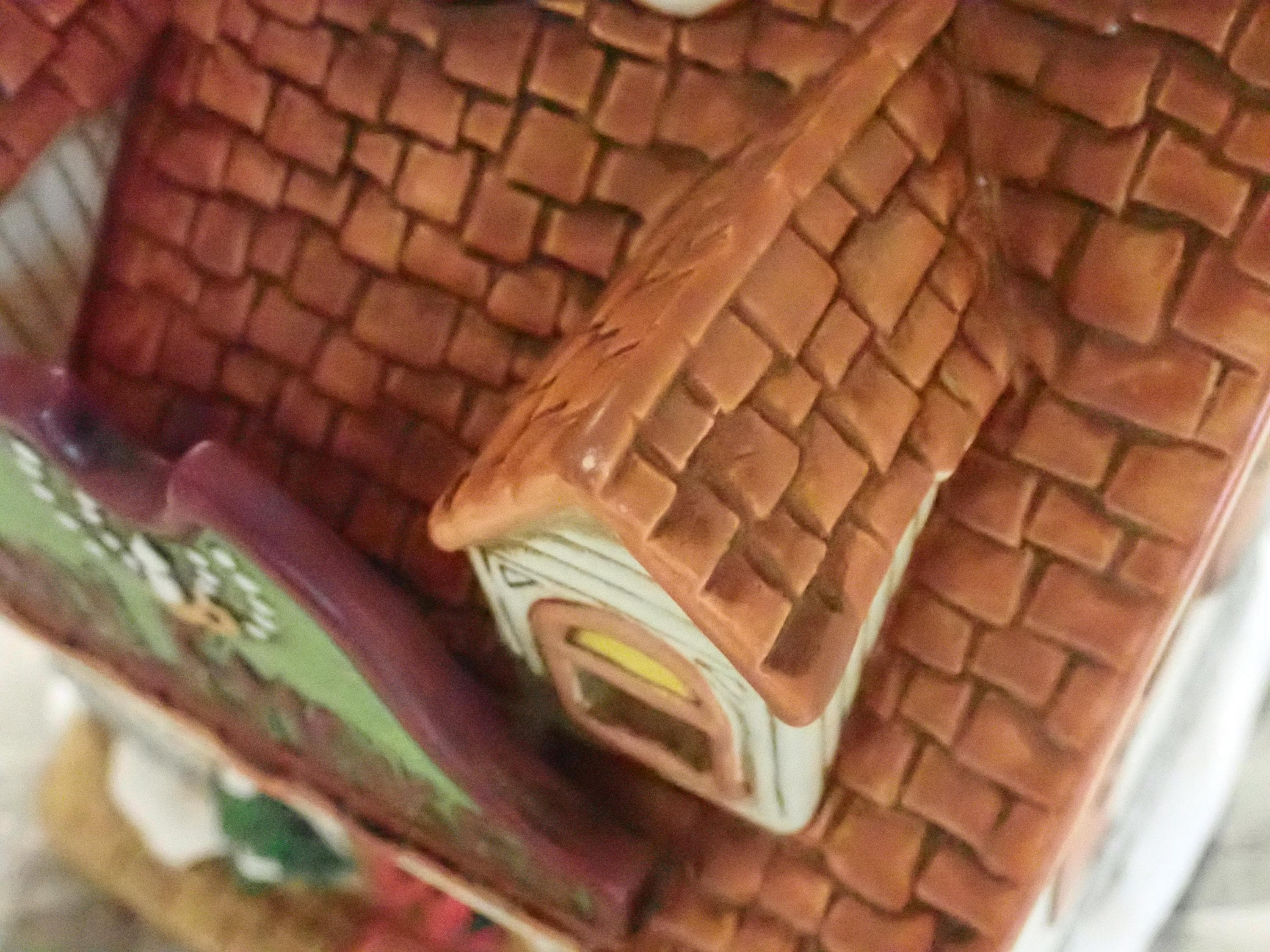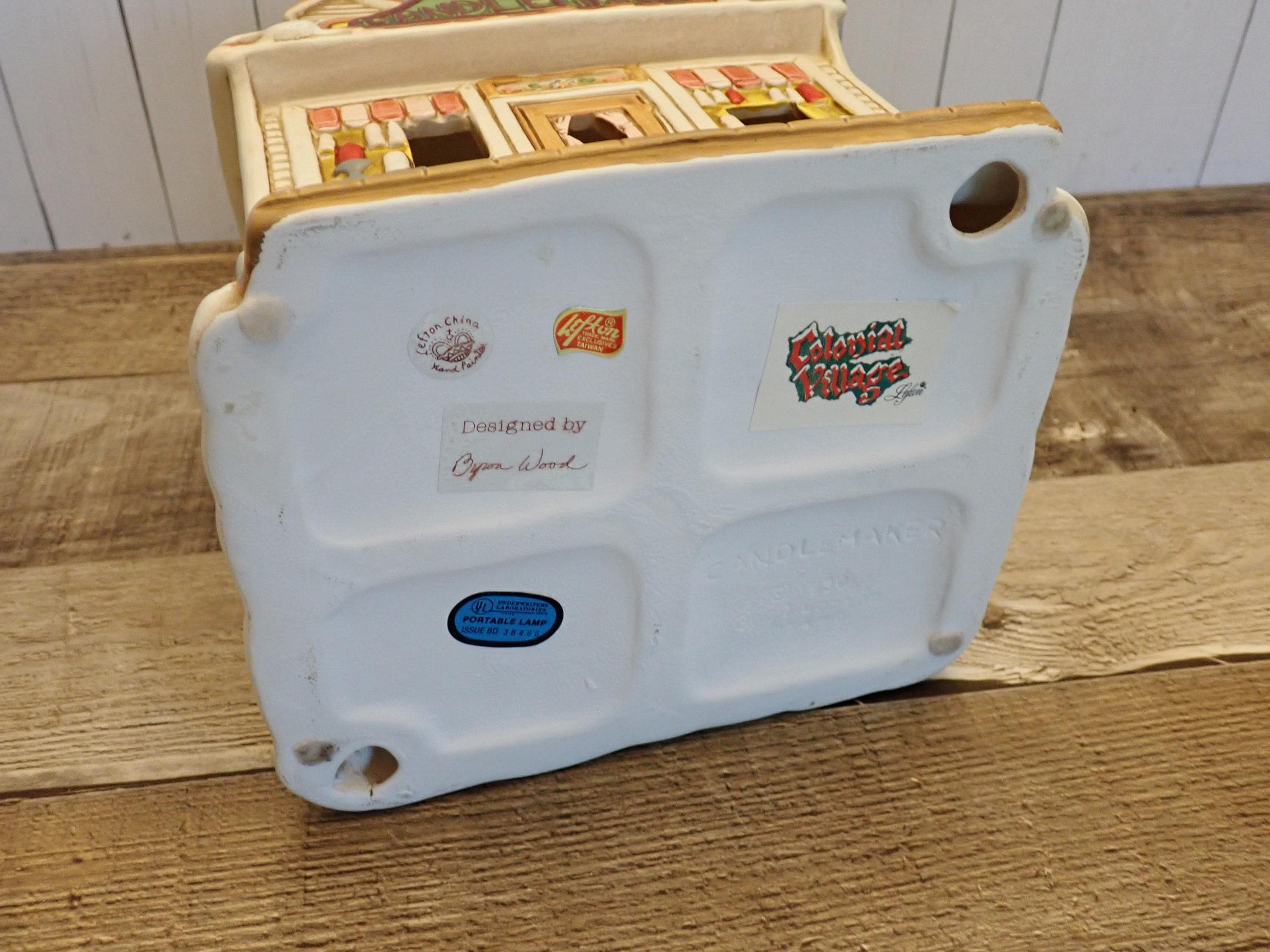 This ceramic village building is from the Lefton Colonial Village collection and was made in 1990. This piece is Watts Candle Shop and is 8.25" tall, 7" wide, and 6" deep. It is a white building with red roof. The bottom of the building is marked 1990 GEO. A. LEFTON / 07479 on the bottom and has an original Lefton label. The building is in very nice condition however there is one small nick in the paint on one point on the roof - this is shown in detail in the last photo. There is no box or light for this piece. Great addition to your Colonial Village!