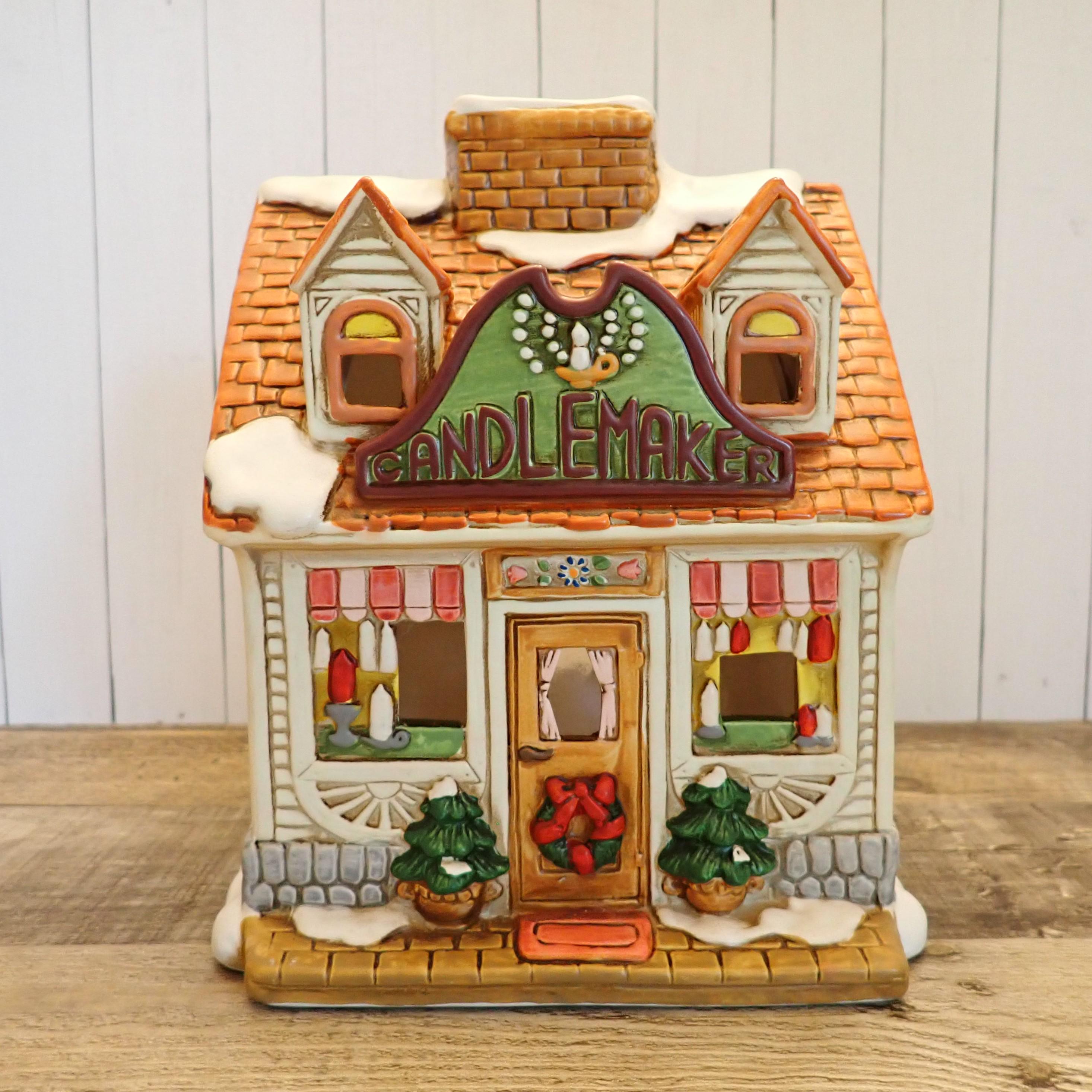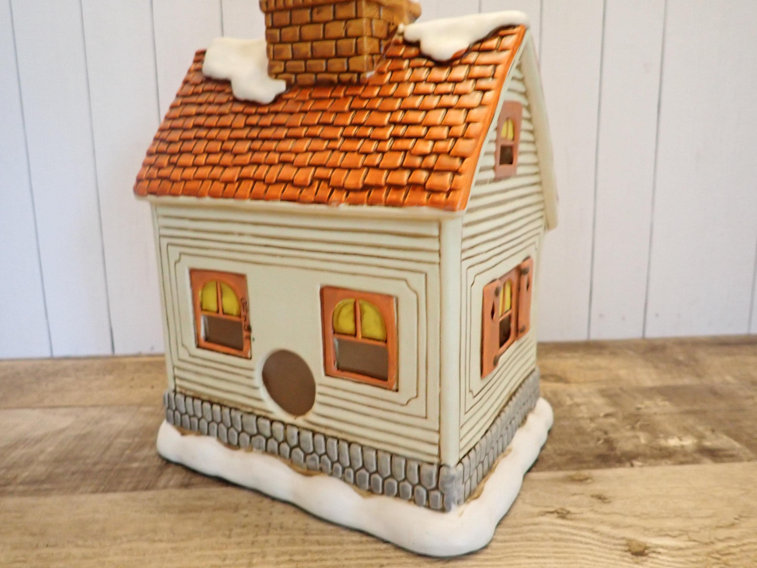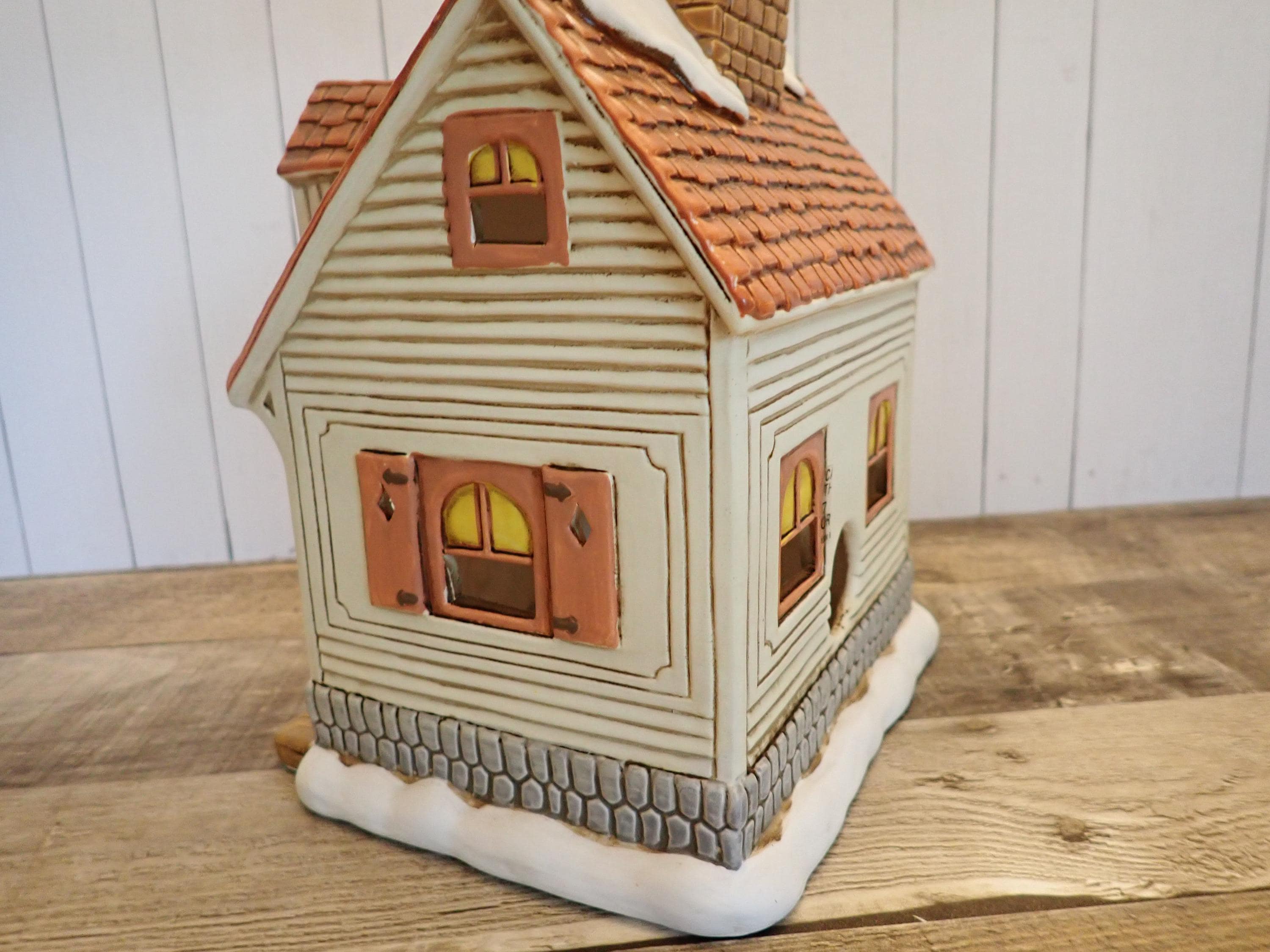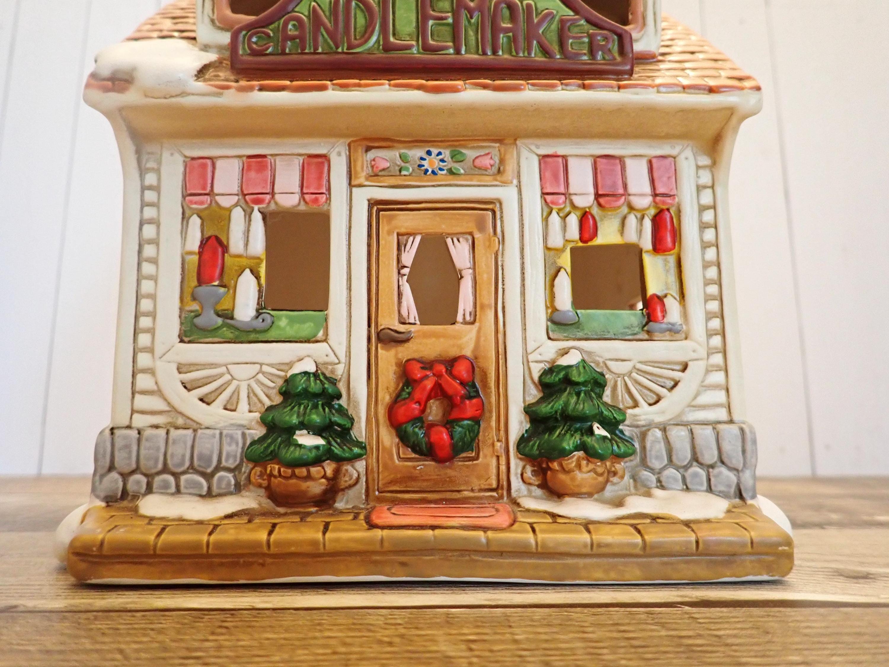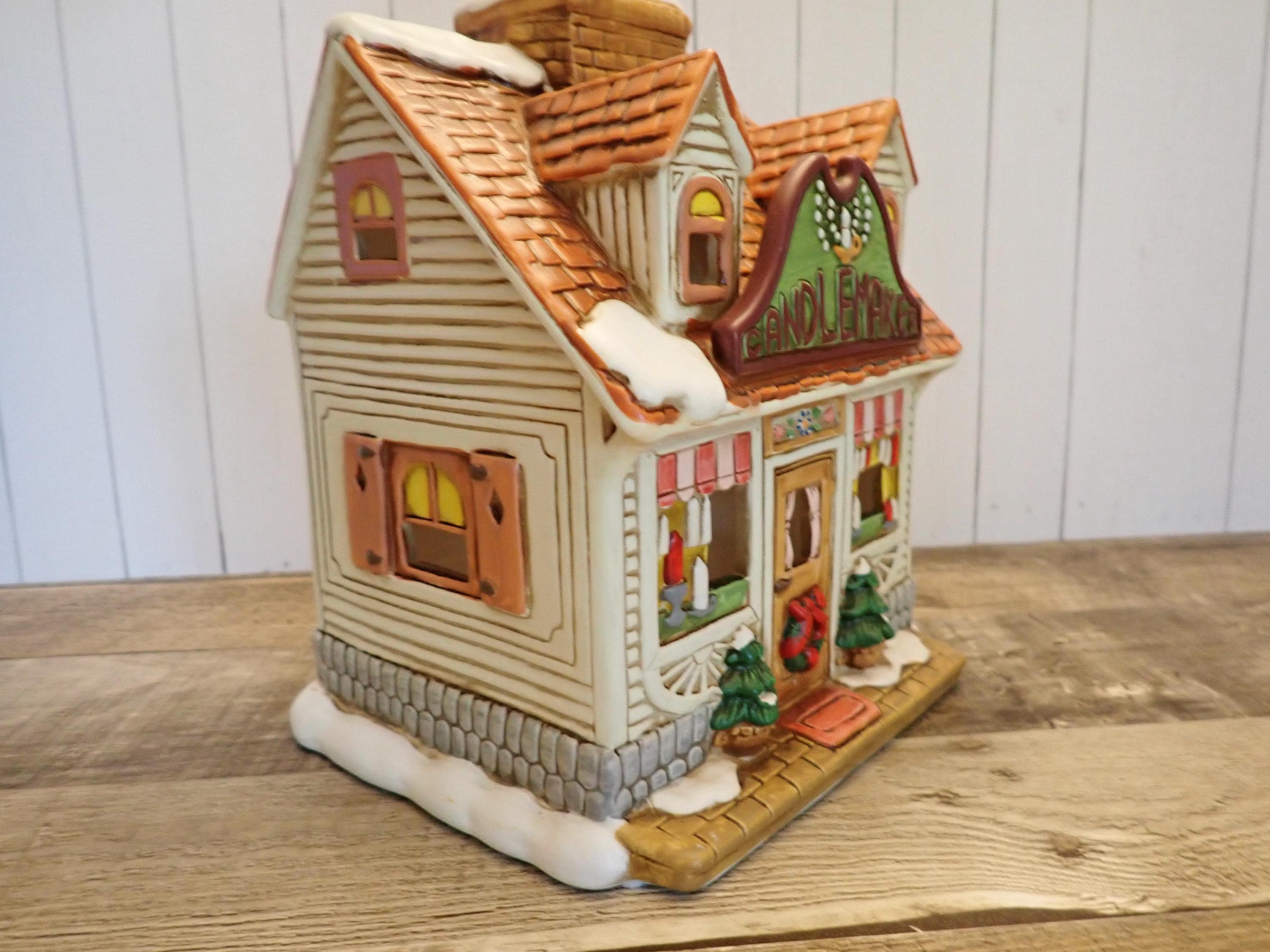 This ceramic village building is from the Lefton Colonial Village collection and was made in 1990. This piece is Watts Candle Shop and is 8.25" tall, 7" wide, and 6" deep. It is a white building with red roof. The bottom of the building is marked 1990 GEO. A. LEFTON / 07479 on the bottom and has an original Lefton label. The building is in very nice condition however there is one small nick in the paint on one point on the roof - this is shown in detail in the last photo. There is no box or light for this piece. Great addition to your Colonial Village!