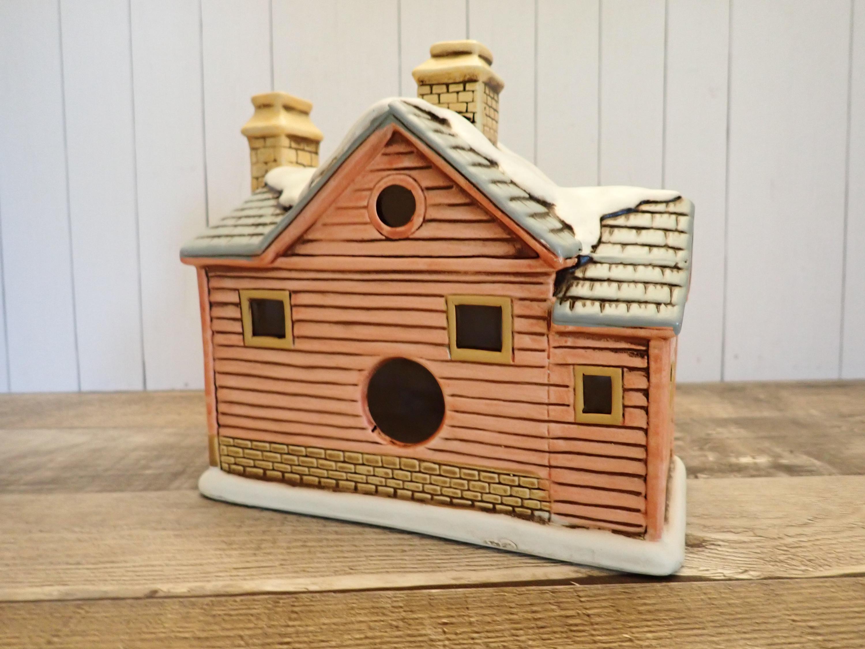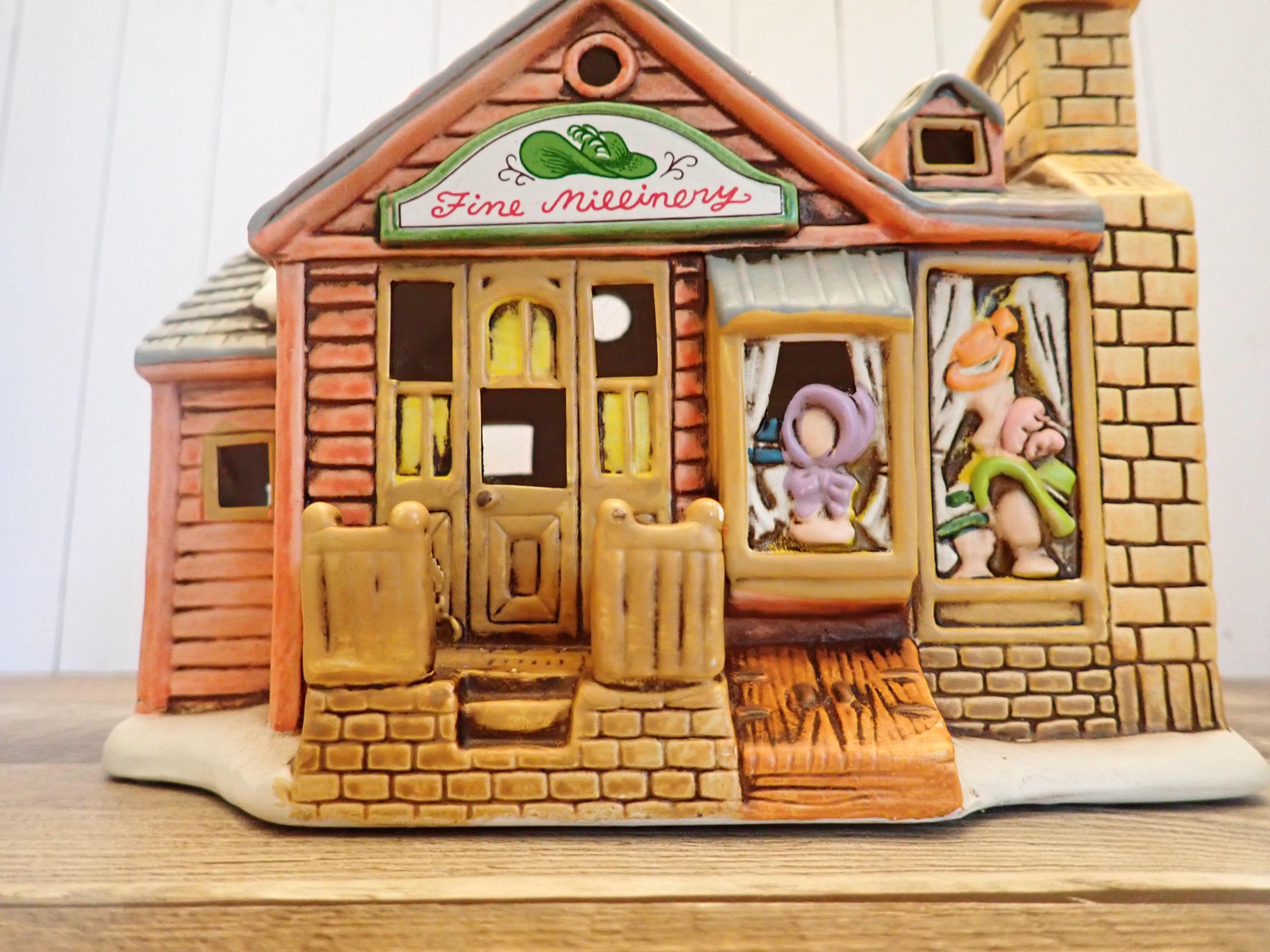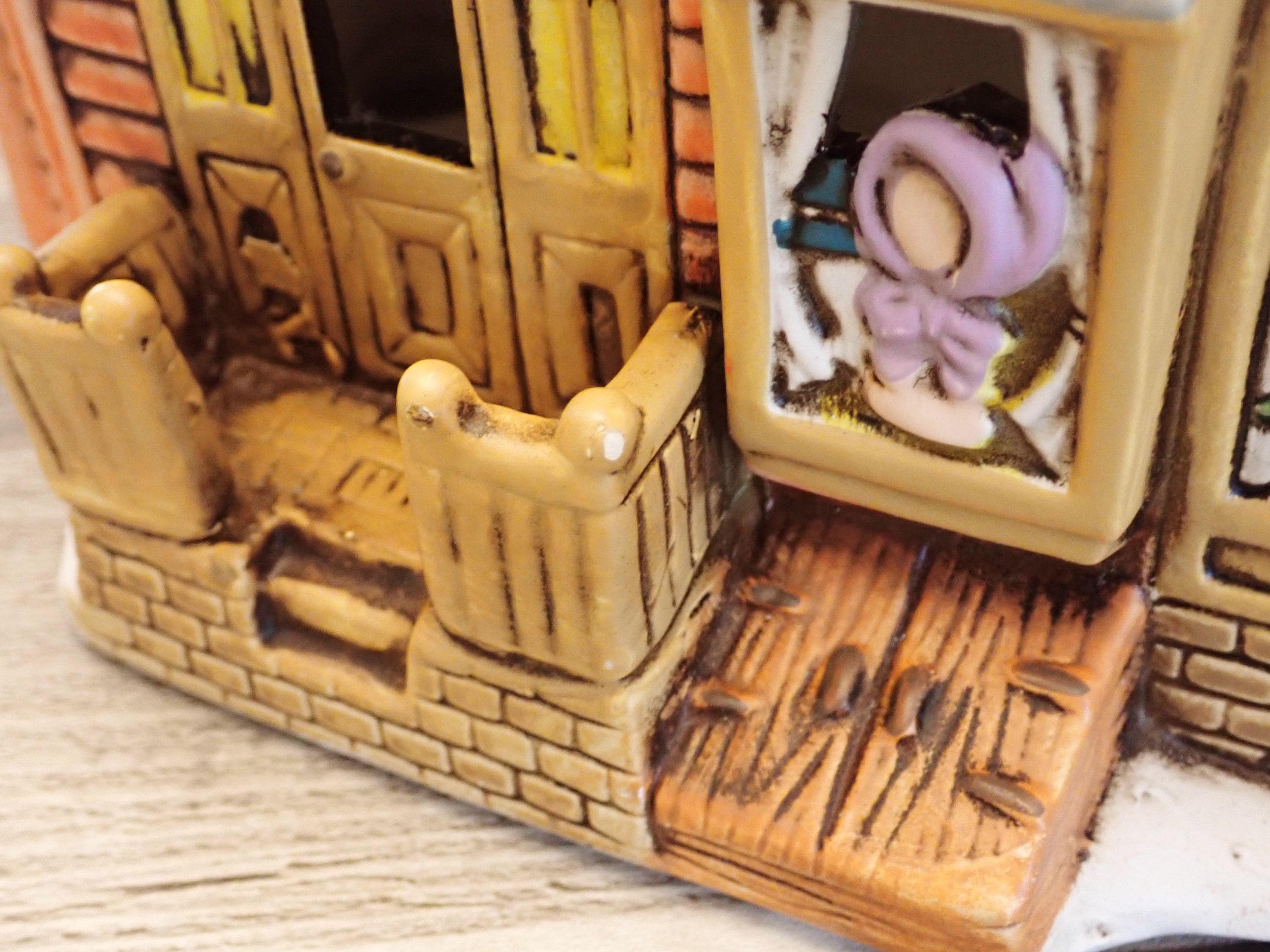 This ceramic village building is from the Lefton Colonial Village collection and was made in 1988. This piece is Capper's Fine Millinery and is 6.5" tall, 7.5" wide, and 5.5" deep. It is a pink building with gray and tan accents on the windows and fireplace. The bottom of the building is marked 1988 GEO. A. LEFTON / 06904 on the bottom and has an original Lefton label. The building is in very nice condition, however there is one small nick on the front porch of the building as shown in detail in the last photo. There is no box or light for this piece. Great addition to your Colonial Village!