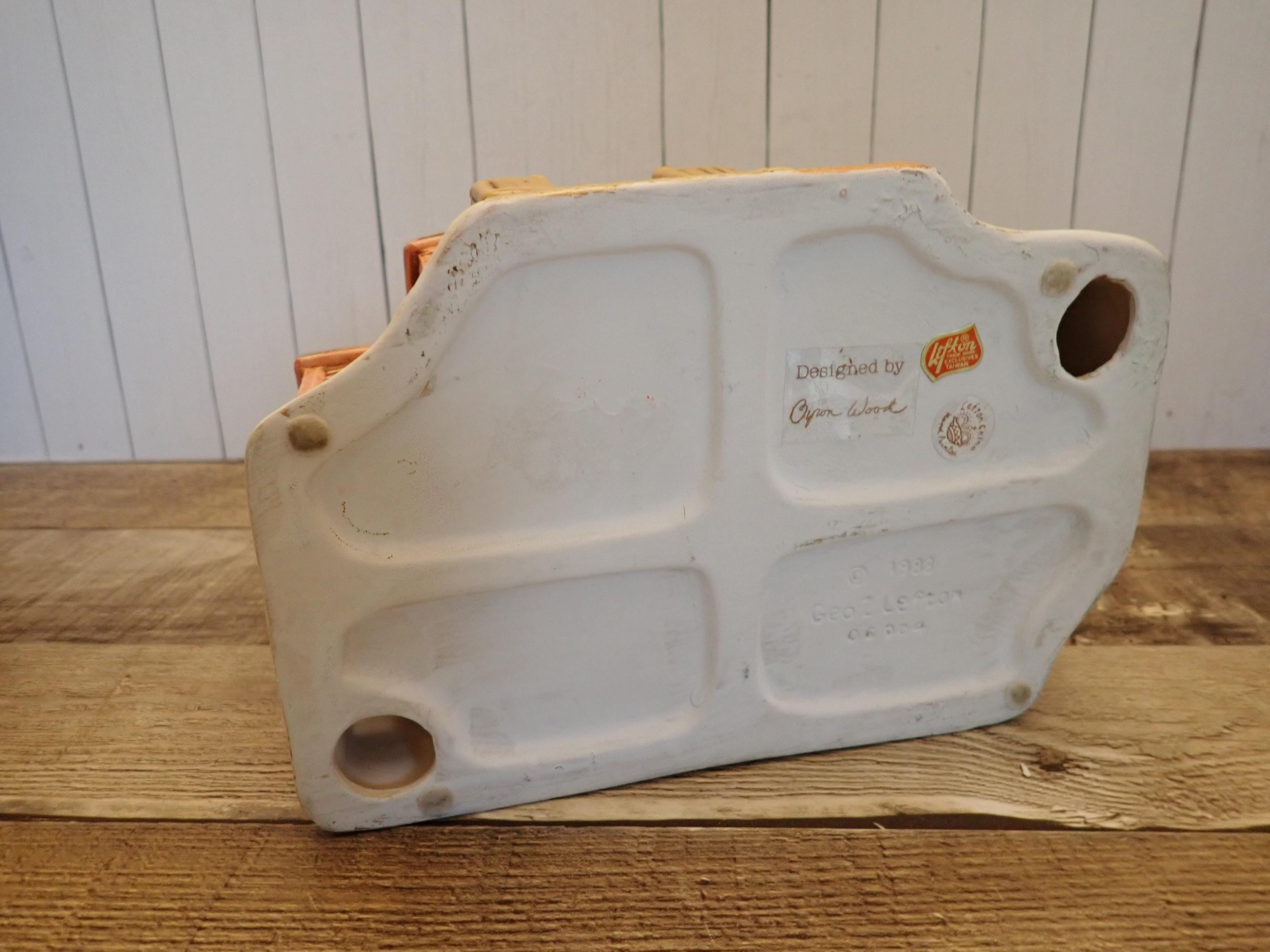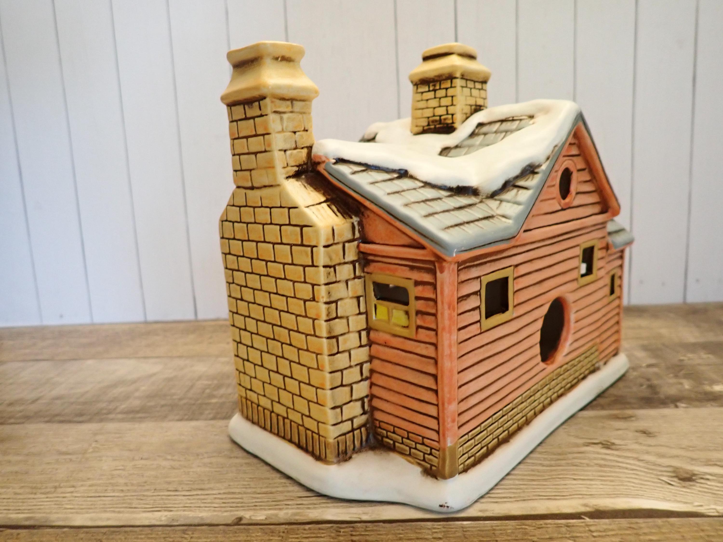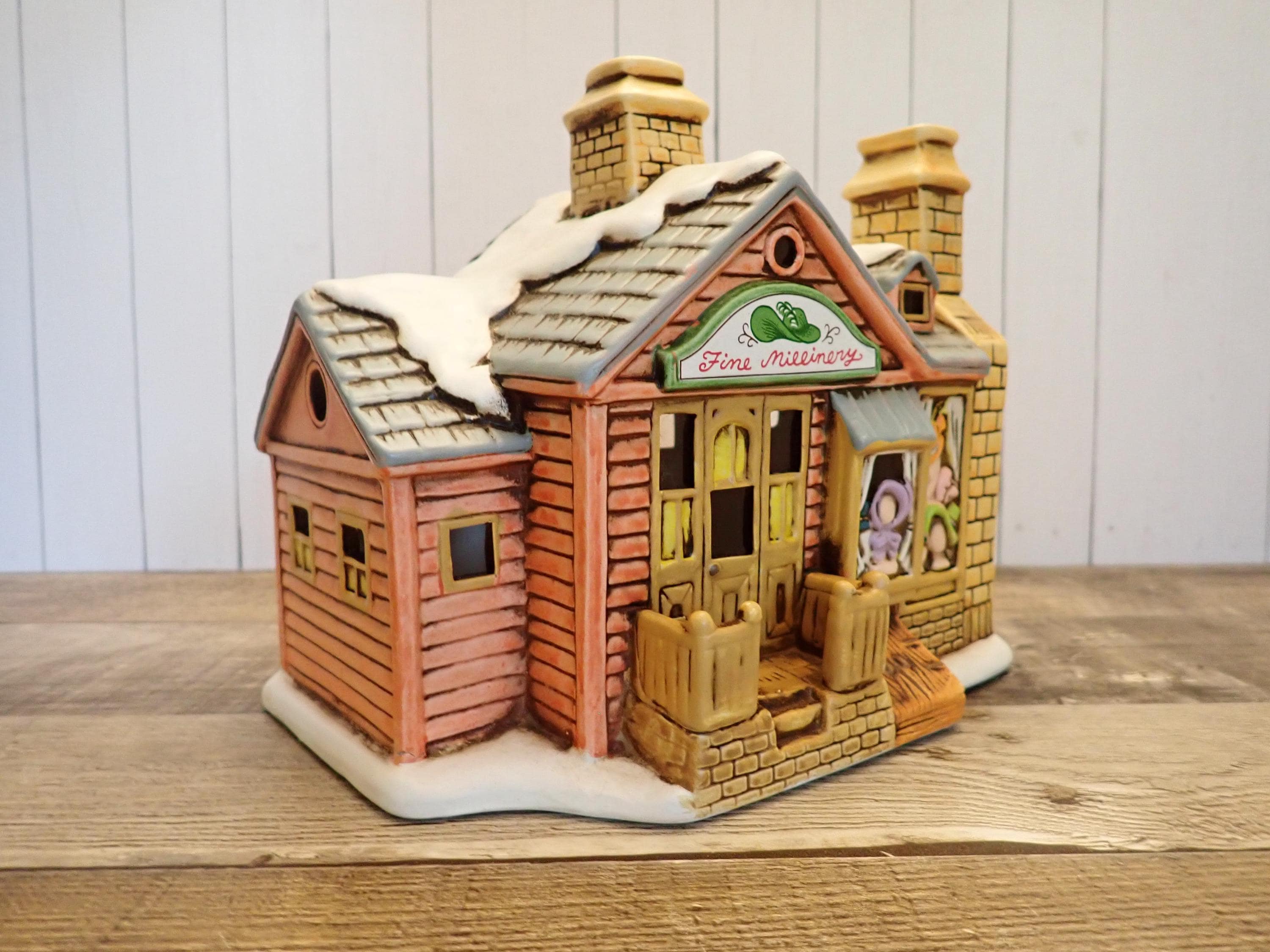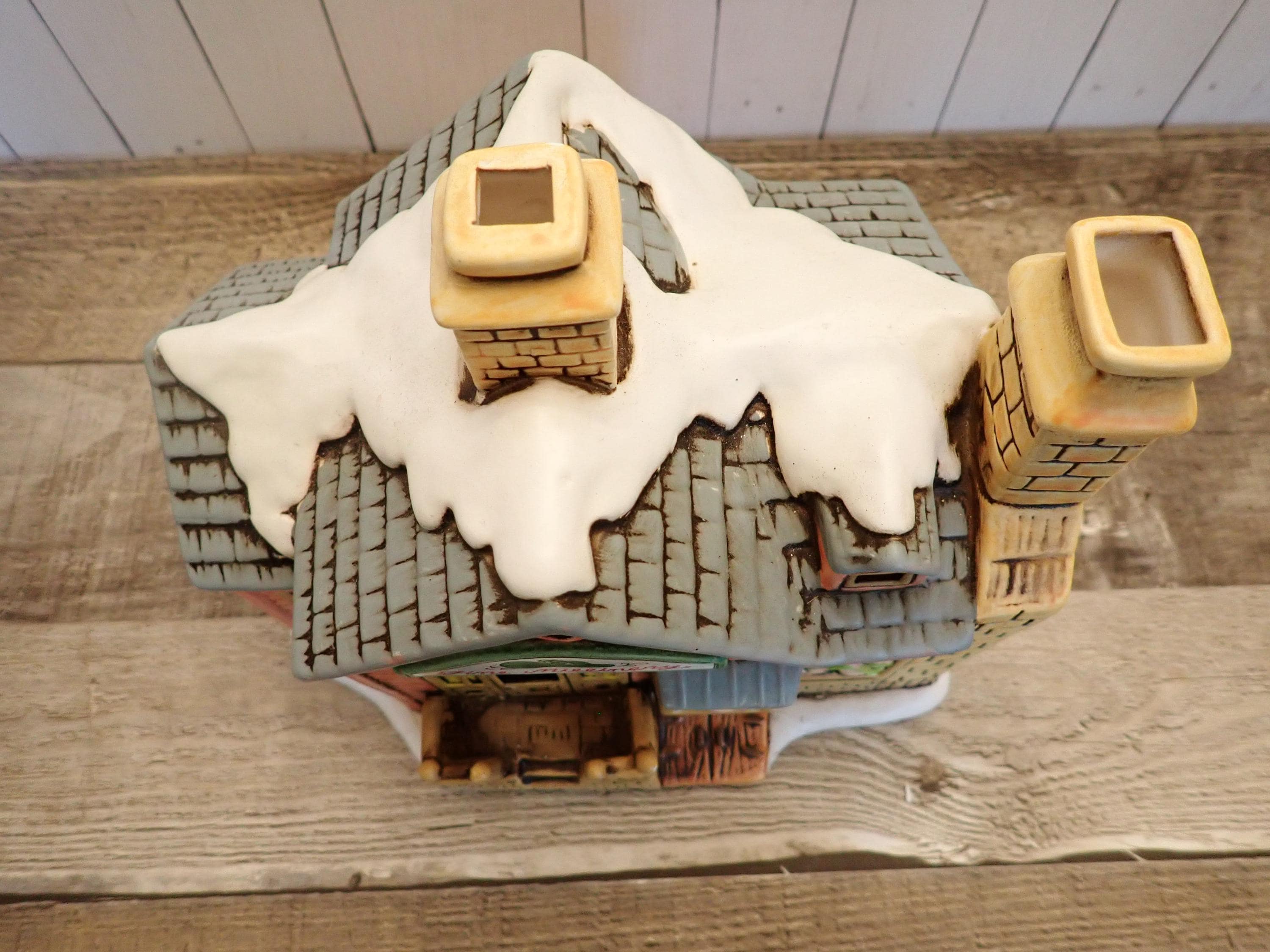 This ceramic village building is from the Lefton Colonial Village collection and was made in 1988. This piece is Capper's Fine Millinery and is 6.5" tall, 7.5" wide, and 5.5" deep. It is a pink building with gray and tan accents on the windows and fireplace. The bottom of the building is marked 1988 GEO. A. LEFTON / 06904 on the bottom and has an original Lefton label. The building is in very nice condition, however there is one small nick on the front porch of the building as shown in detail in the last photo. There is no box or light for this piece. Great addition to your Colonial Village!