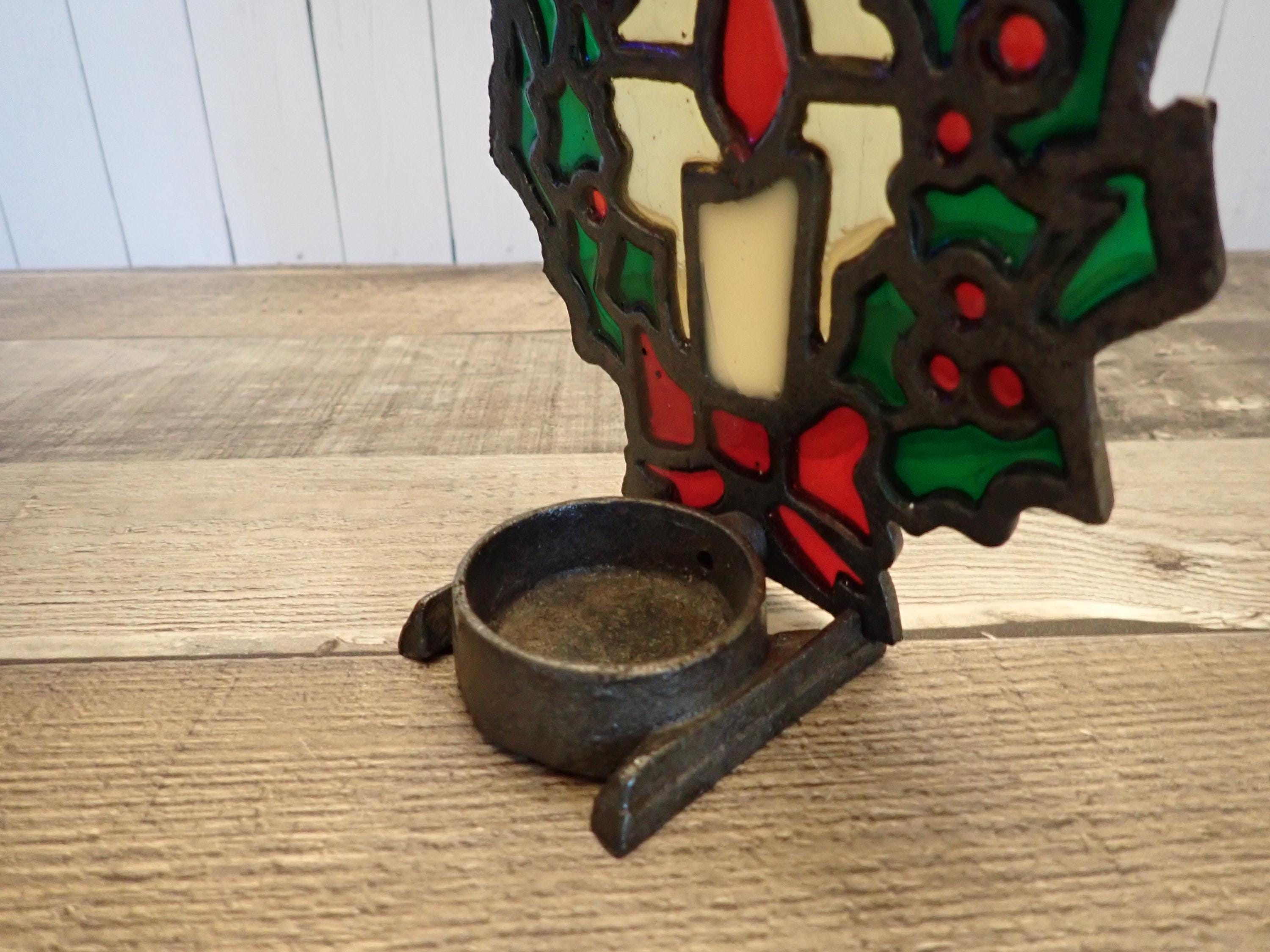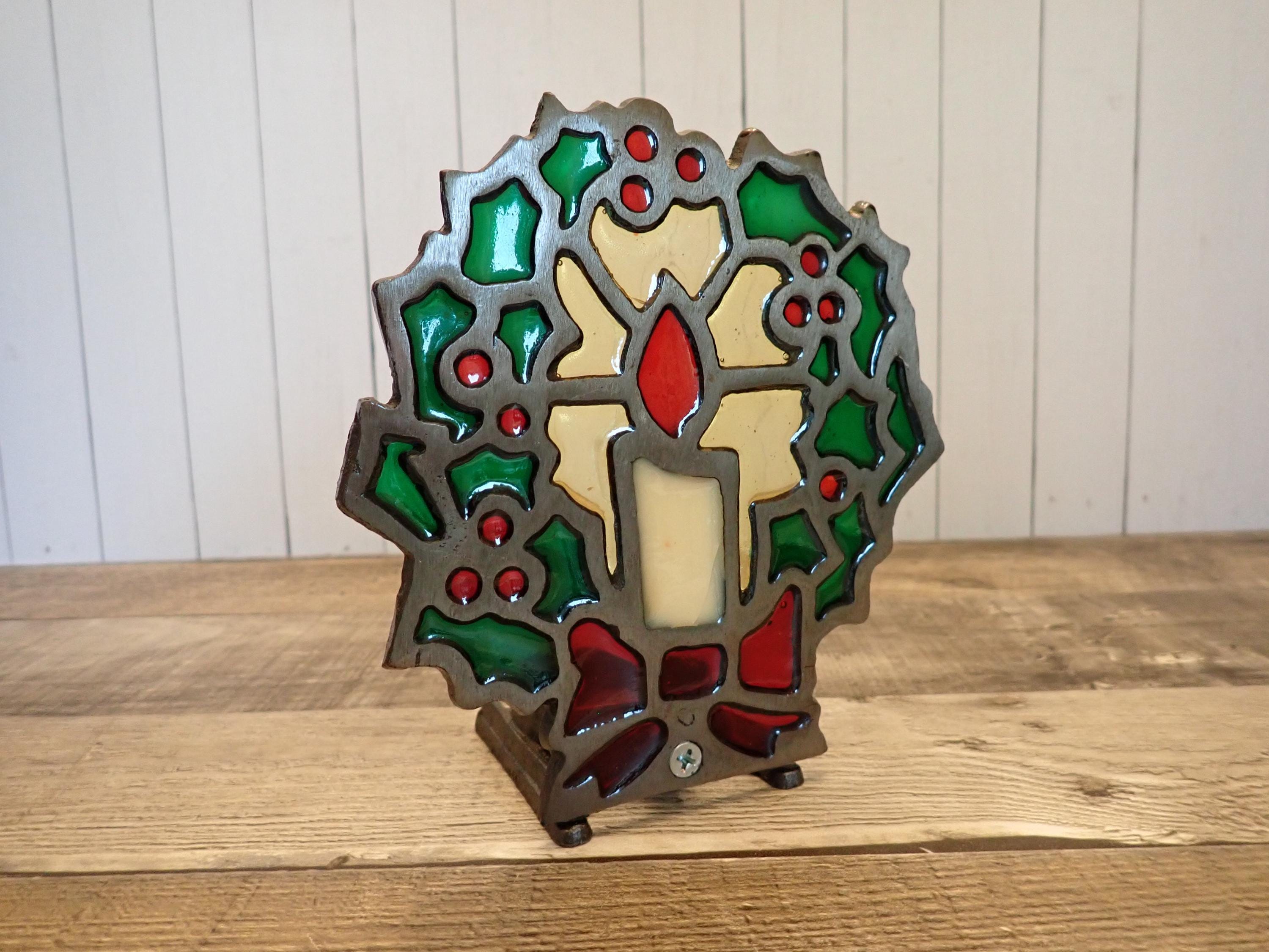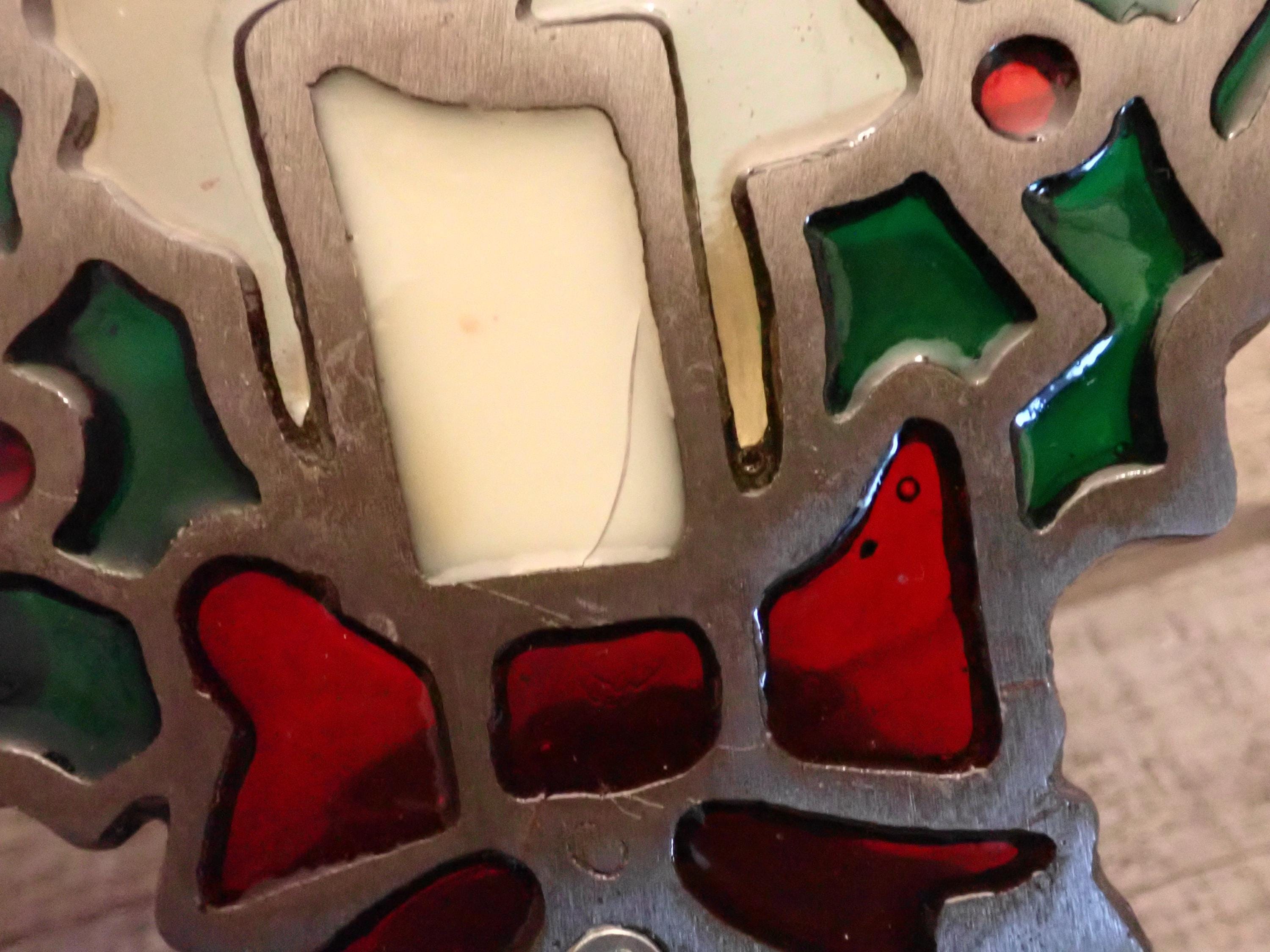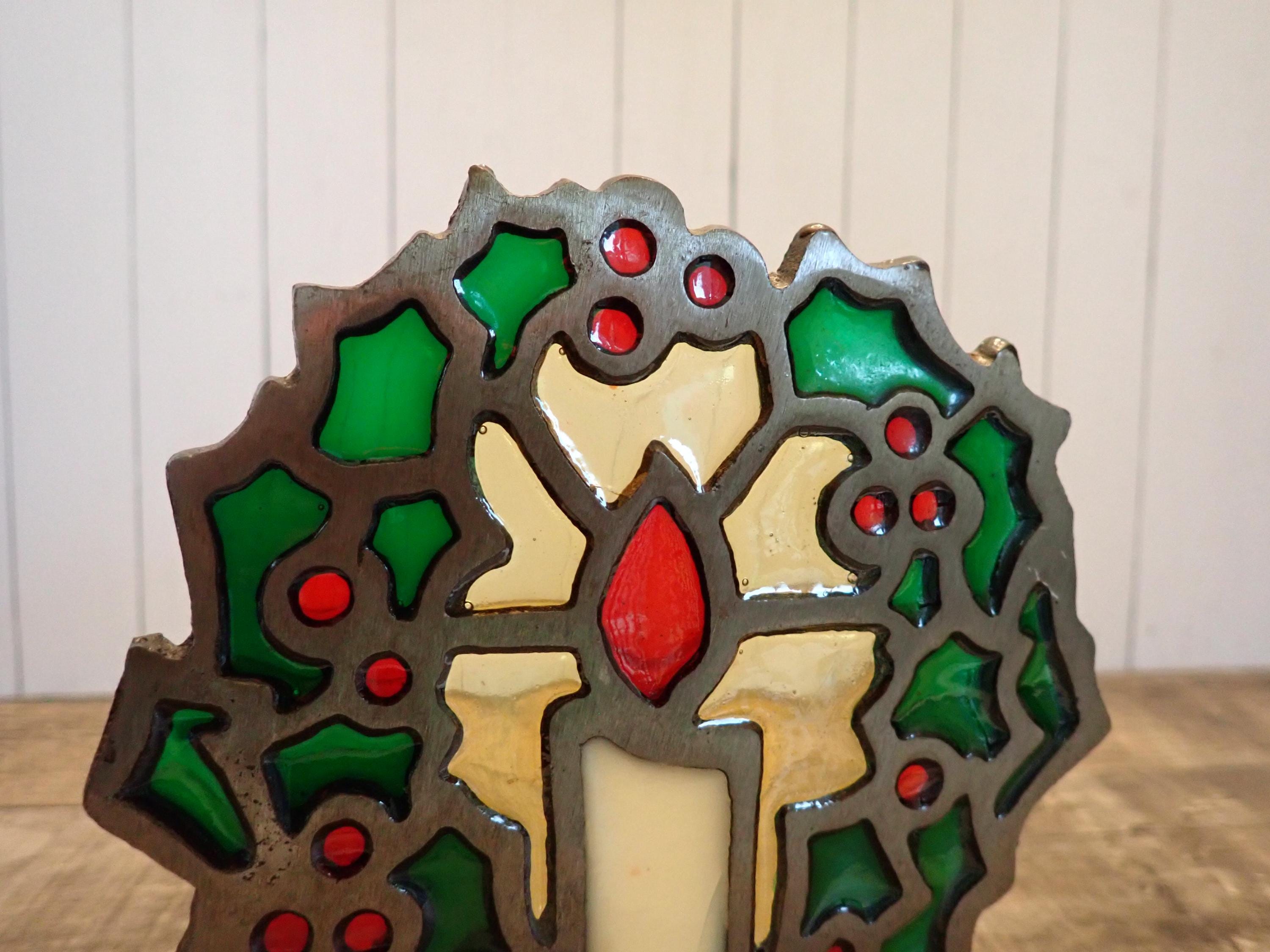 This metal and plastic stained glass style candle holder is 5.25" tall, 5" wide, and 2.75" deep. It is a partridge in a pear tree design, and can hold one tealight or votive candle on the platform base behind the stained glass (plastic) panel. The candle holder is in very good condition, however there are a few cracks on the colored panels, as is common on these pieces.
