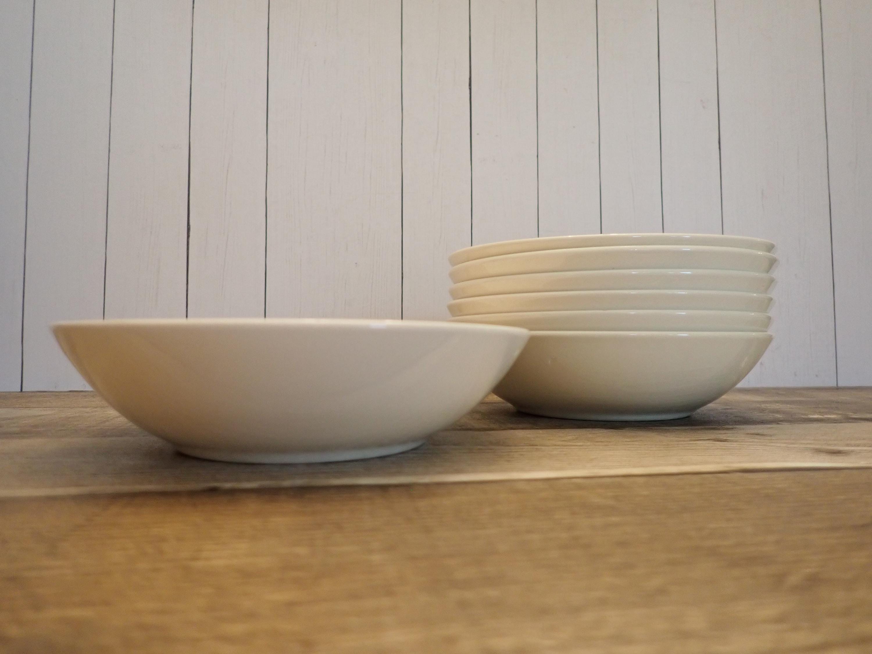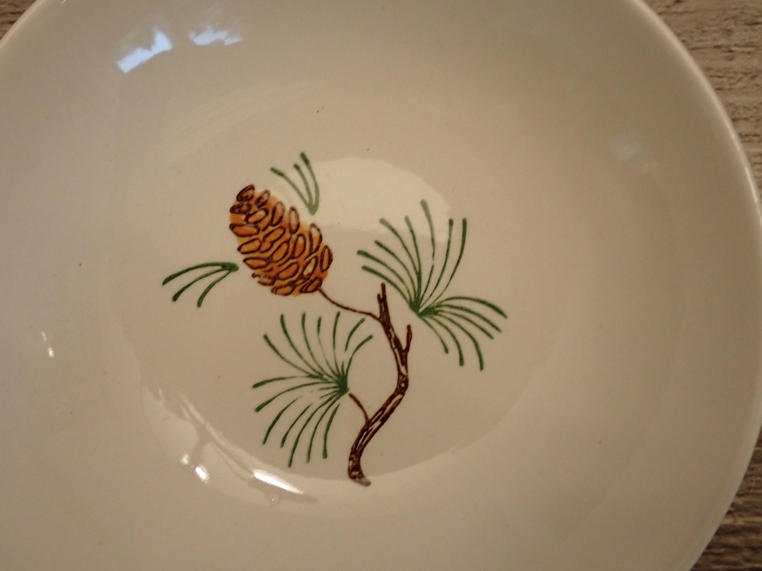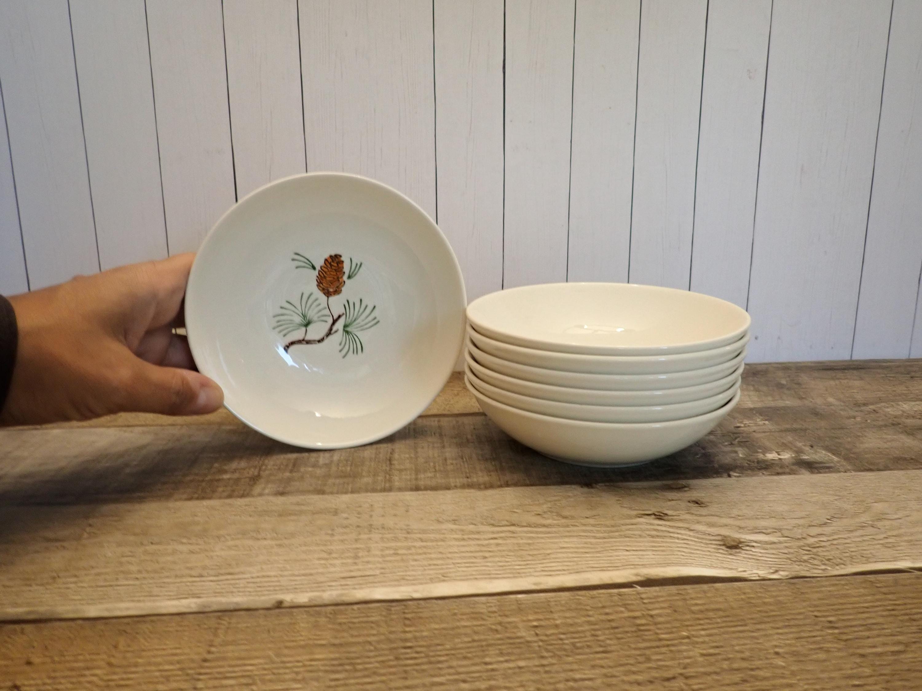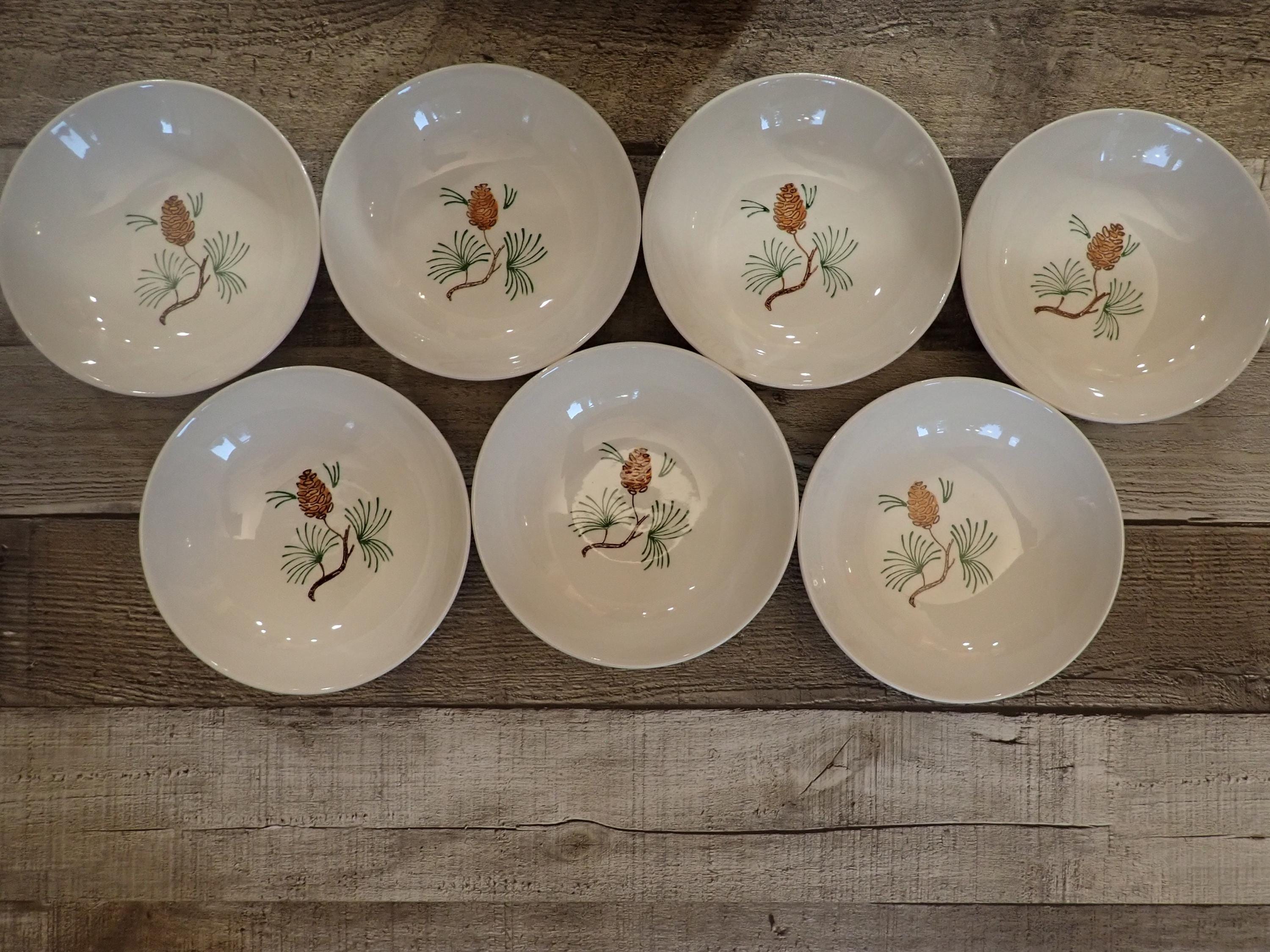 This set of 7 fruit bowls by Marcrest/Stetson are in the Pine pattern. They are a white ceramic with brown branches, green pine needles, and brown pinecones. These bowls are 2.25" in diameter and 1.5" high at the rim. There are no makers marks on the backs. These bowls have the brown glaze on each pinecone. All 7 bowls are in very good condition with no chips or cracks. There is some crazing in the glaze - this is more prevalent on some bowls than on others.