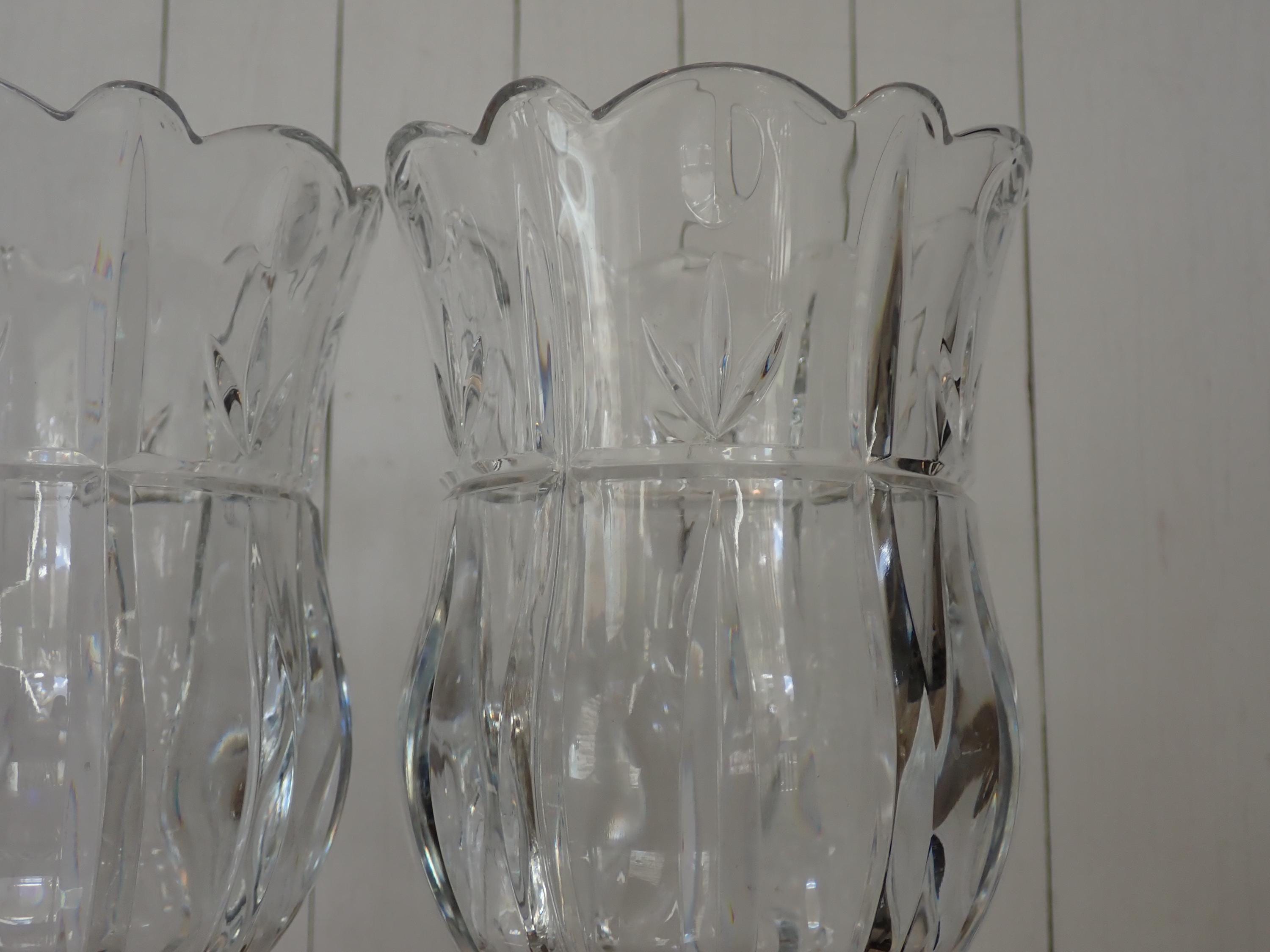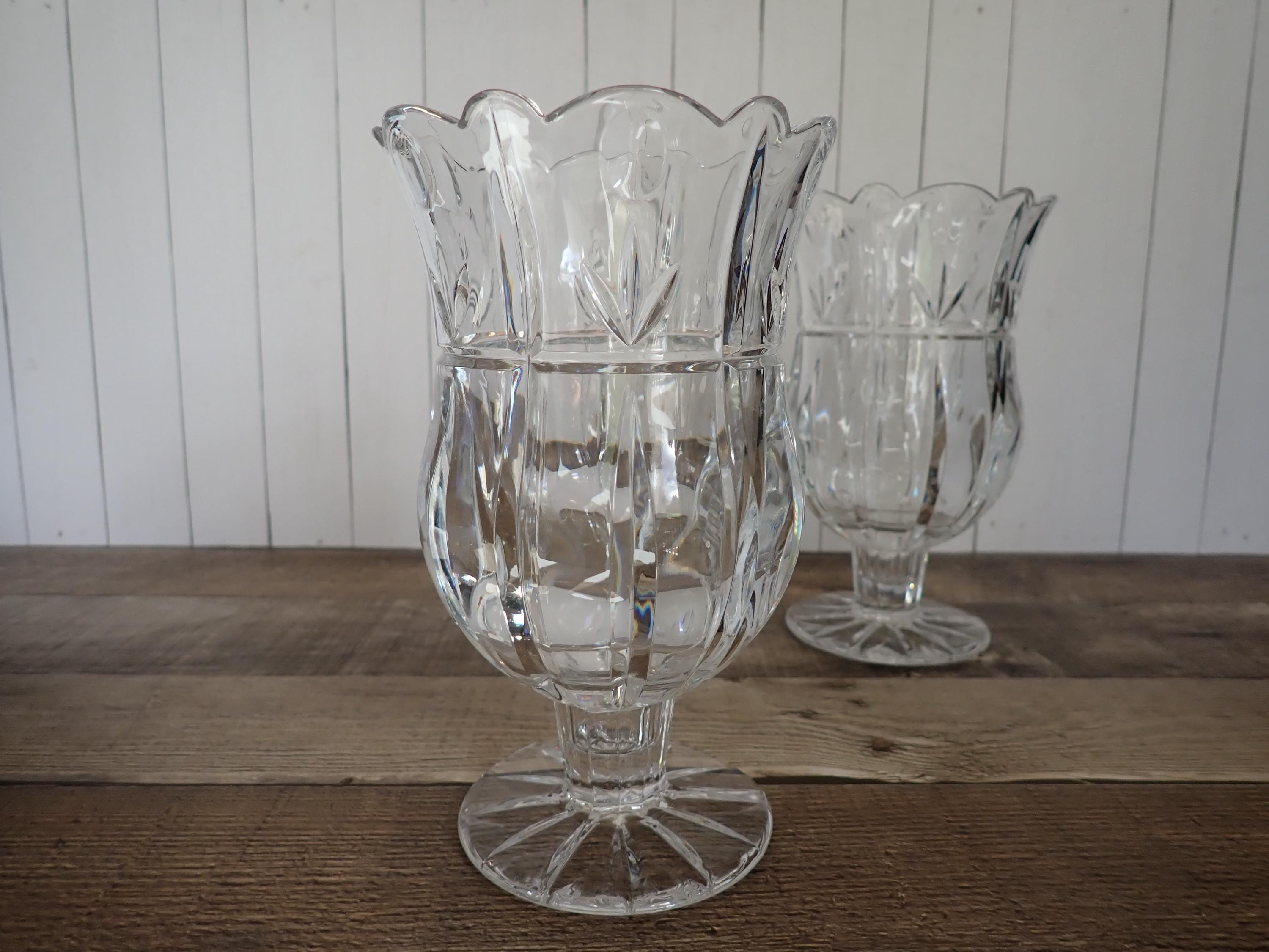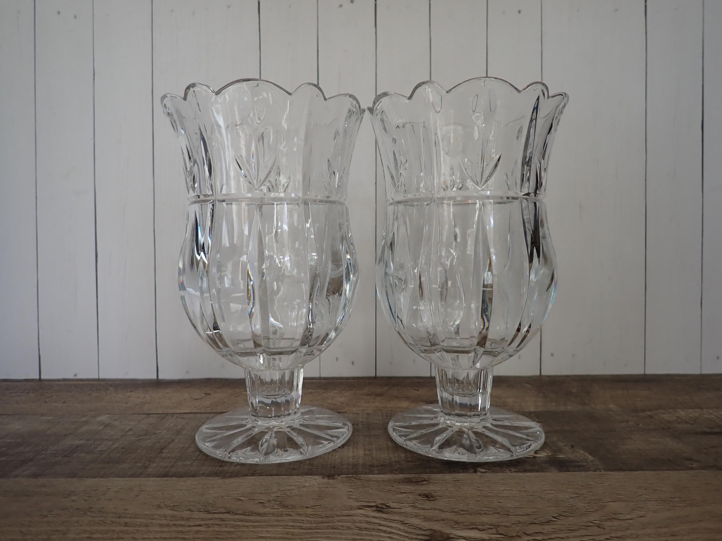 This set of hurricanes includes 2 matching clear glass vases or hurricanes by Block Crystal in the Tulip garden pattern. They are 7" tall and 4.25" in diameter and have a footed base with a chunky stem. The vases are decorated with a paneled design around the middle, and a flower design around the rim. The vases are a thick, heavy glass and weigh nearly 2 pounds each. They are 24% full lead crystal. Both pieces are in very good condition with no chips or cracks.