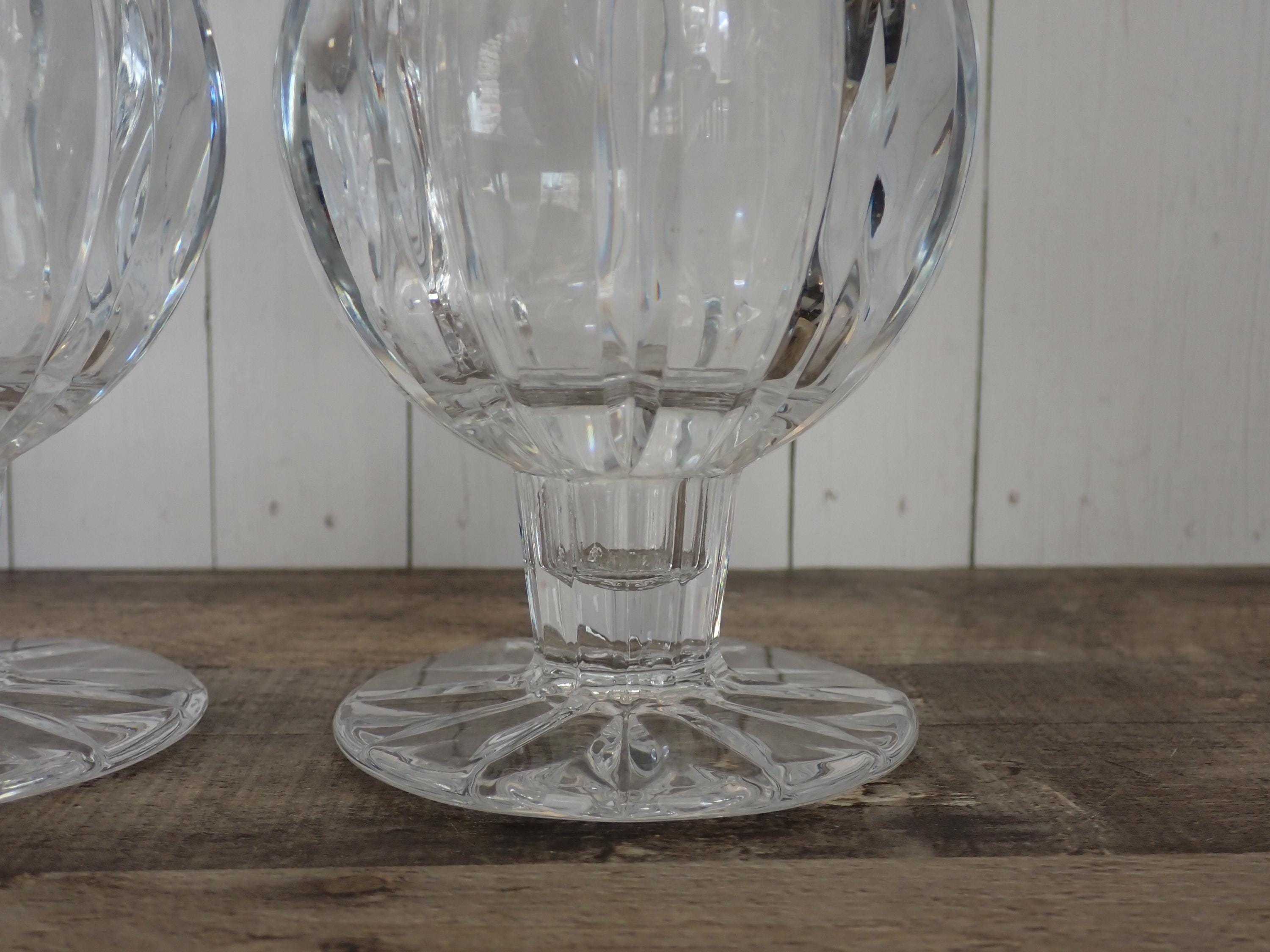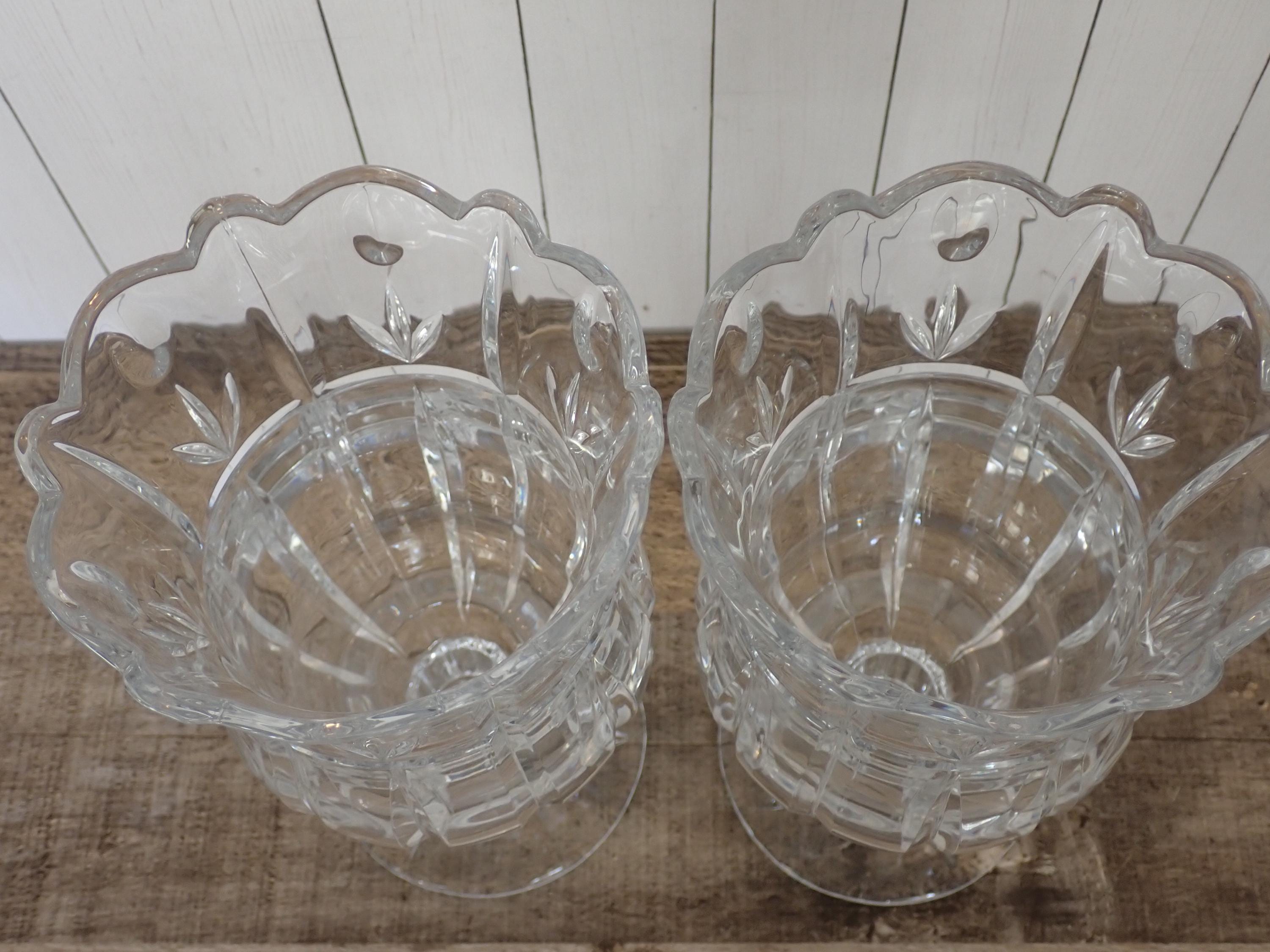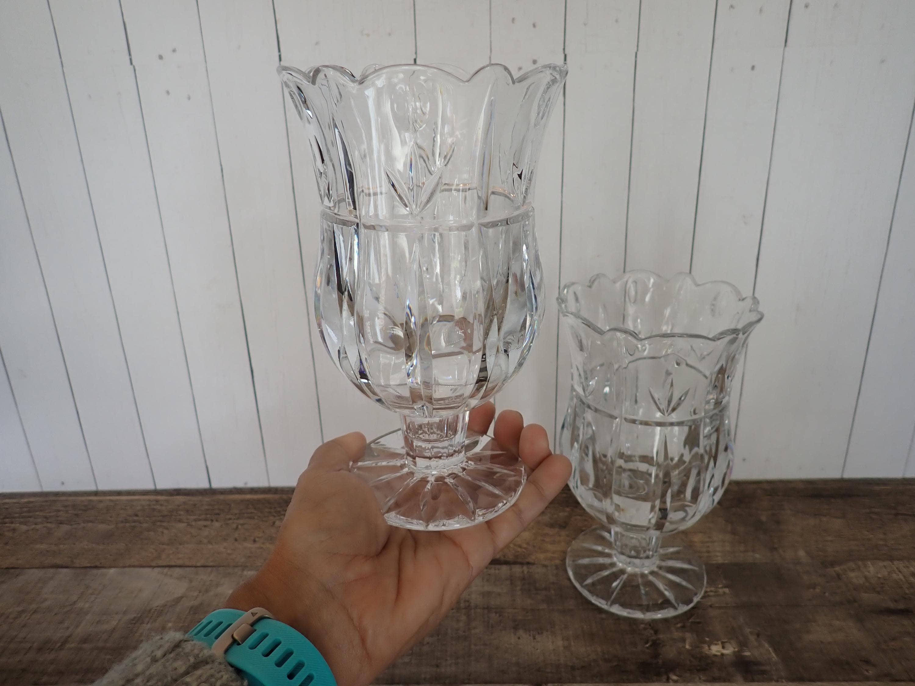 This set of hurricanes includes 2 matching clear glass vases or hurricanes by Block Crystal in the Tulip garden pattern. They are 7" tall and 4.25" in diameter and have a footed base with a chunky stem. The vases are decorated with a paneled design around the middle, and a flower design around the rim. The vases are a thick, heavy glass and weigh nearly 2 pounds each. They are 24% full lead crystal. Both pieces are in very good condition with no chips or cracks.