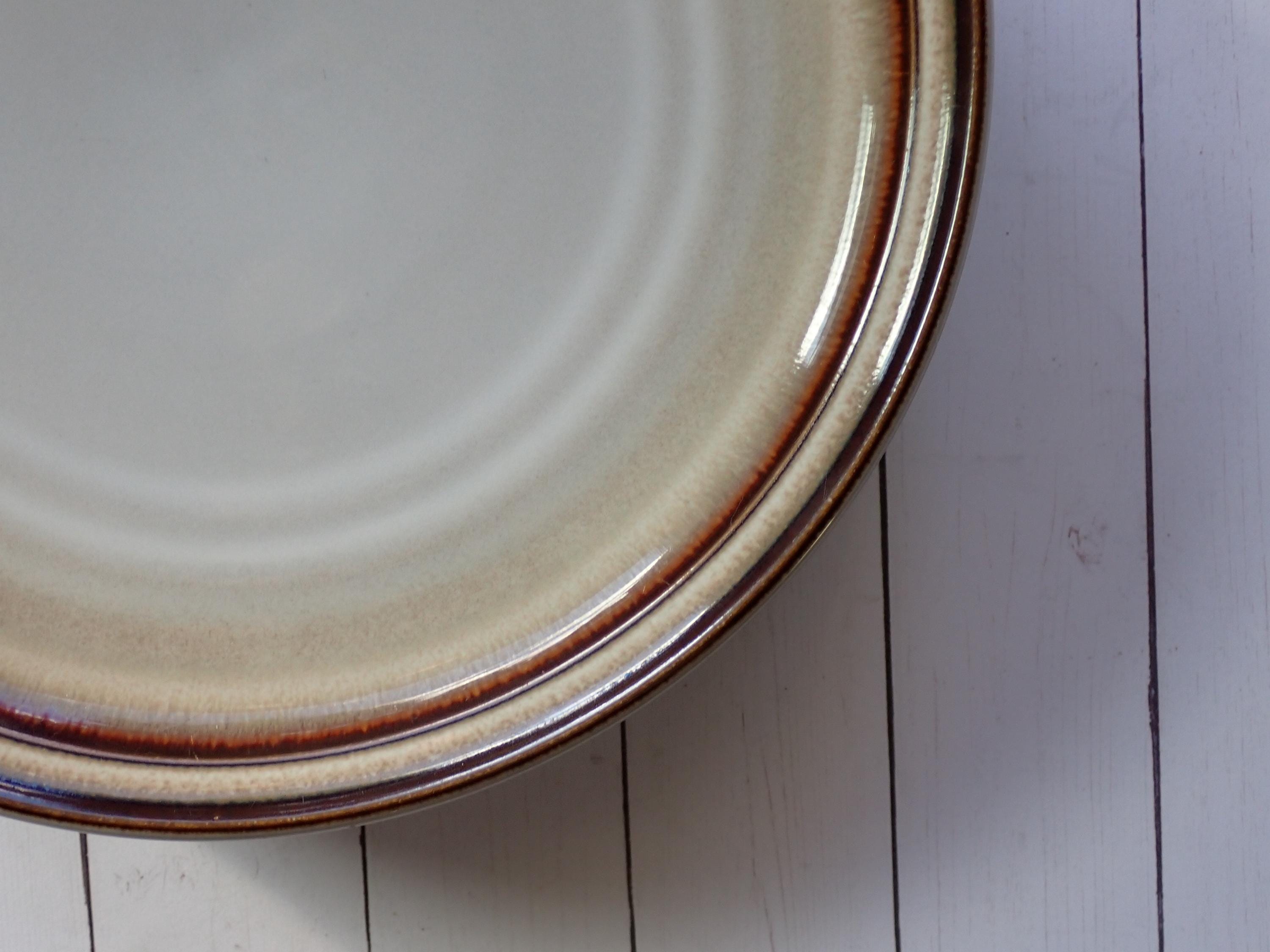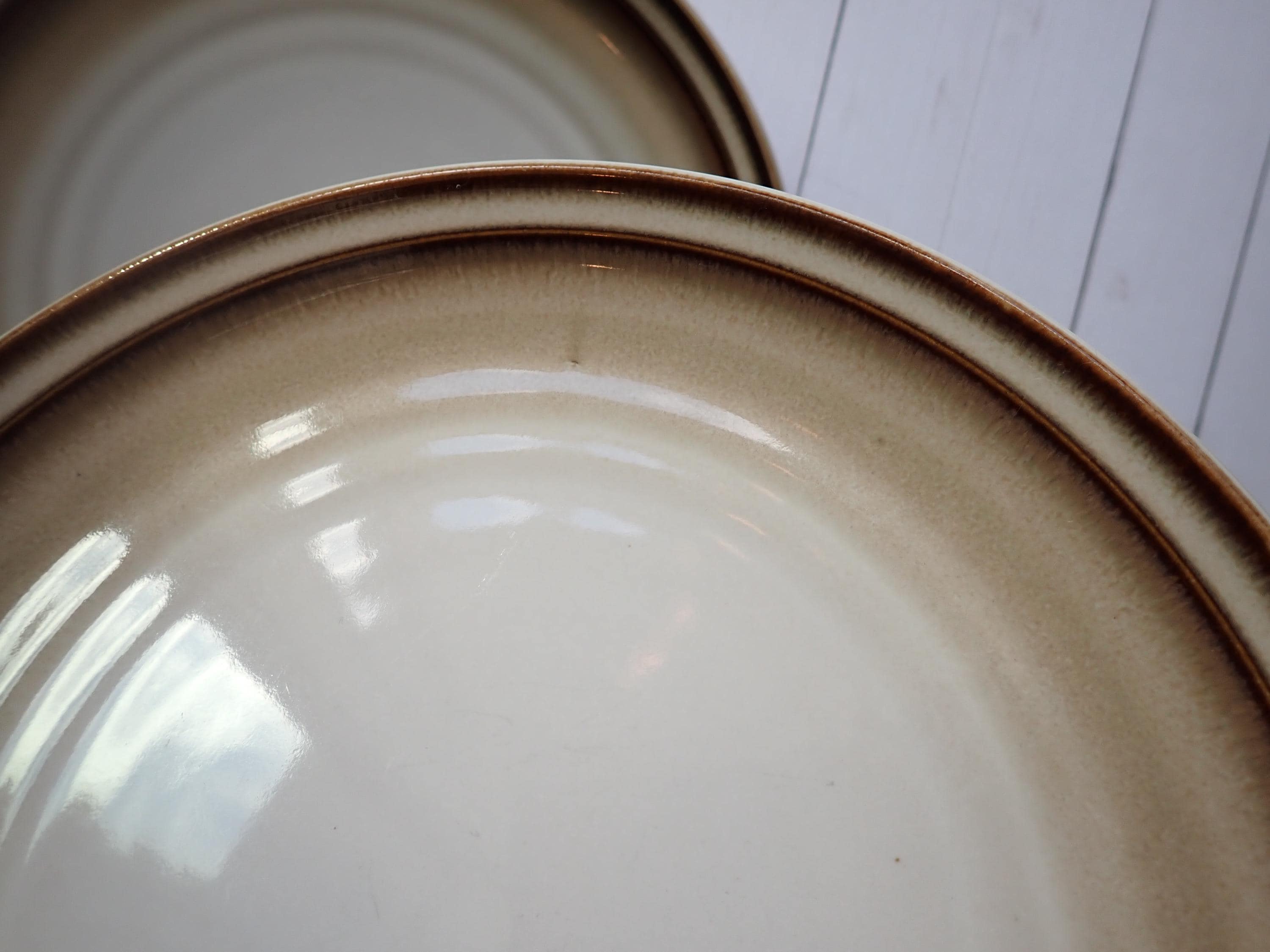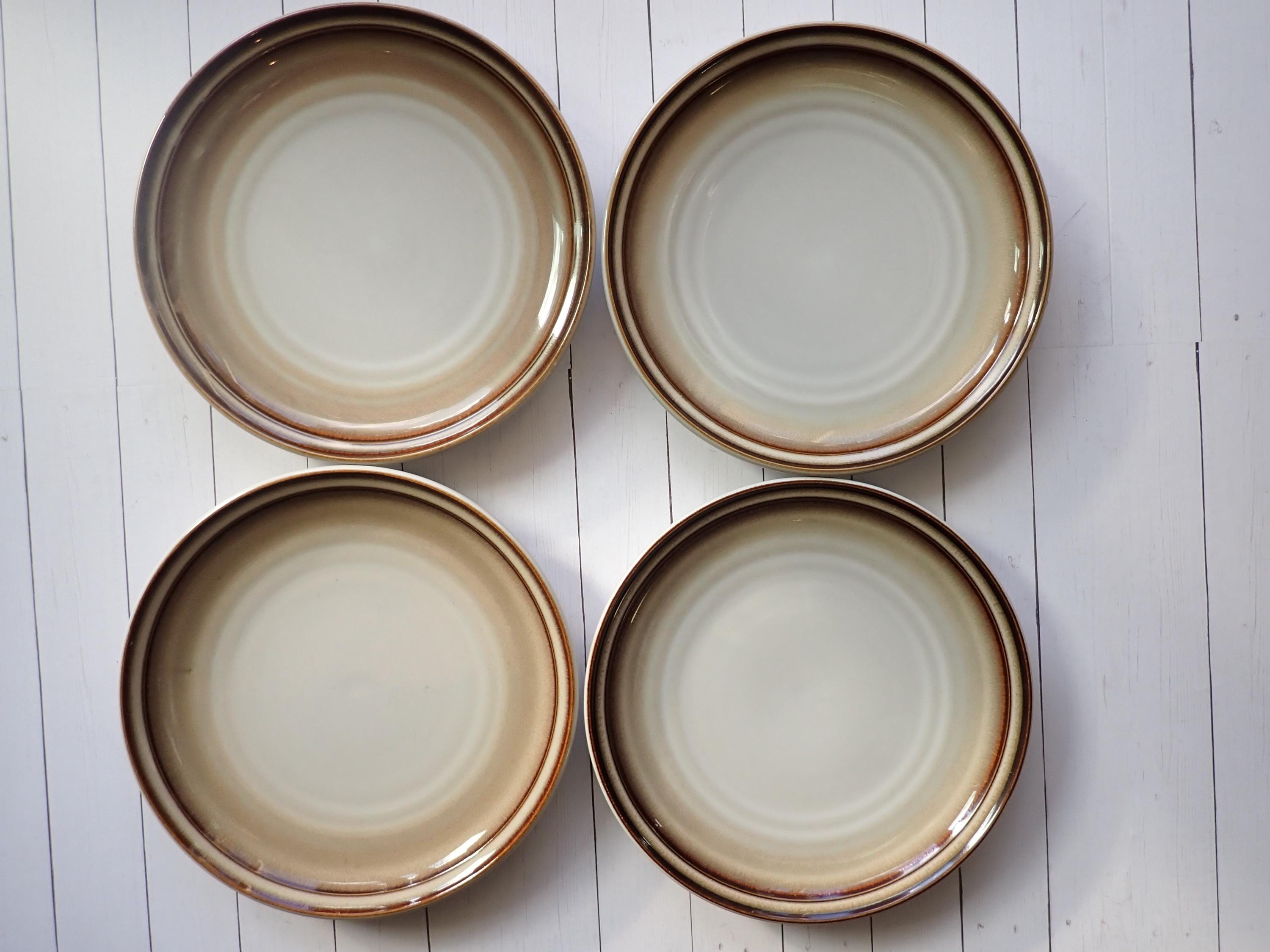 This set of 4 salad plates by Noritake are in the Fanfare pattern. Each plate is 8.25" in diameter and 1" high. They are a cream-colored plate, accented with brown bands around the rim. The bottoms are marked: NORITAKE STONEWARE / OVEN SAFE DETERGENT SAFE / MICROWAVE OVEN SAFE / MADE IN JAPAN / 8621 / FANFARE. All 4 plates are in very good condition with no chips or cracks - there are some light surfaces scratches - one plate has a few more scratches than the other 3.