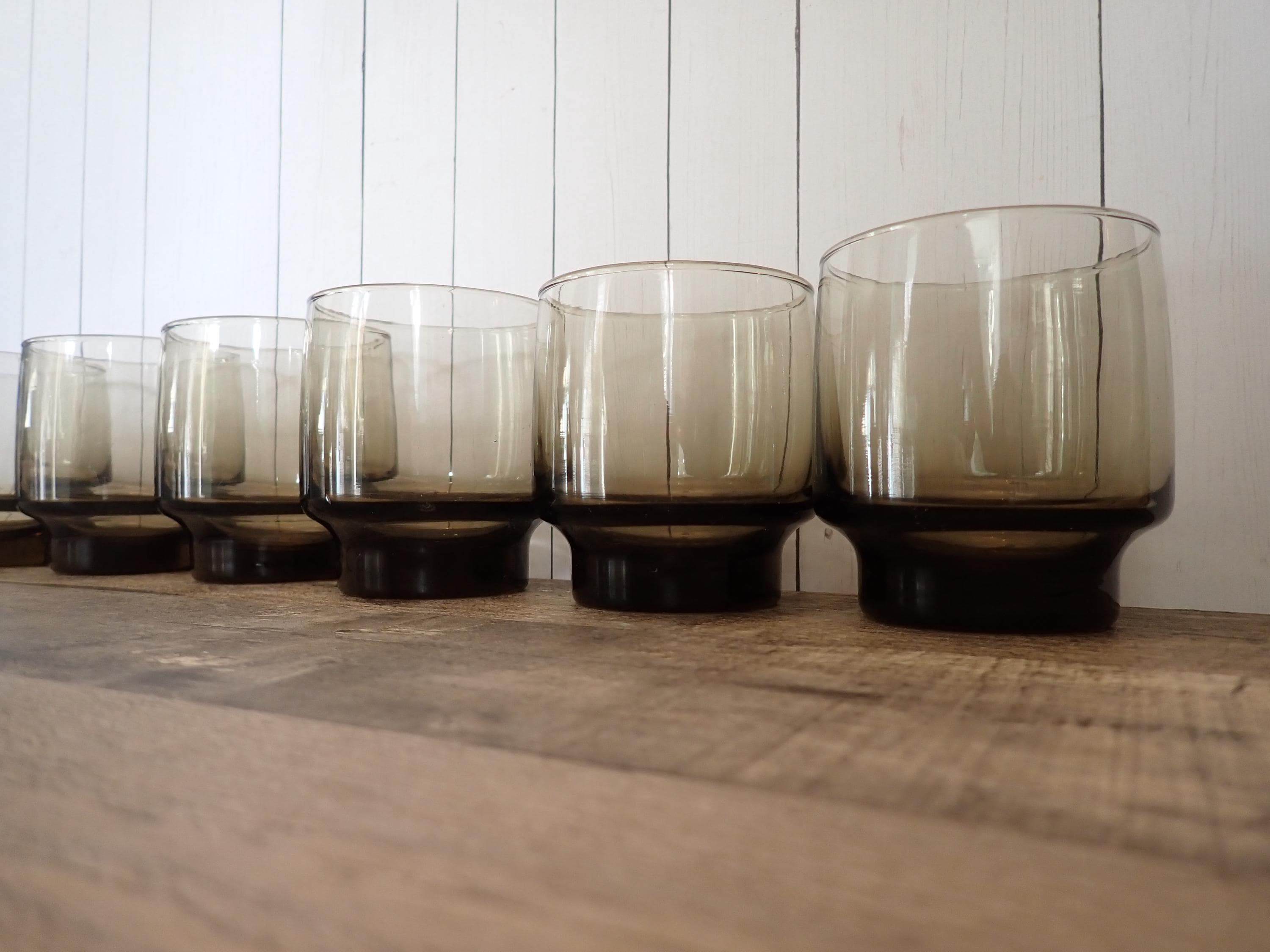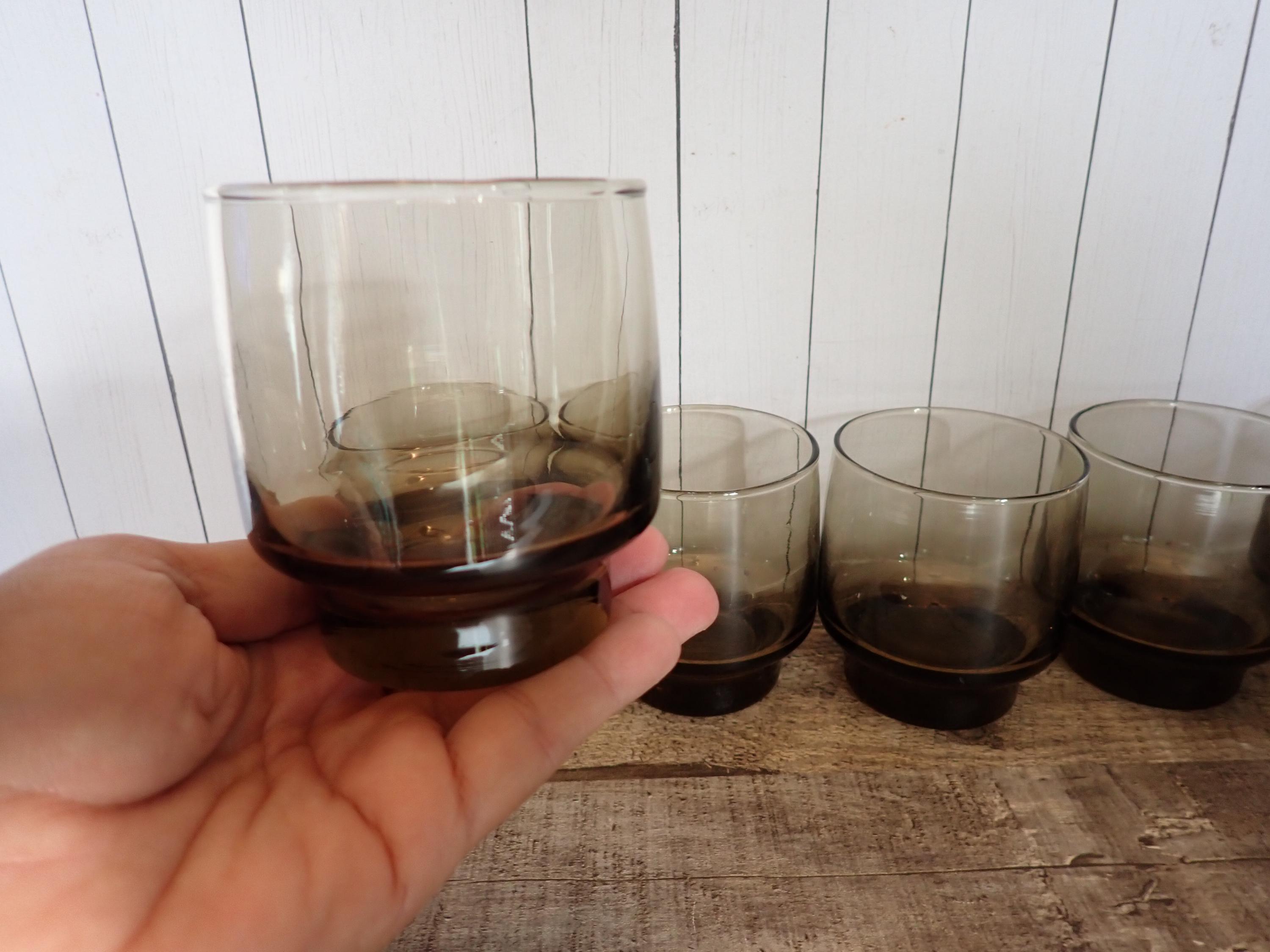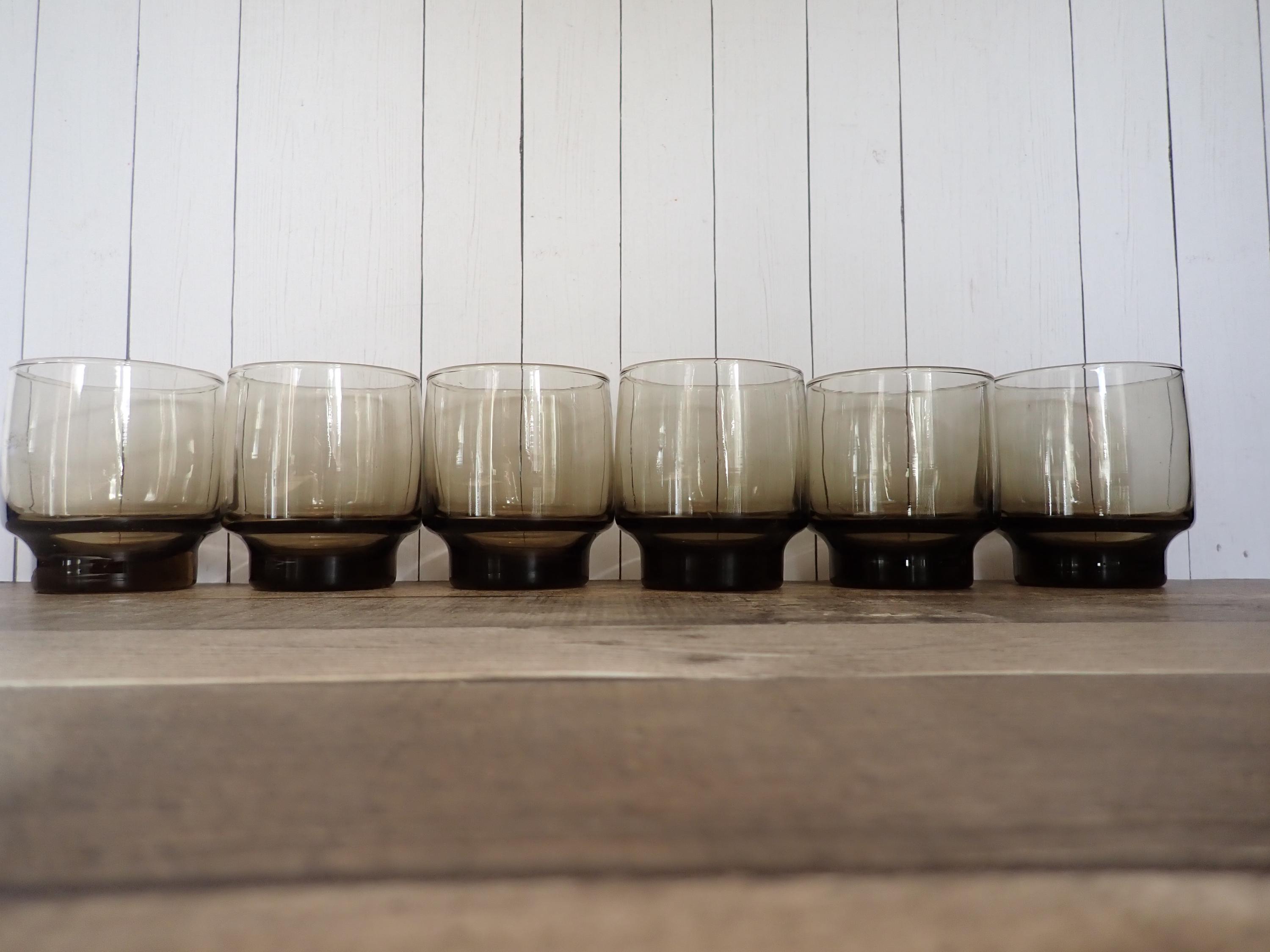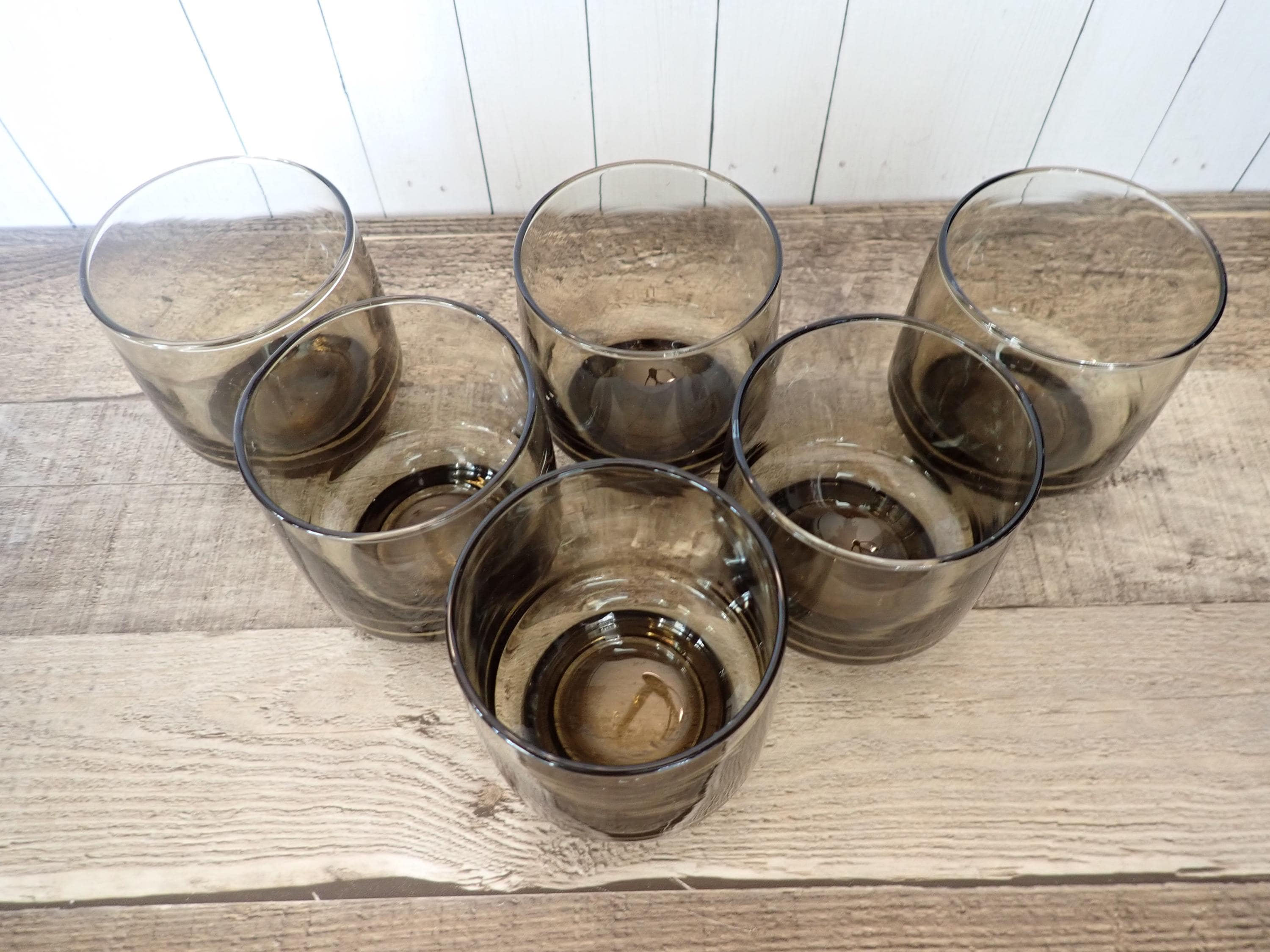 This set of 6 old fashioned glasses by Libbey Glass are the Tawny Accent pattern and are the 8 oz. Old Fashioned Glasses. They are 3.5" tall and 2.75" in diameter, and have a smooth round shape with flat sides, and a round footed base. They are marked with the Libbey "L" logo on the bottom. All 6 glasses are in very good condition with no chips or cracks. Great set of Libbey old fashioned glasses!