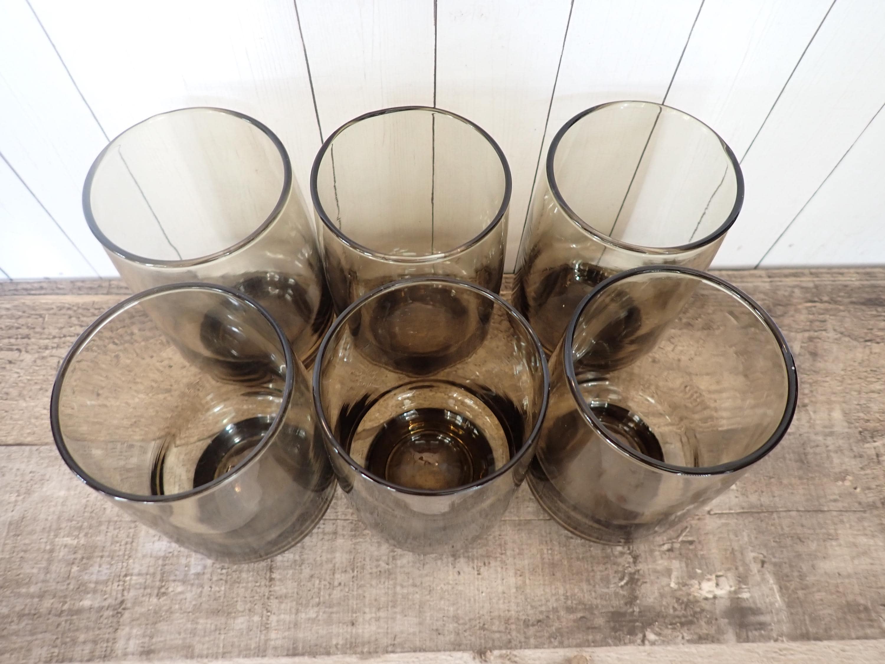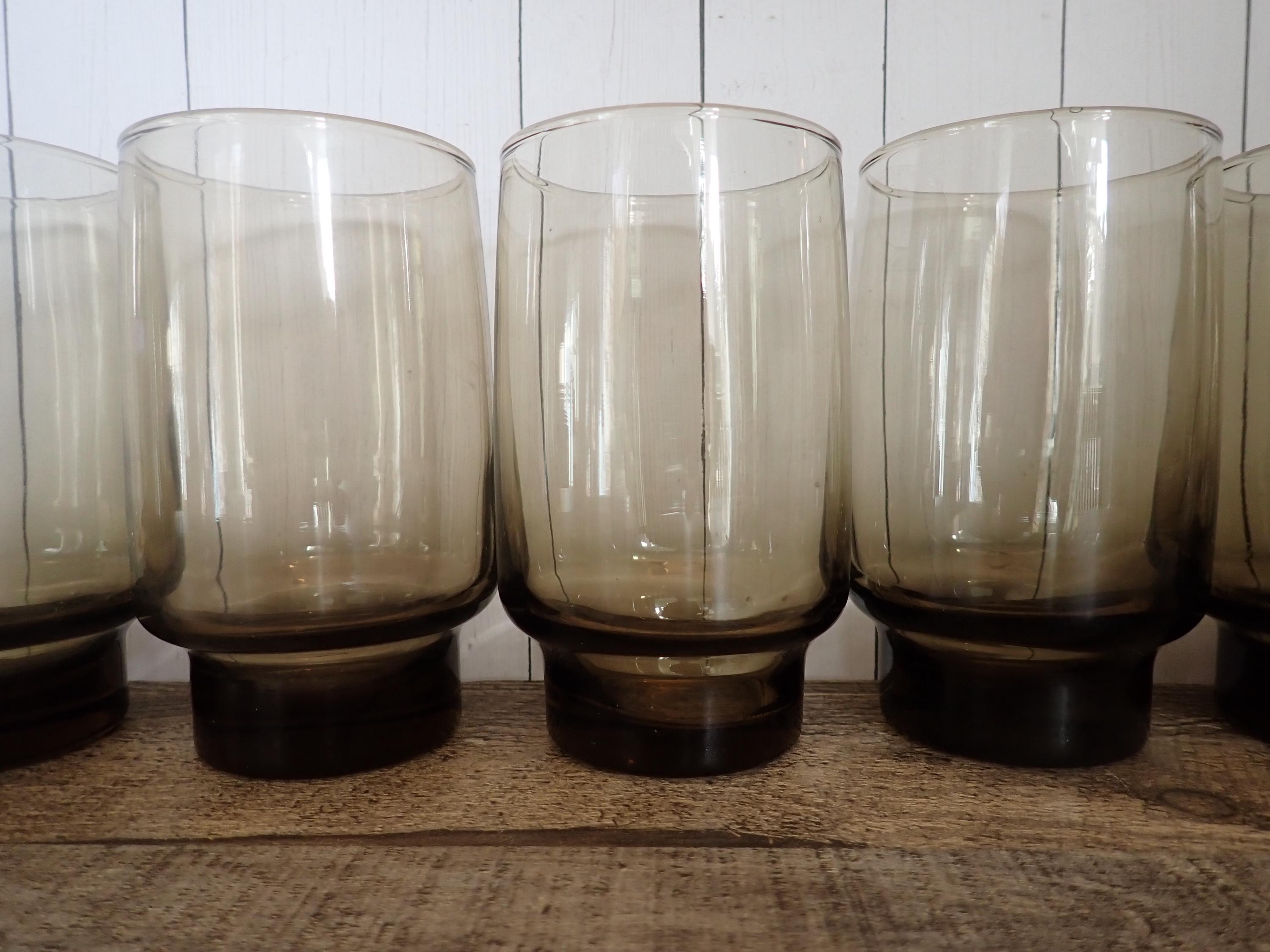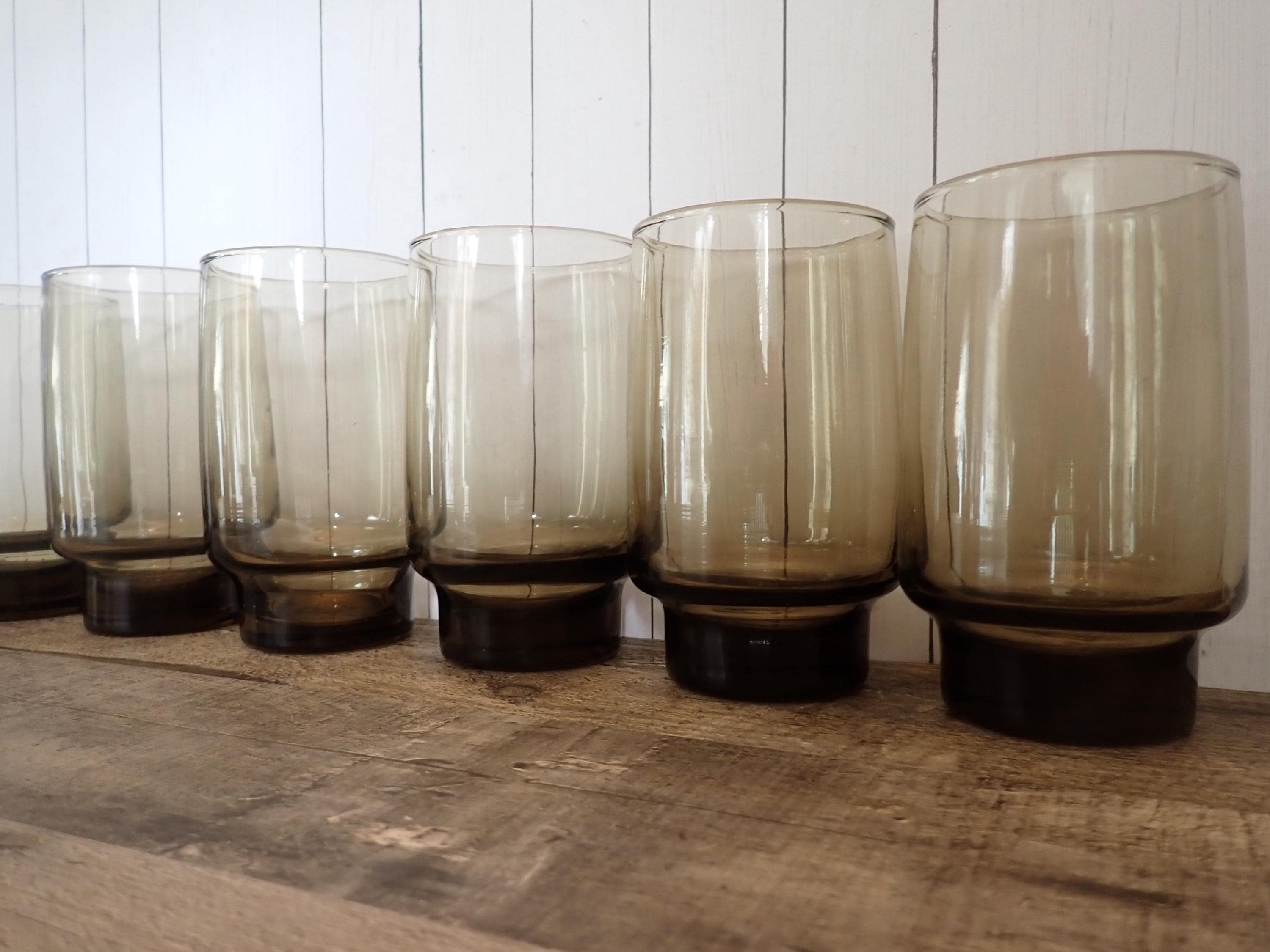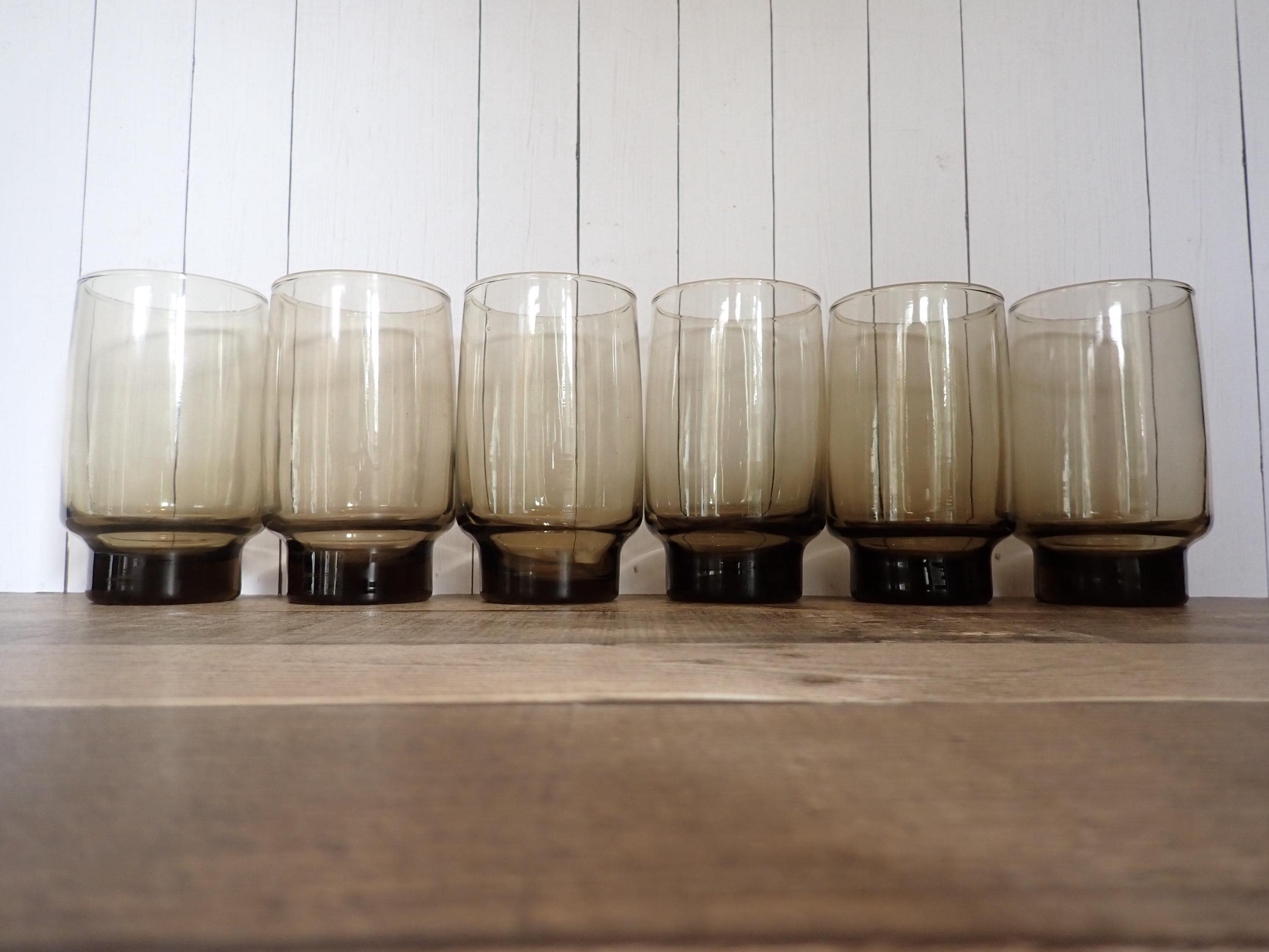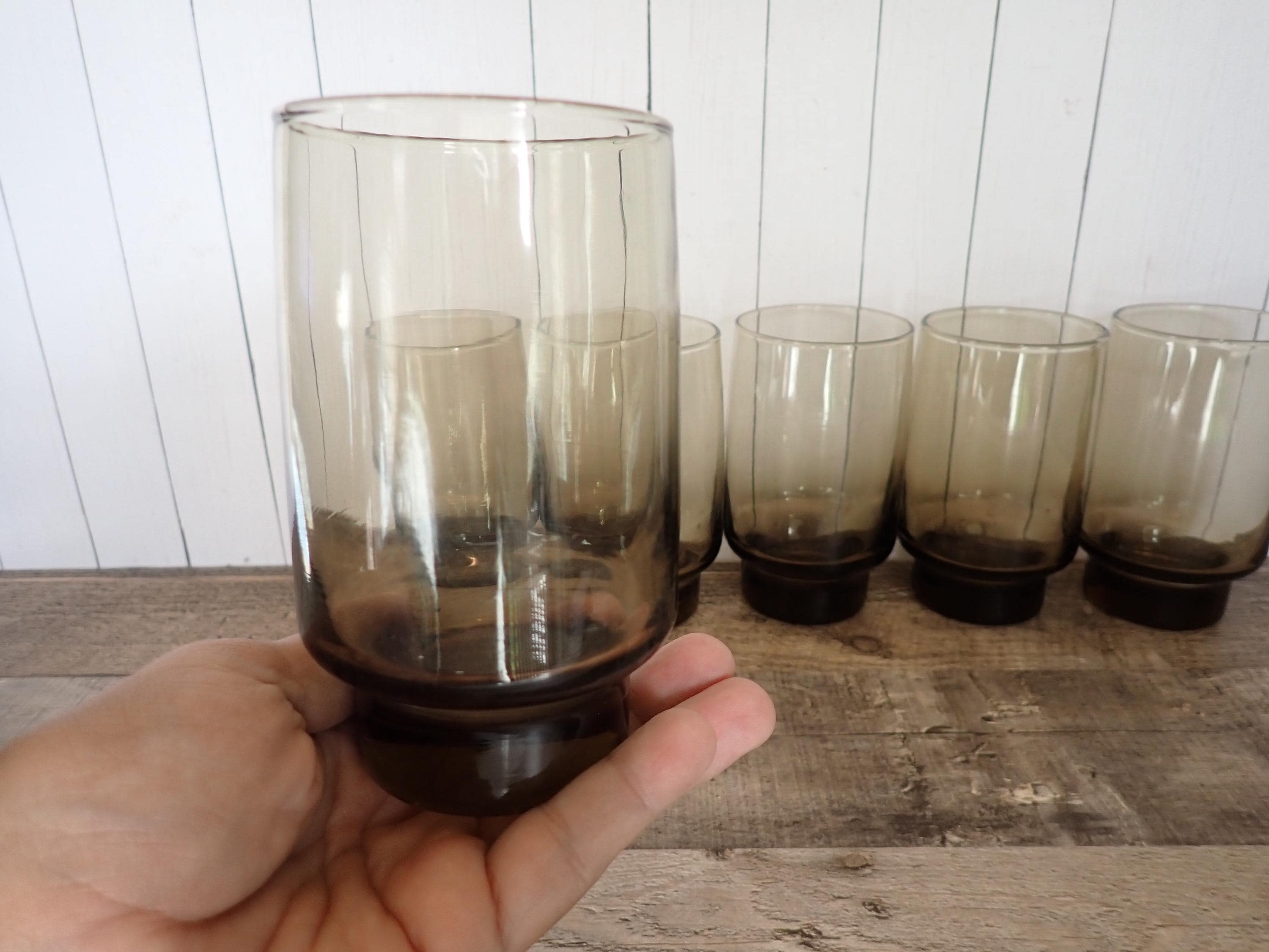 This set of 6 tumblers by Libbey Glass are the Tawny Accent pattern and are the 11 oz. Flat Tumblers. They are 4.75" tall and 2.75" in diameter, and have a smooth round shape with flat sides, and a round footed base. These are the smaller sized tumbler in this pattern, and they hold 11 oz. (the larger tumblers are 5.5" tall and hold 16 oz.) They are marked with the Libbey "L" logo on the bottom. All 6 glasses are in very good condition with no chips or cracks. Great set of Libbey facets tumblers!