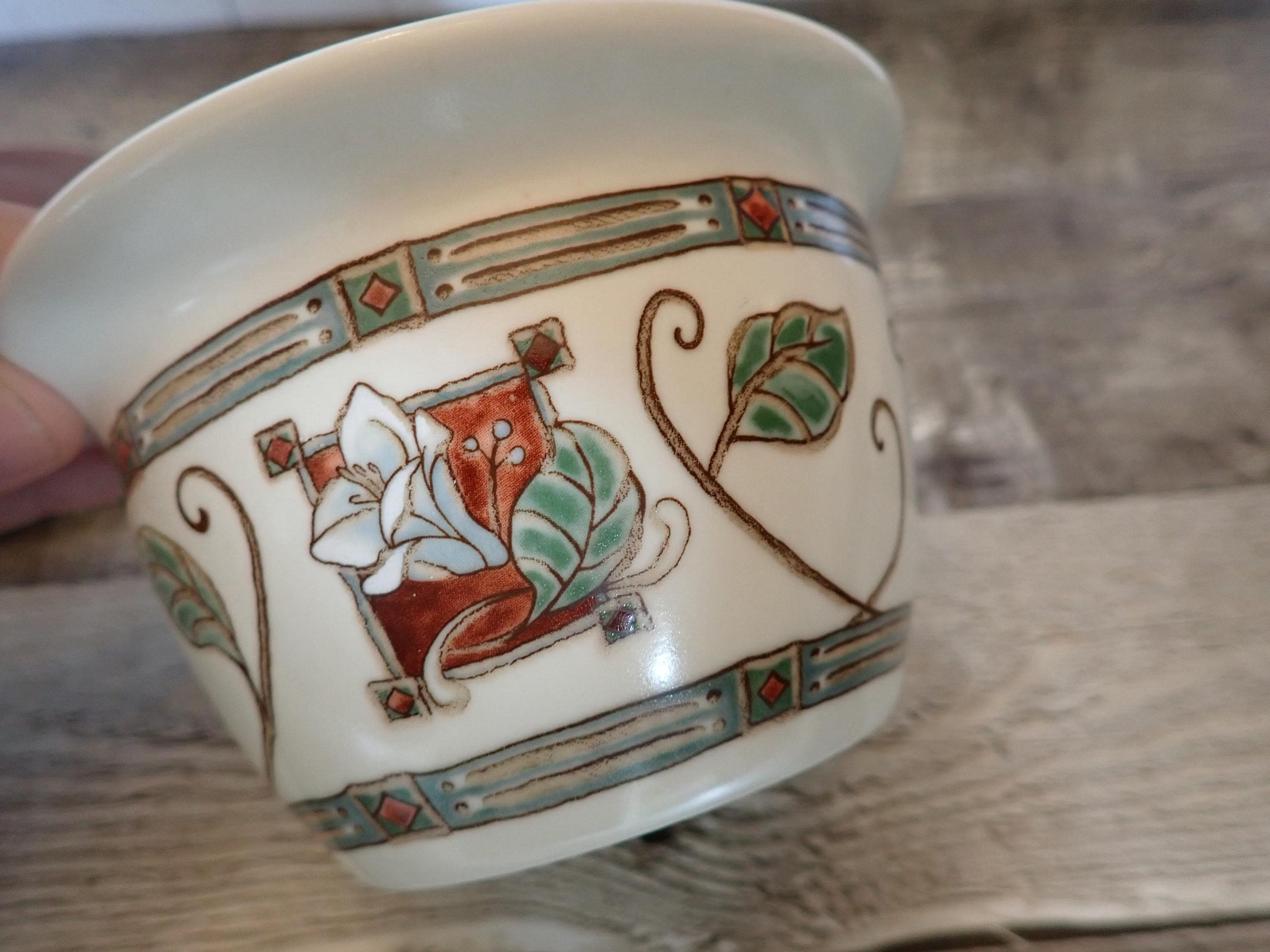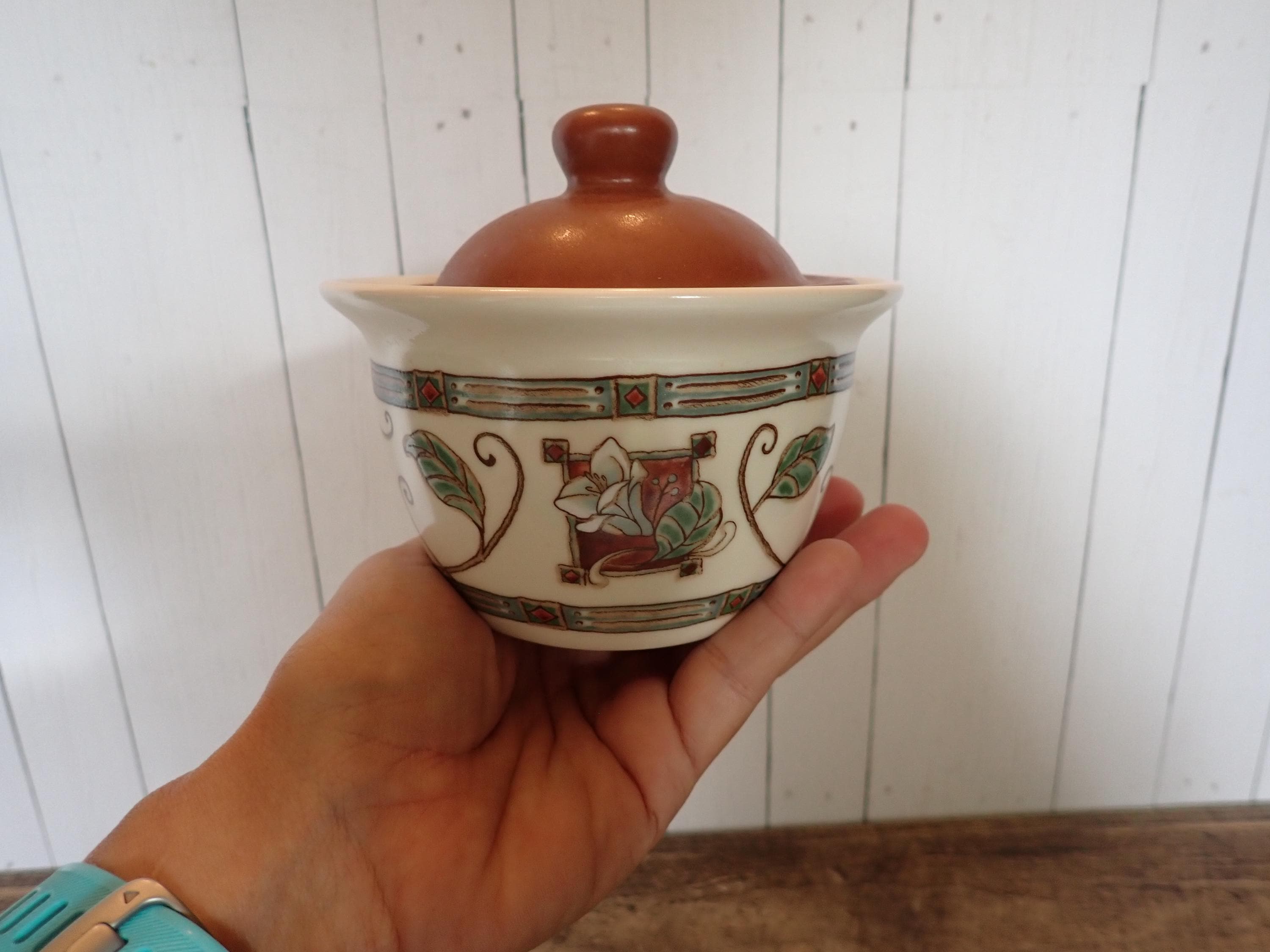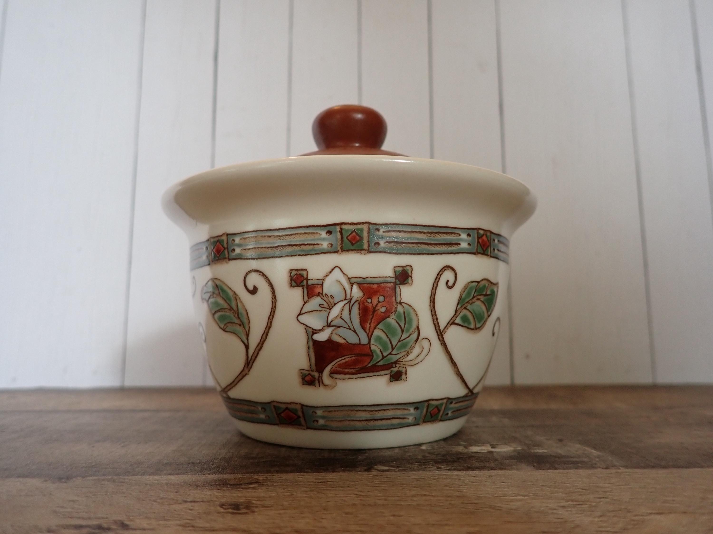 These sugar bowl by Pfaltzgraff is from the Mission Flower collection and is 4.75" in diameter and 4.5" high with the lid. It is a cream colored stoneware with a rusty red/brown flower and leaf design. The bottom is marked Pfaltzgraff. The bowl and lid are in very good condition with no chips or cracks.